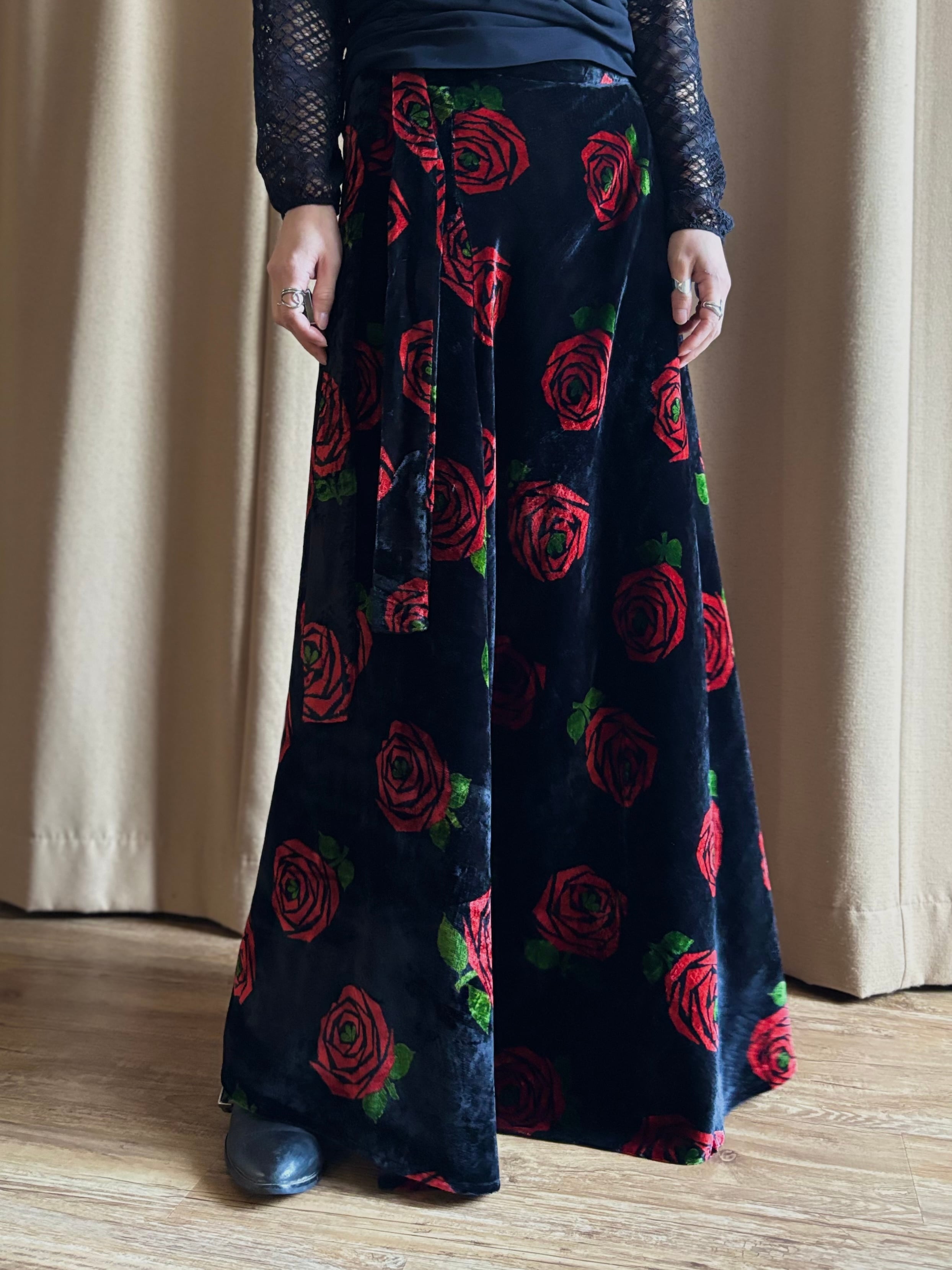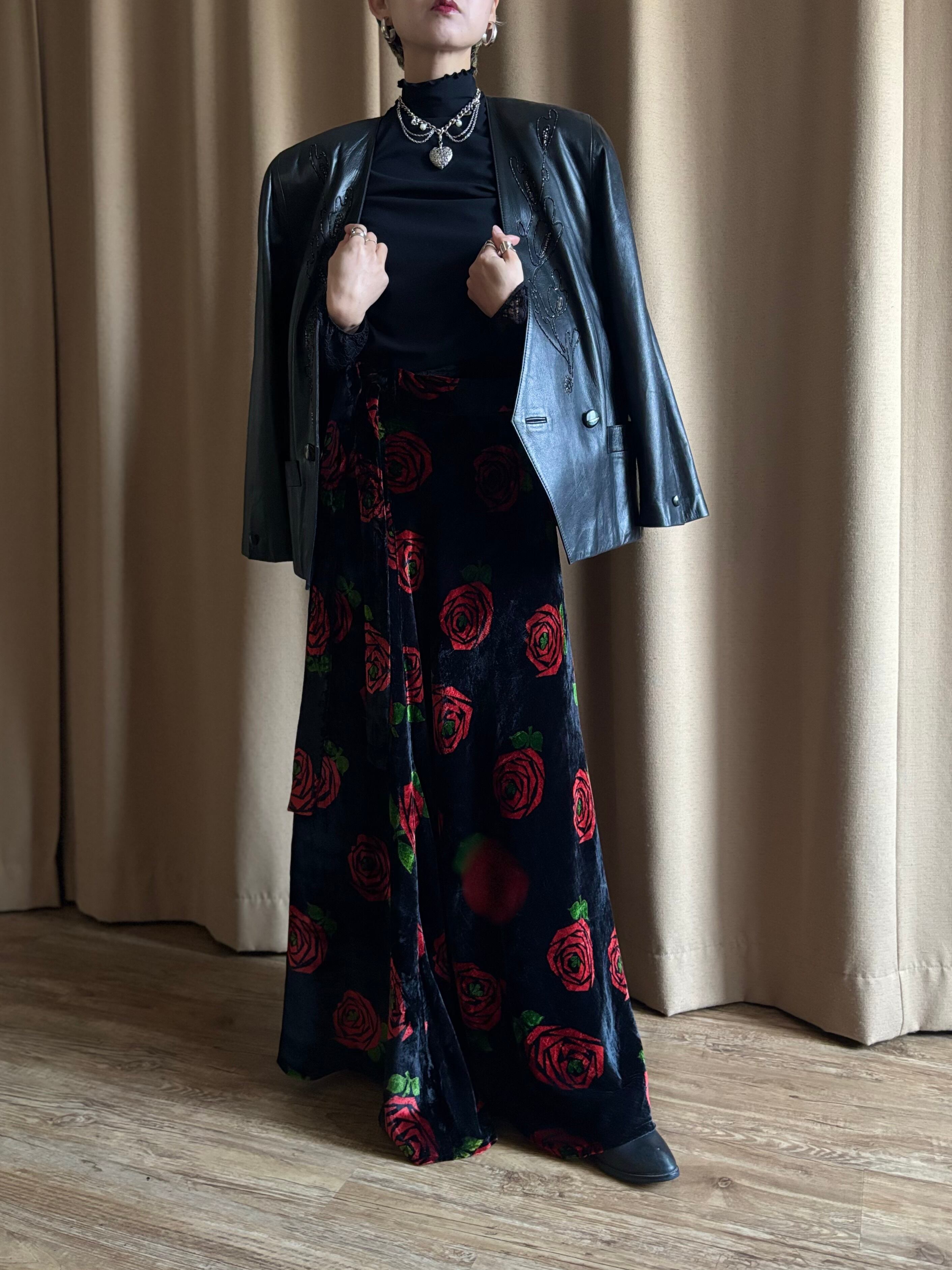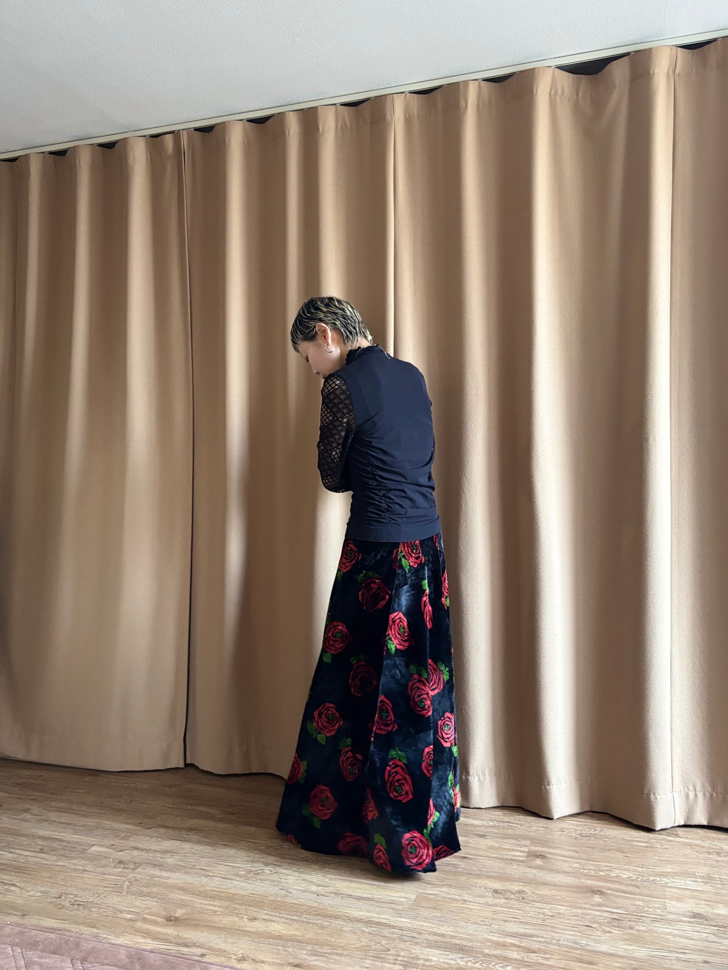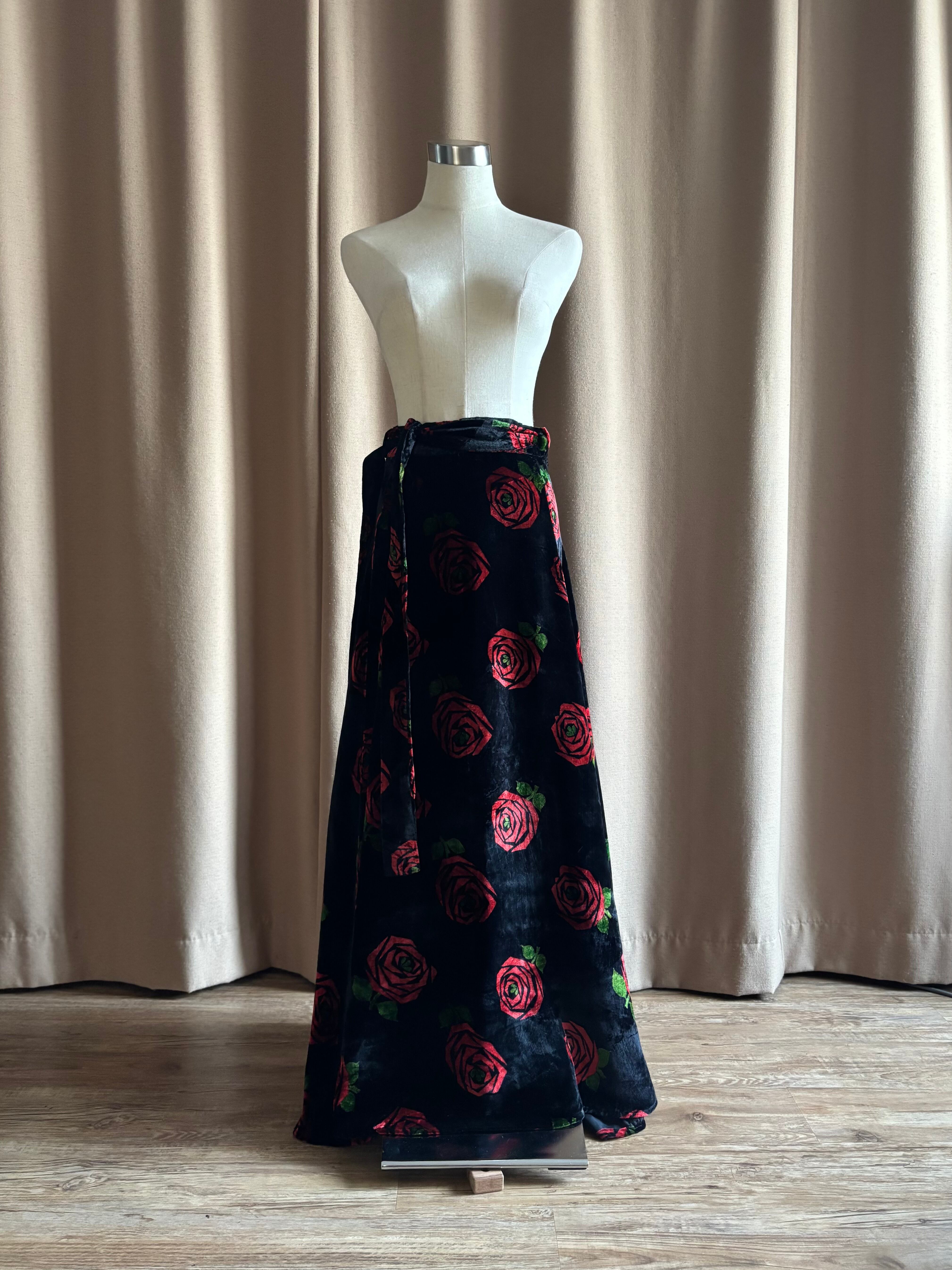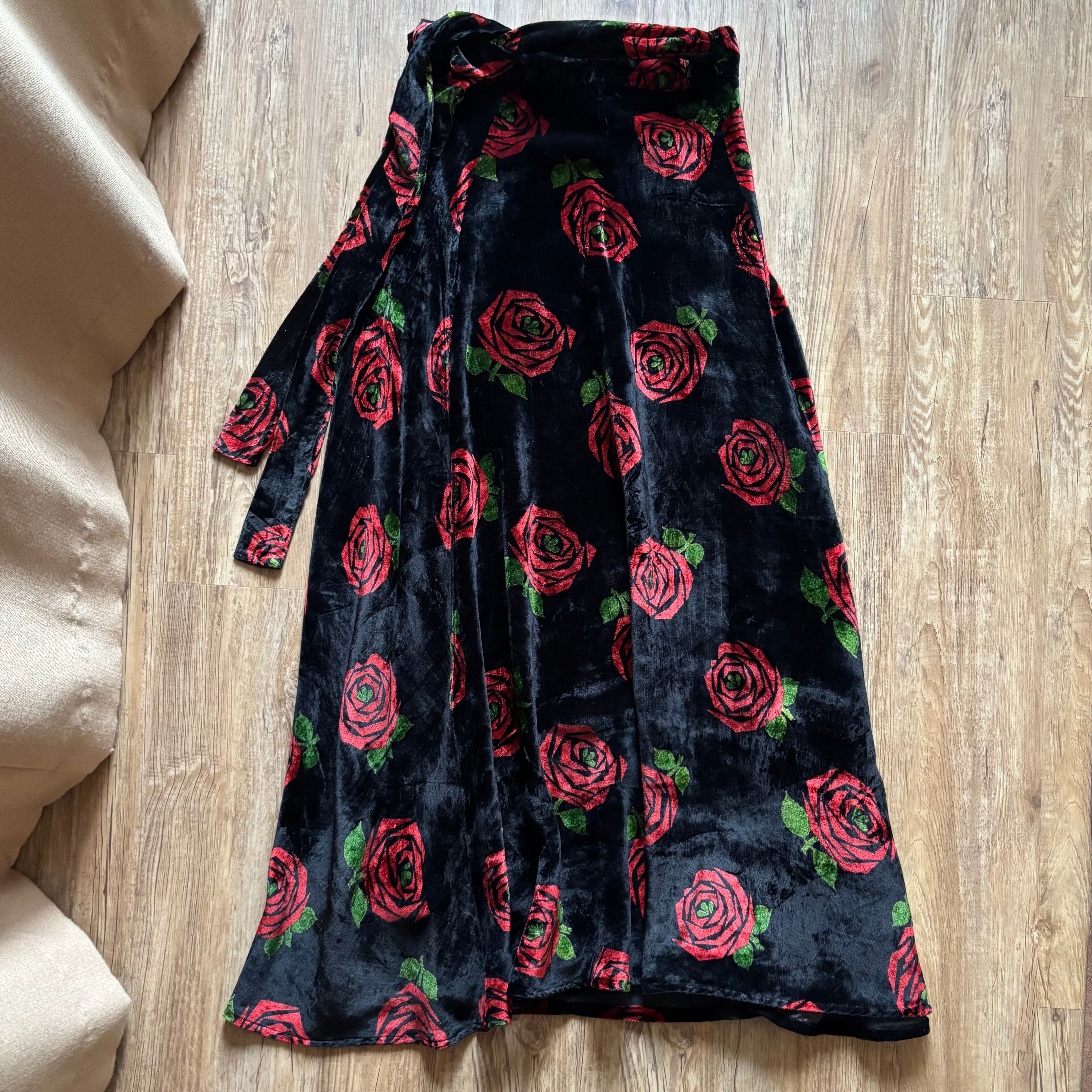 red rose pattern velour maxi skirt-5096-12