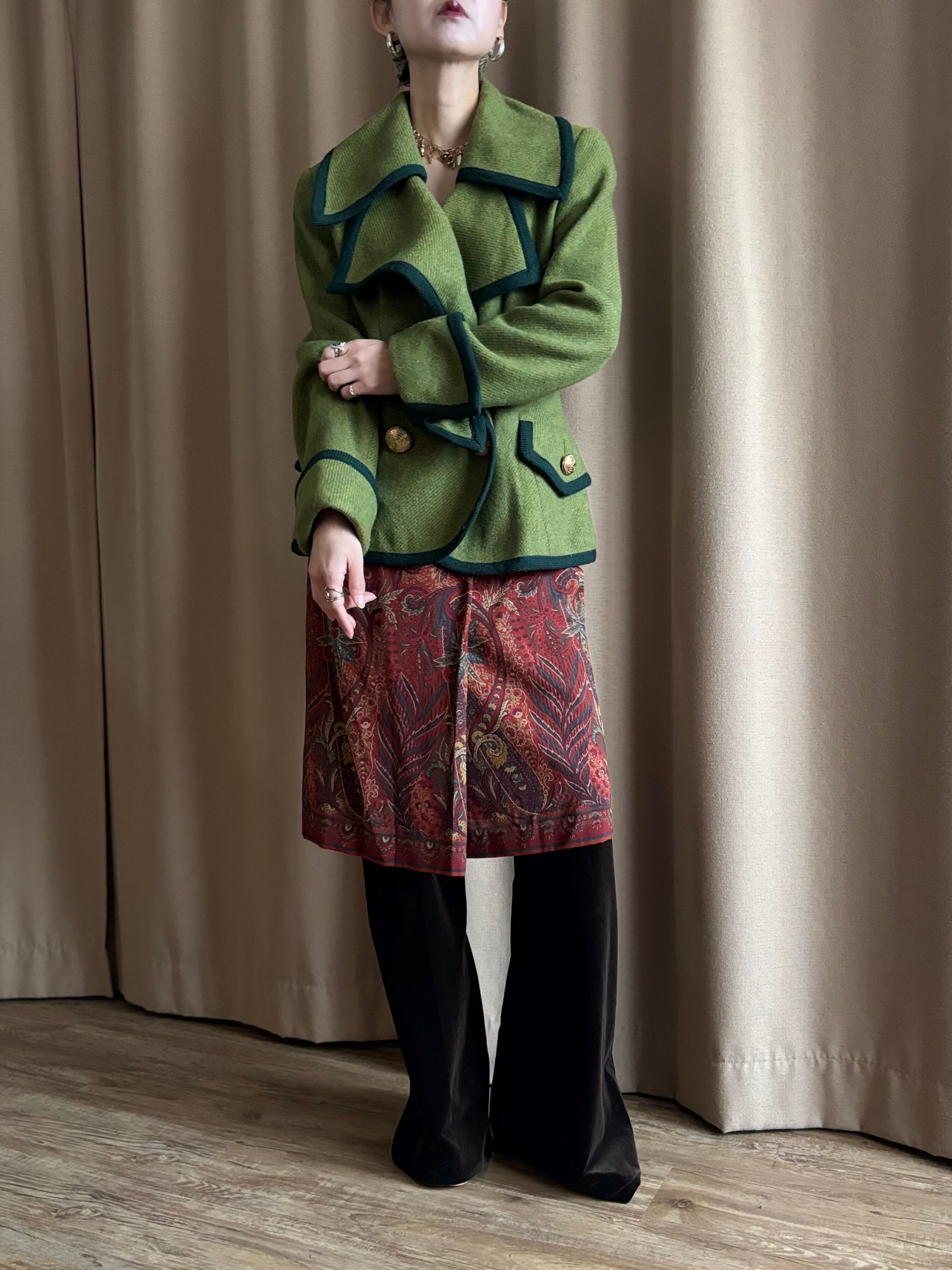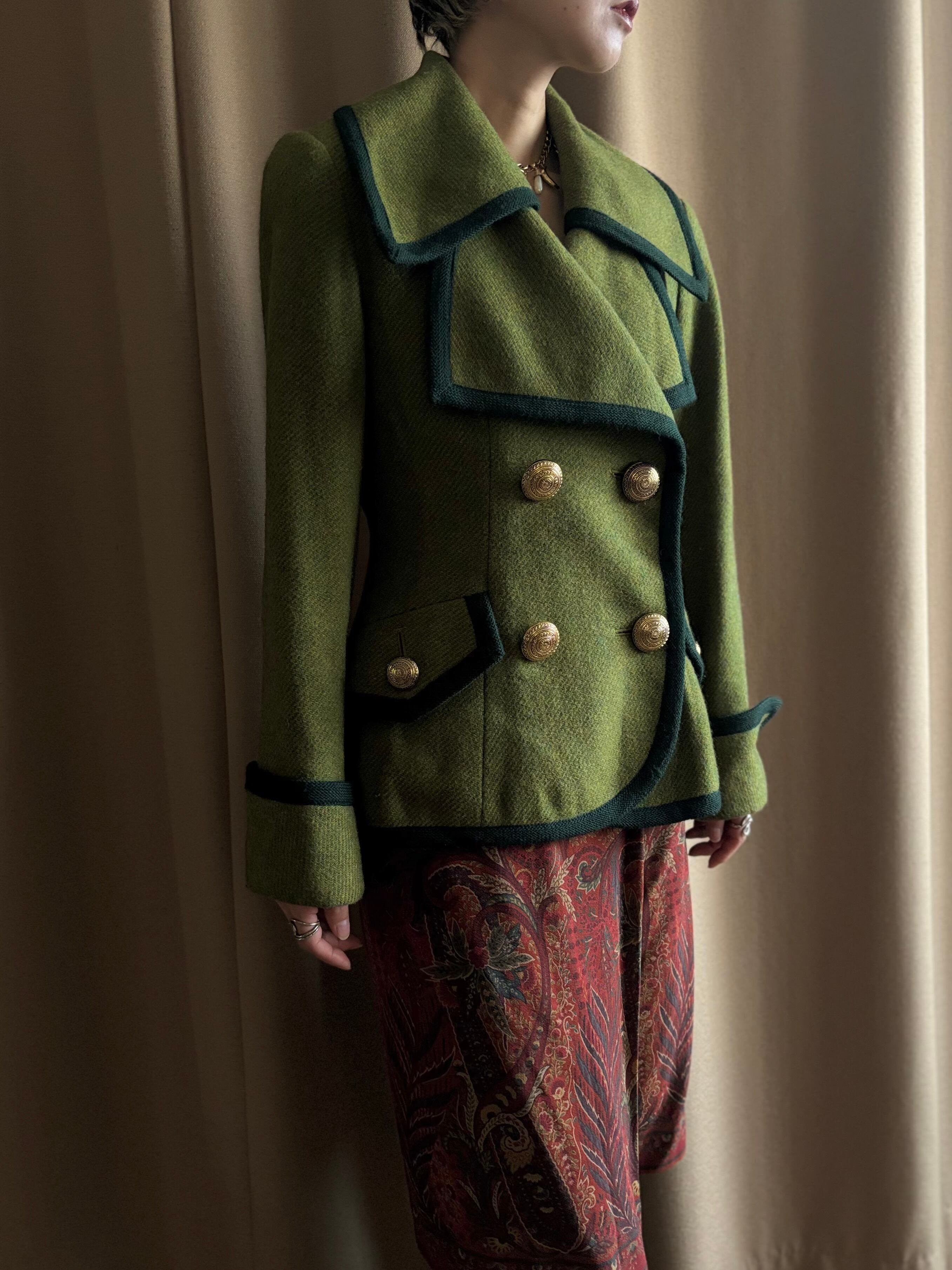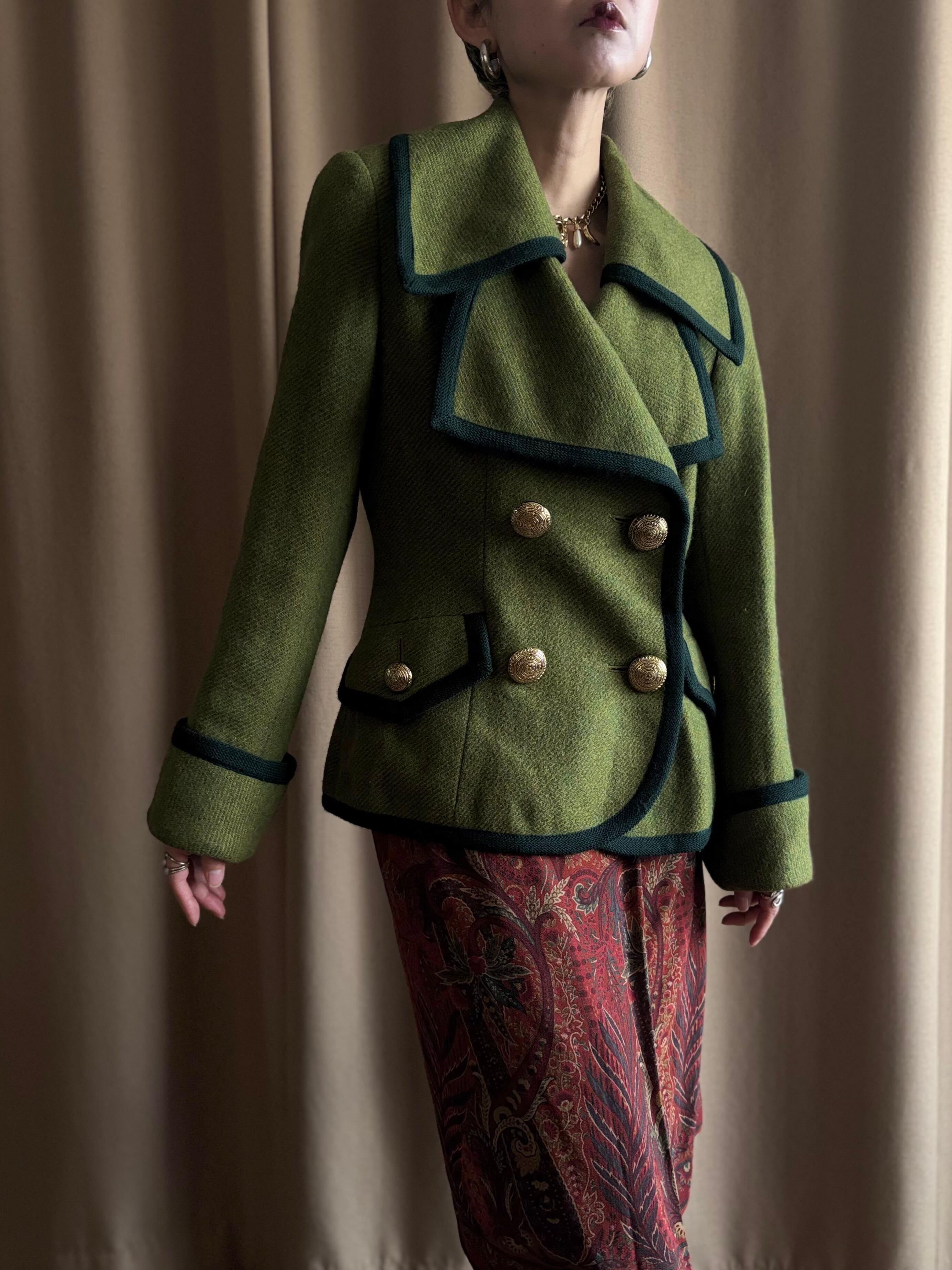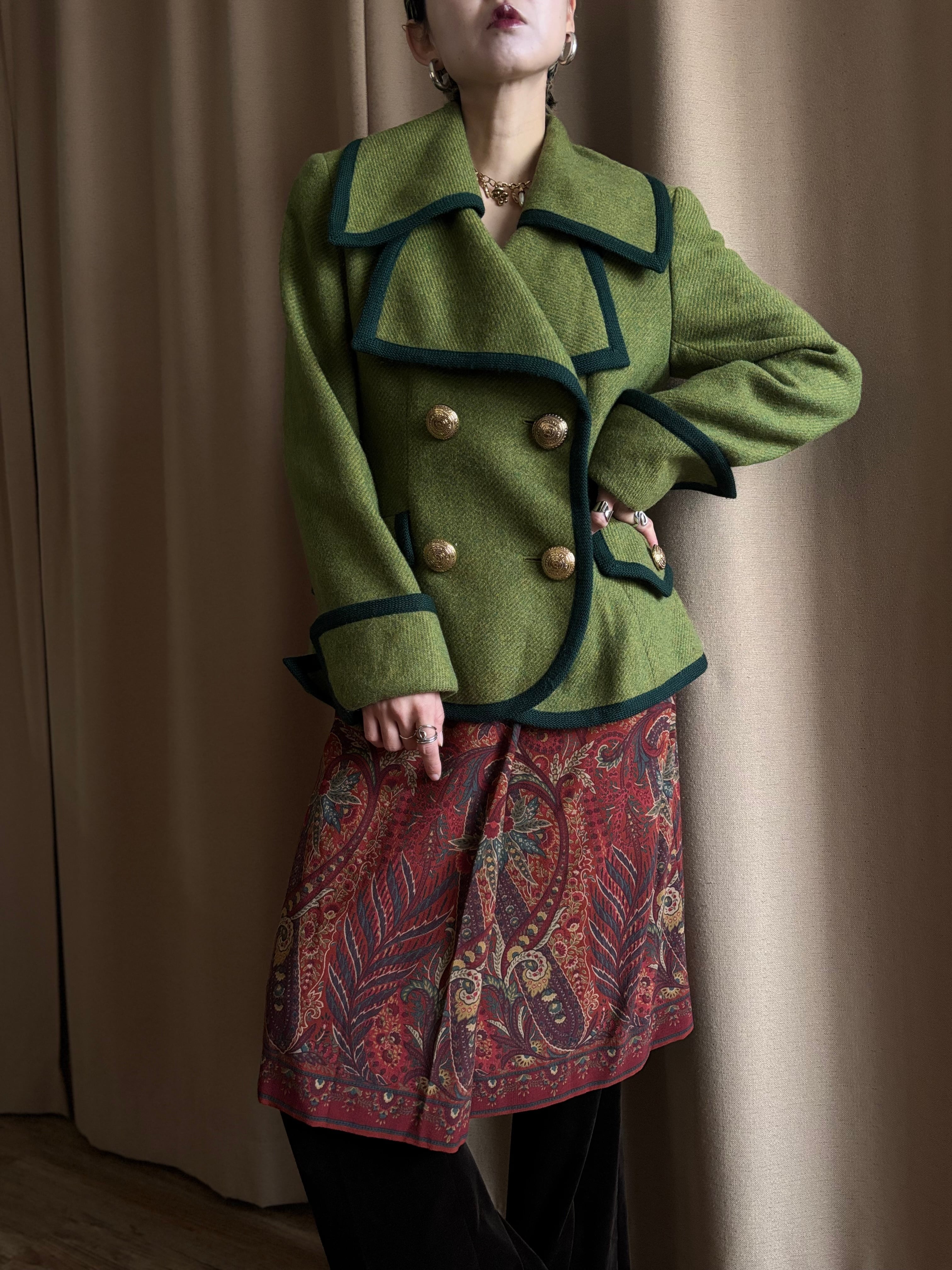 レトロなライトグリーンにダークトーンのトリミングを施したコントラストが美しい一着。
