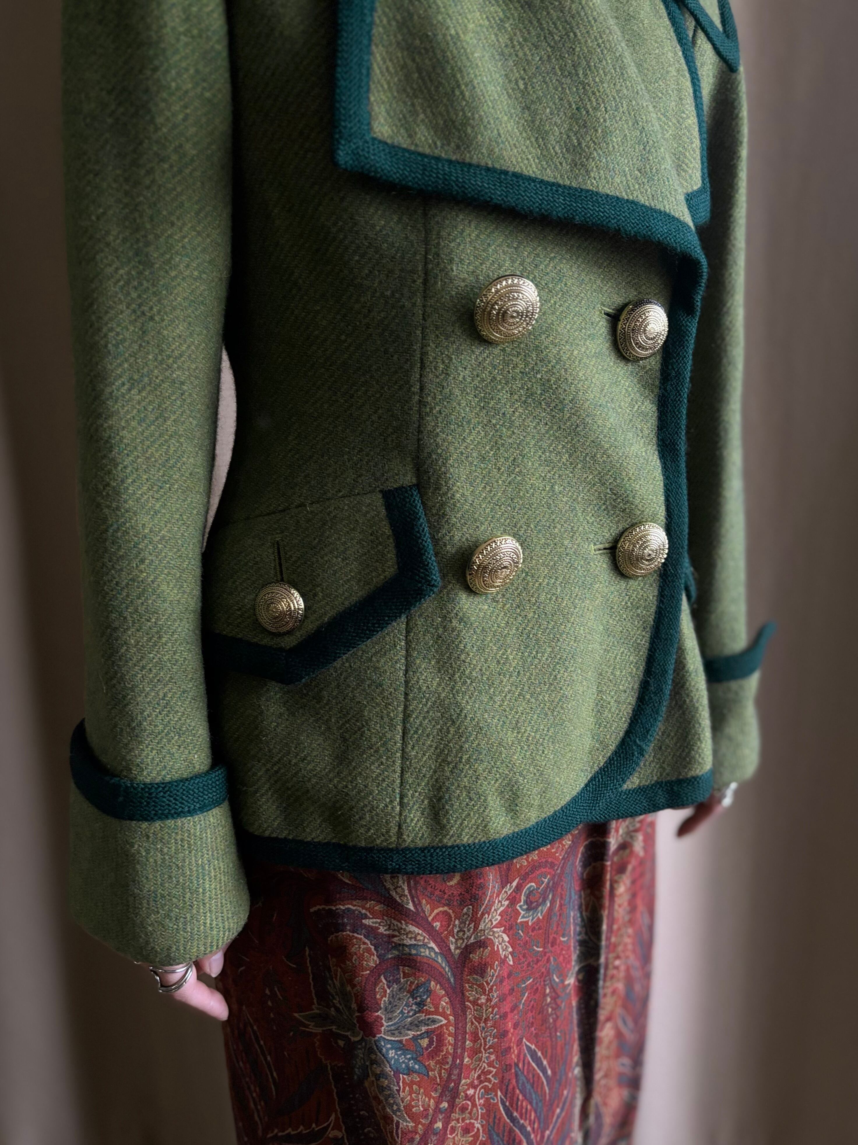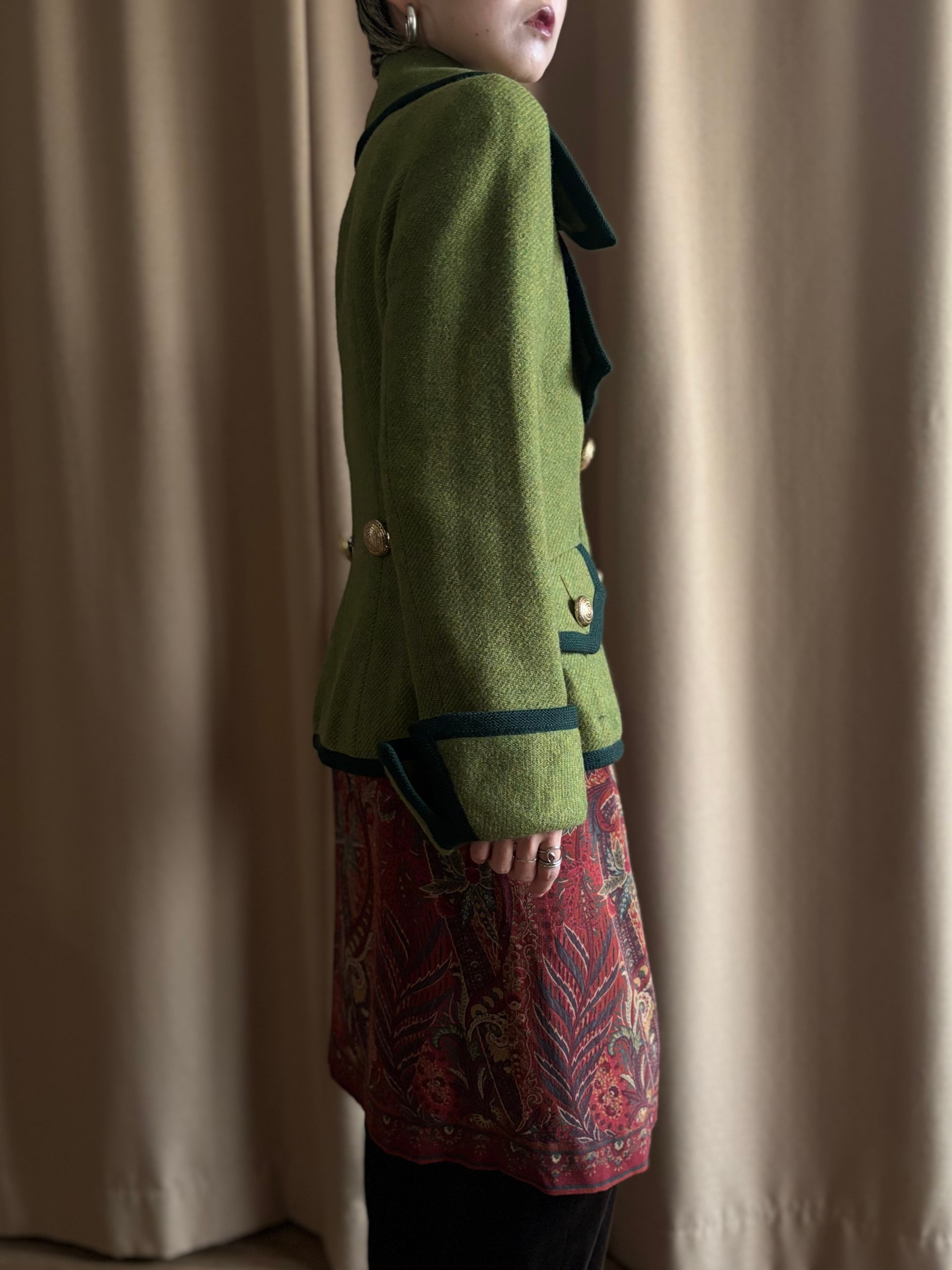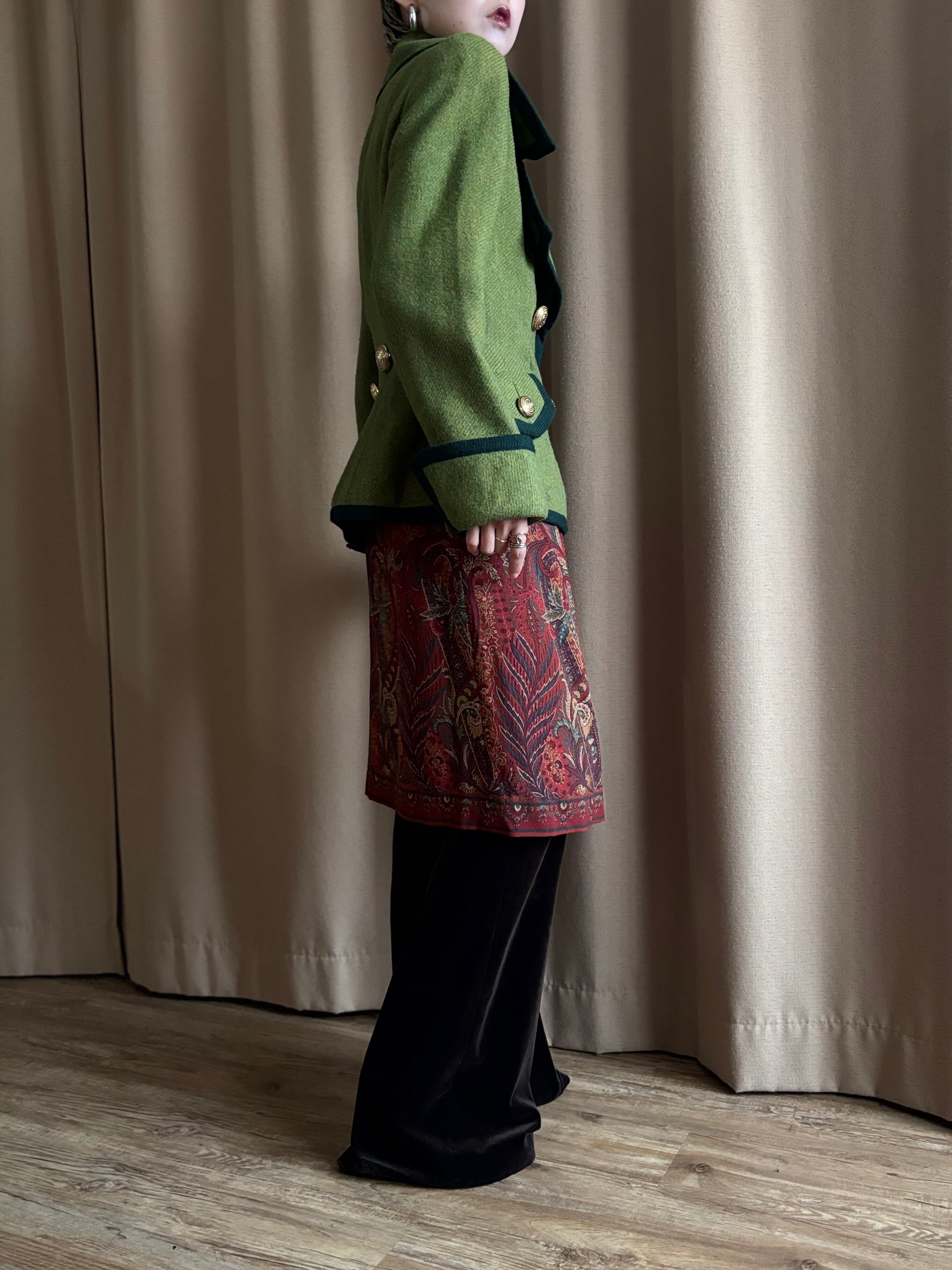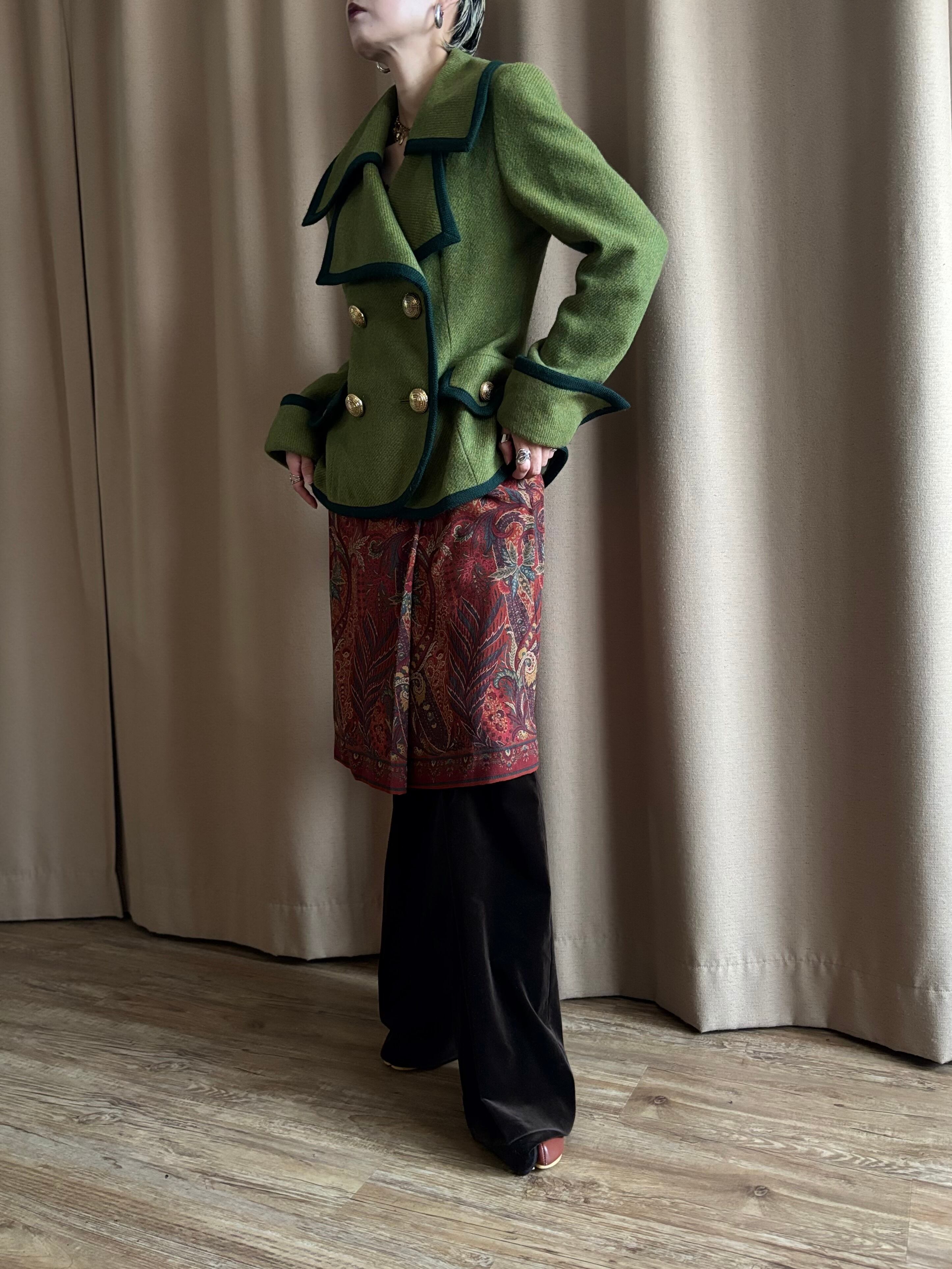 レトロなライトグリーンにダークトーンのトリミングを施したコントラストが美しい一着。