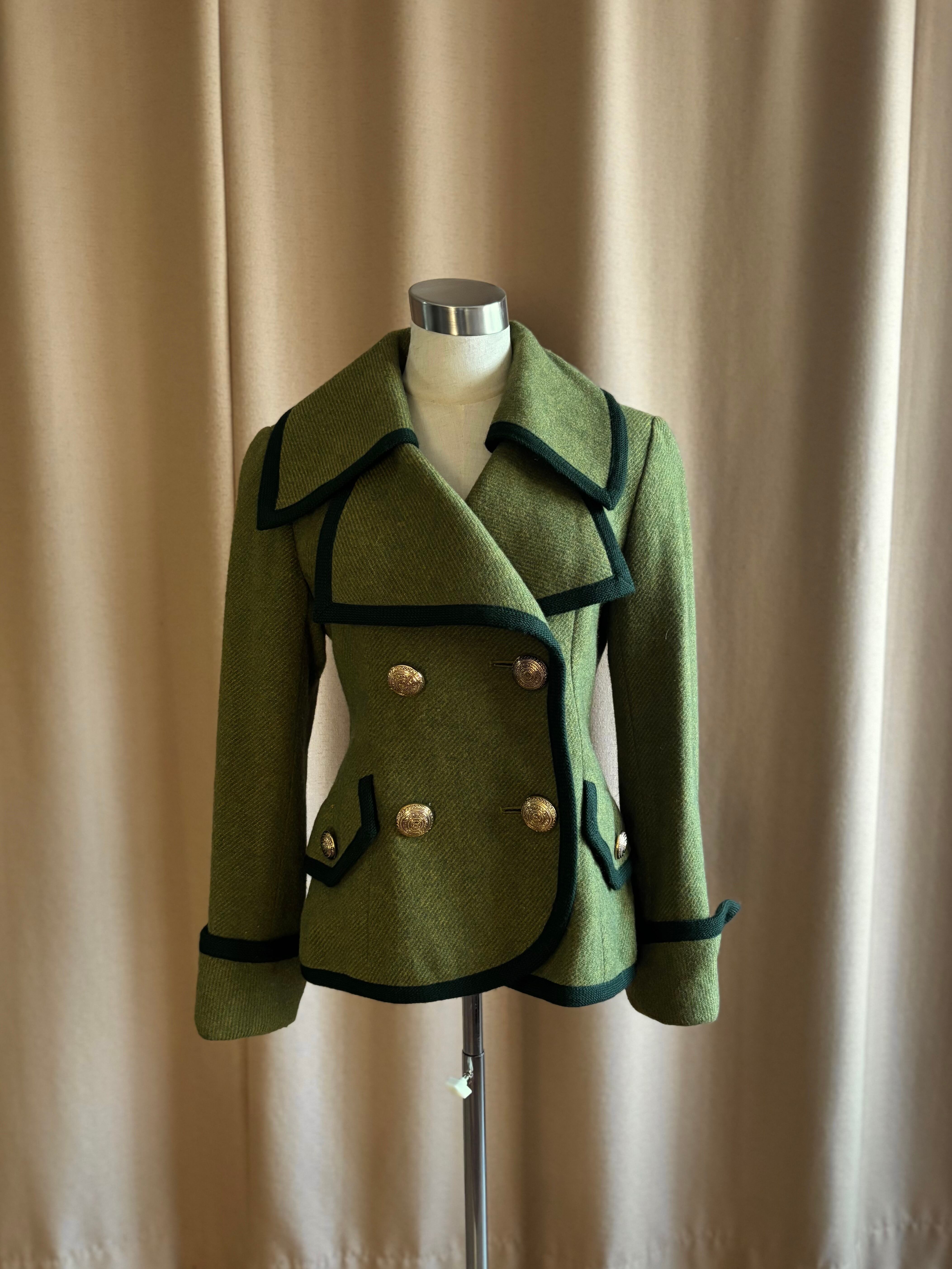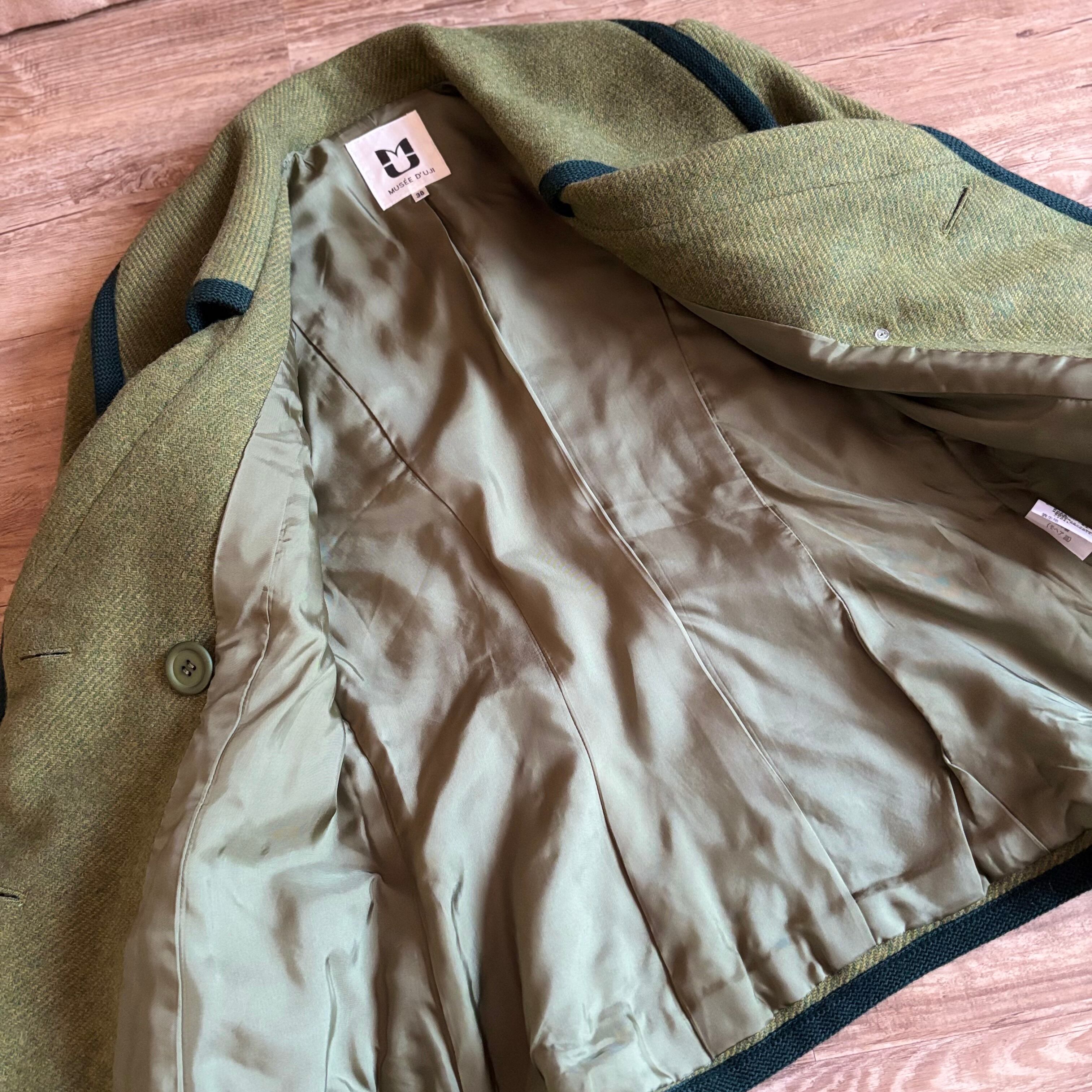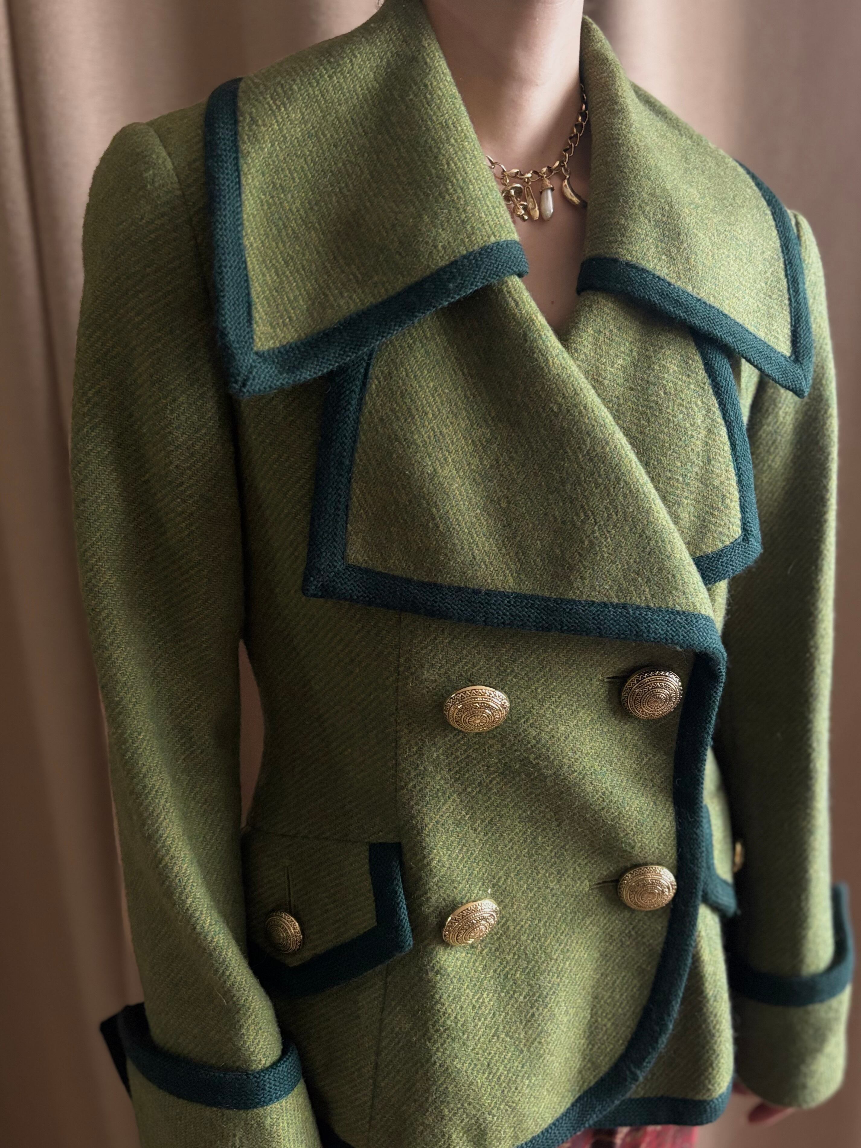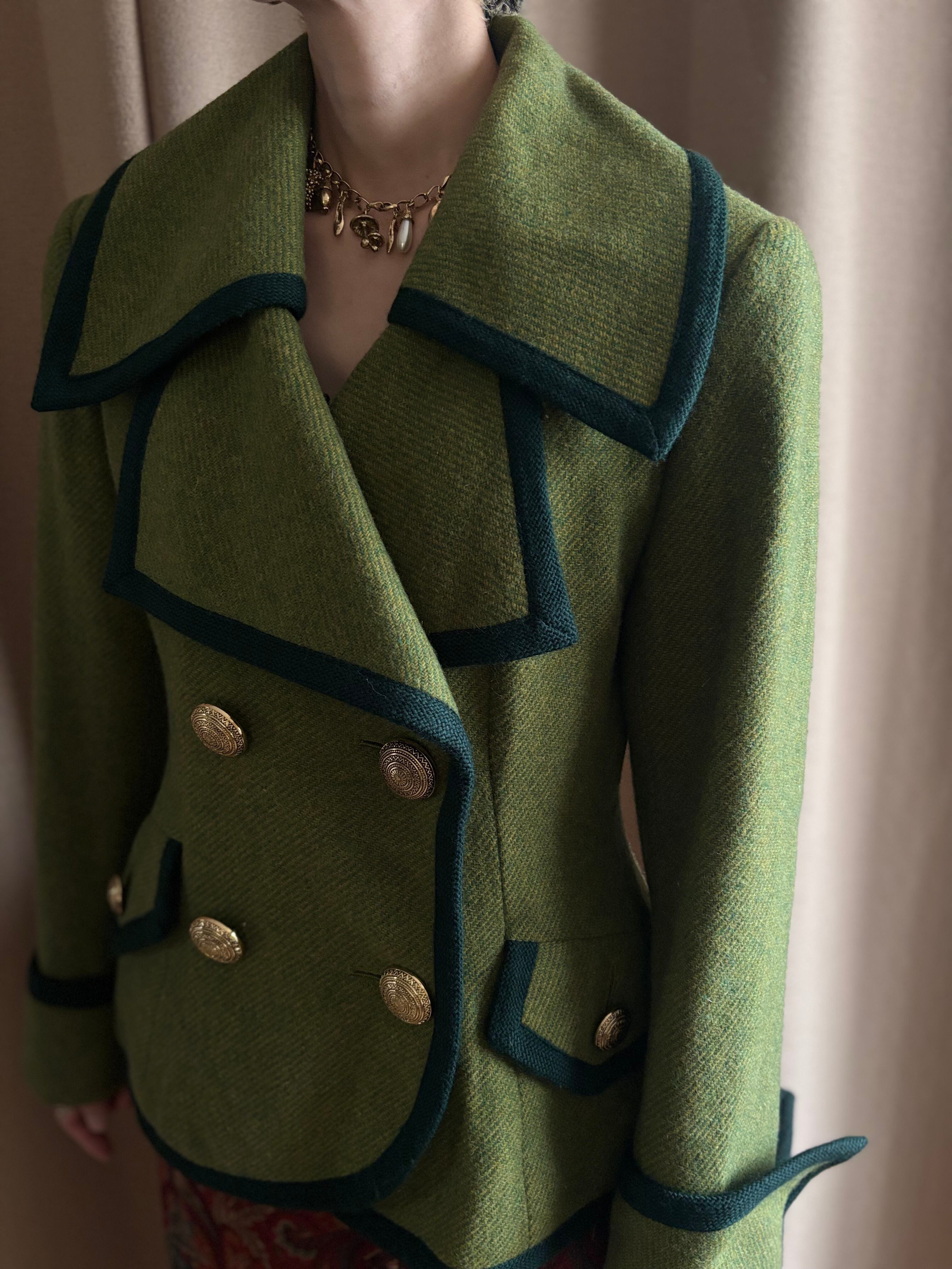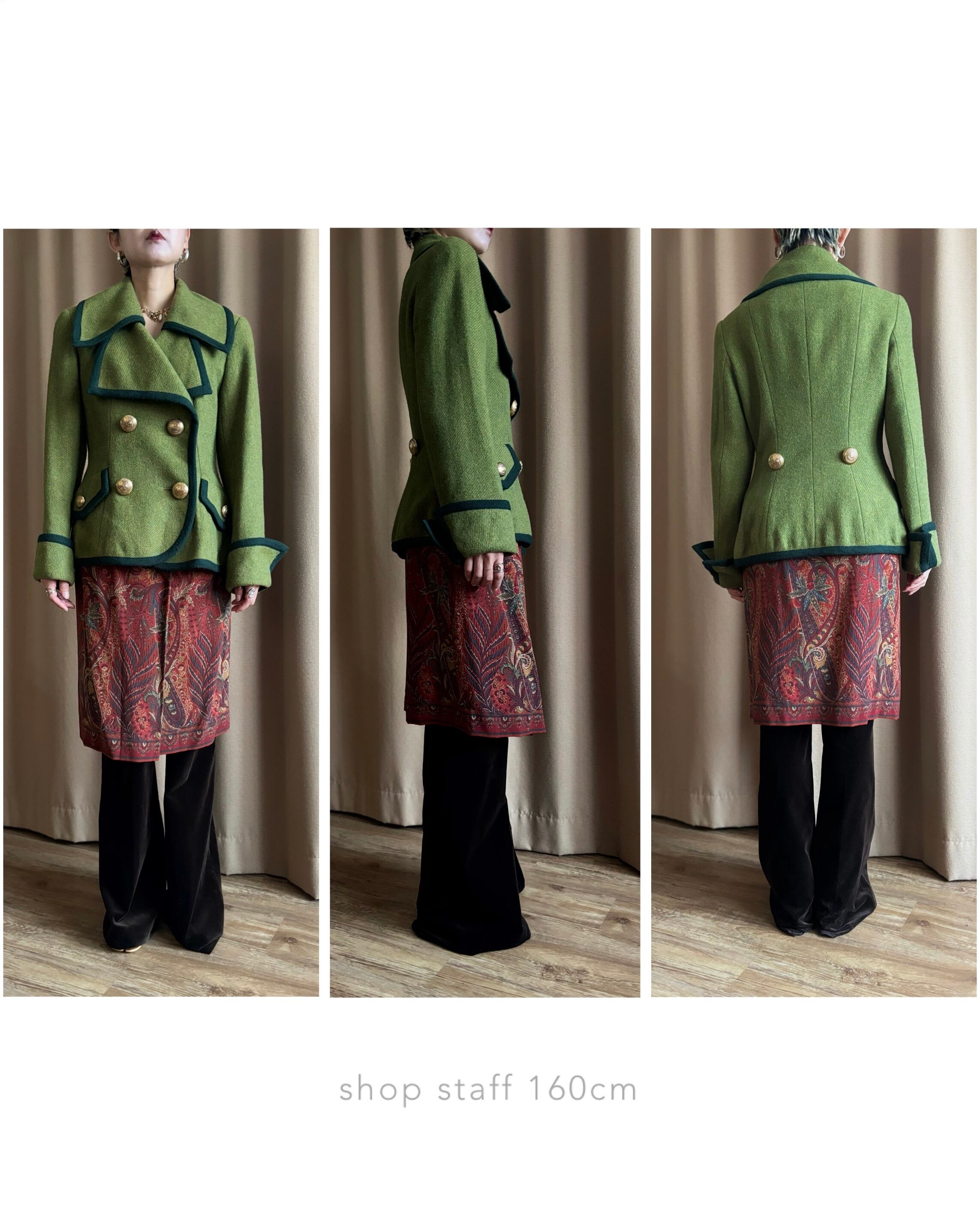 レトロなライトグリーンにダークトーンのトリミングを施したコントラストが美しい一着。