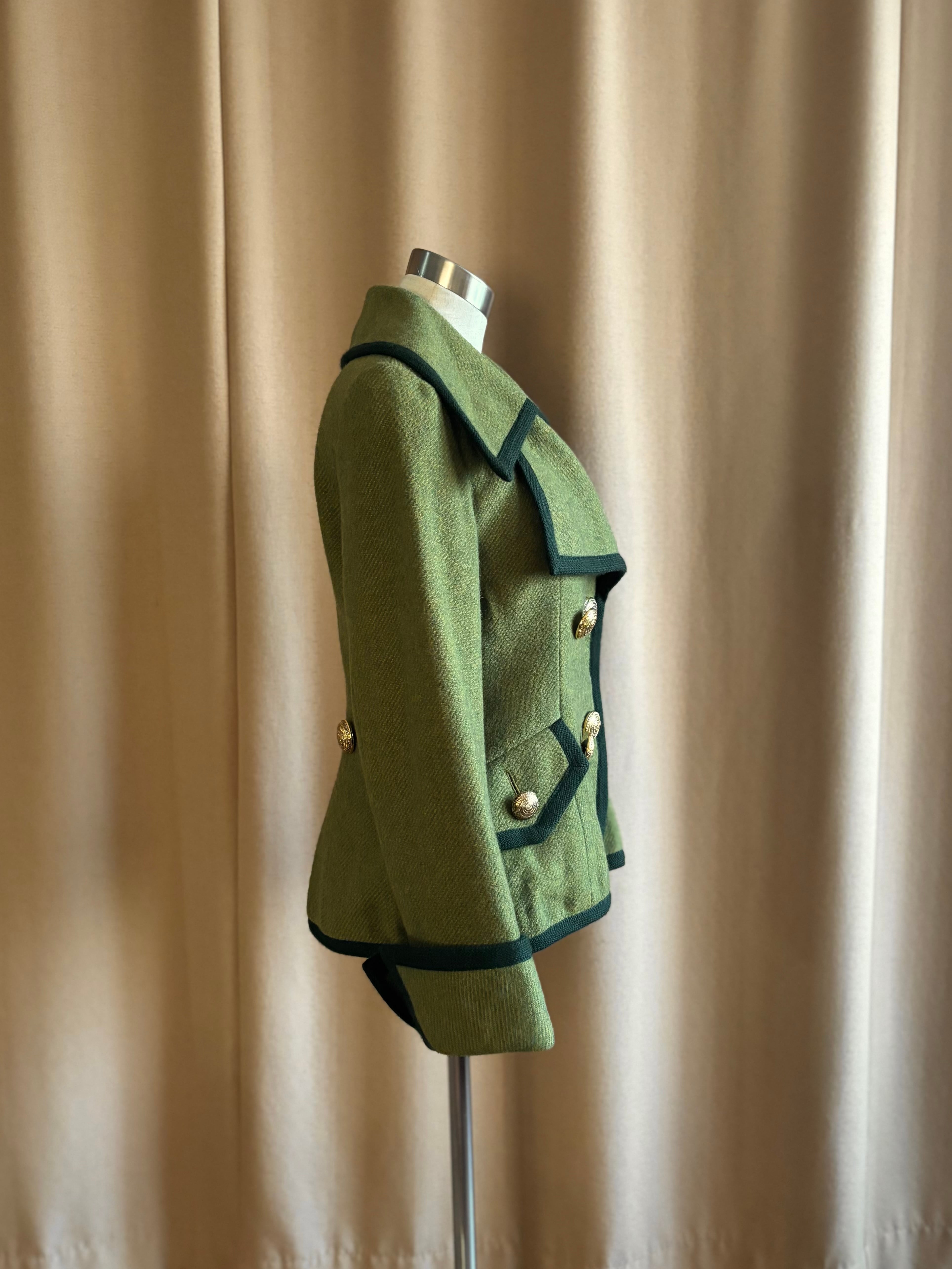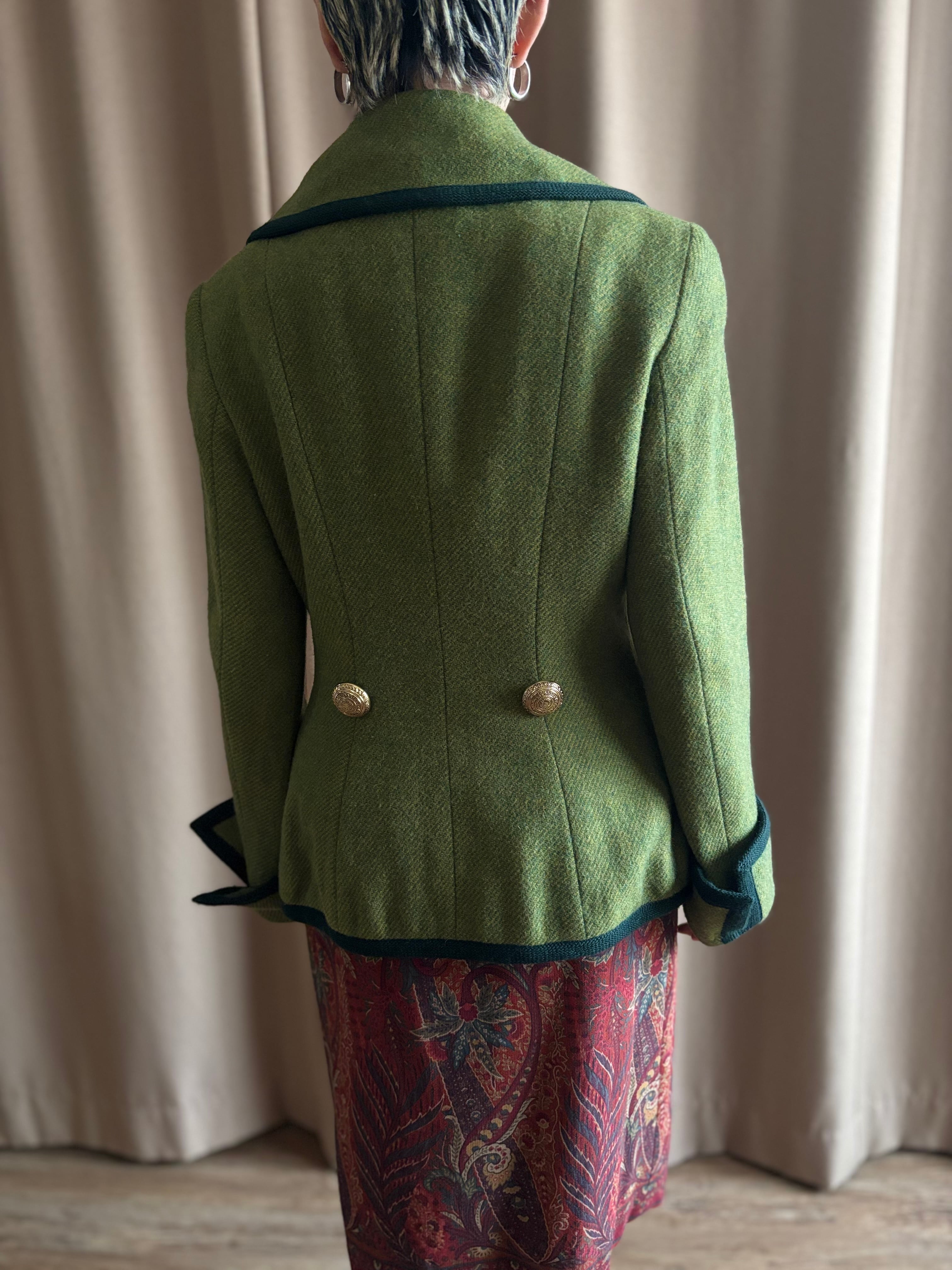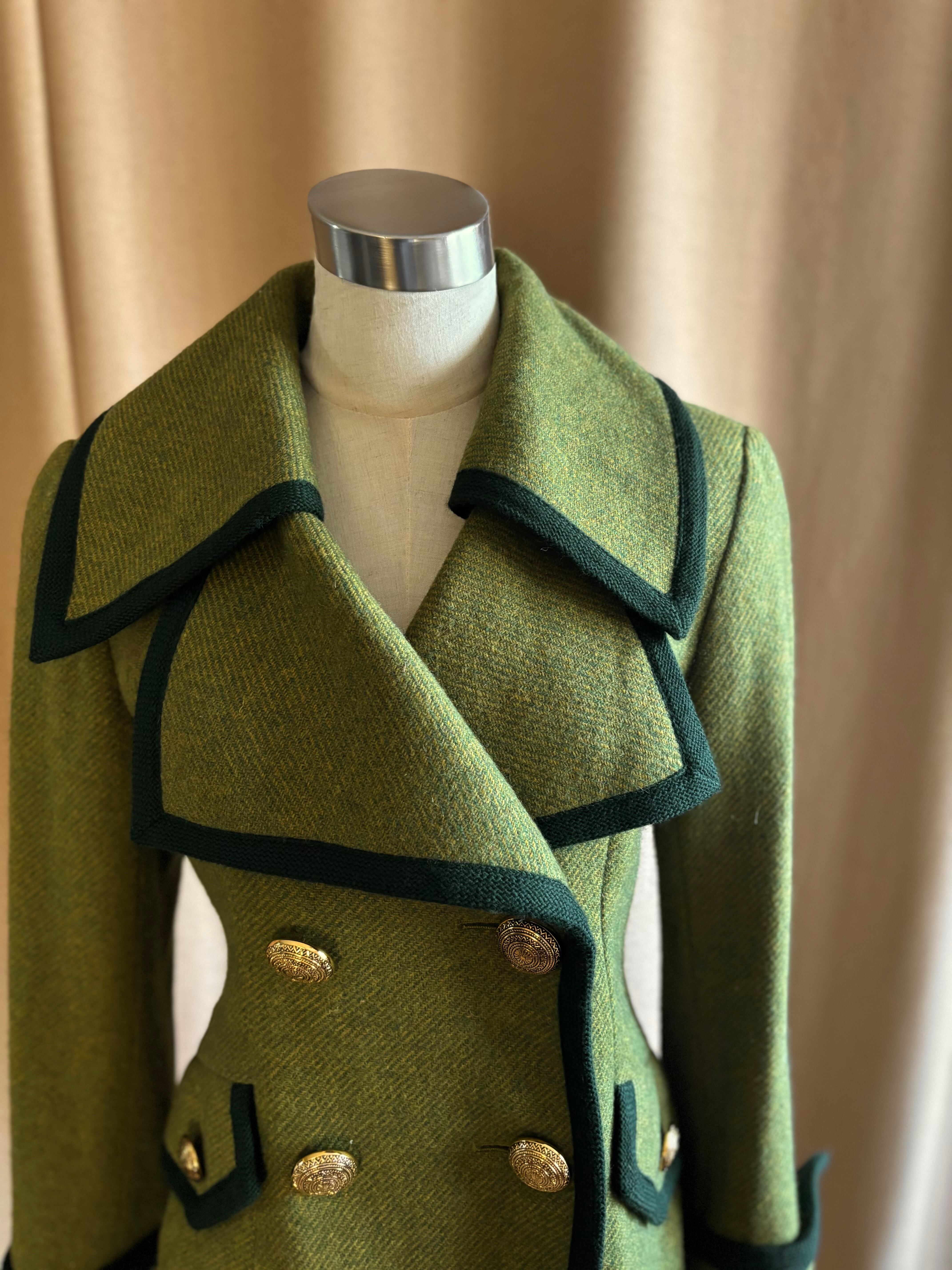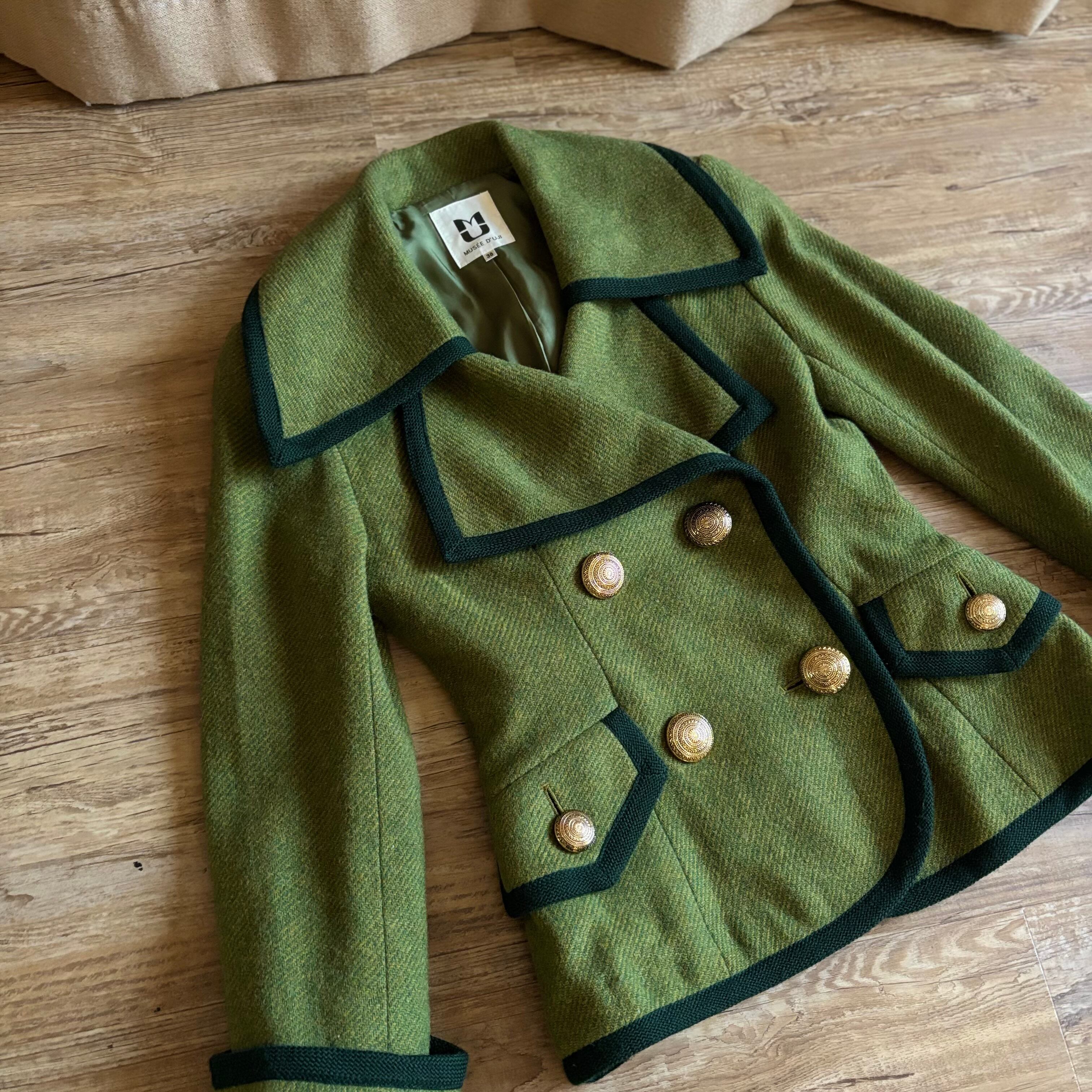 レトロなライトグリーンにダークトーンのトリミングを施したコントラストが美しい一着。