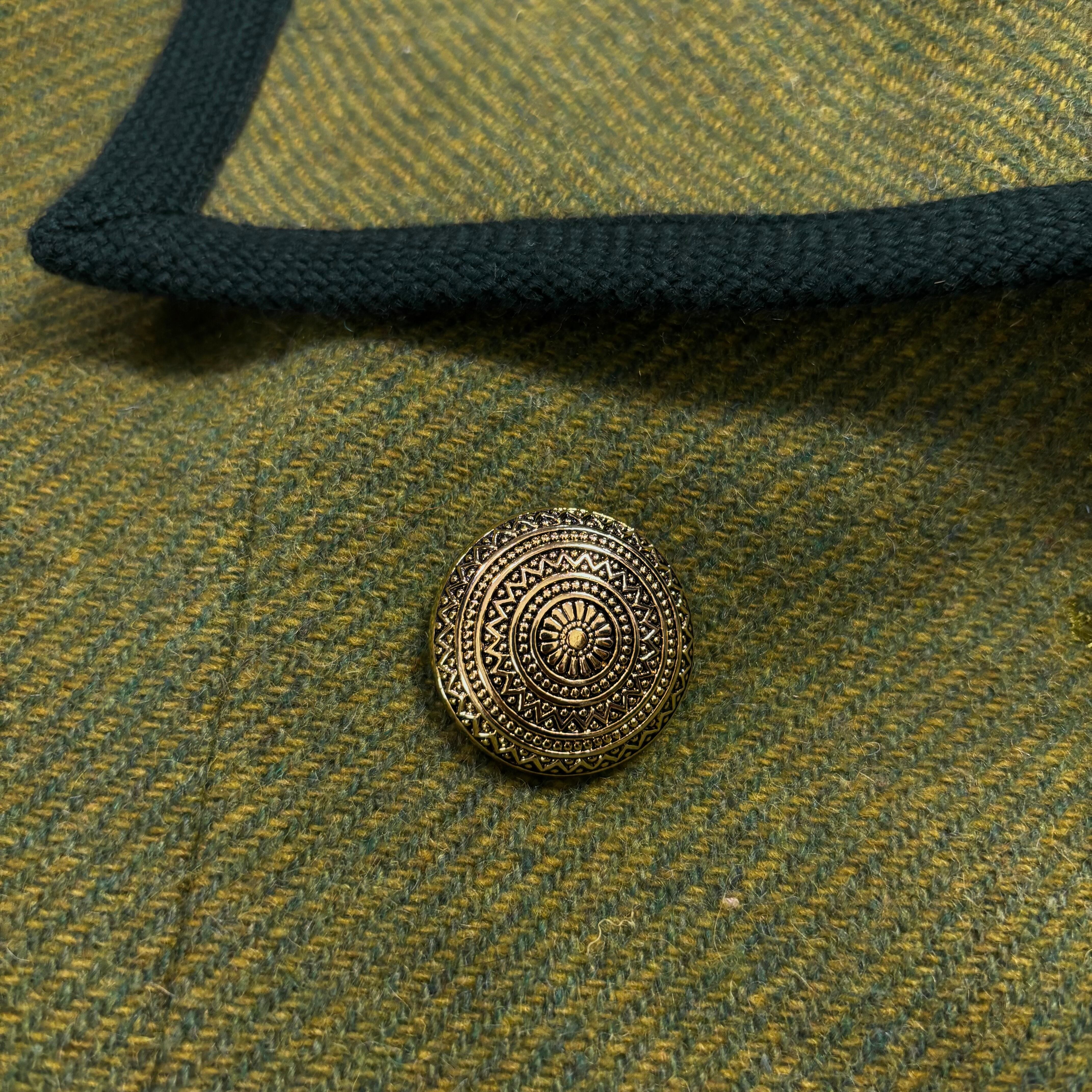 フロントに並ぶ重厚感のあるゴールドボタンがヴィンテージライクな雰囲気をさらに高めてくれる拘り。