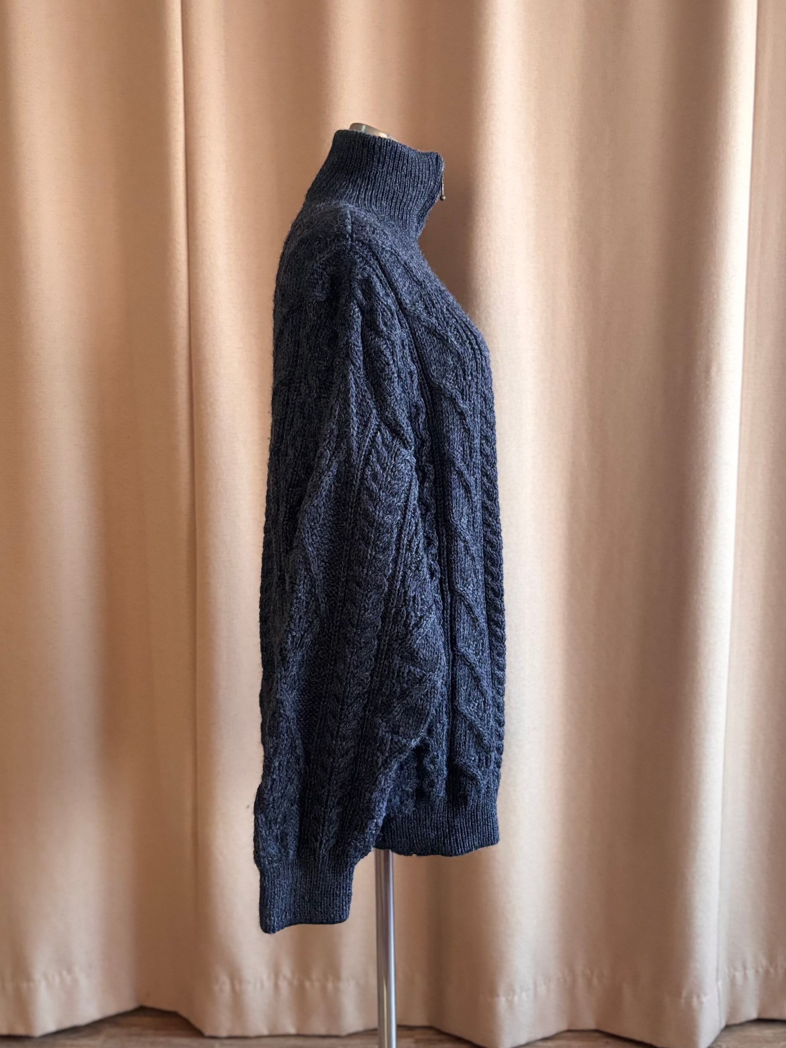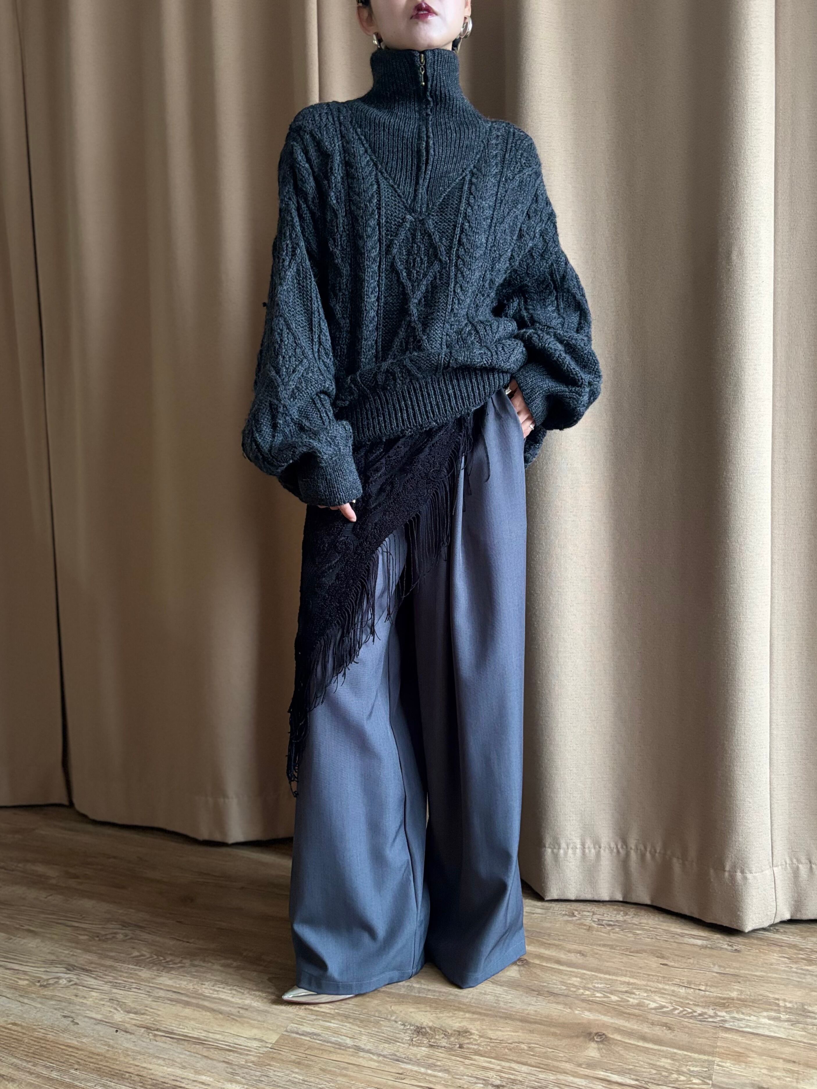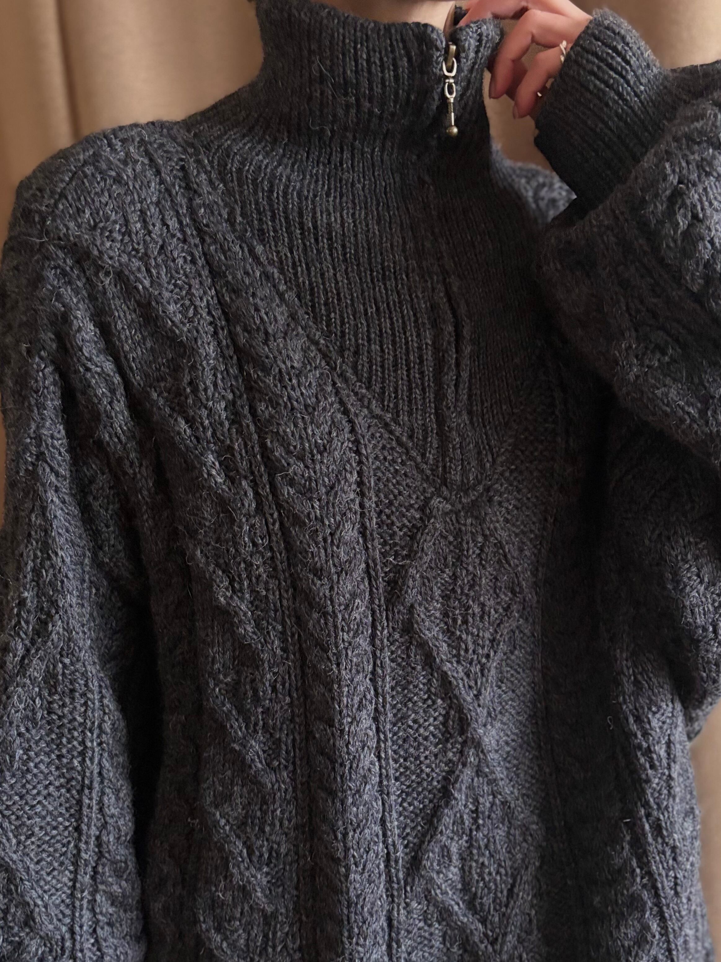 重厚な編み柄と立ち上がるハイネックが印象的な、存在感たっぷりのウールハーフジップニット。