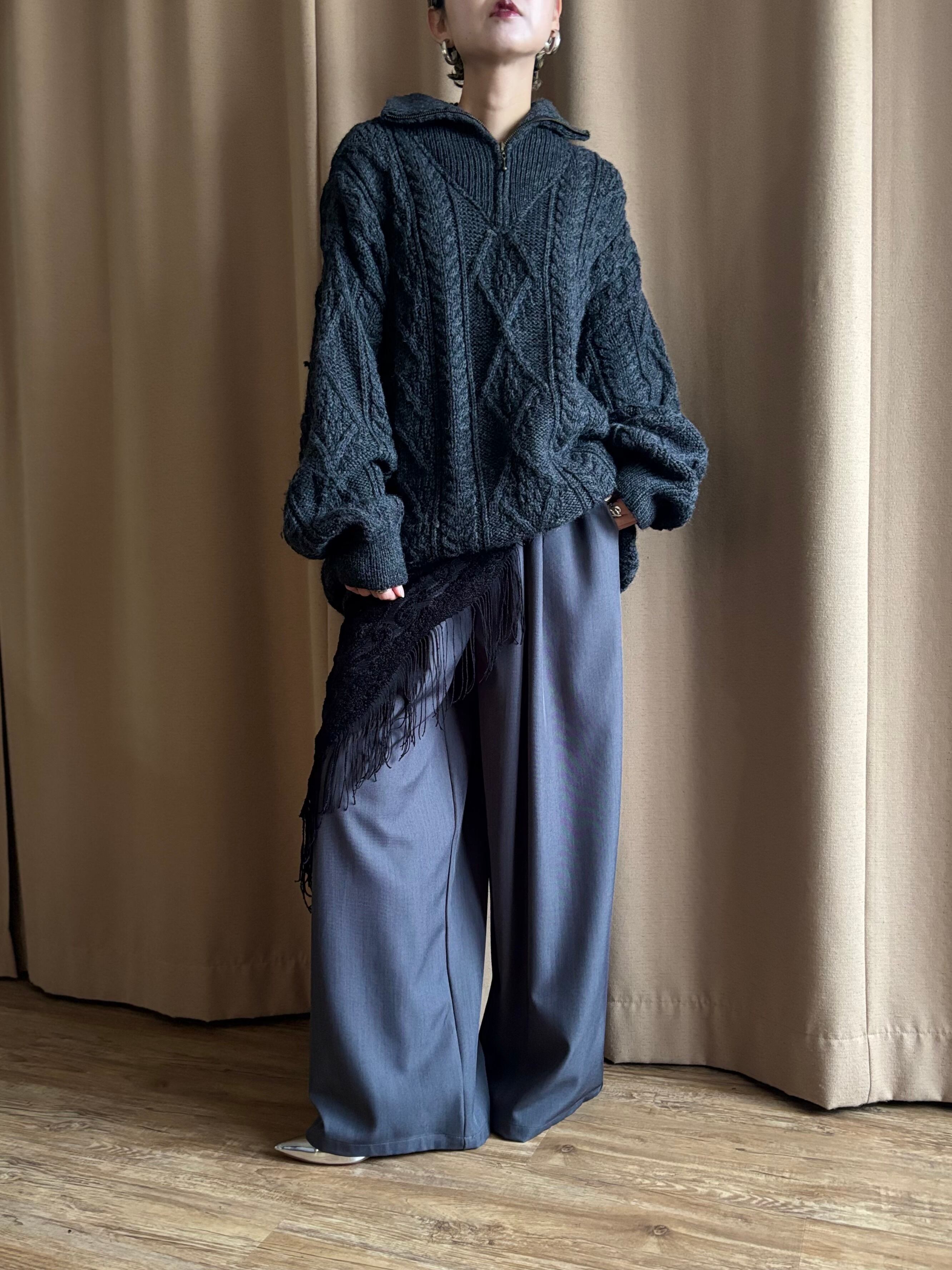 立体的なケーブル編みに、シックなダークトーンがスタイリングを上品に引き締めます。