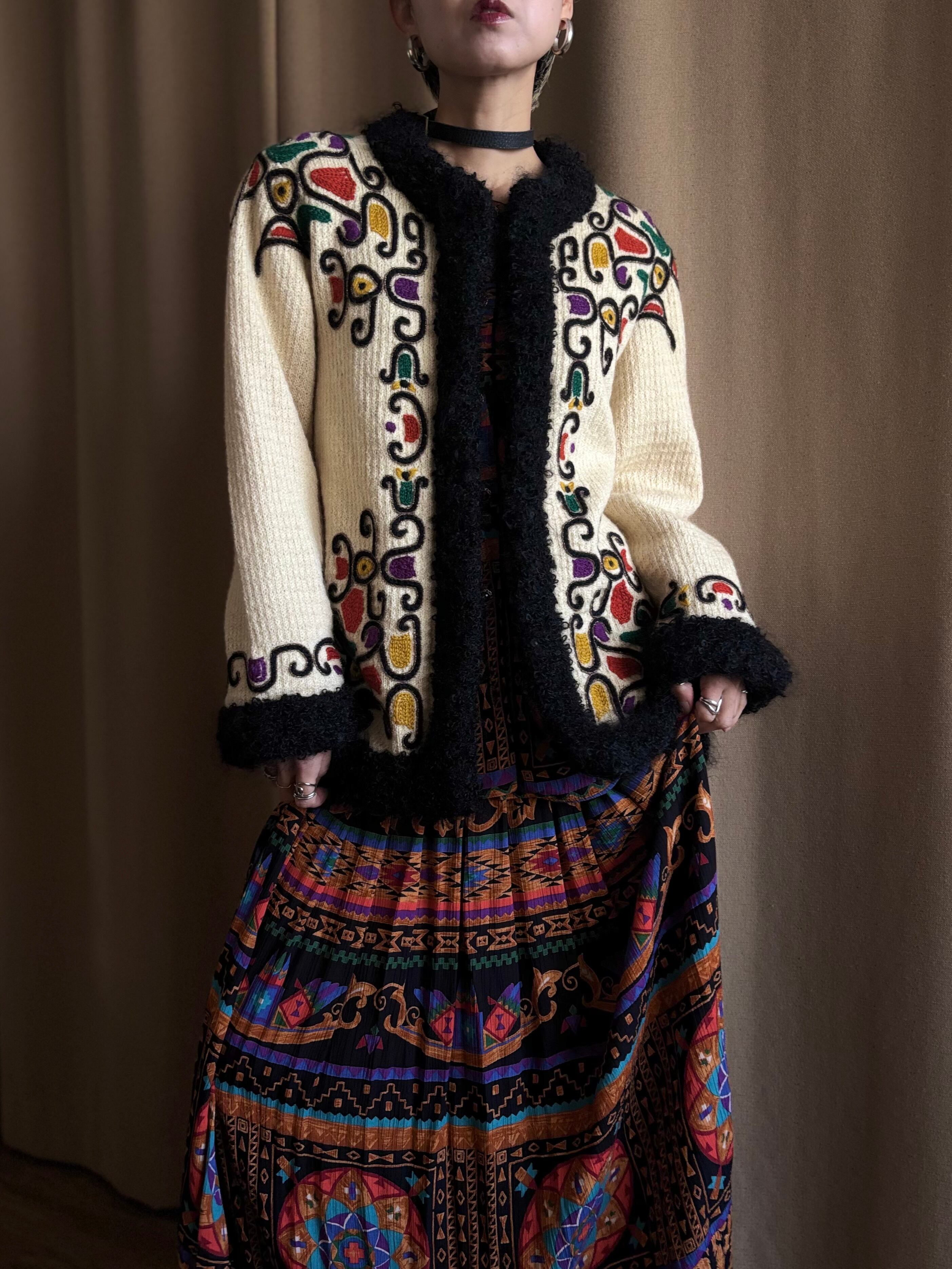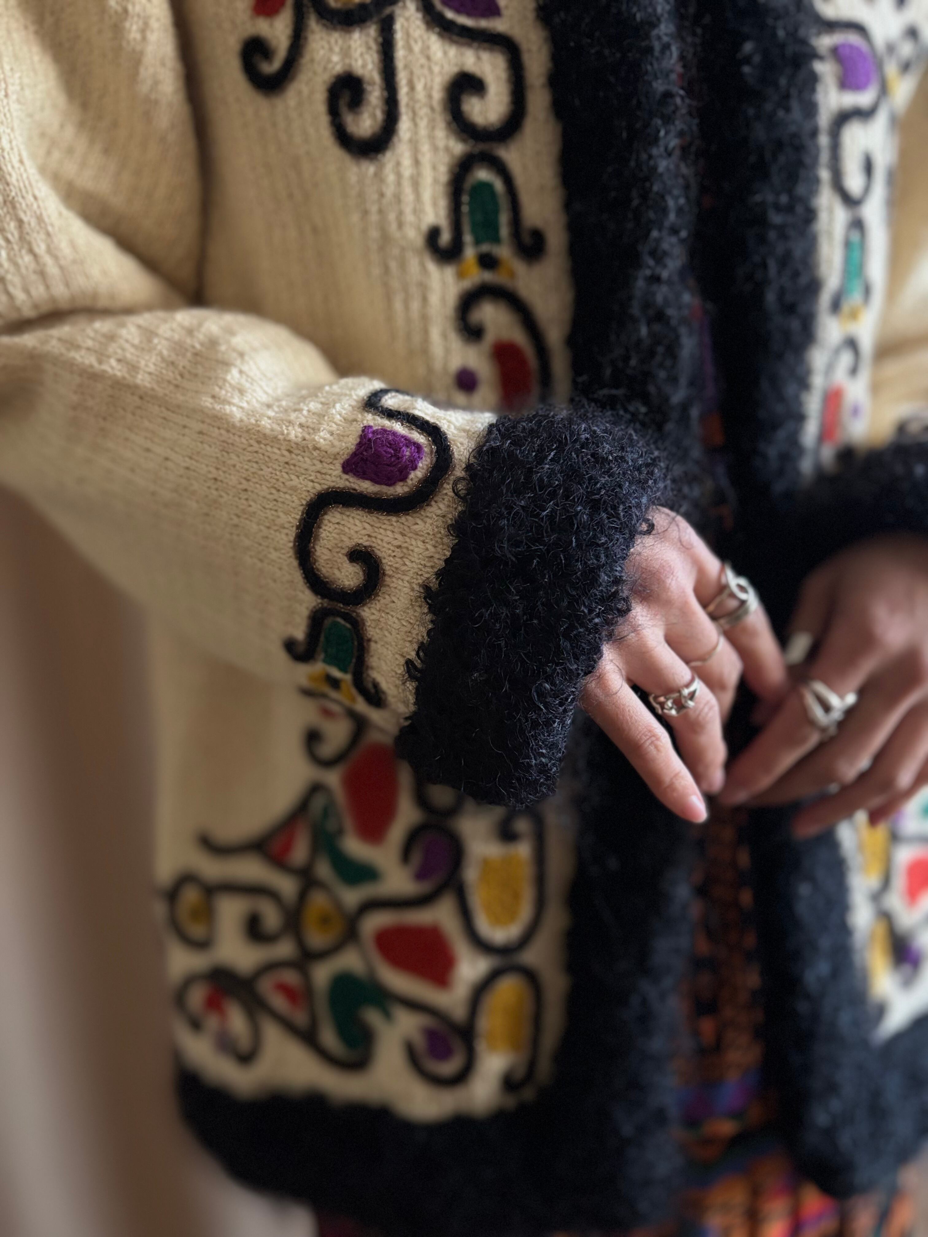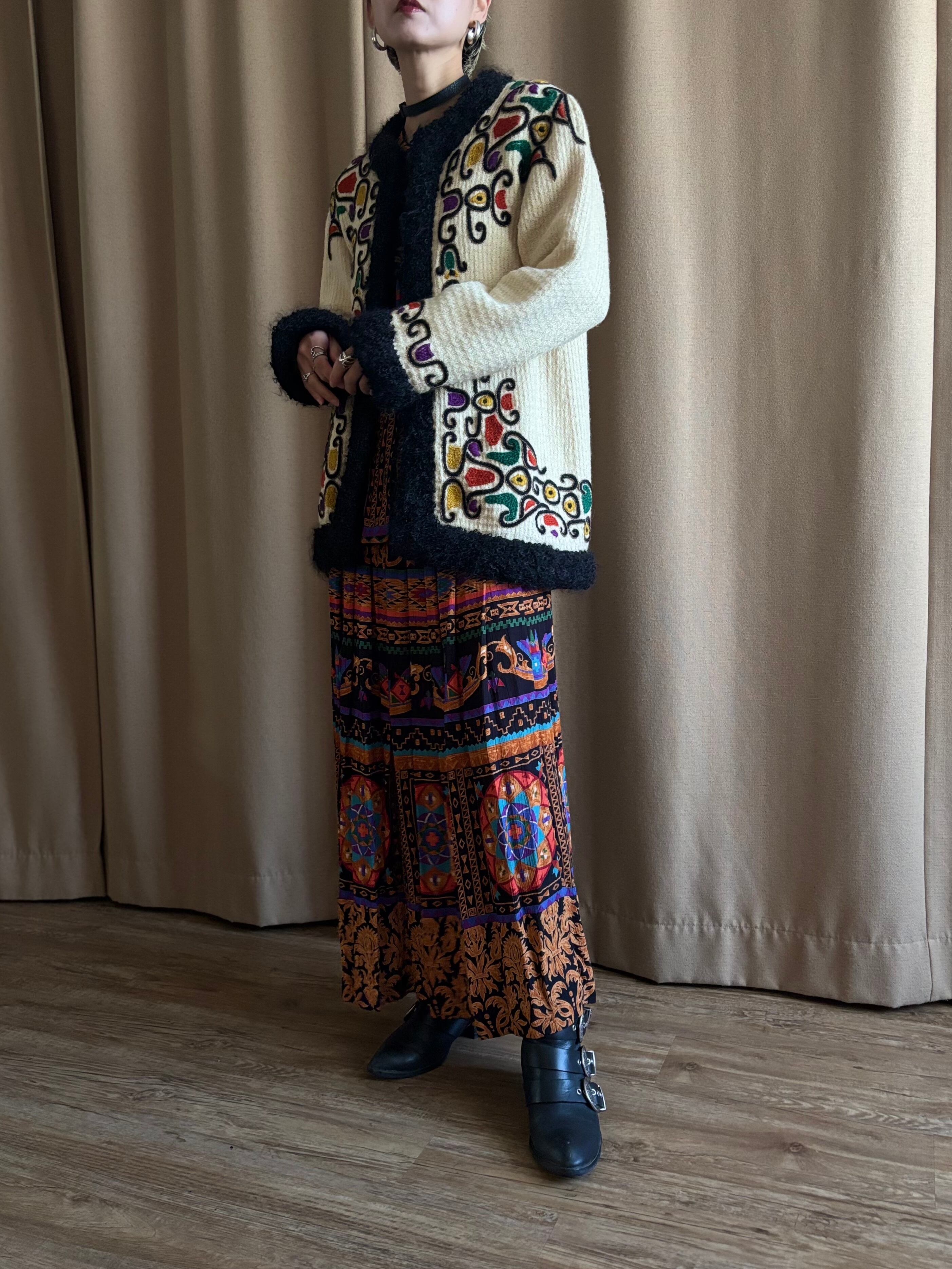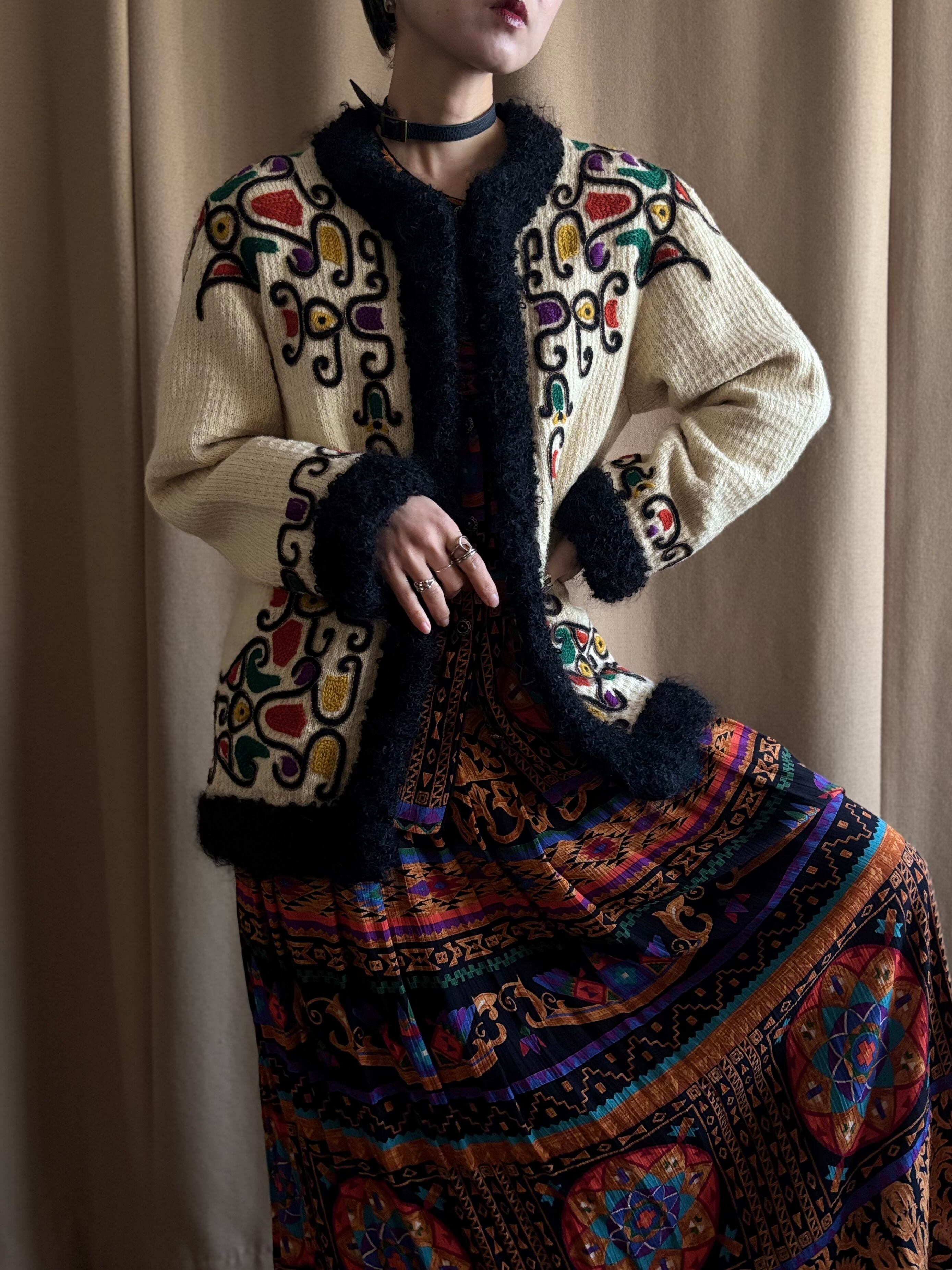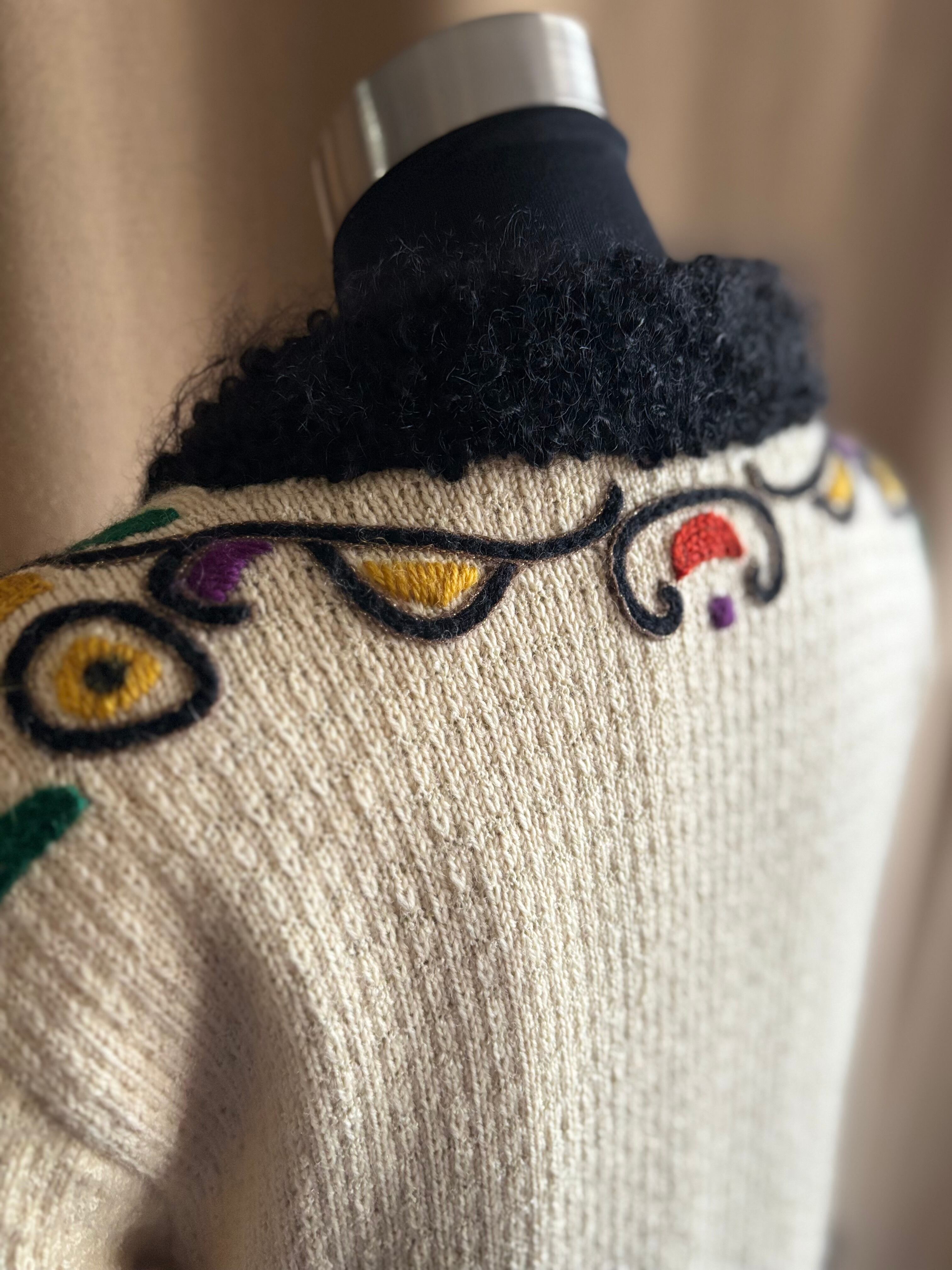 アイボリーベースの柔らかなニットに、色彩豊かな刺繍が映える一着。