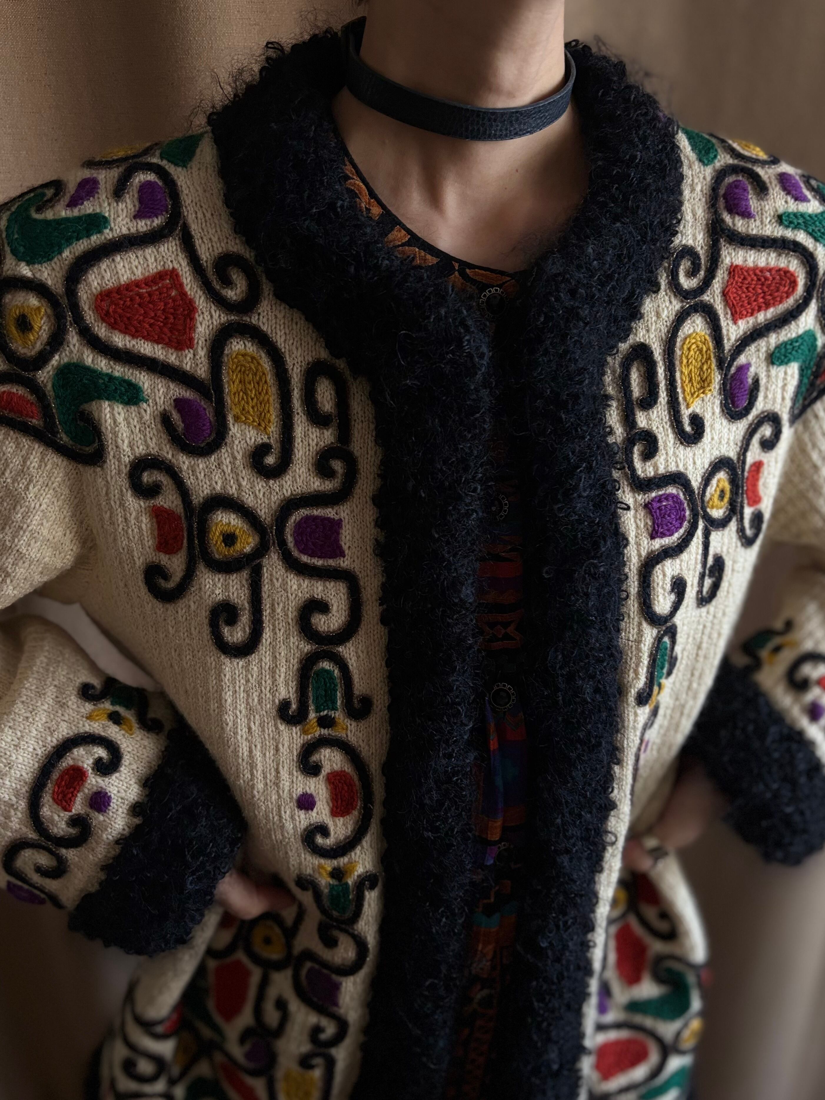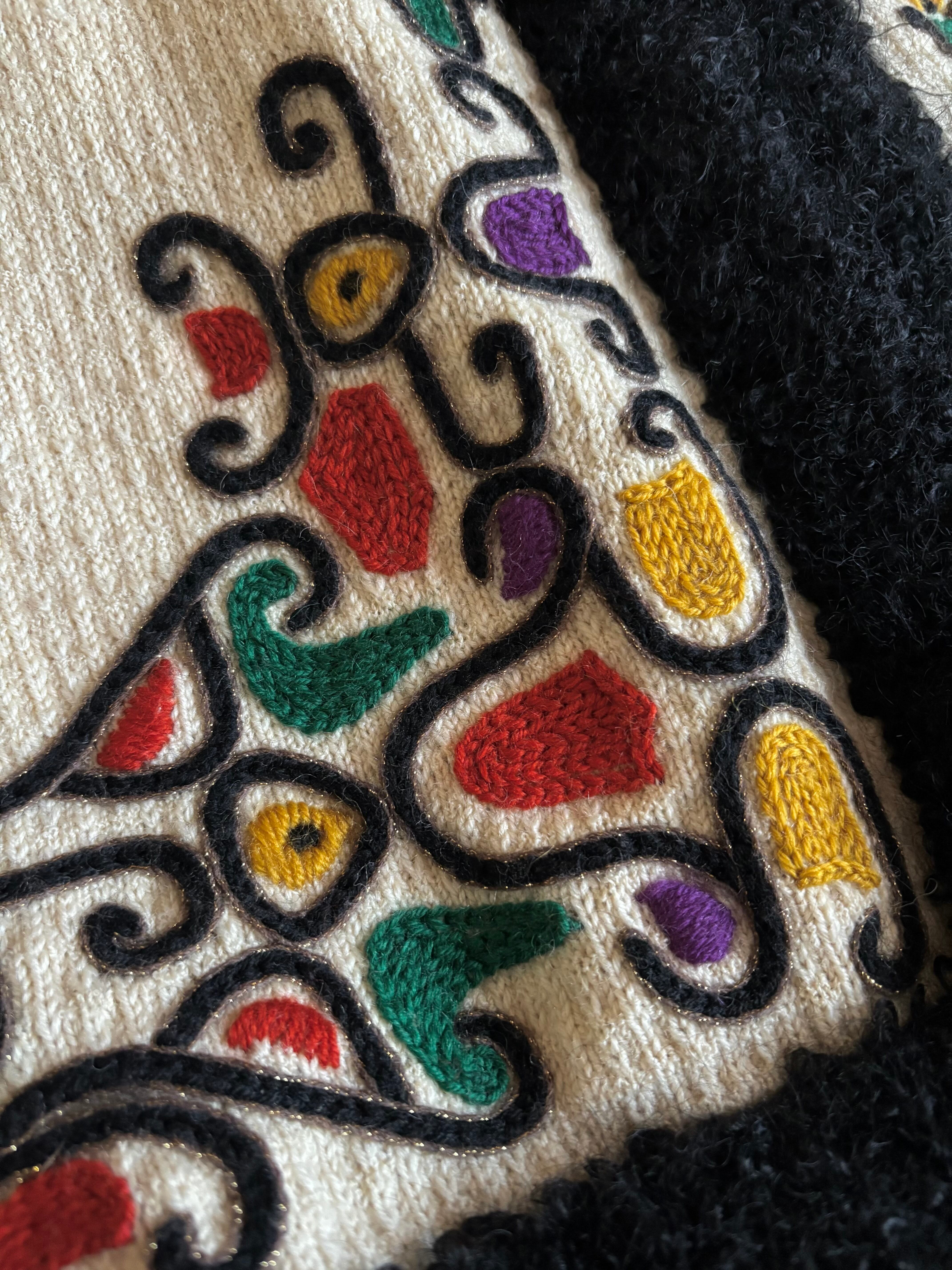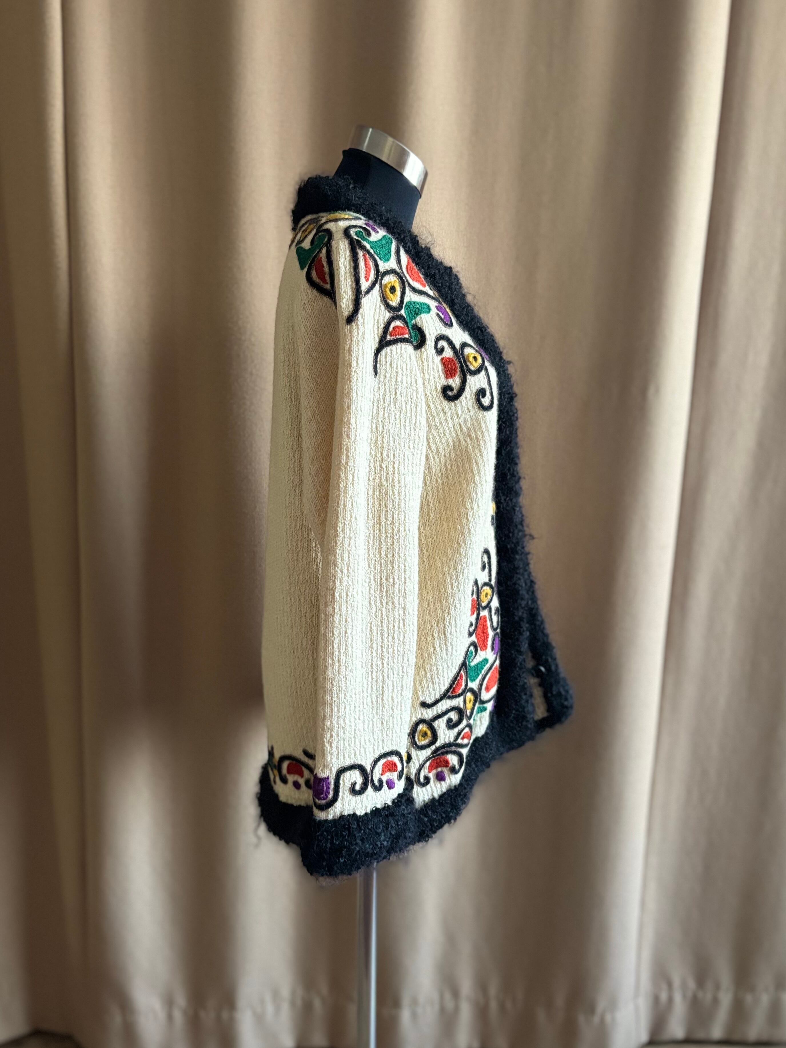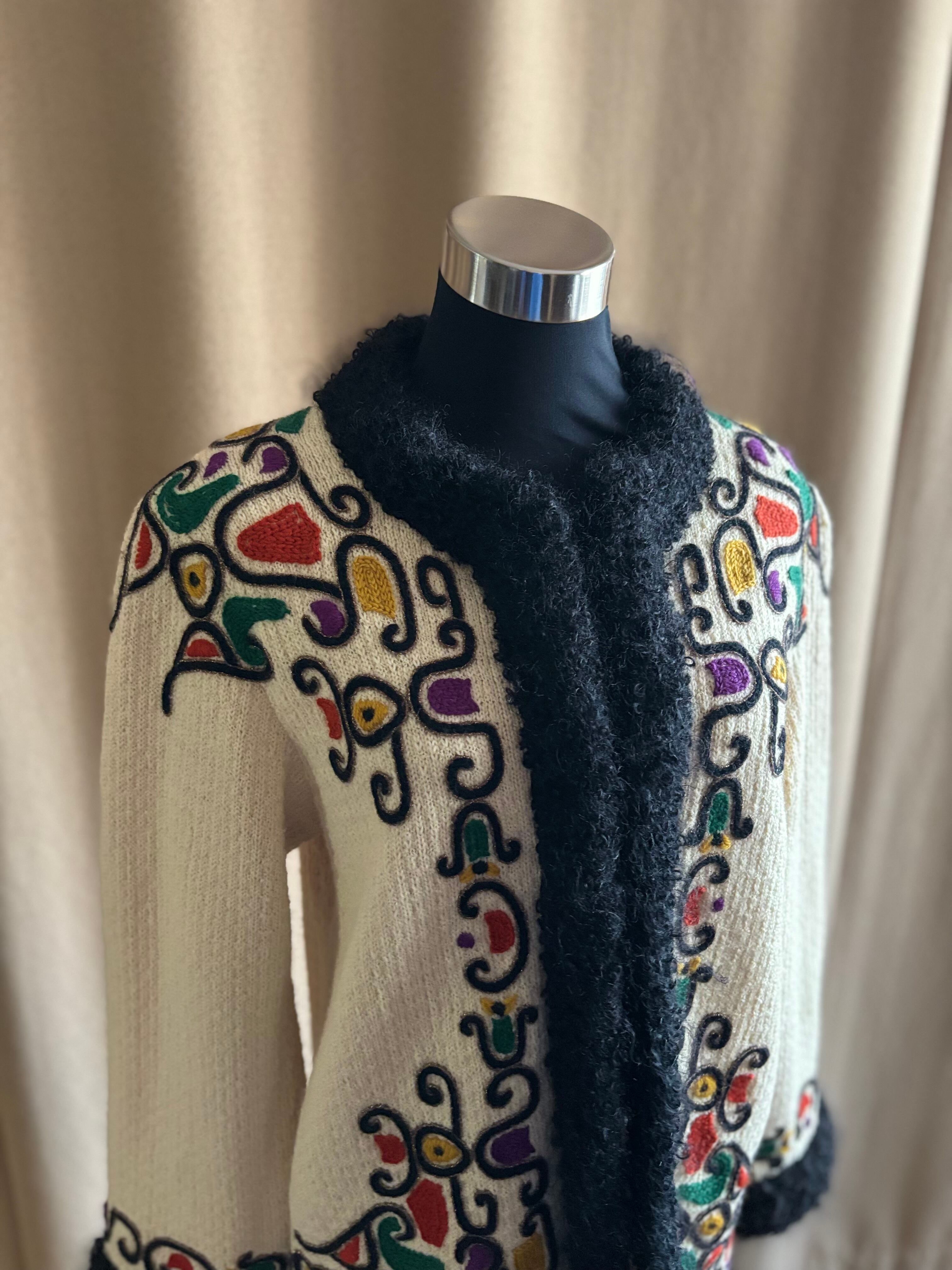 アイボリーベースの柔らかなニットに、色彩豊かな刺繍が映える一着。