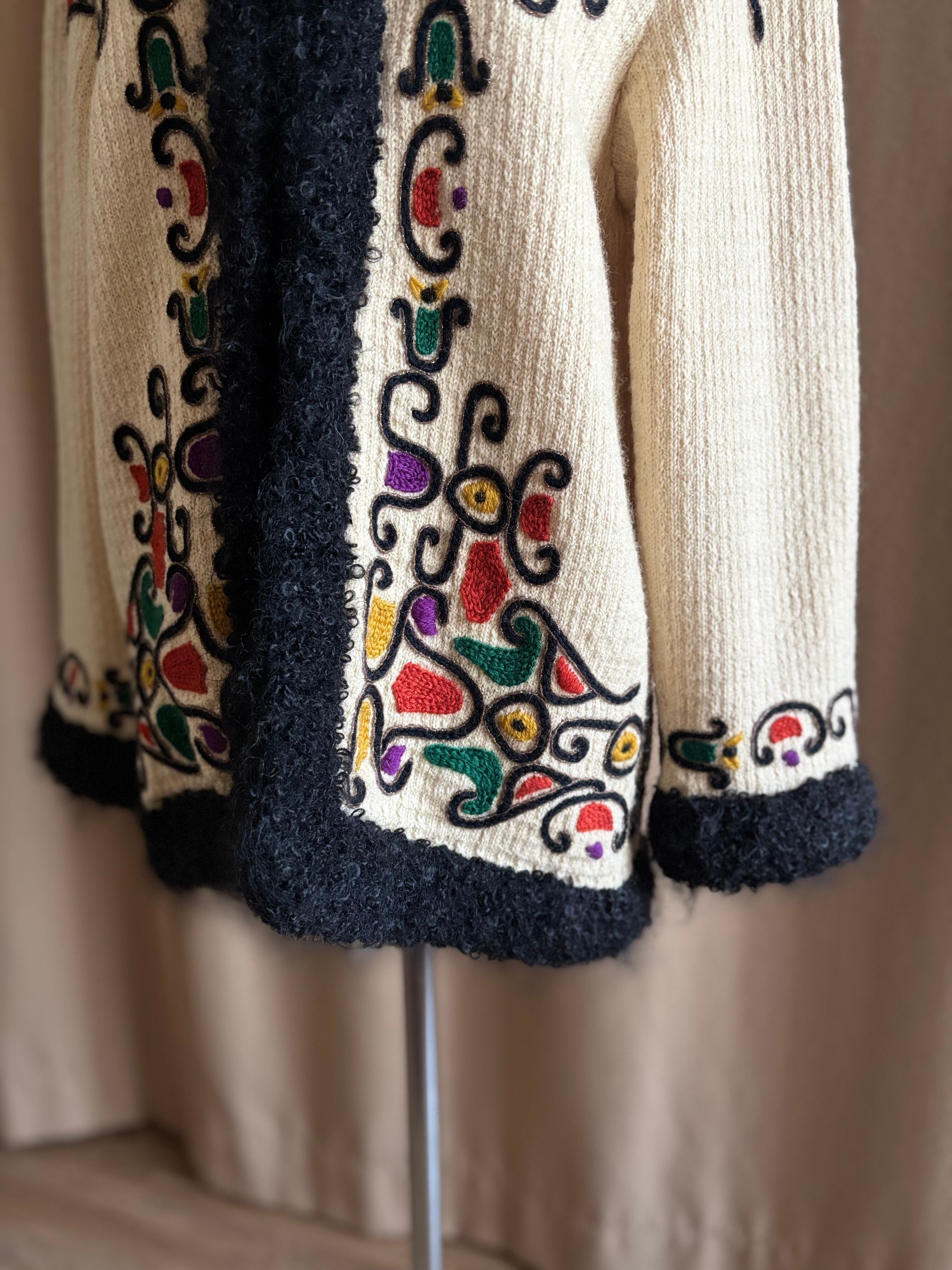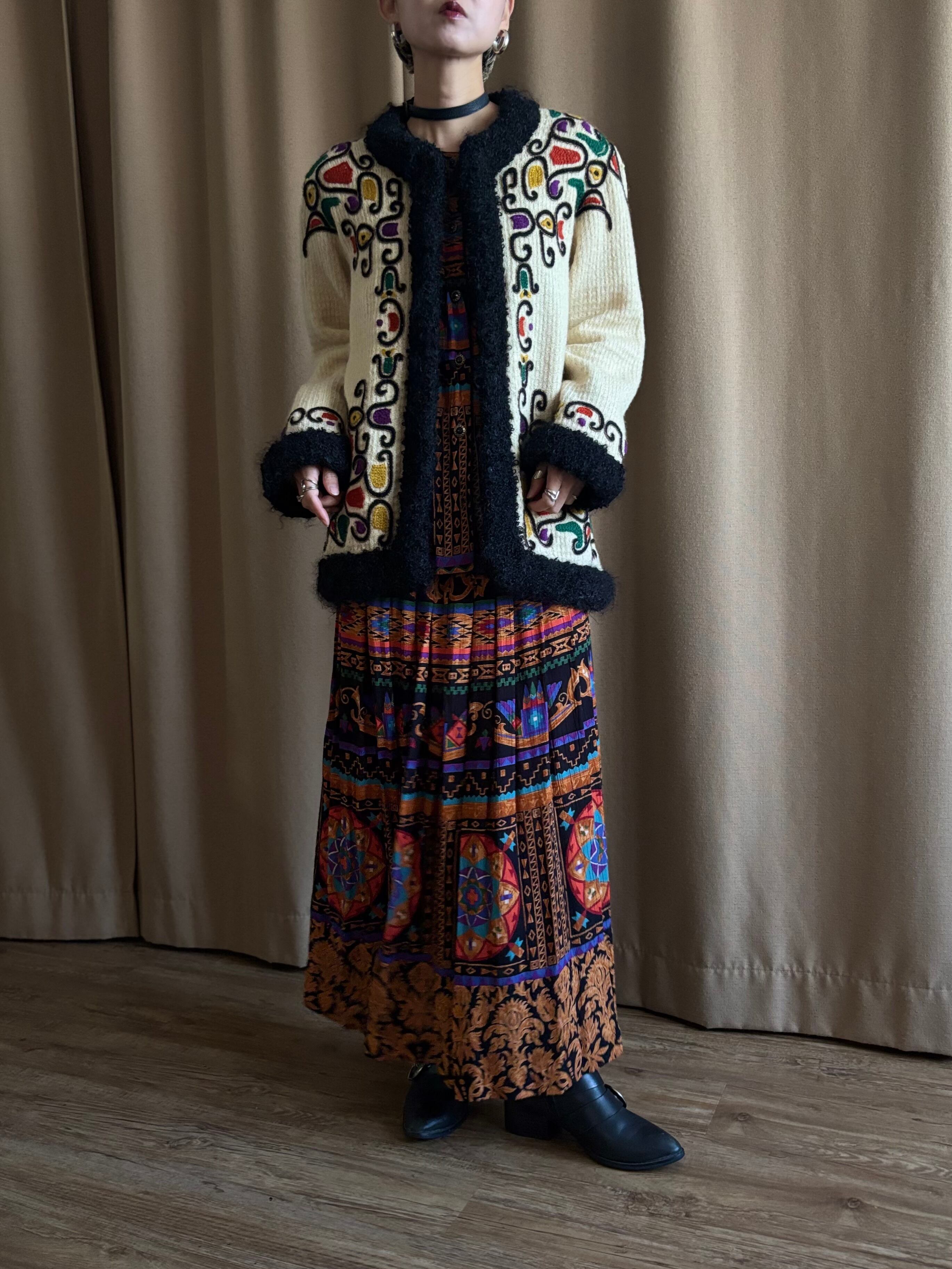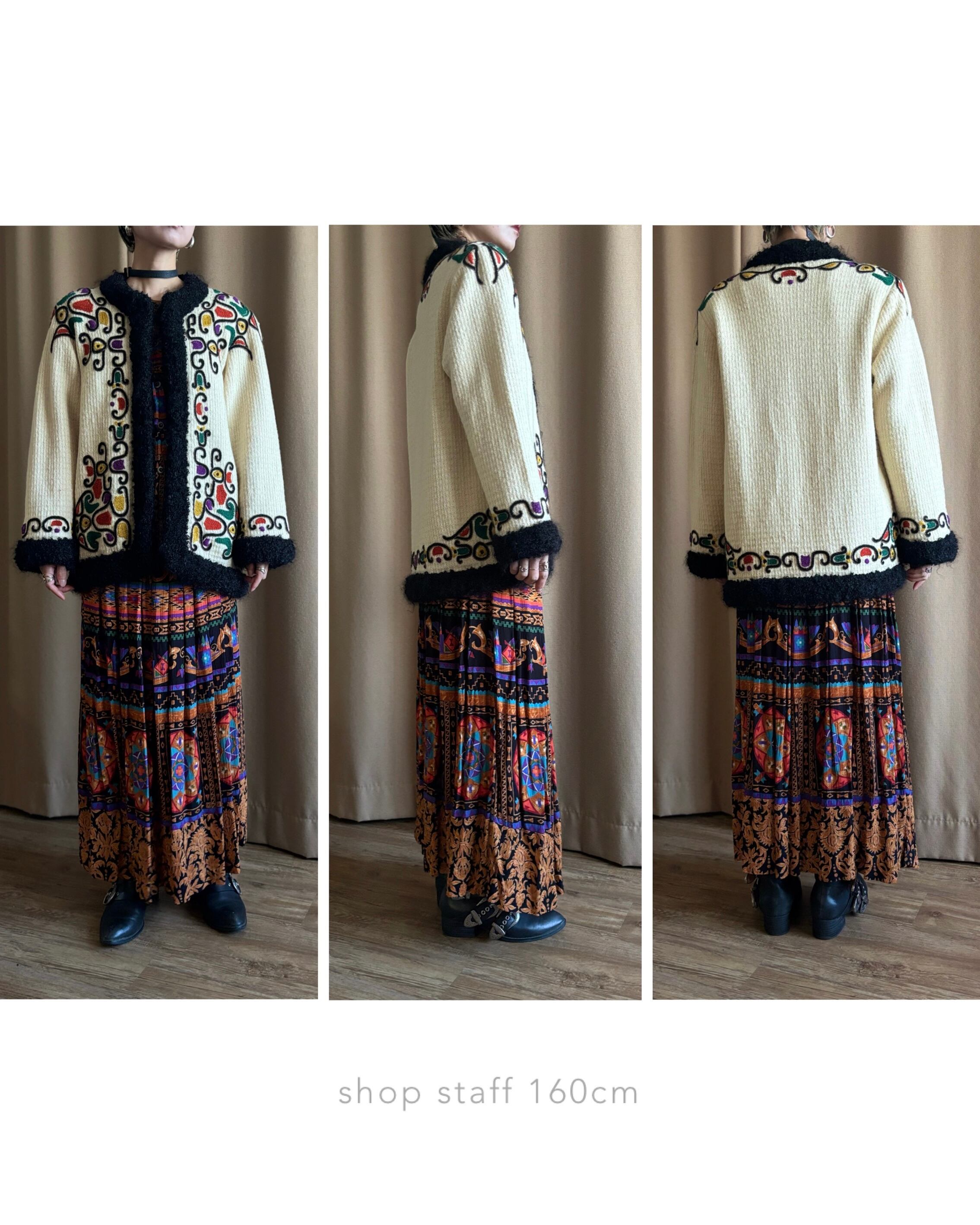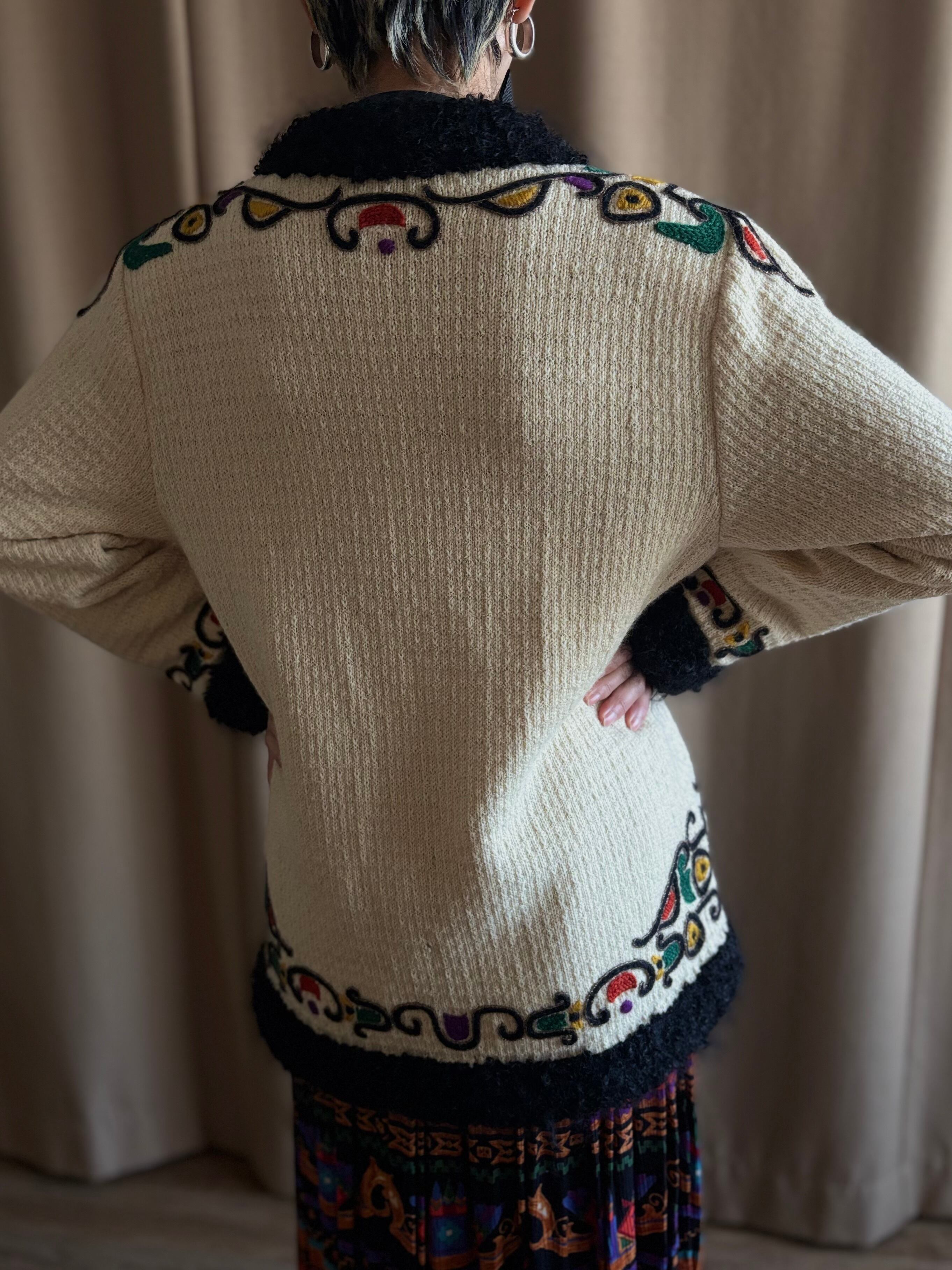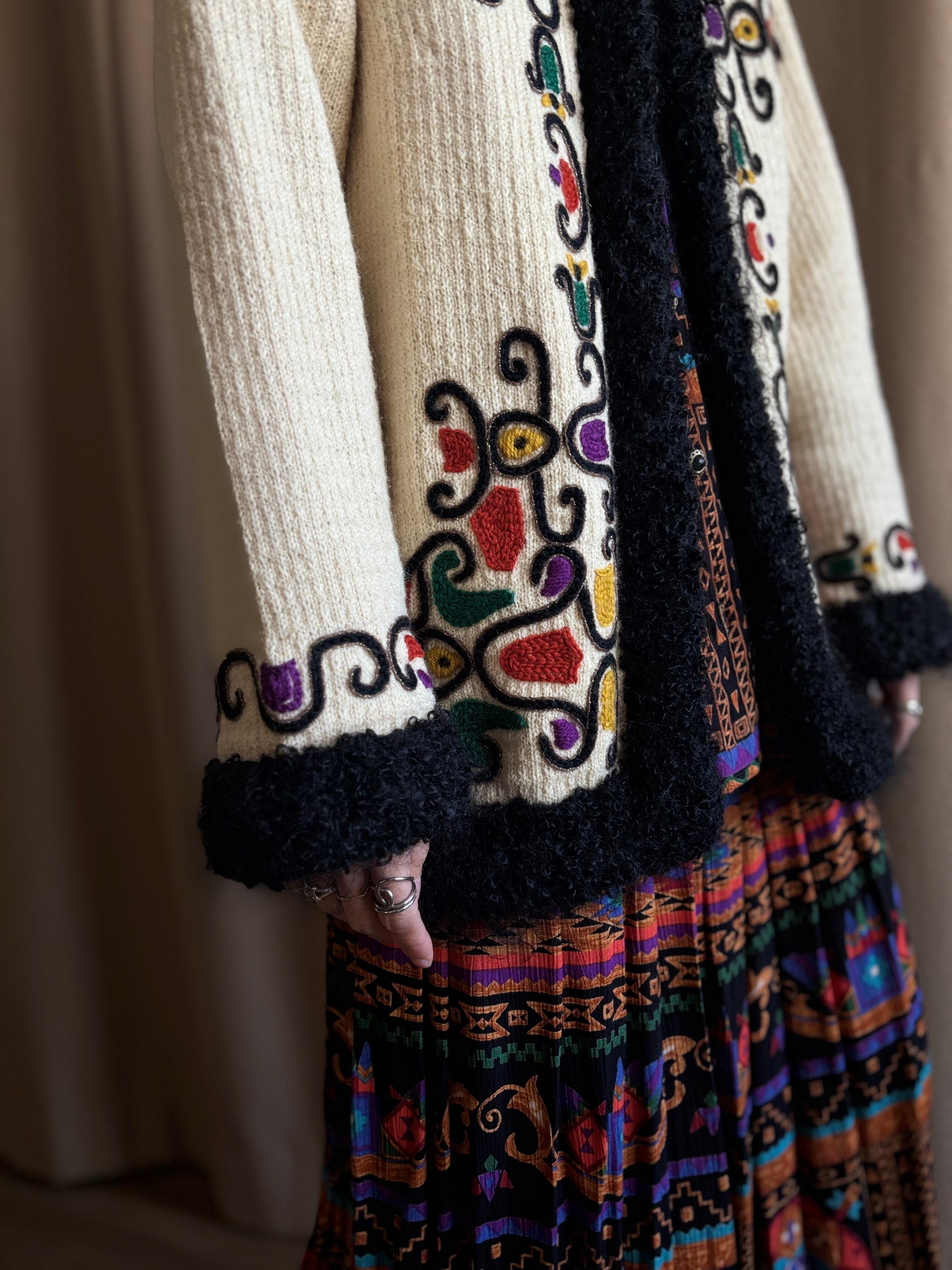 アイボリーベースの柔らかなニットに、色彩豊かな刺繍が映える一着。