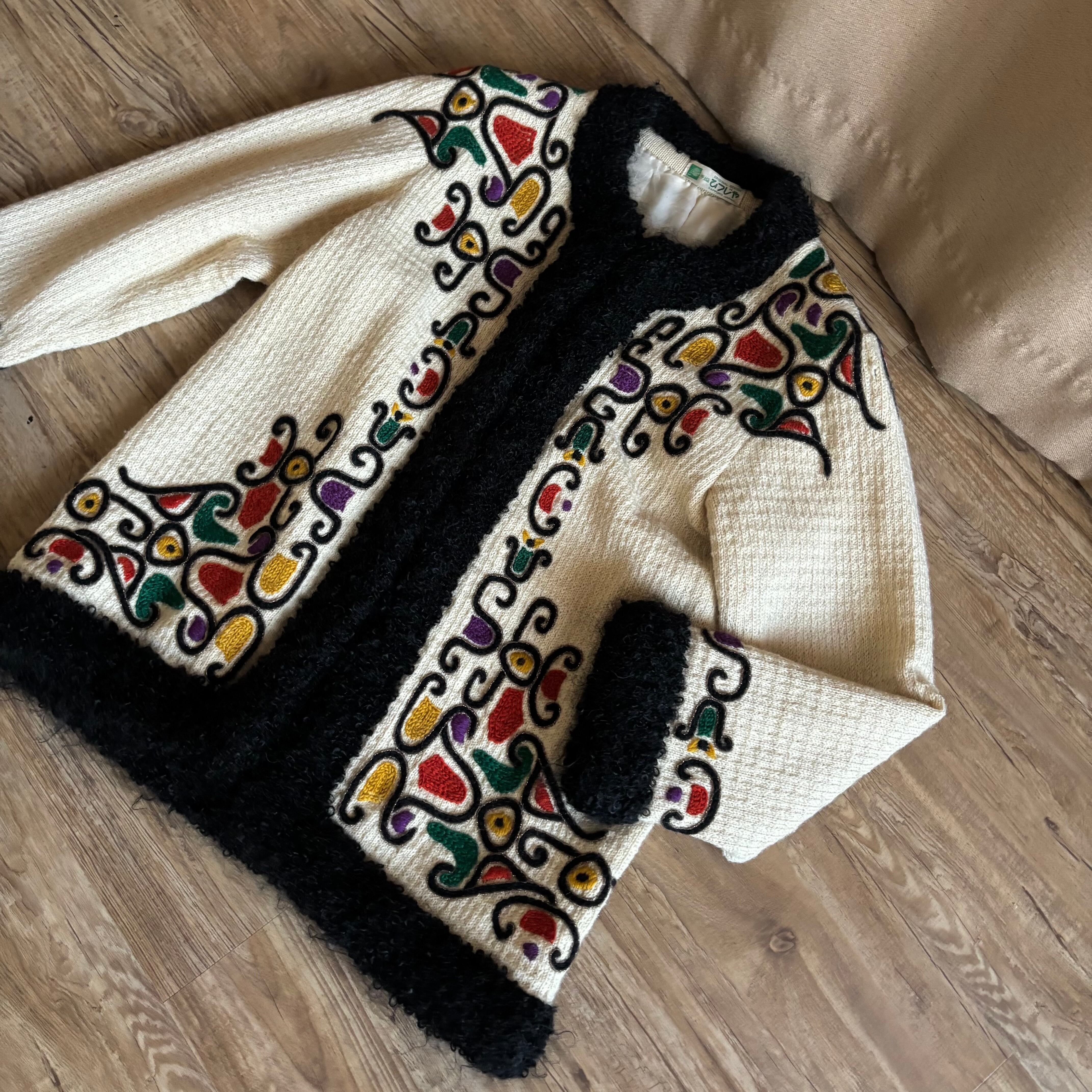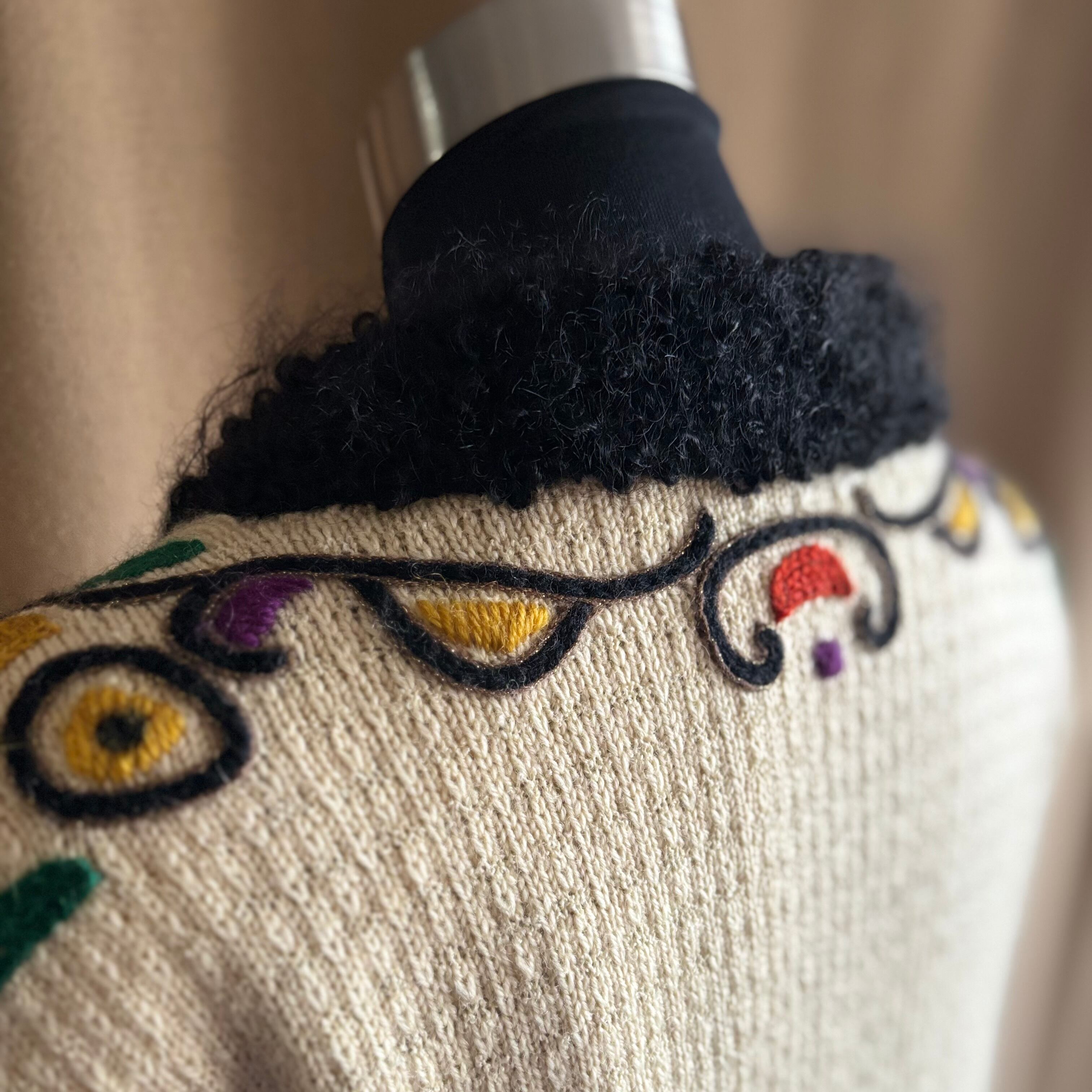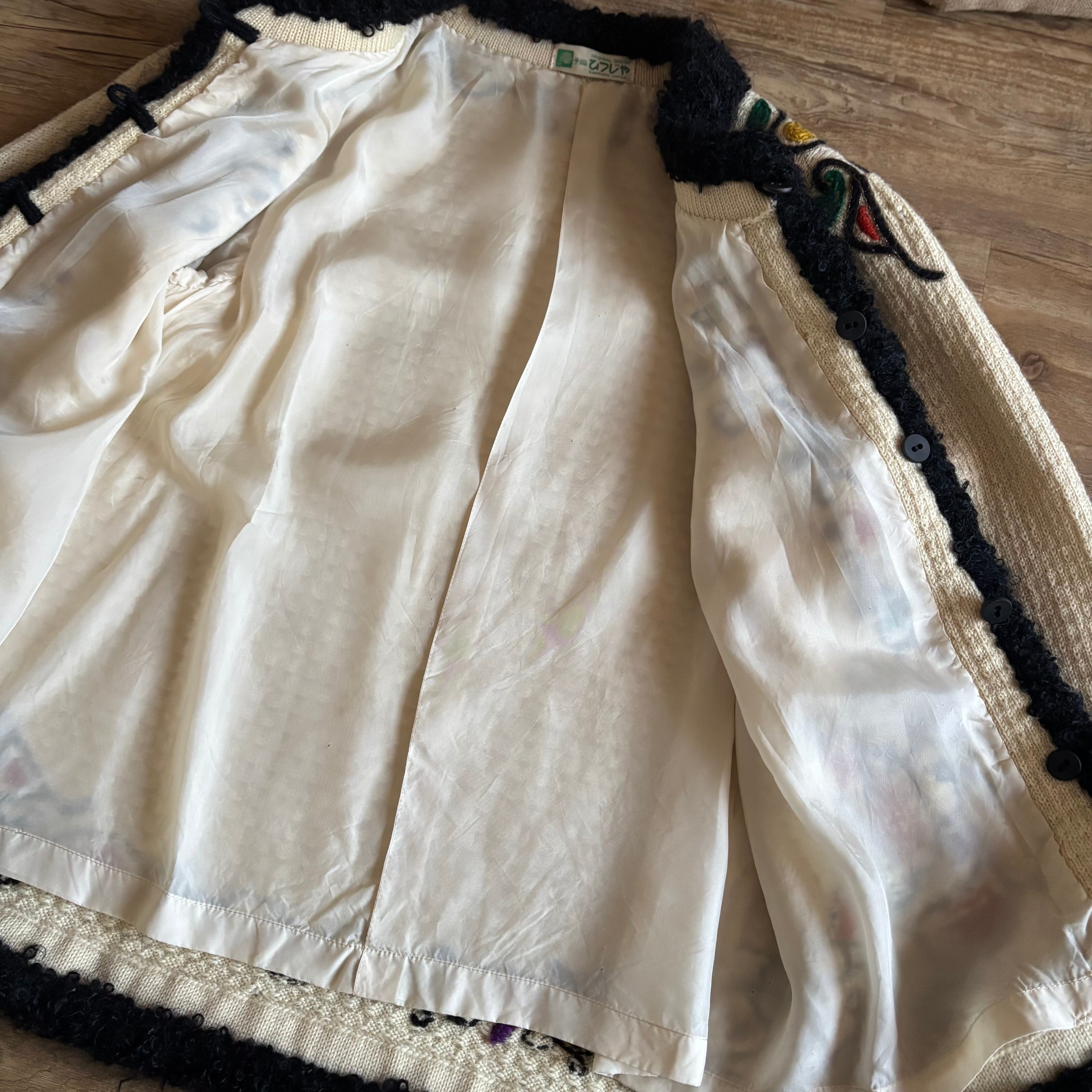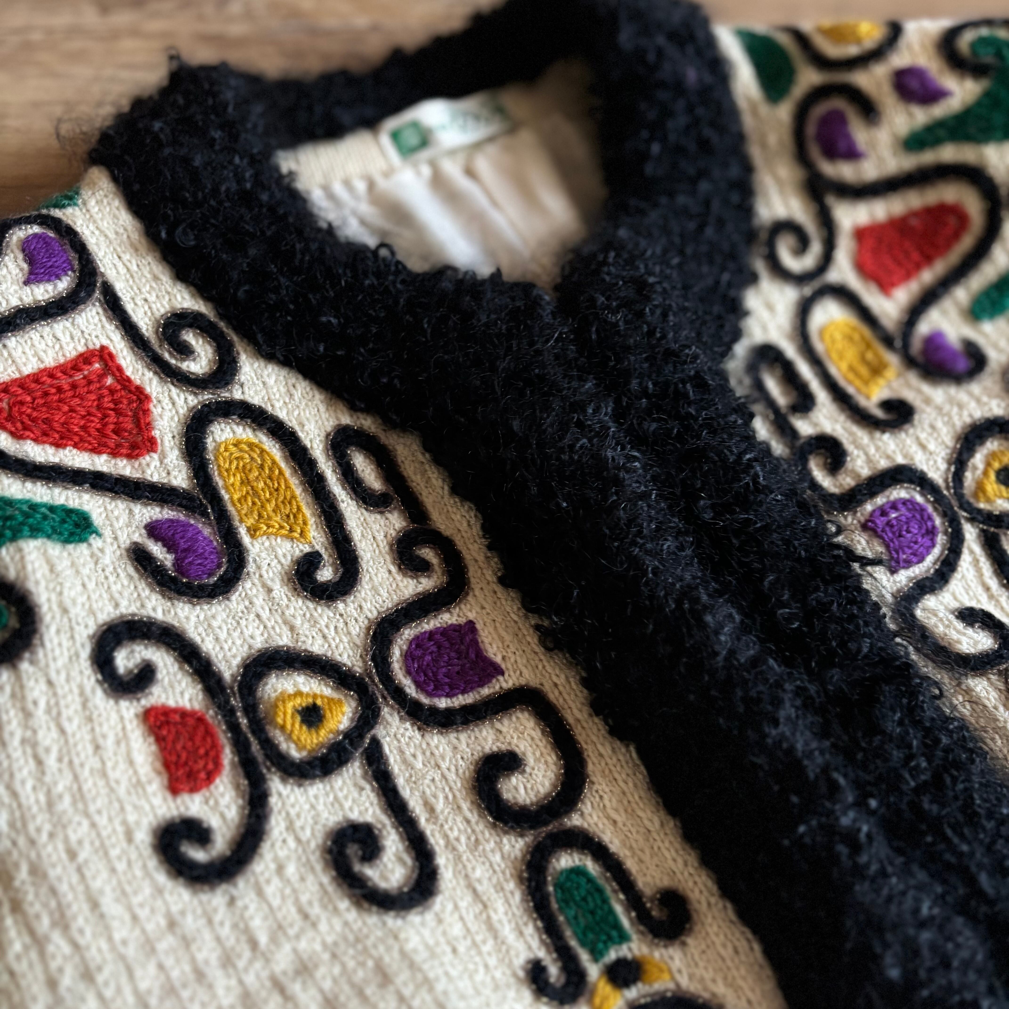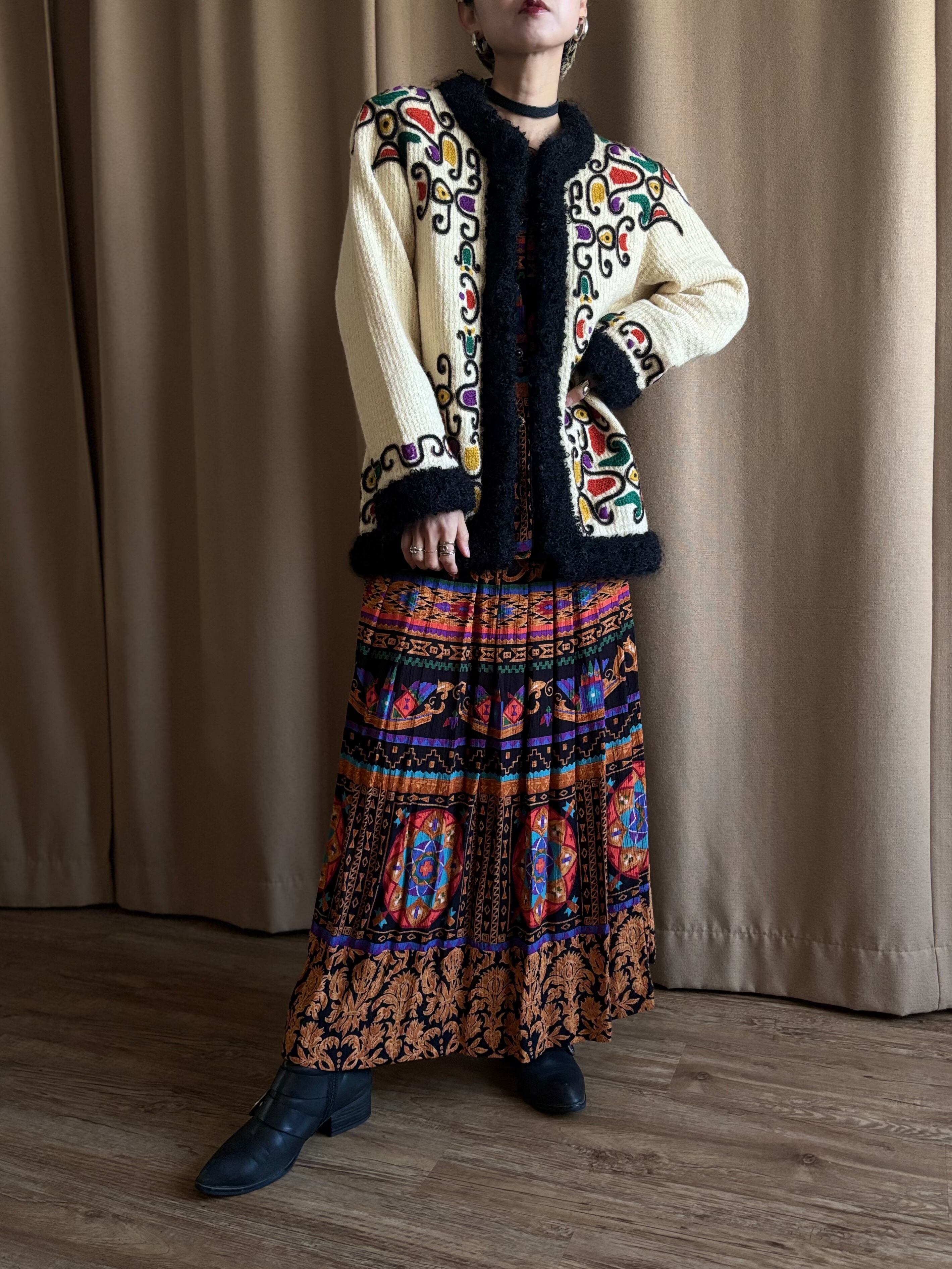 アイボリーベースの柔らかなニットに、色彩豊かな刺繍が映える一着。
