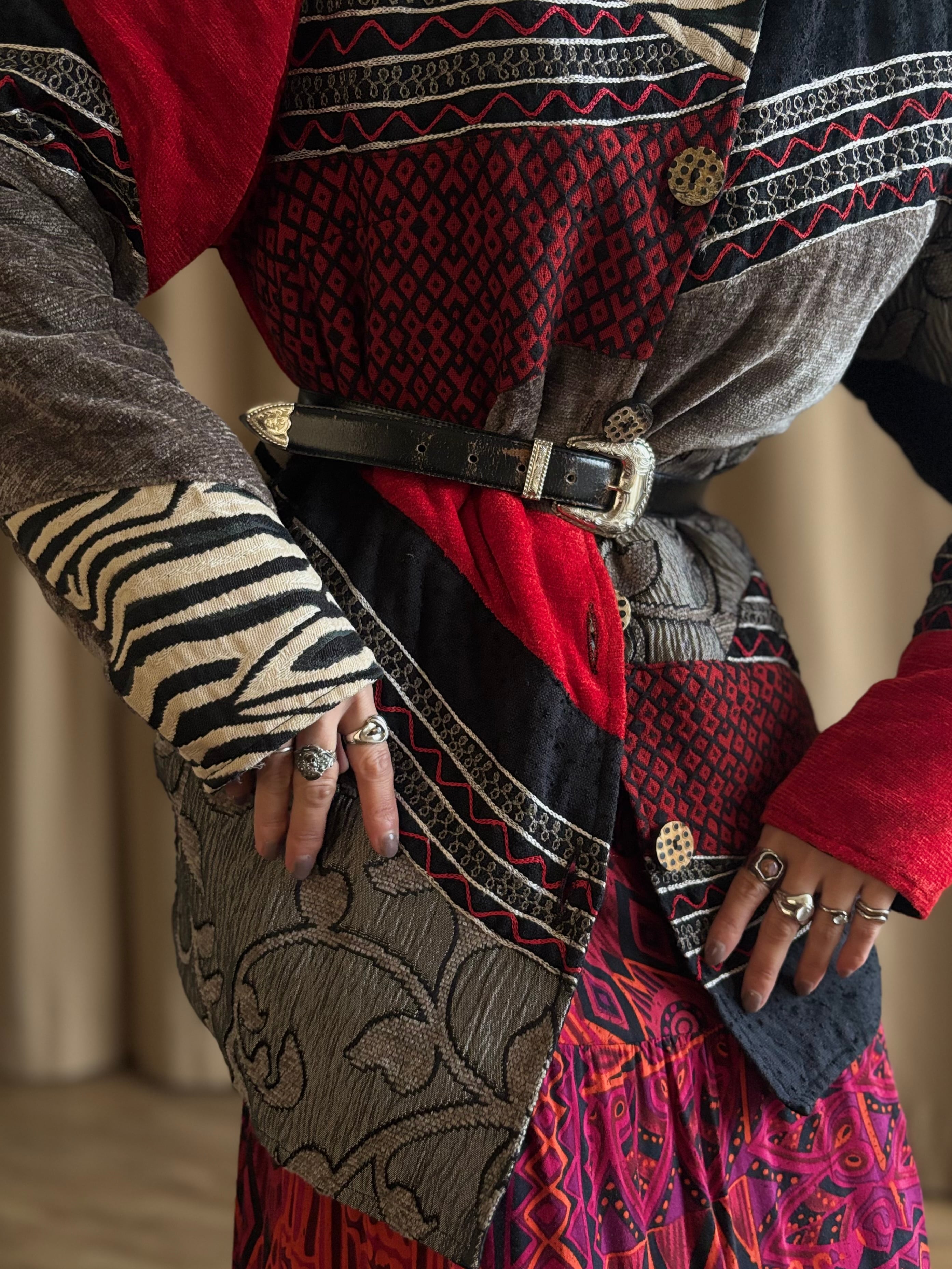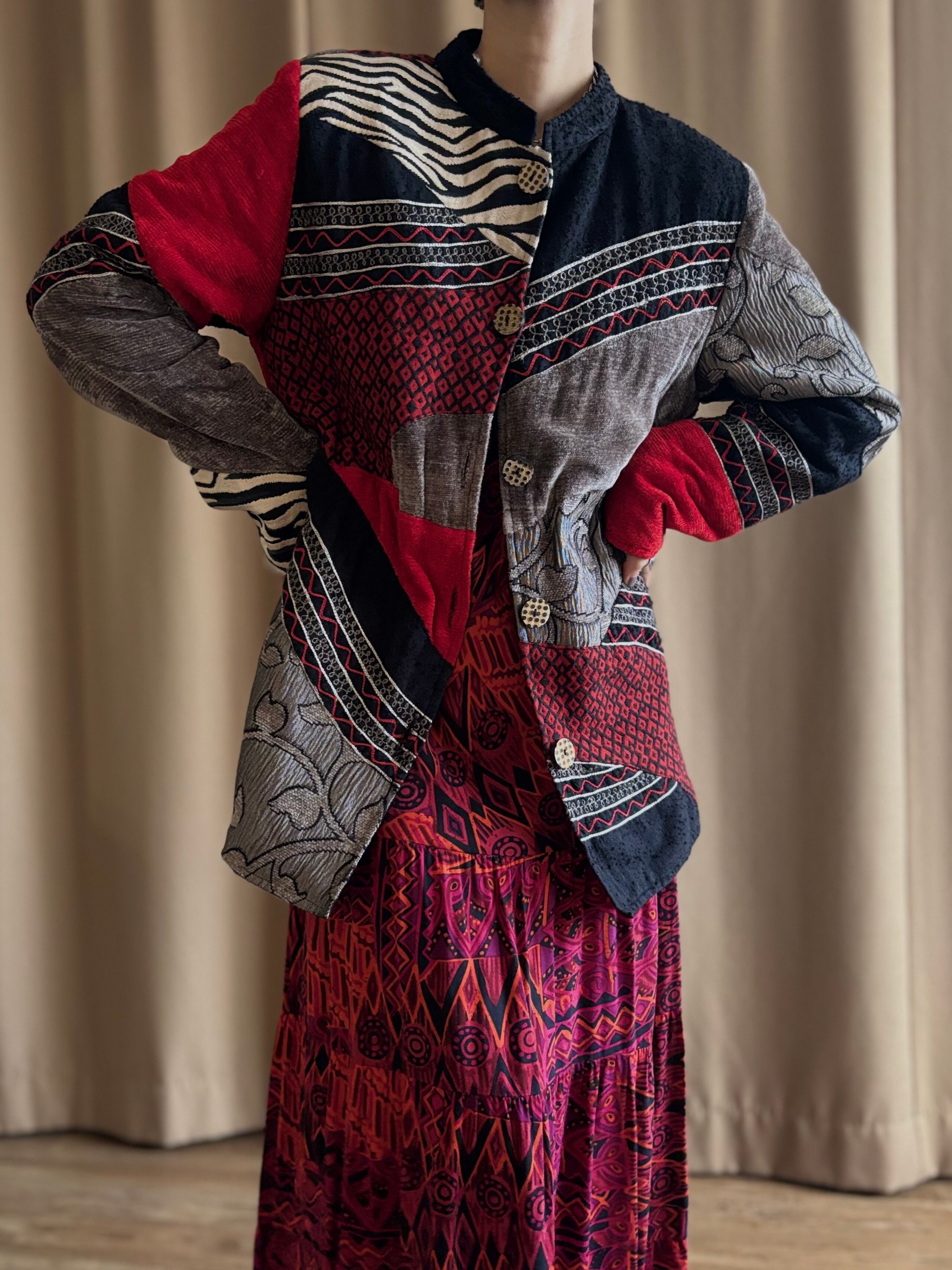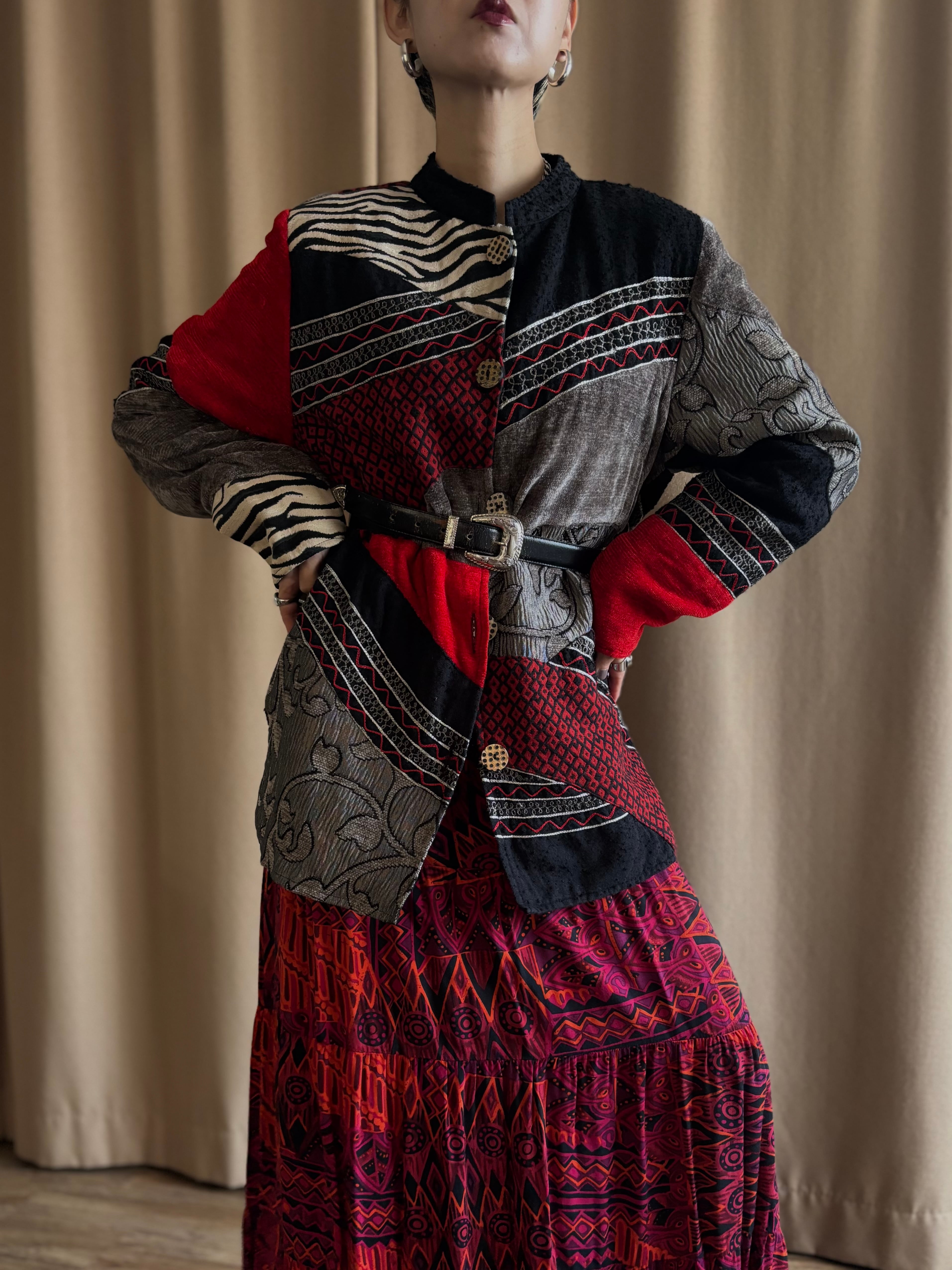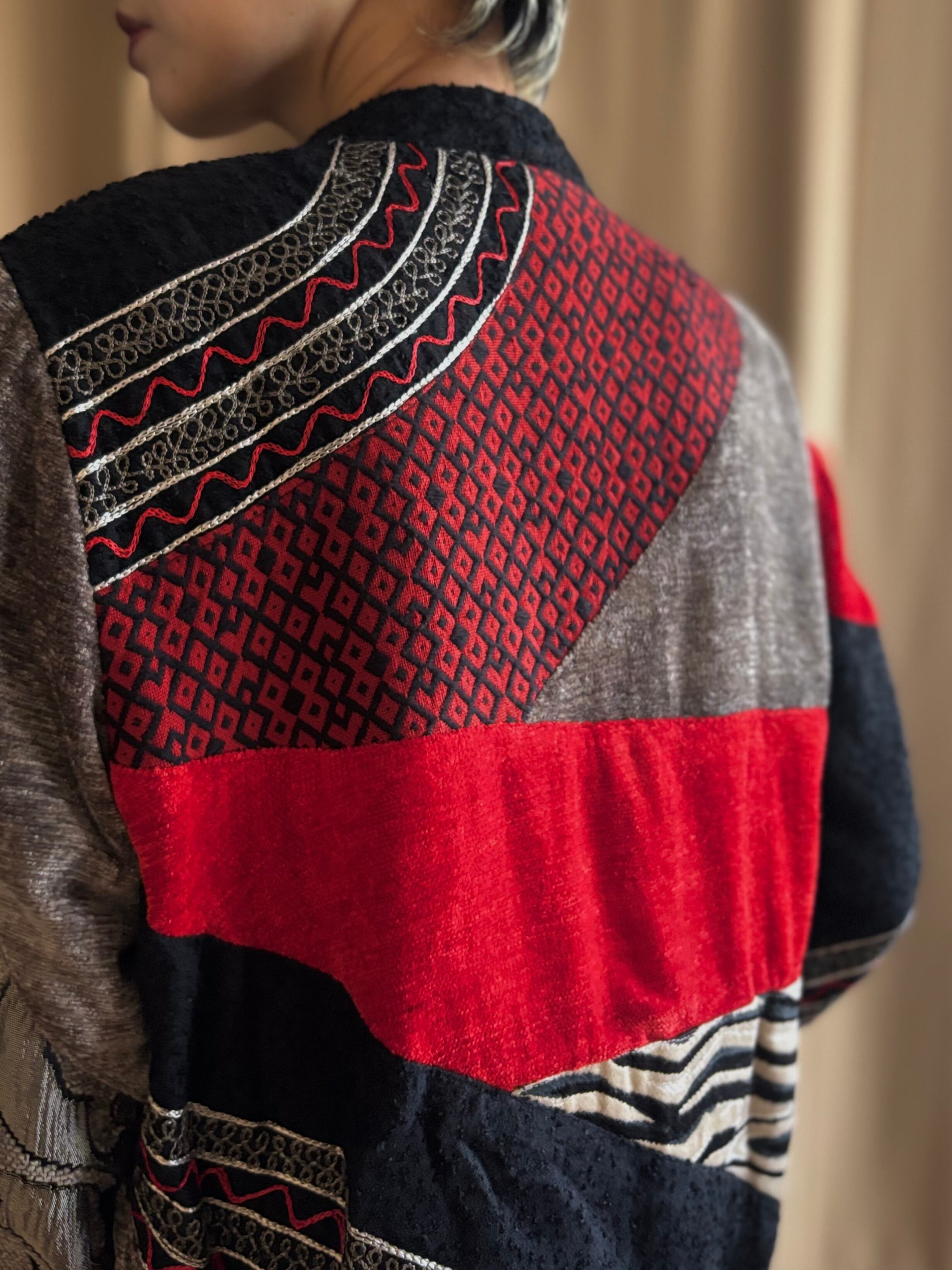 ジオメトリック柄や織り柄、アクセントとなるレッドカラーが調和し、唯一無二のパッチワークがモードな印象を演出。