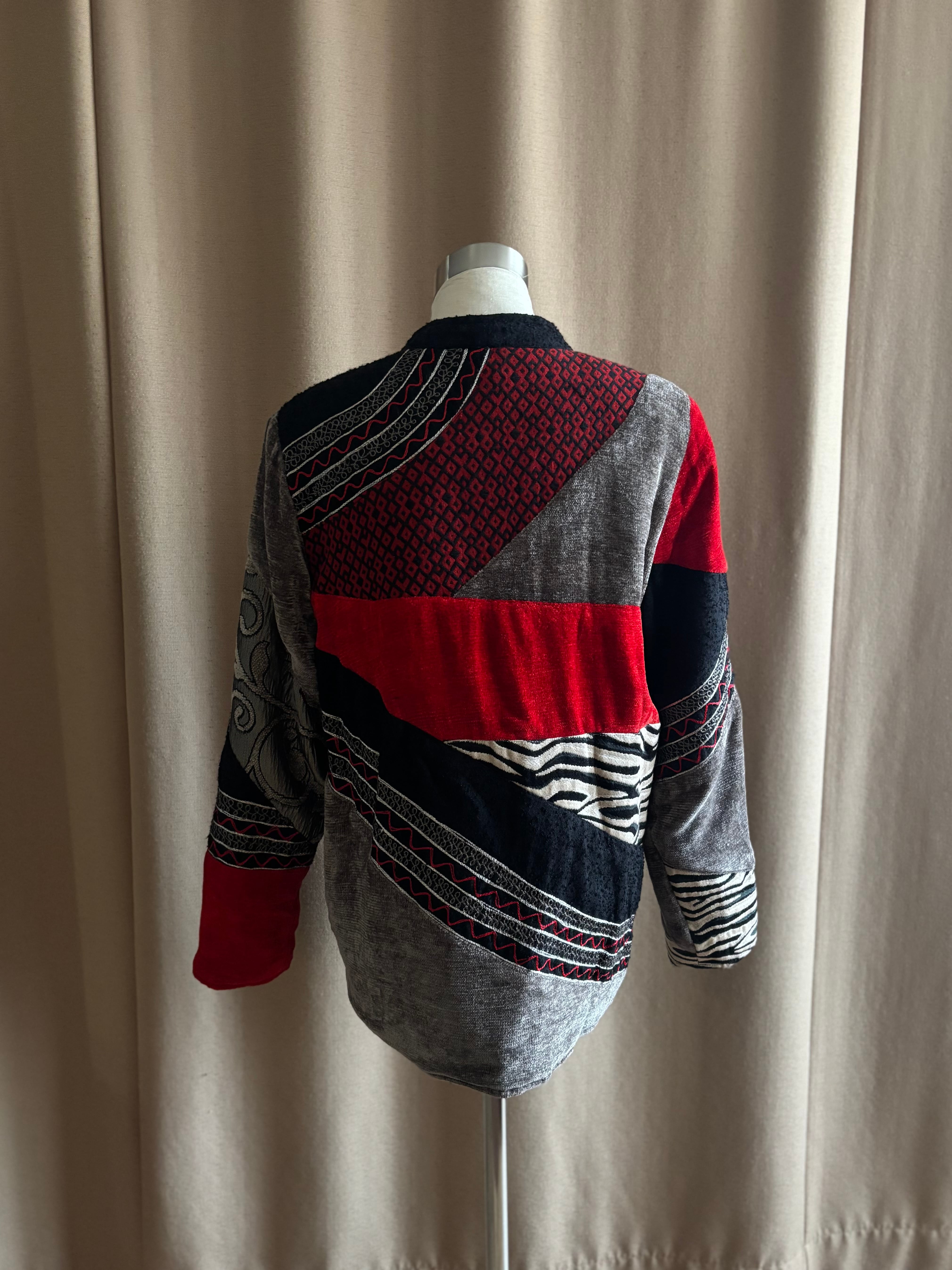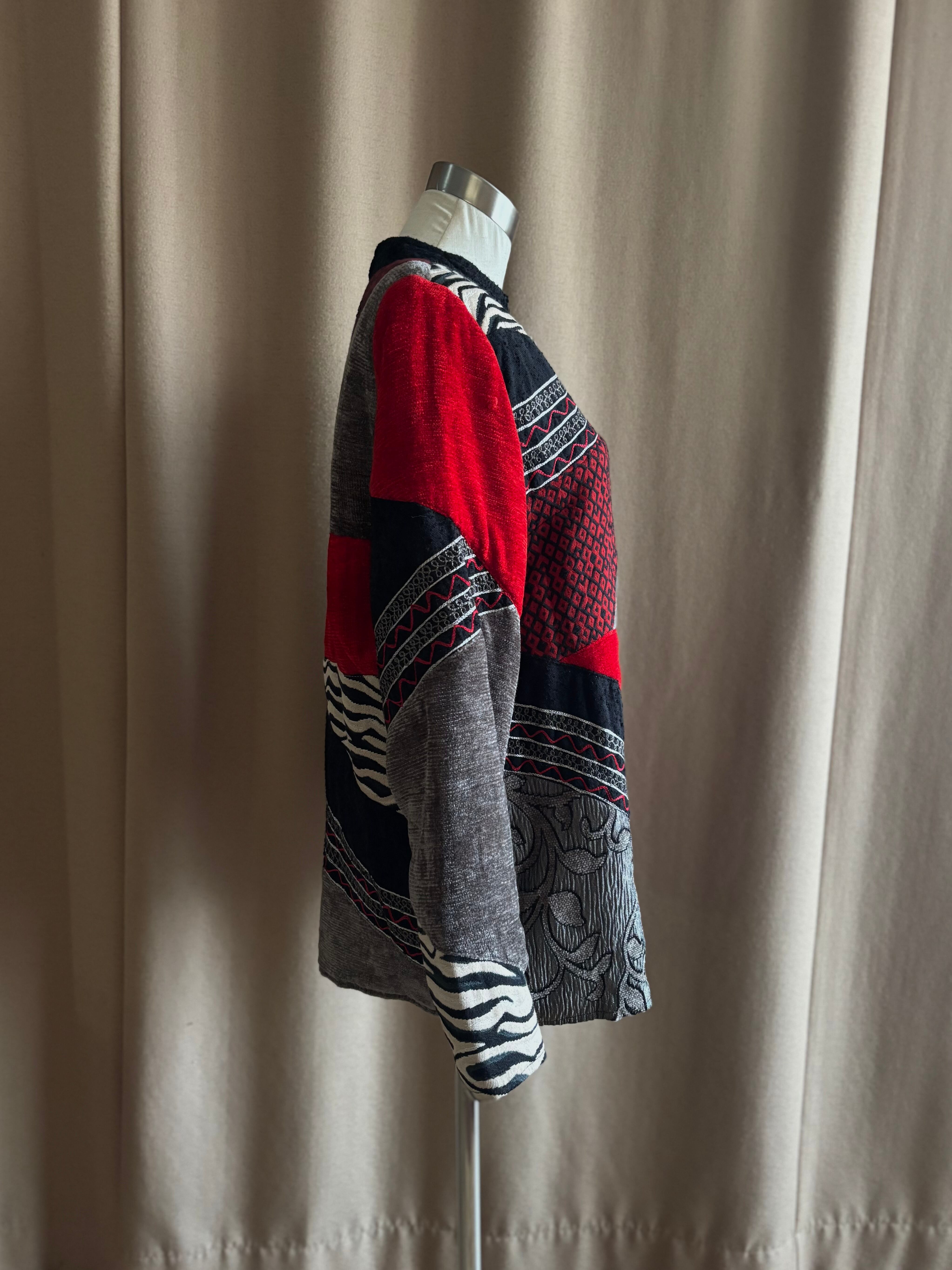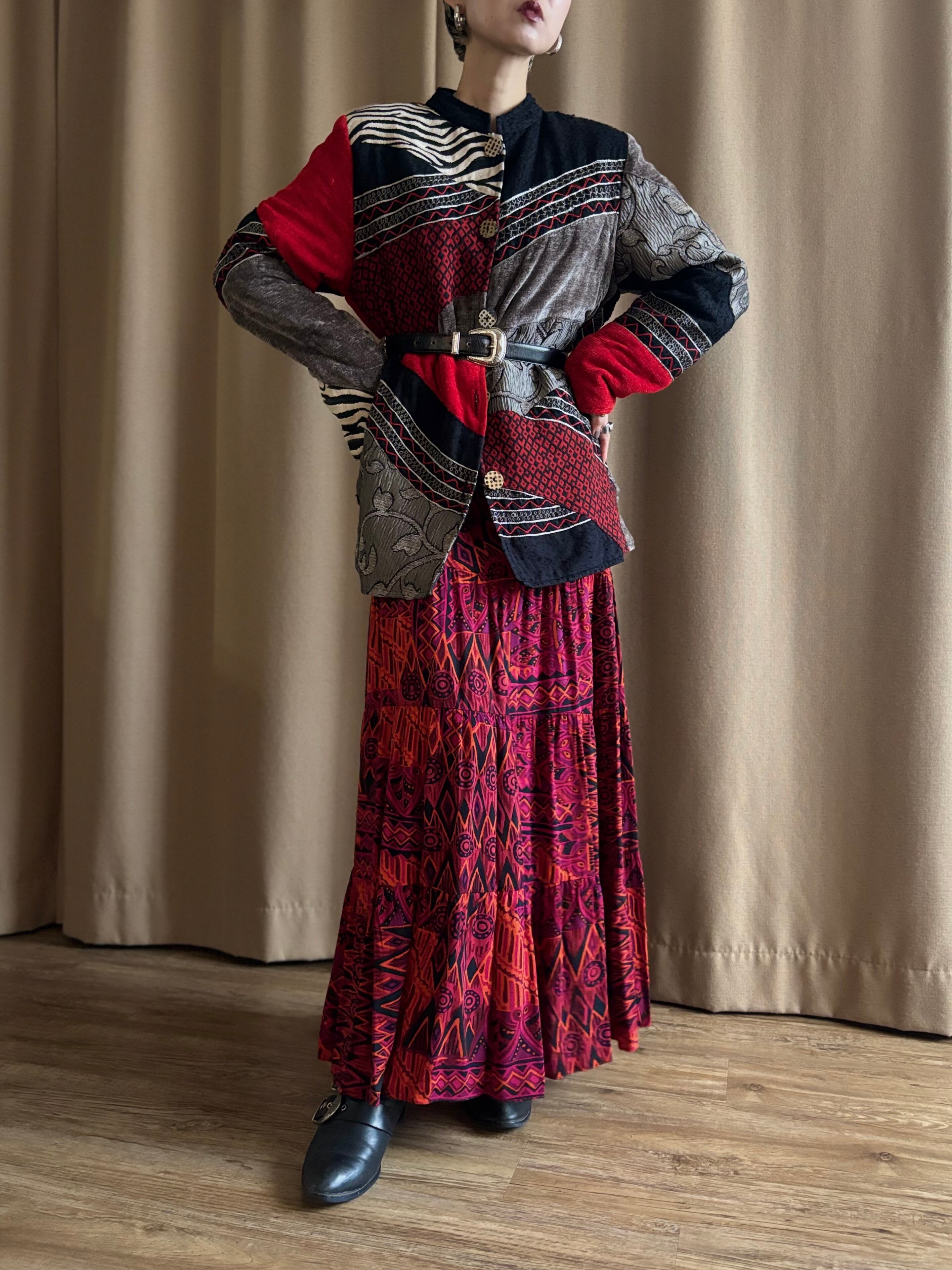 ジオメトリック柄や織り柄、アクセントとなるレッドカラーが調和し、唯一無二のパッチワークがモードな印象を演出。