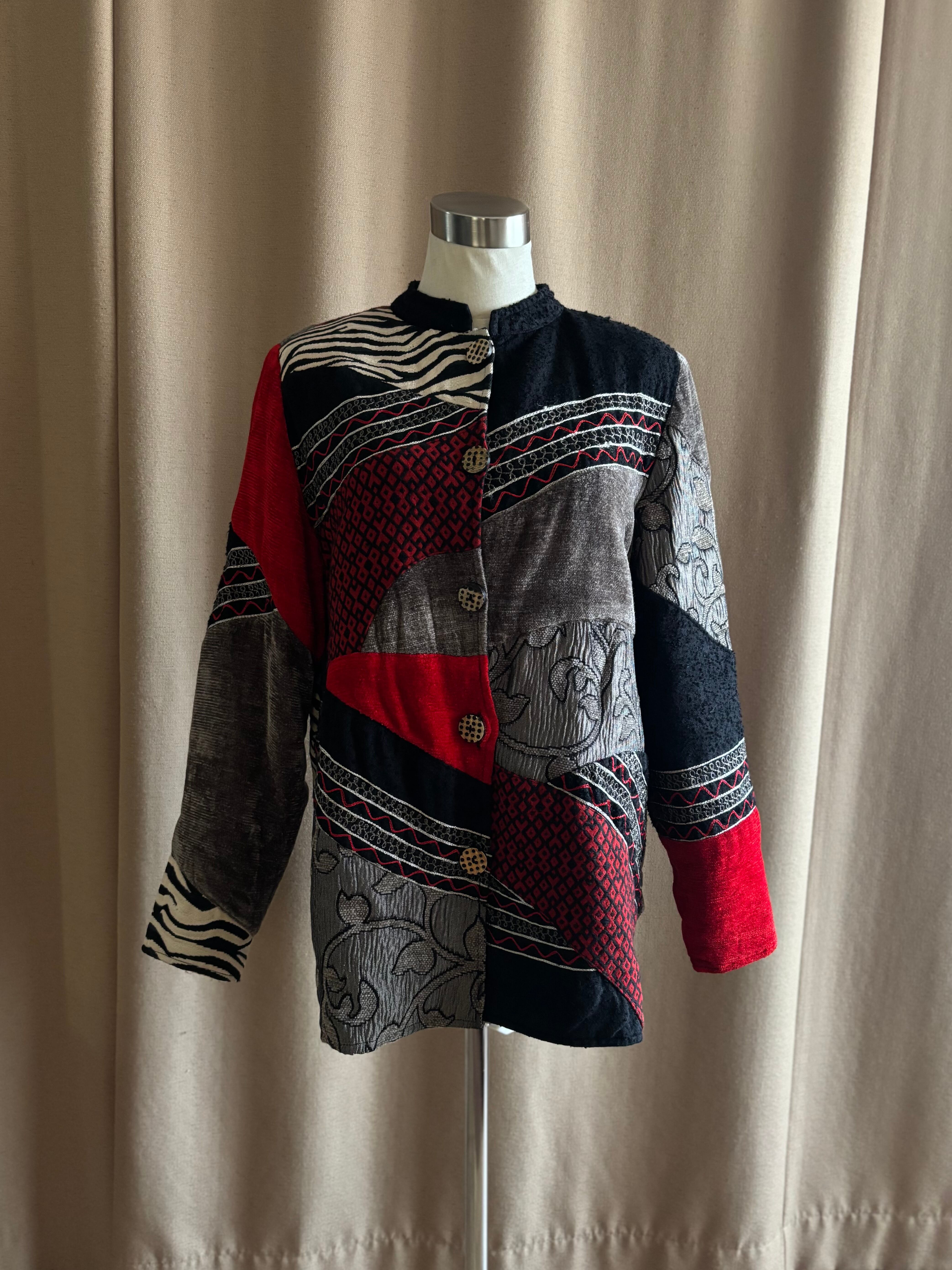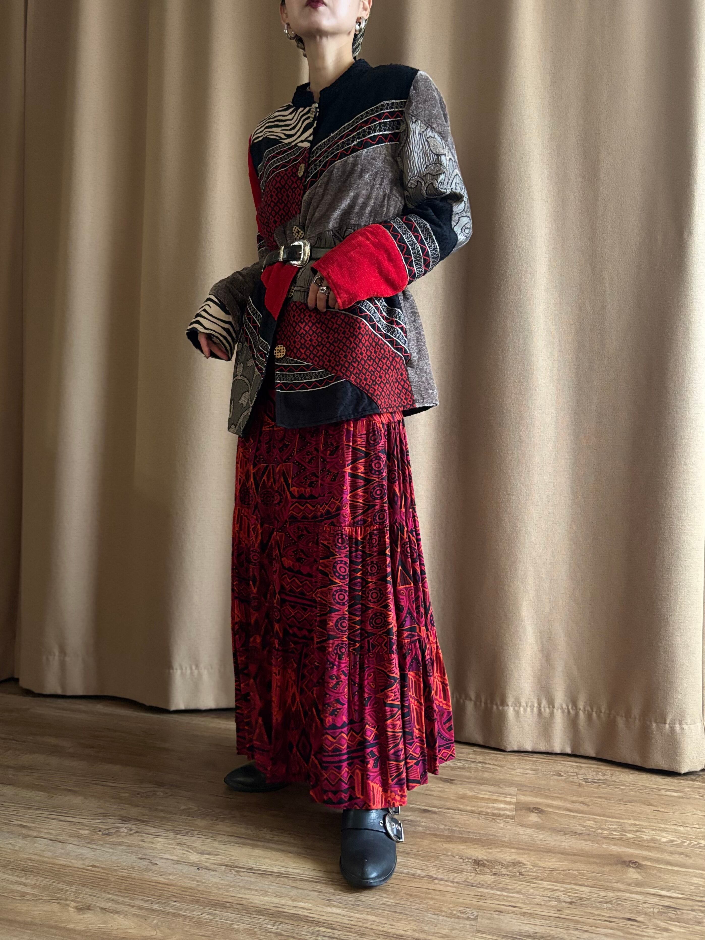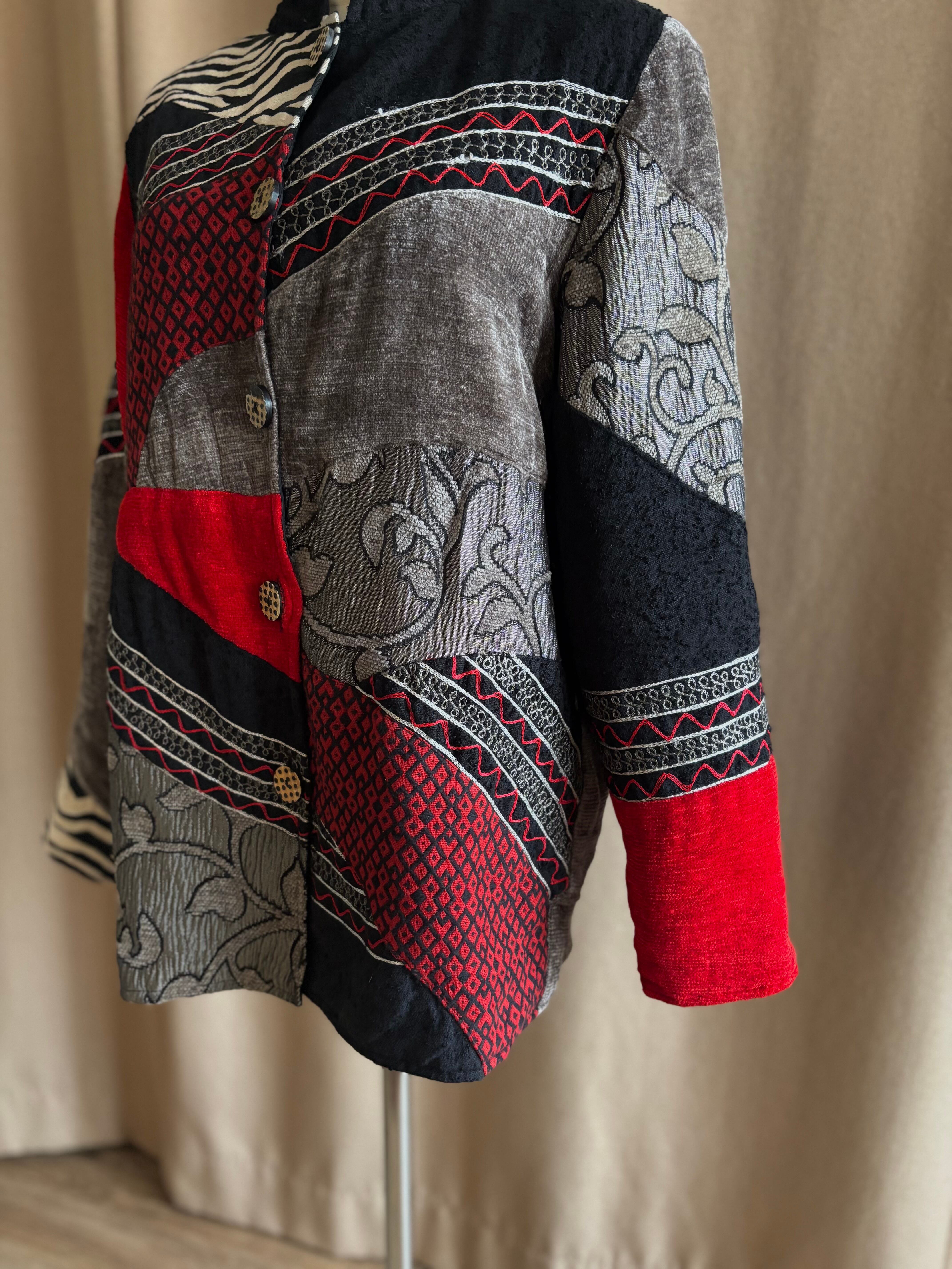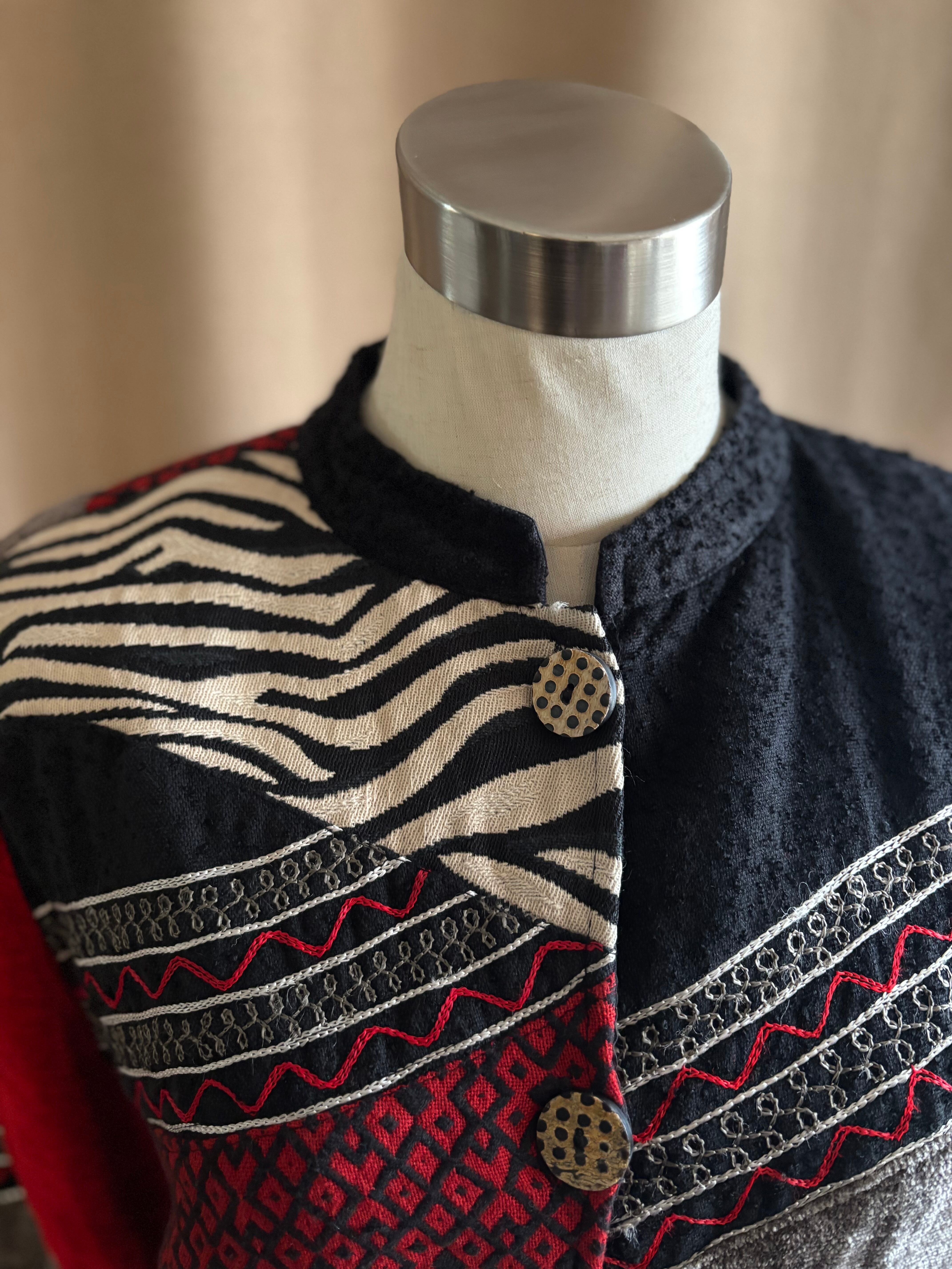 ジオメトリック柄や織り柄、アクセントとなるレッドカラーが調和し、唯一無二のパッチワークがモードな印象を演出。