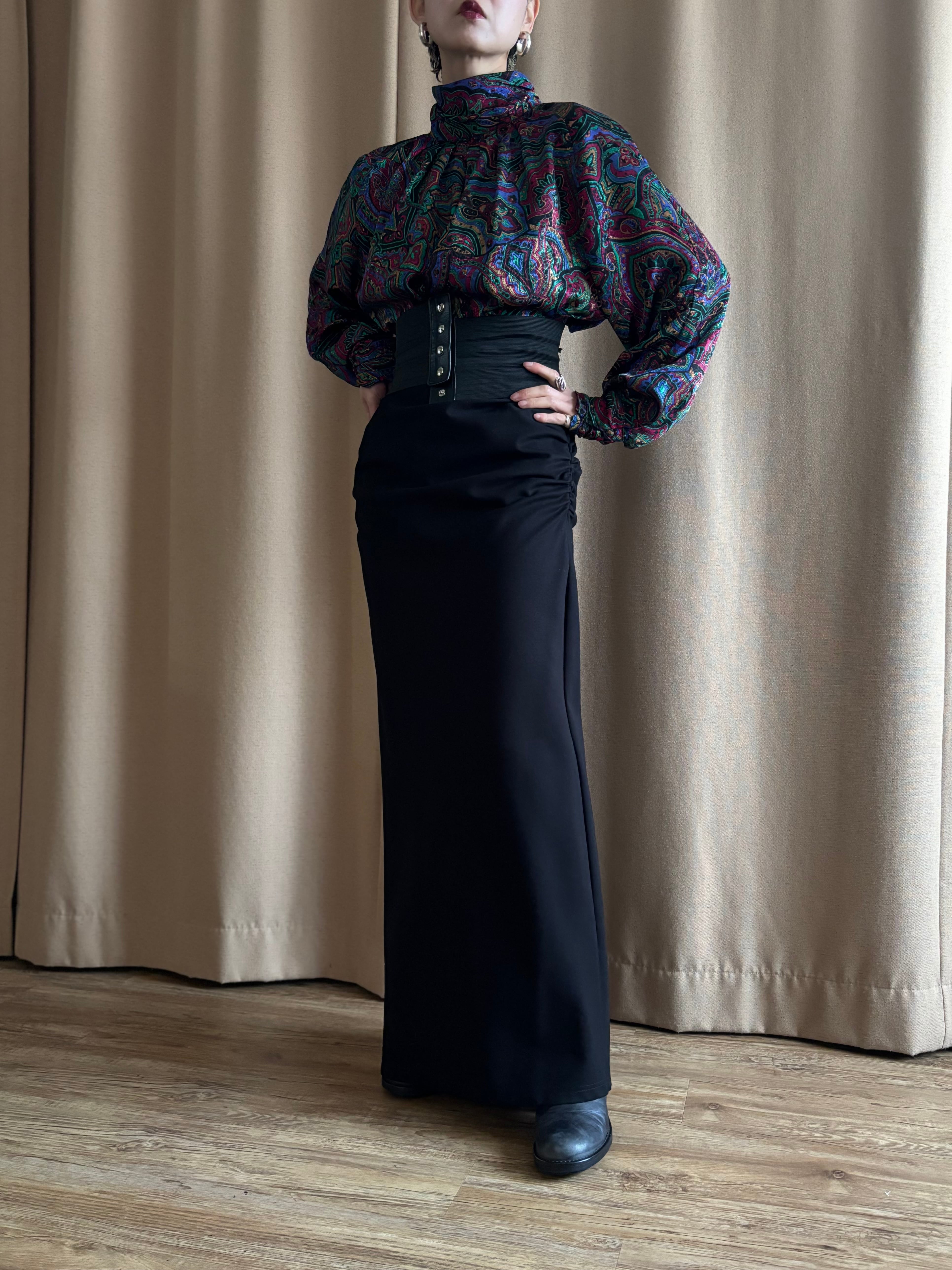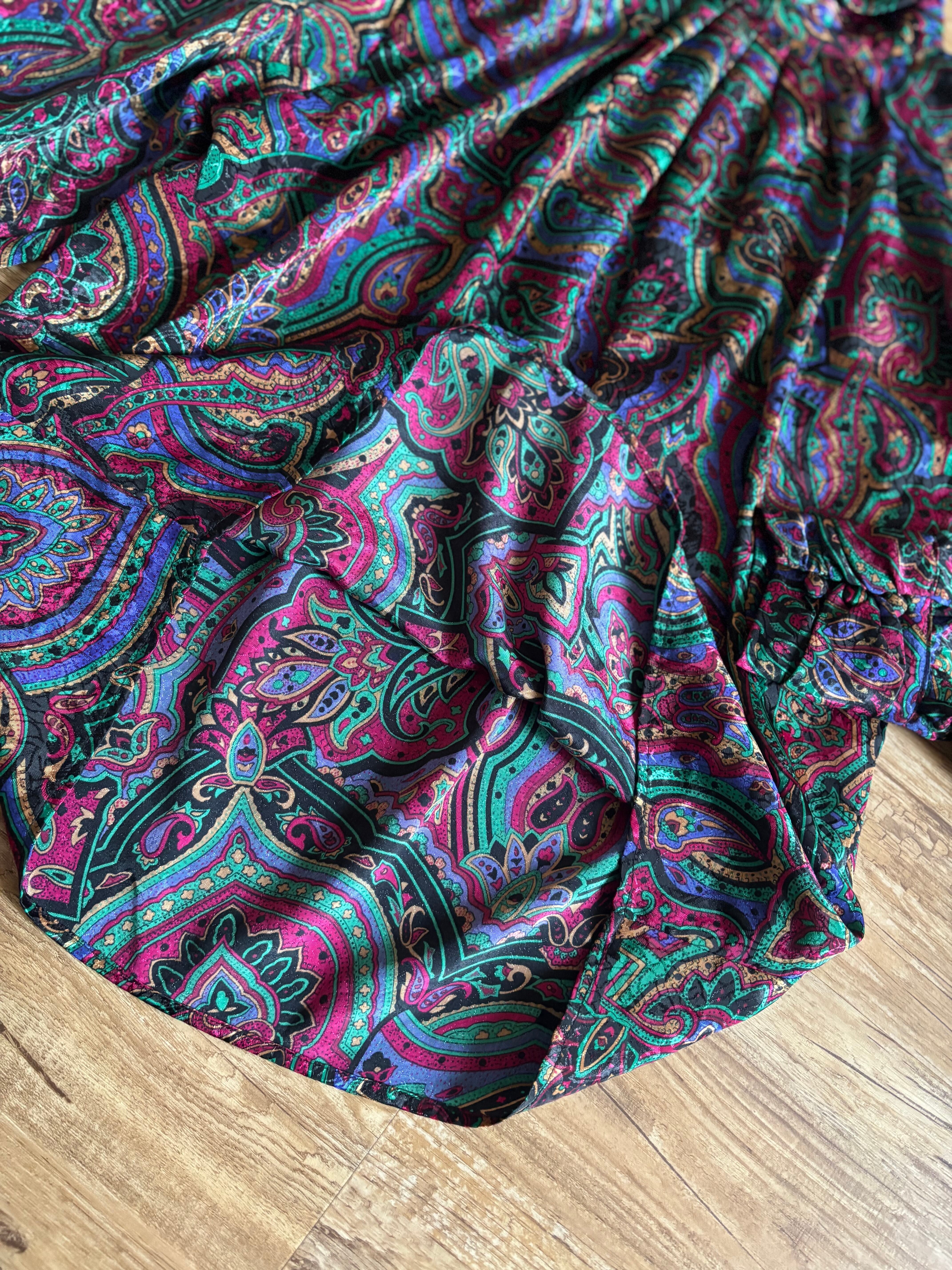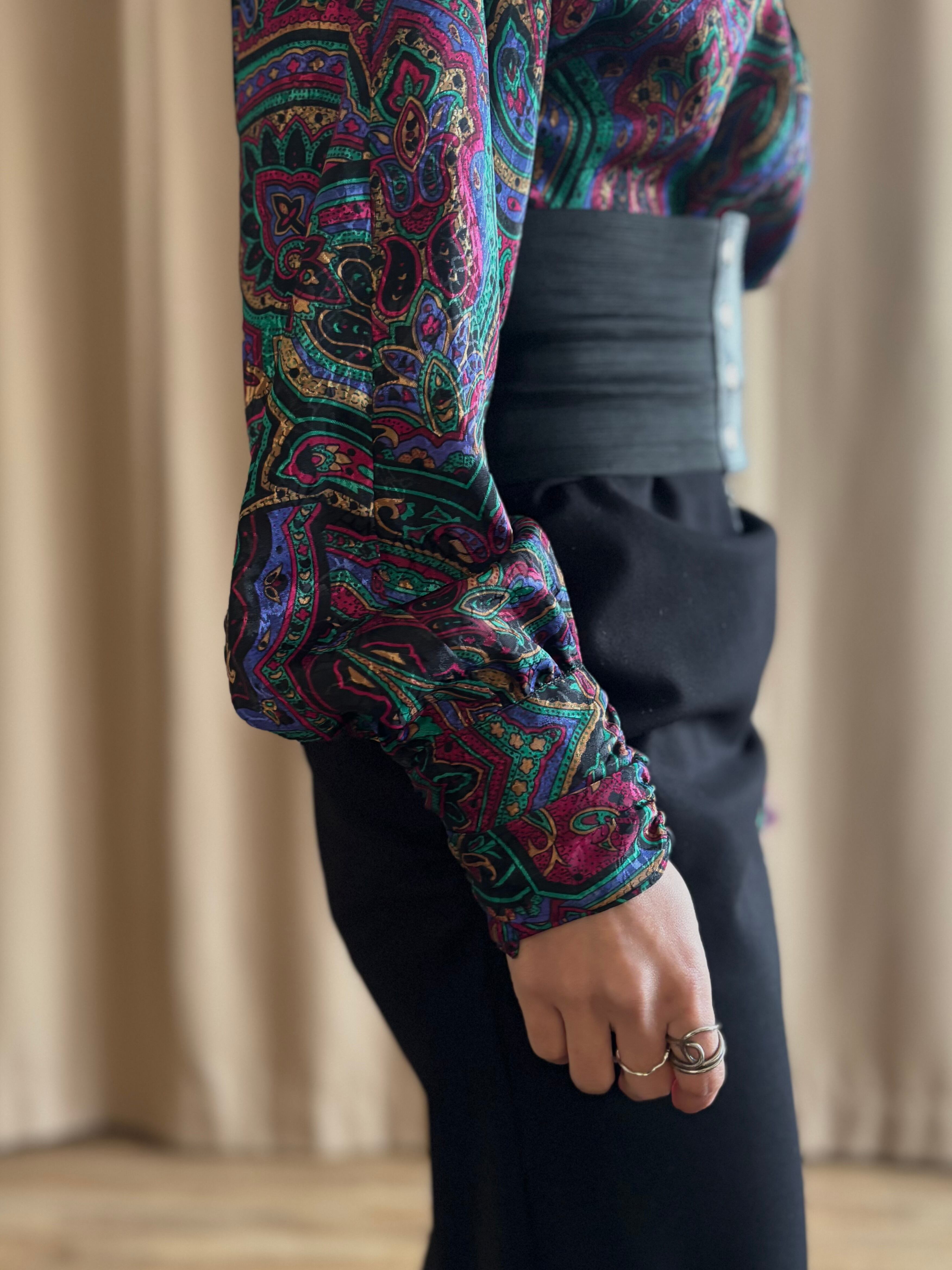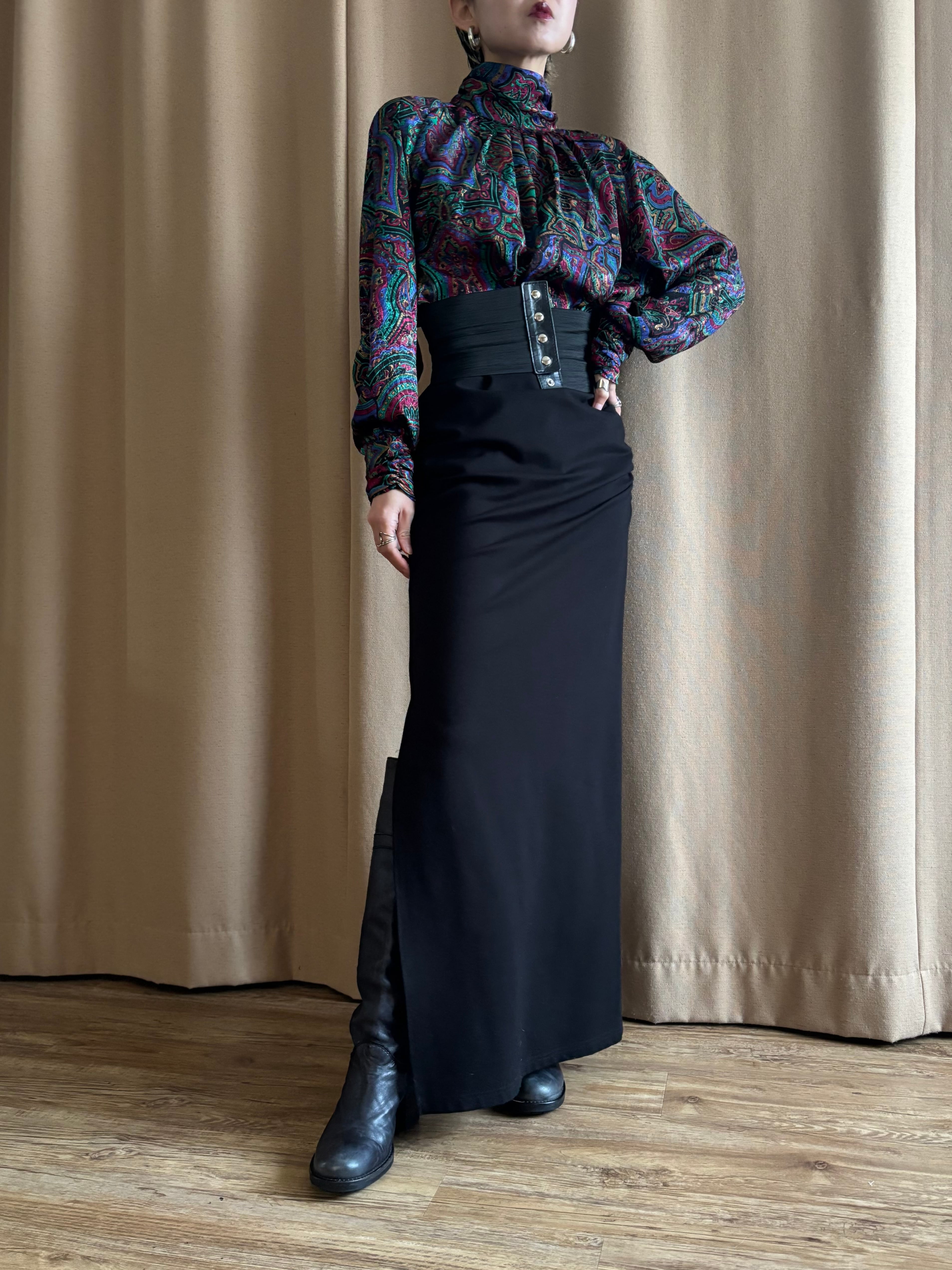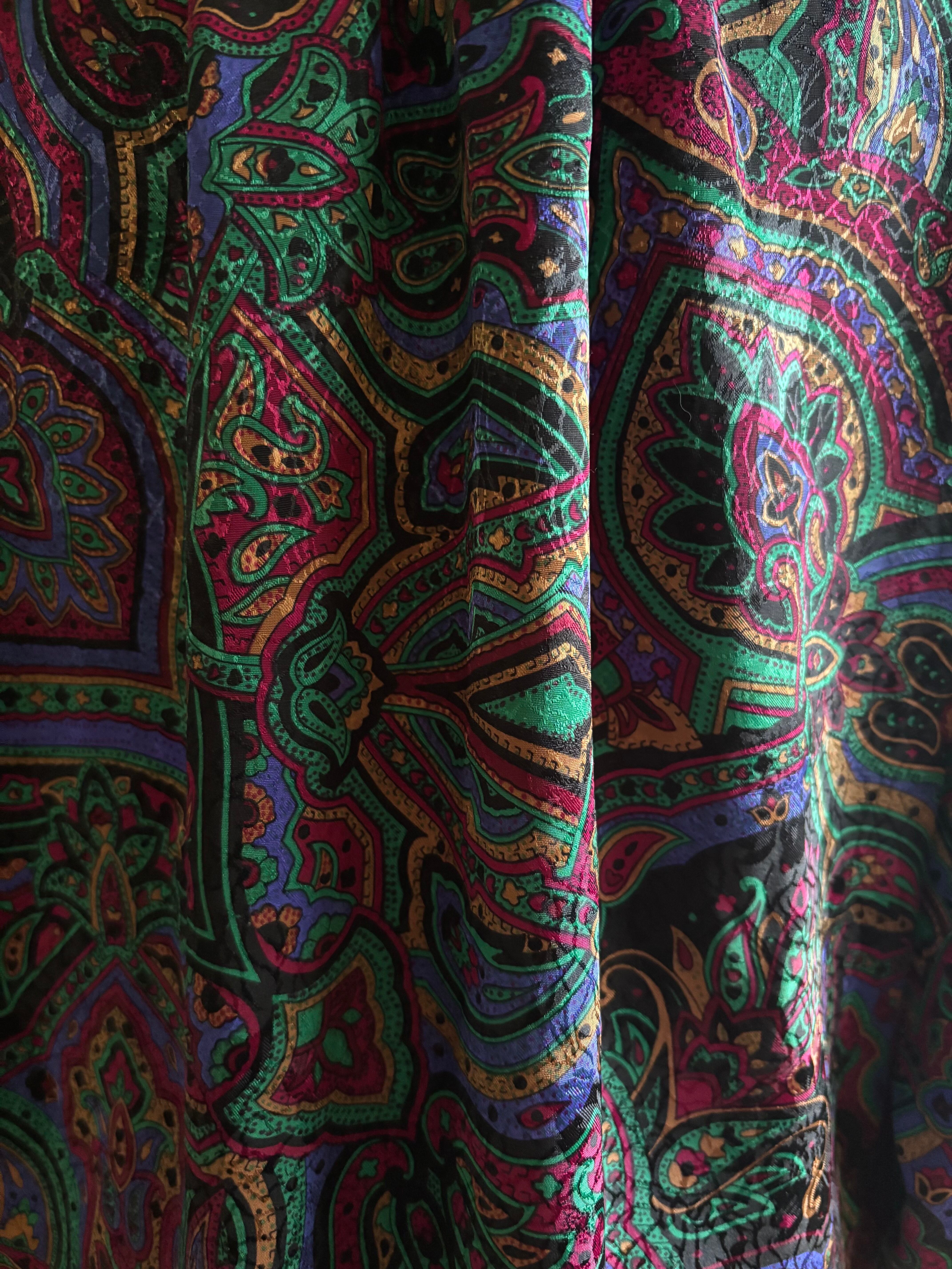 色彩豊かな配色と精妙なペイズリー柄が存在感を放つレトロモードな一着。