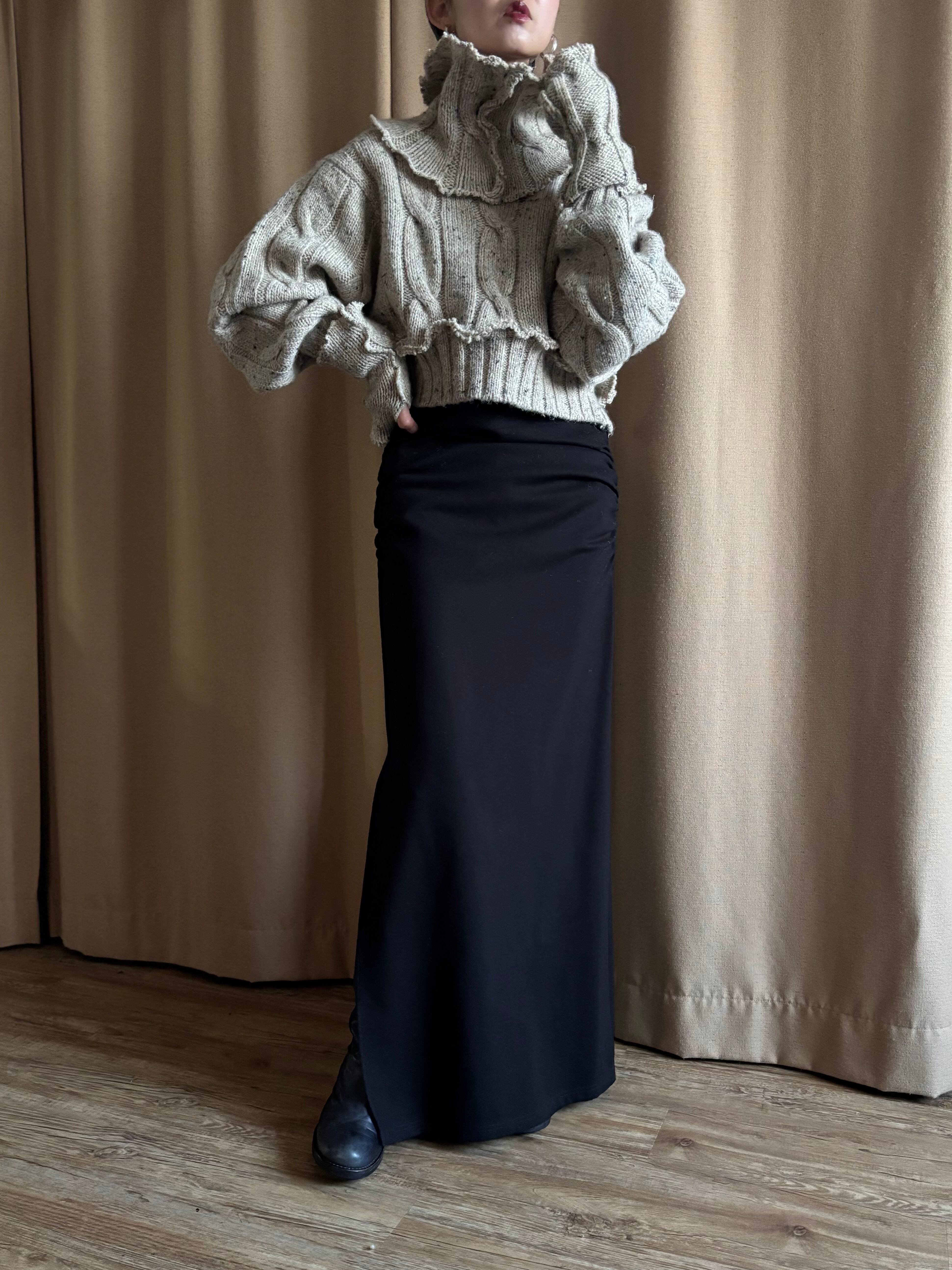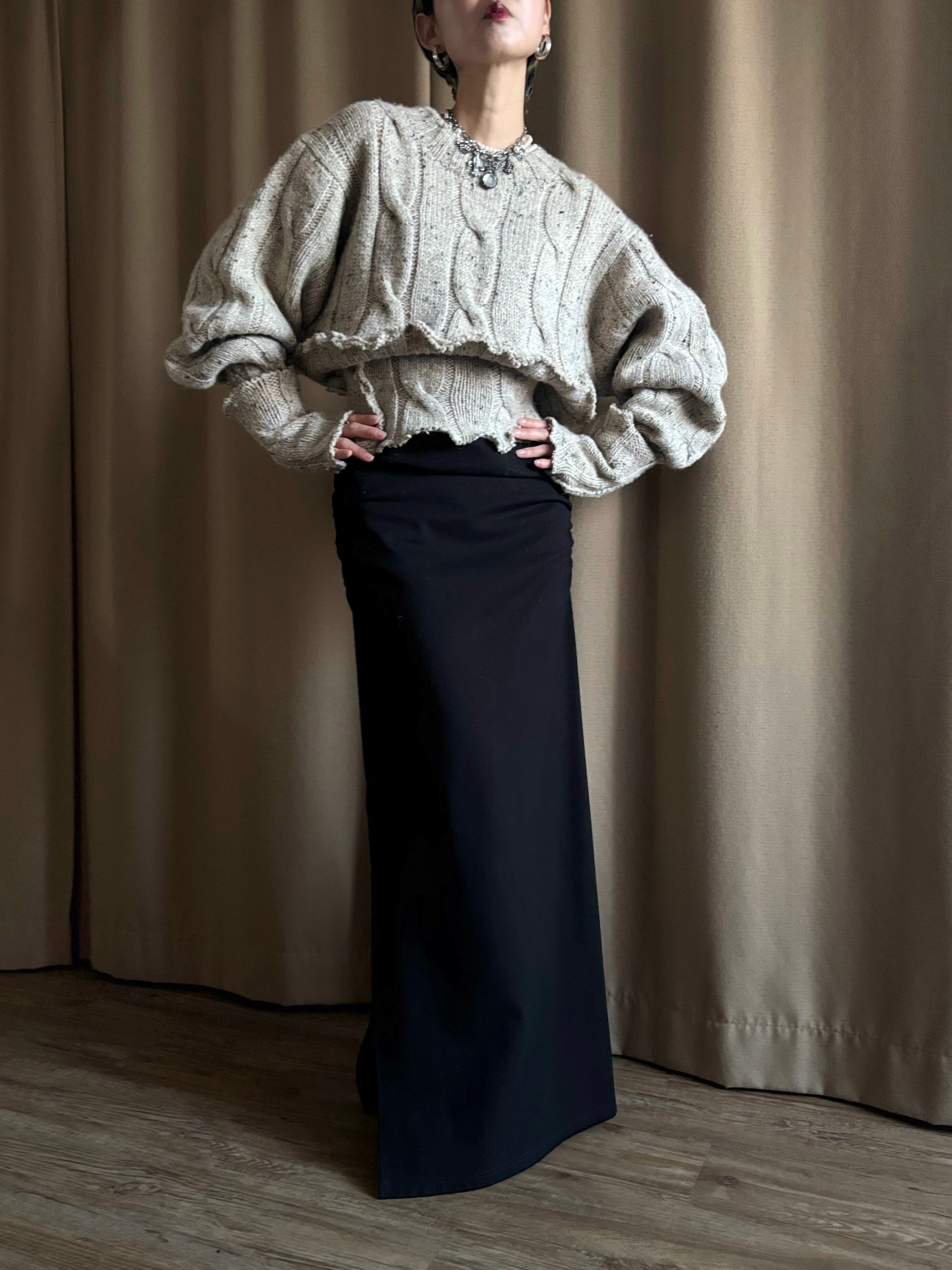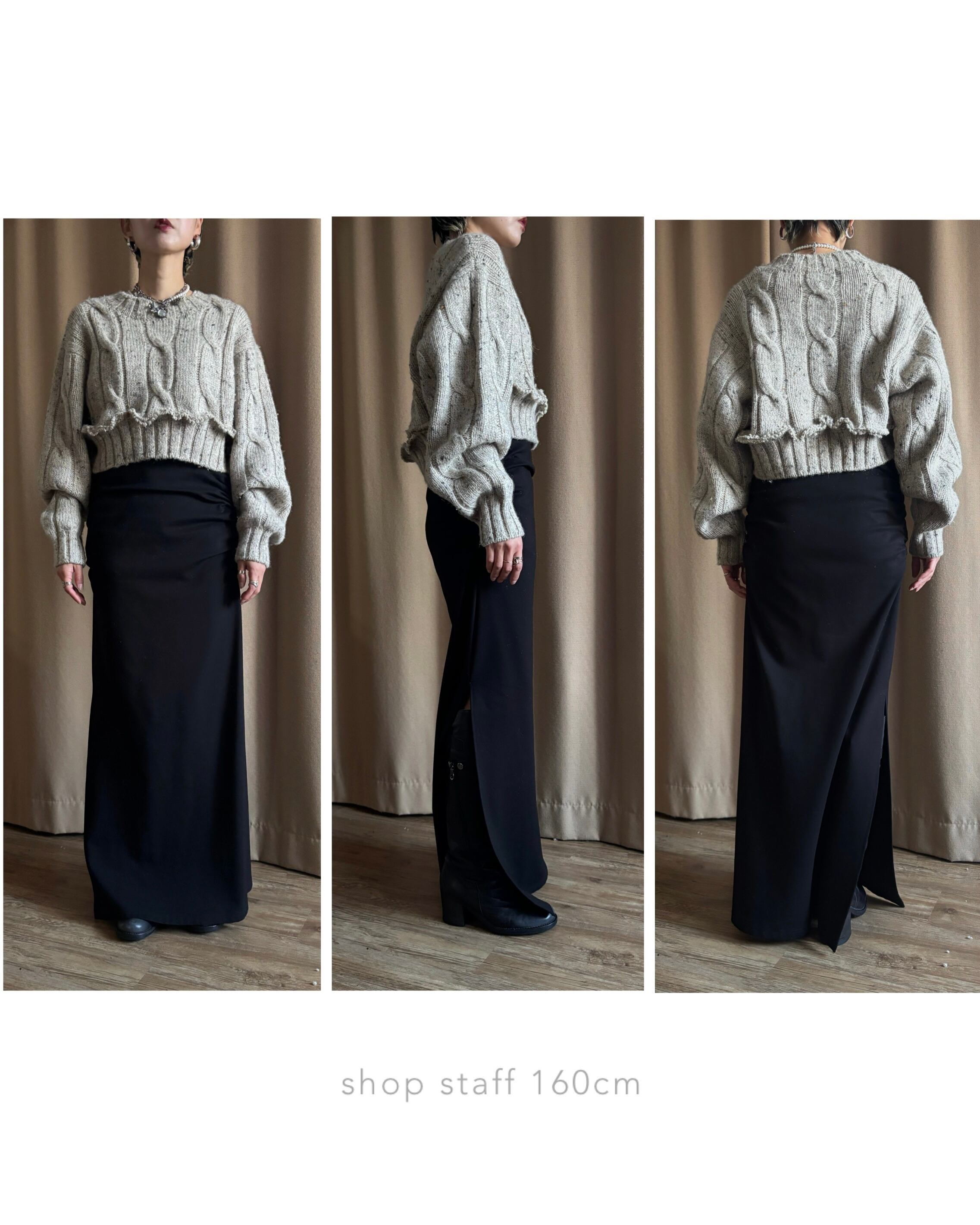 スヌードはウエスト位置に持っていき、ニットとレイヤードすることでショート丈が苦手な方もご着用しやすい仕様に。