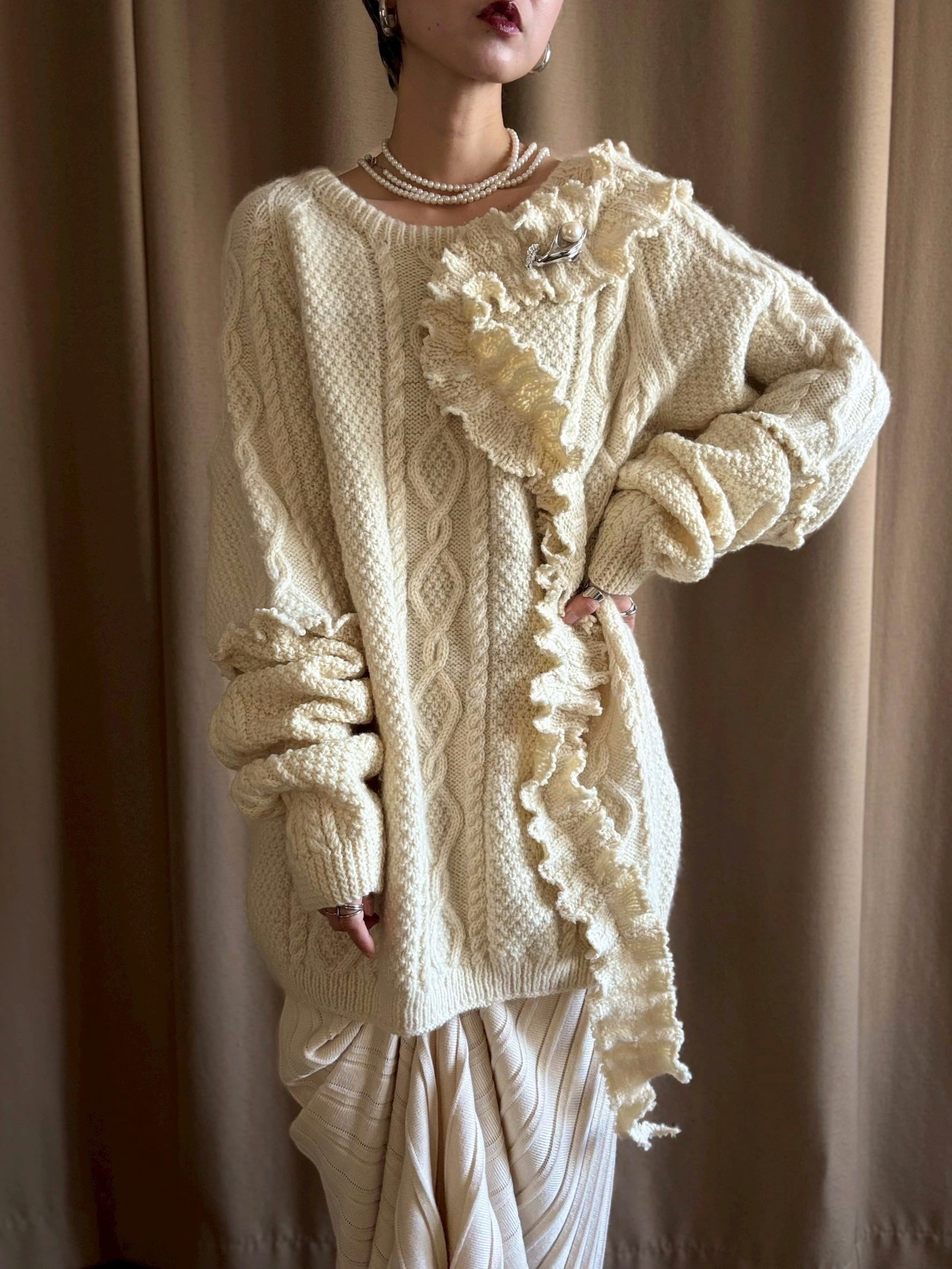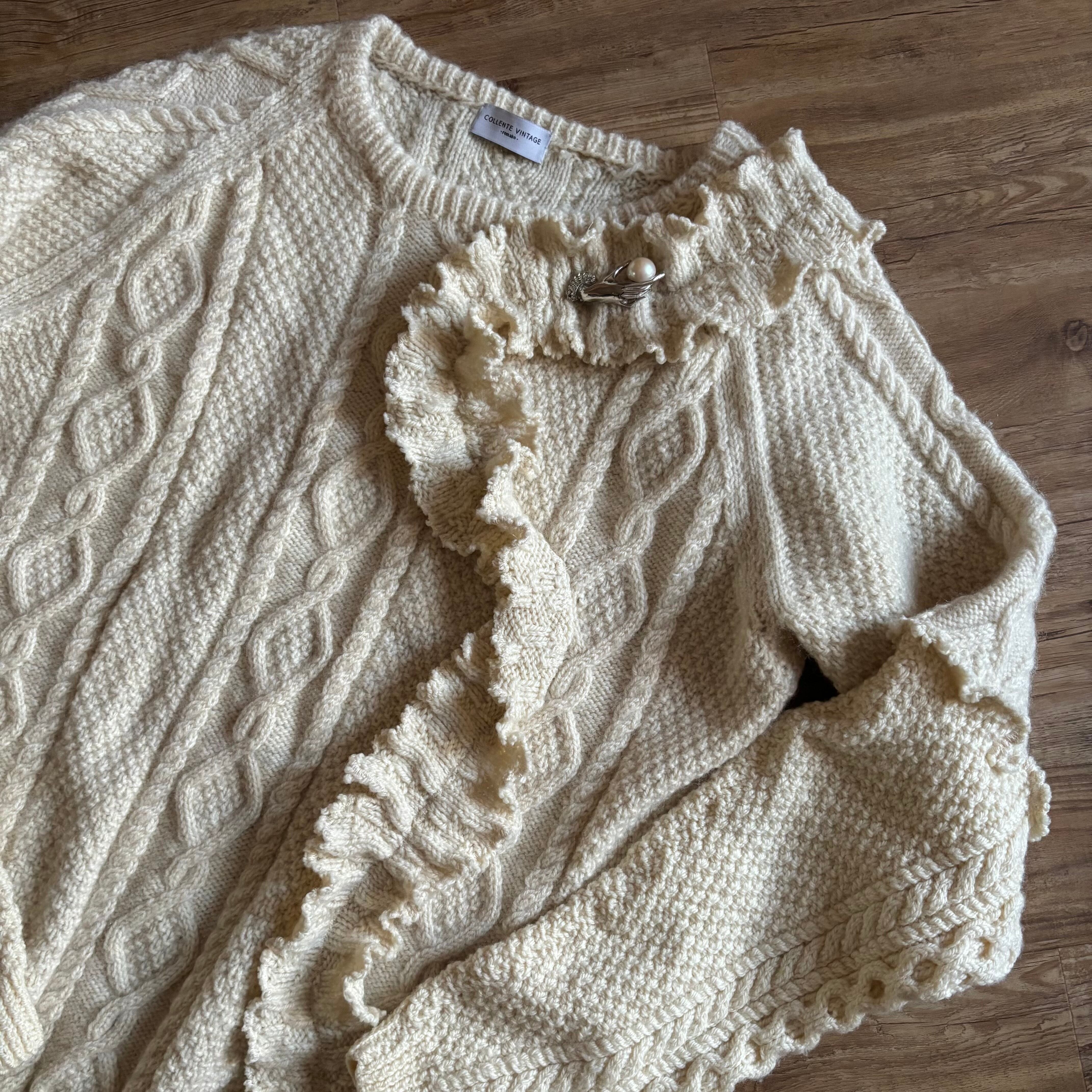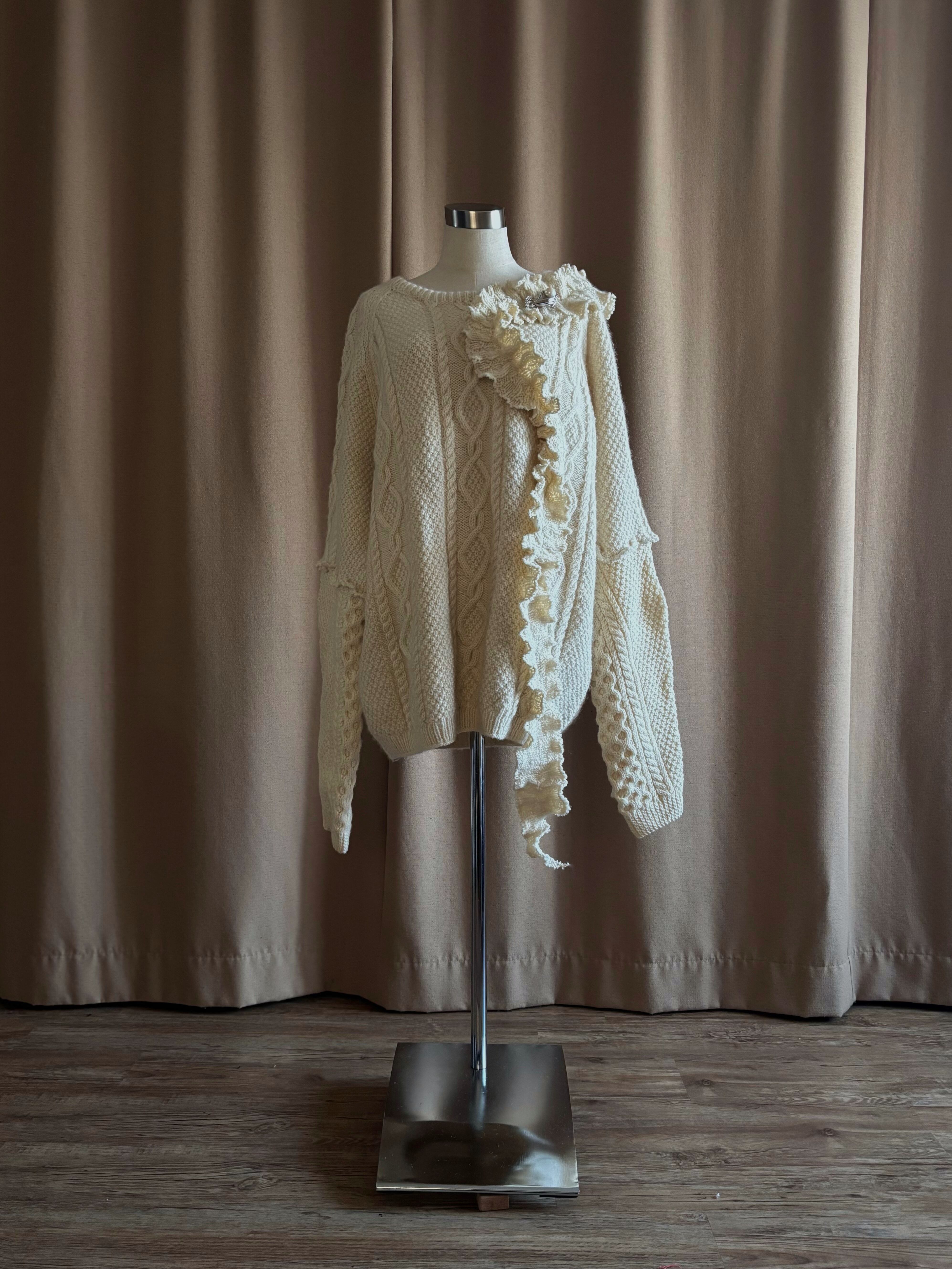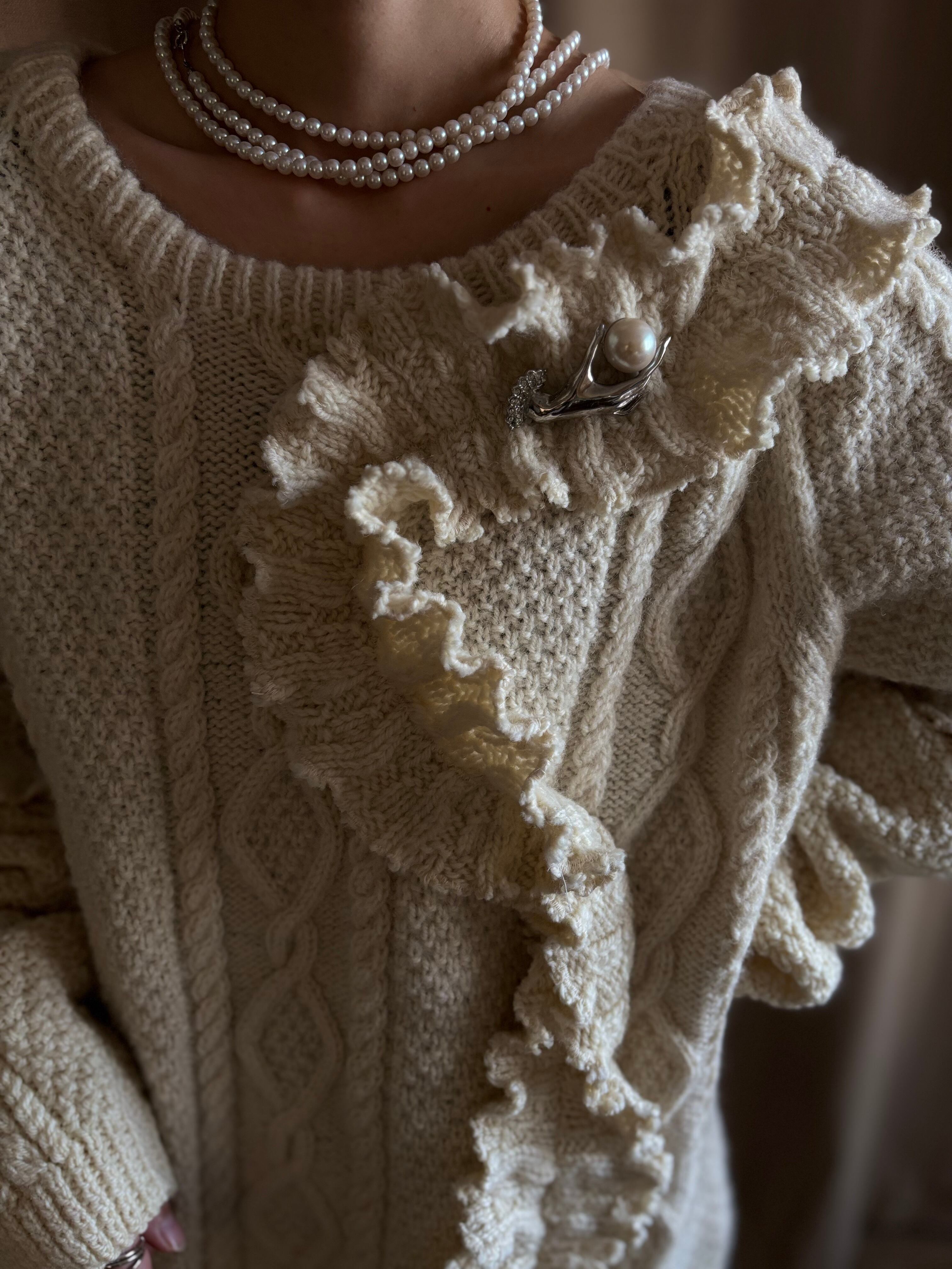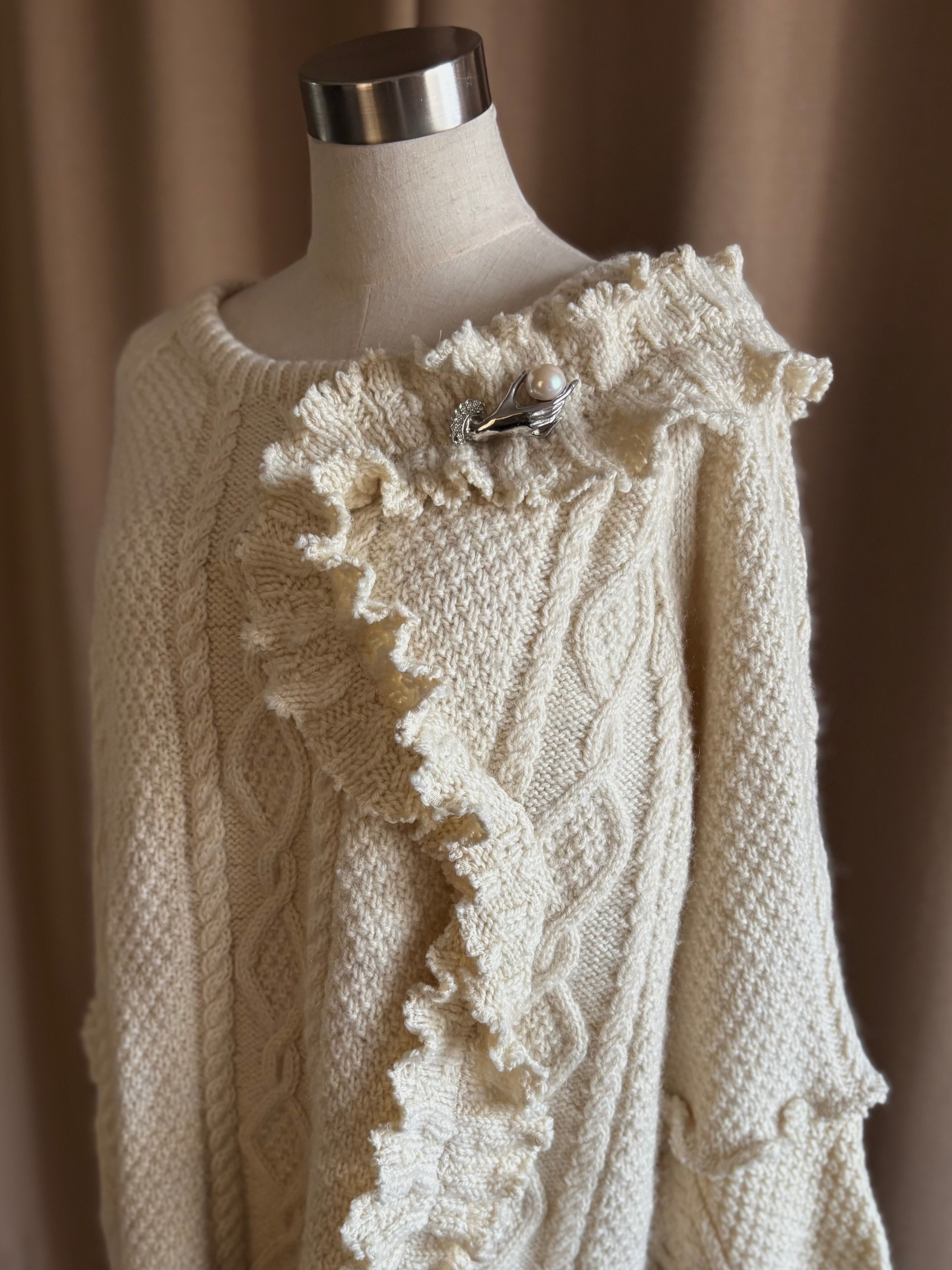 クラシカルなアラン編みニットを再構築し、フリルディテールを大胆に施したヴィンテージブローチ付きリメイクニット。