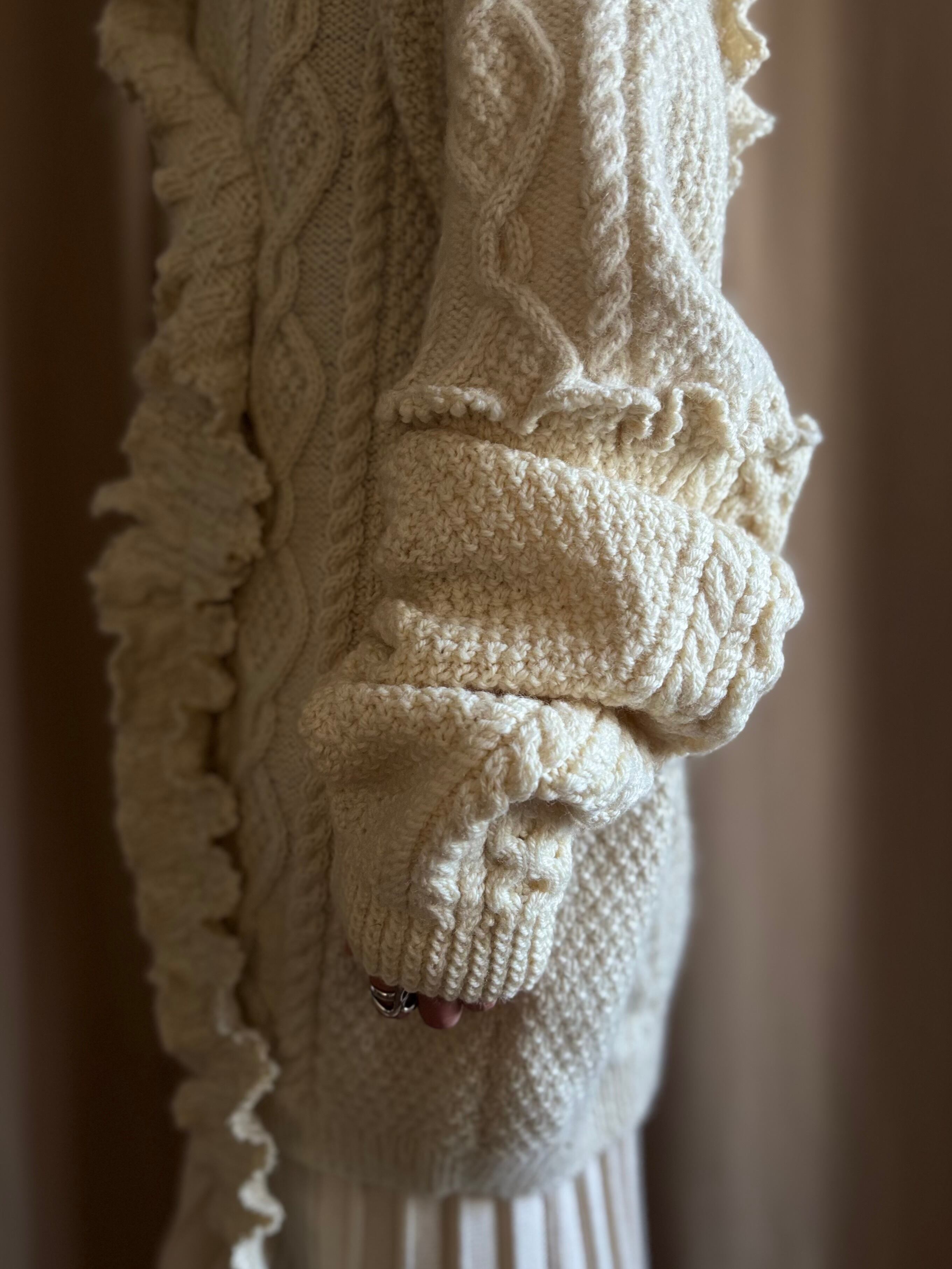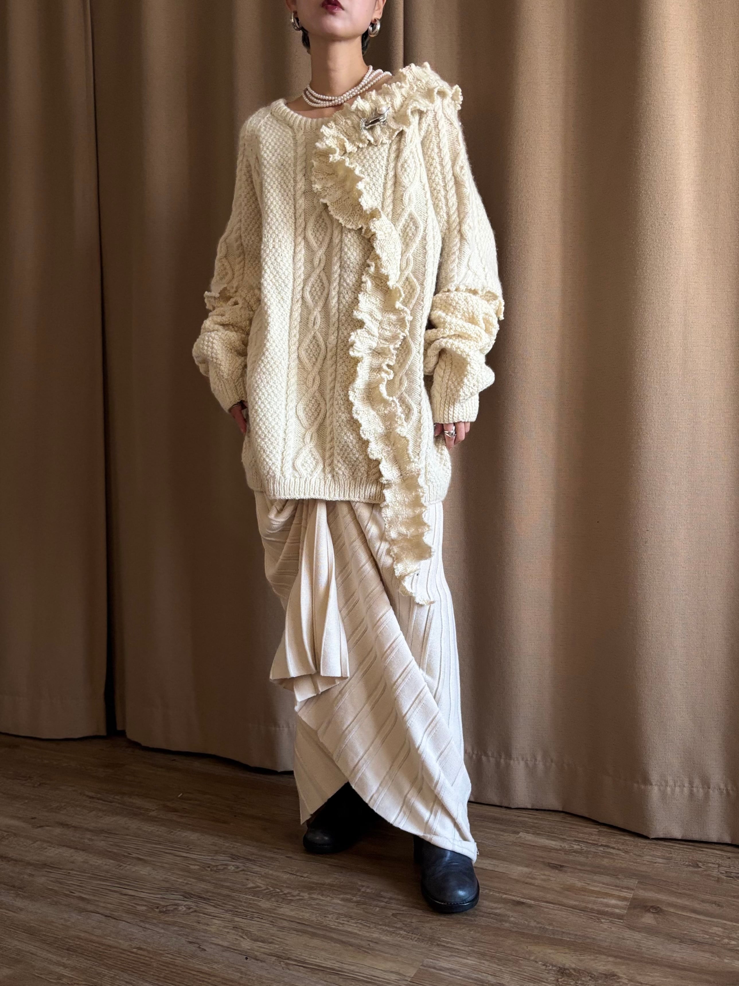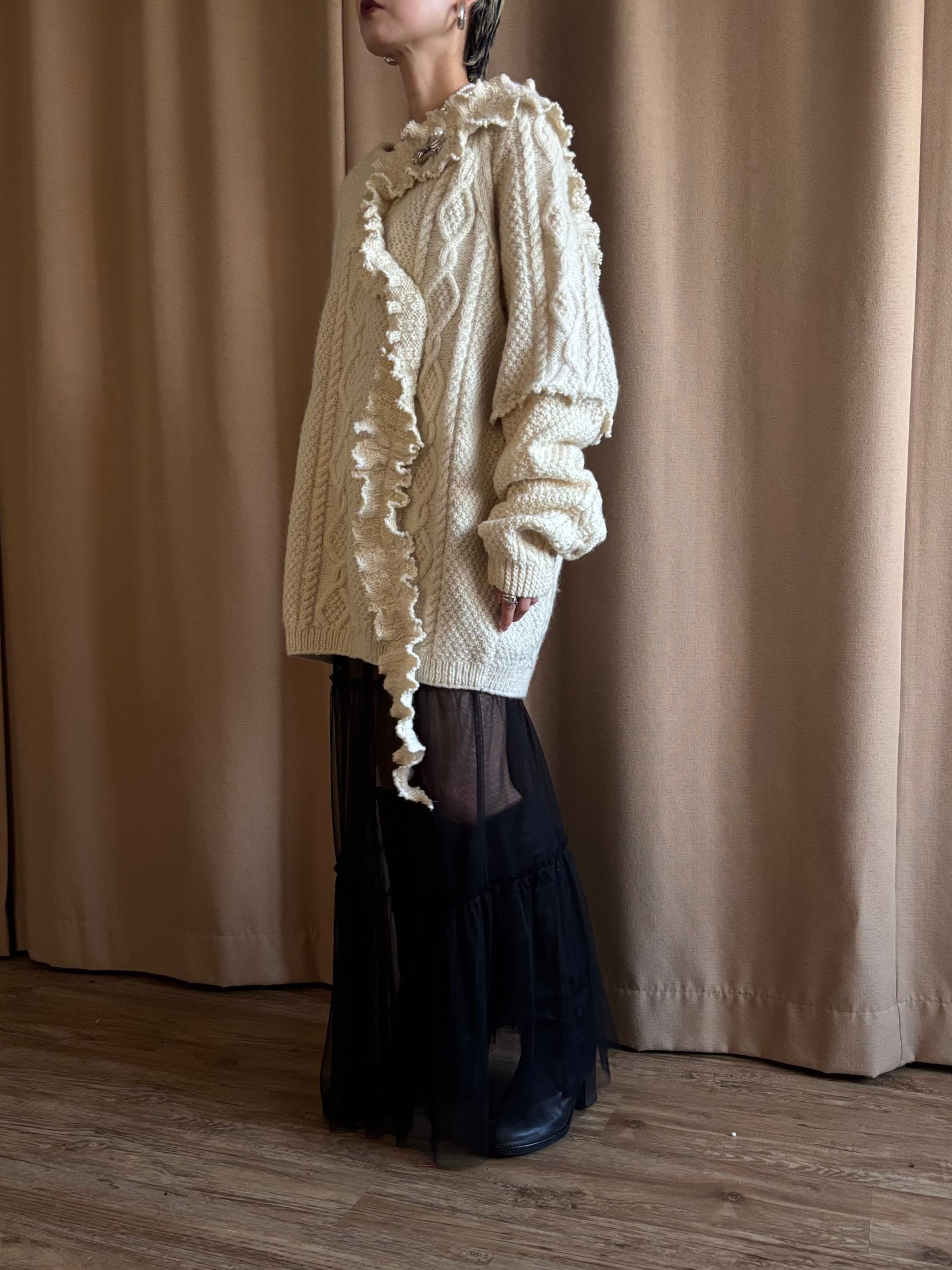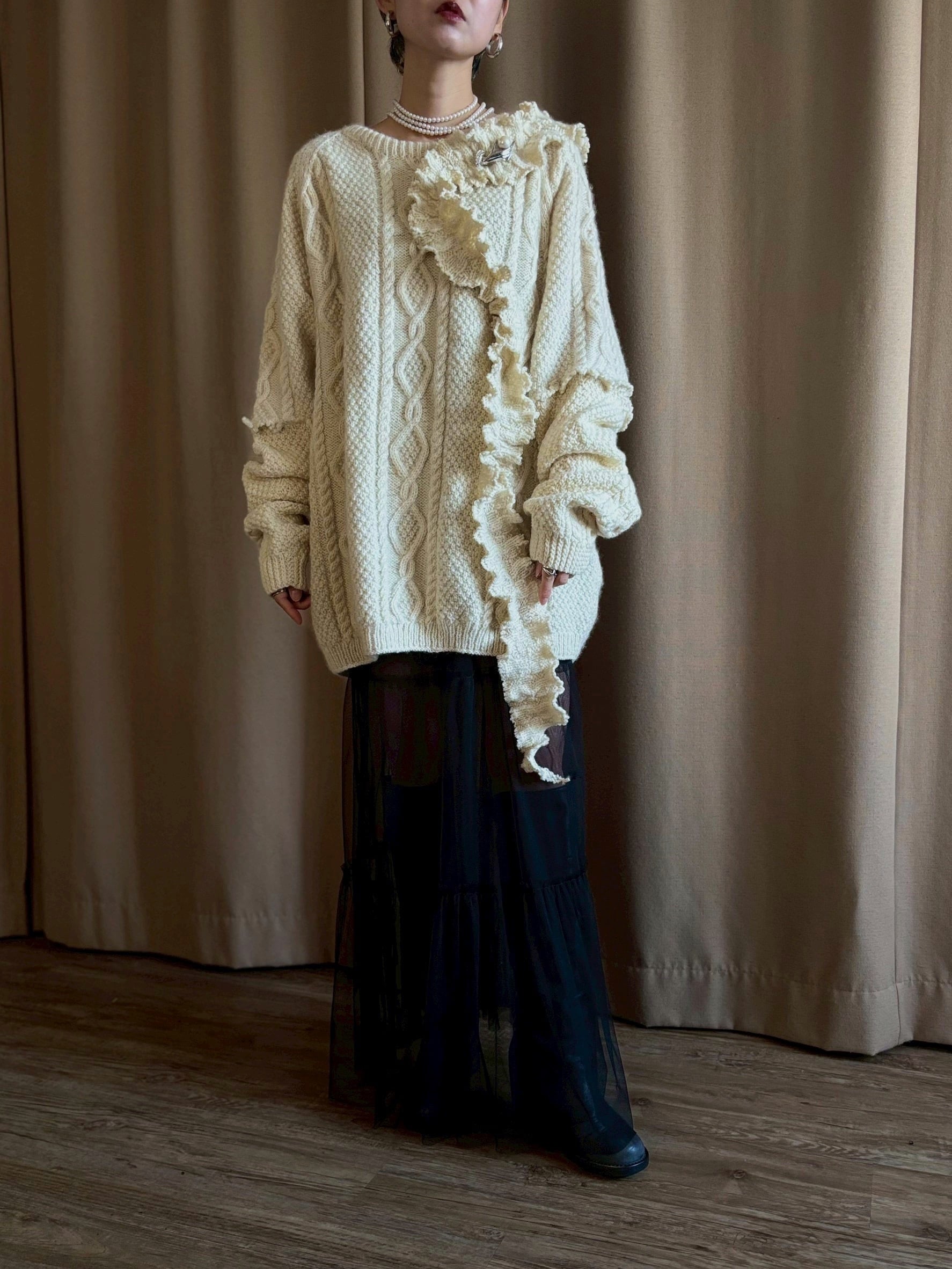 クラシカルなアラン編みニットを再構築し、フリルディテールを大胆に施したヴィンテージブローチ付きリメイクニット。
