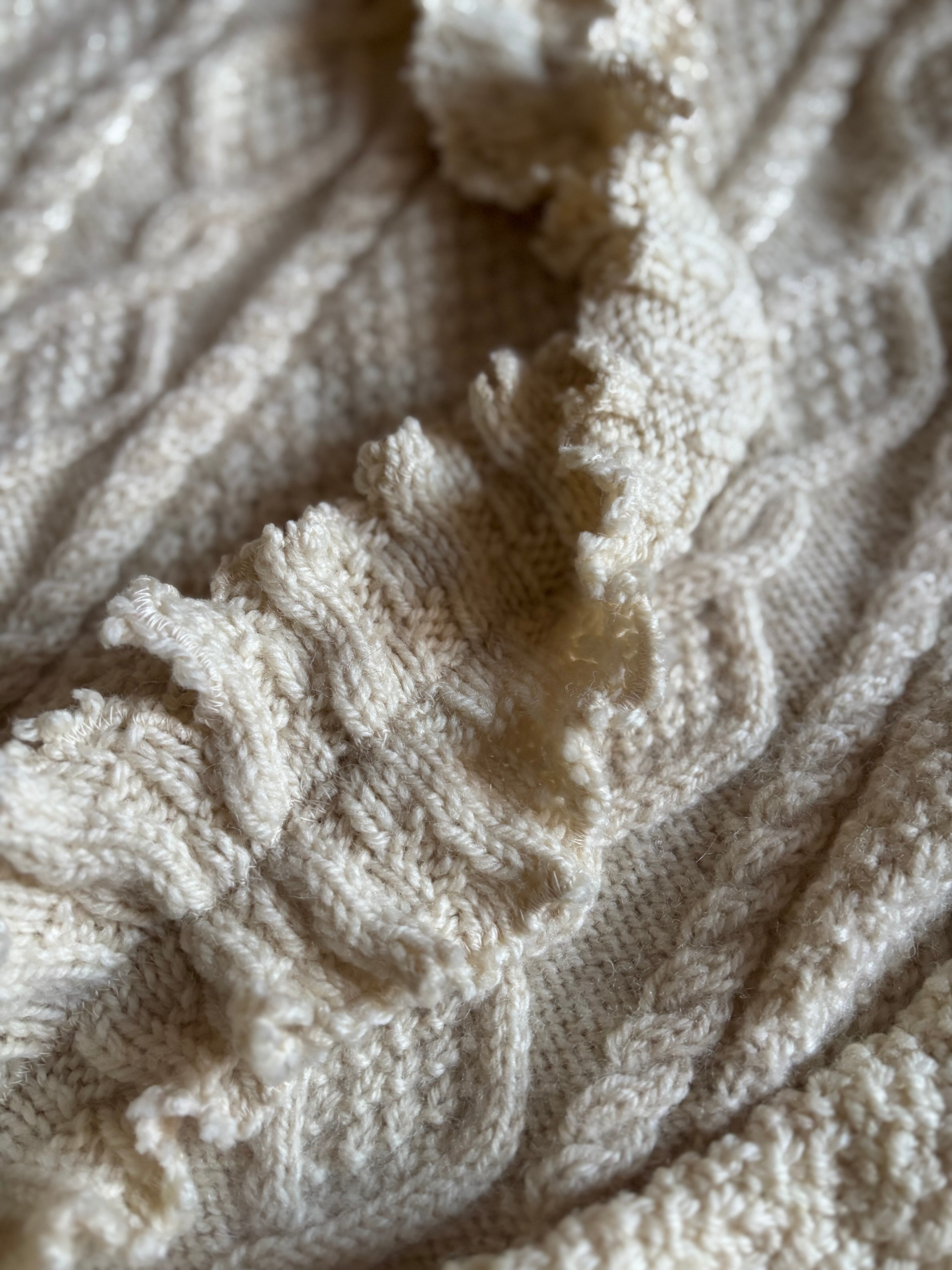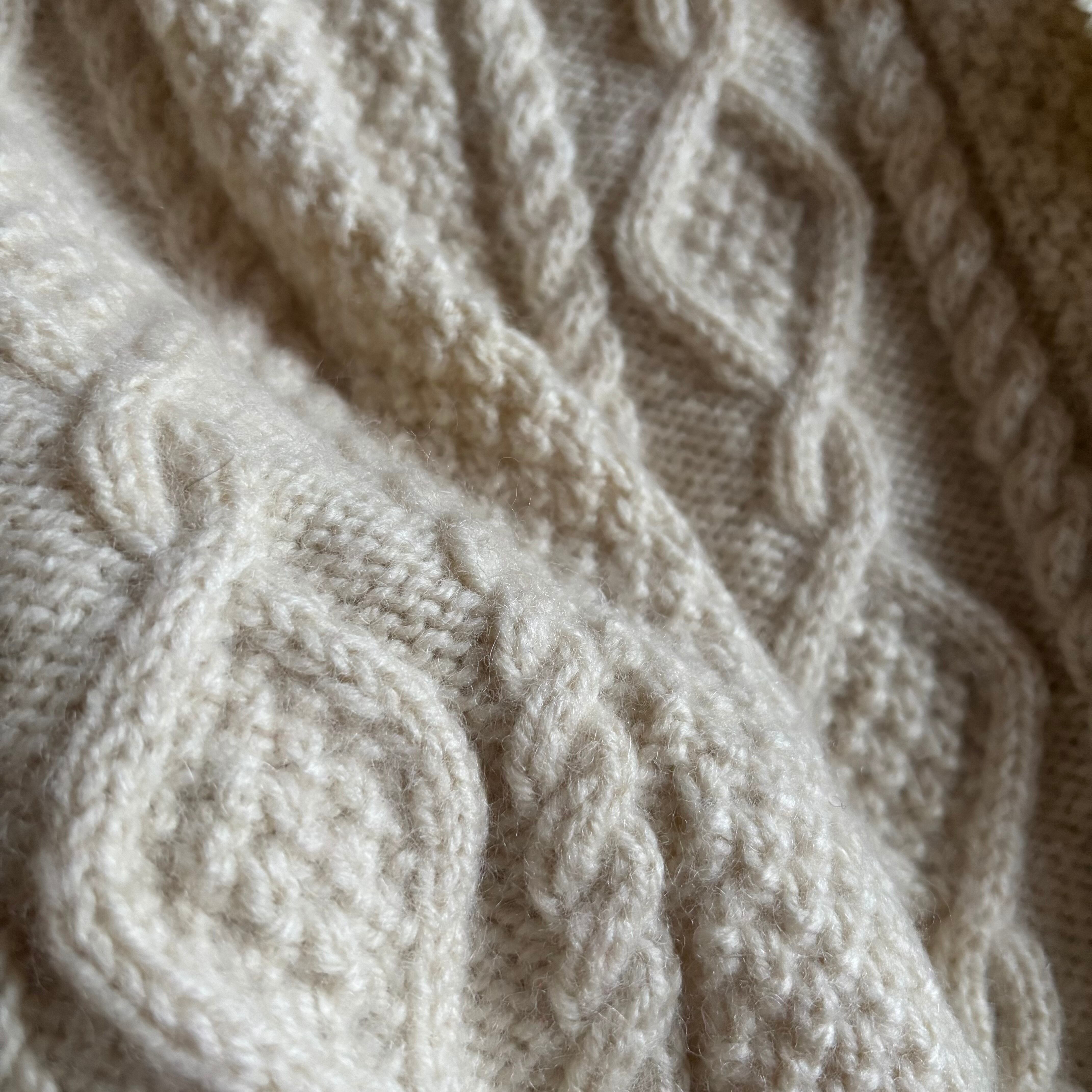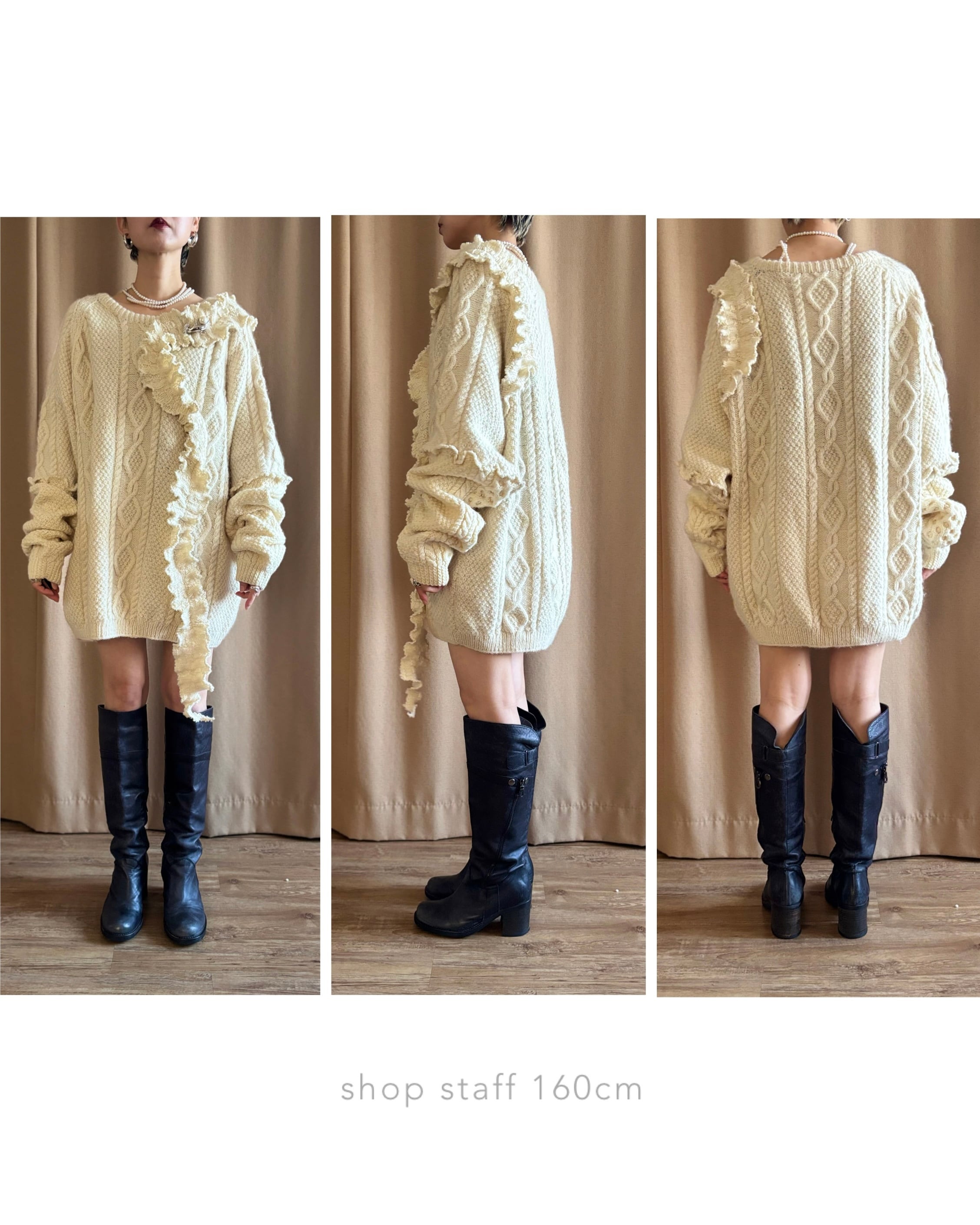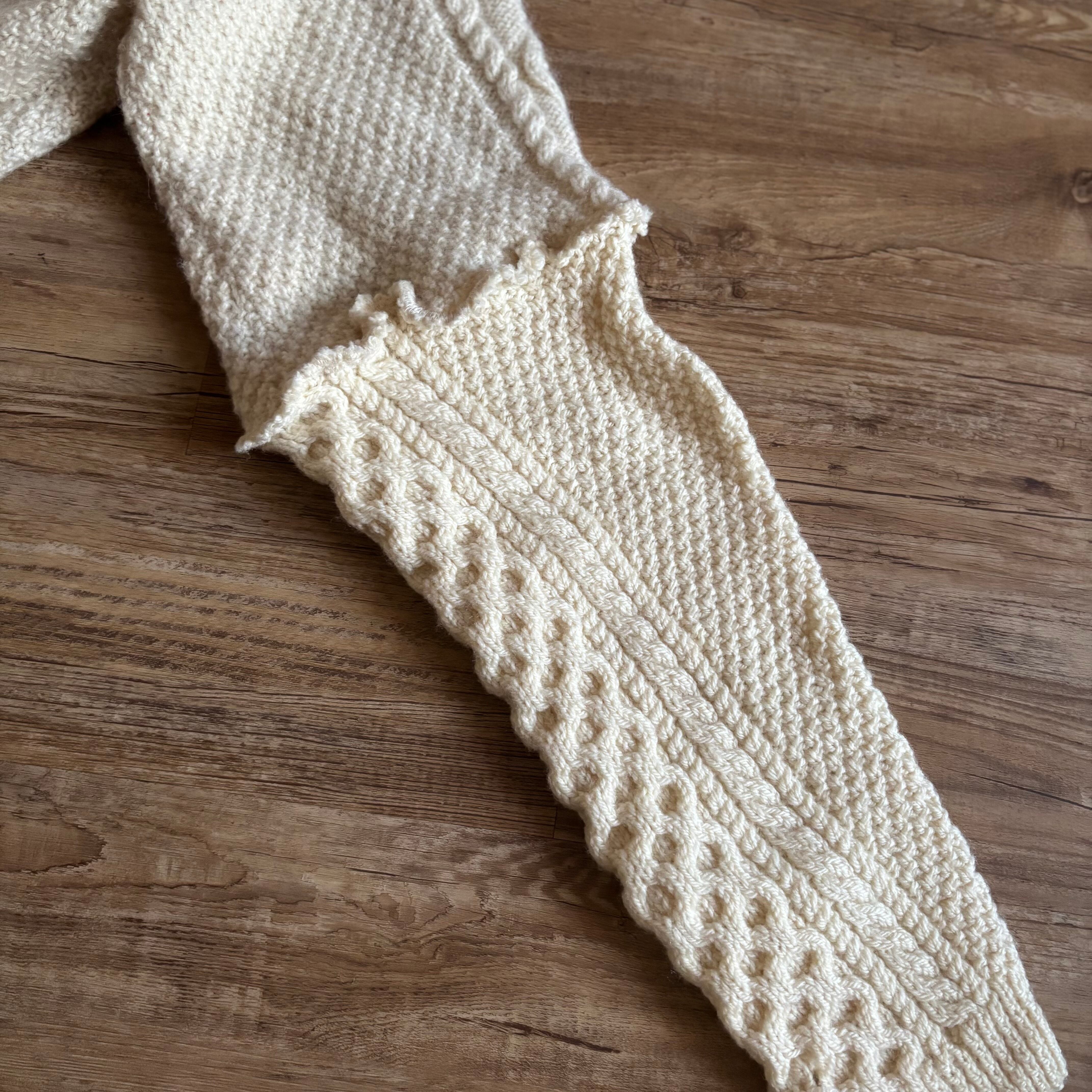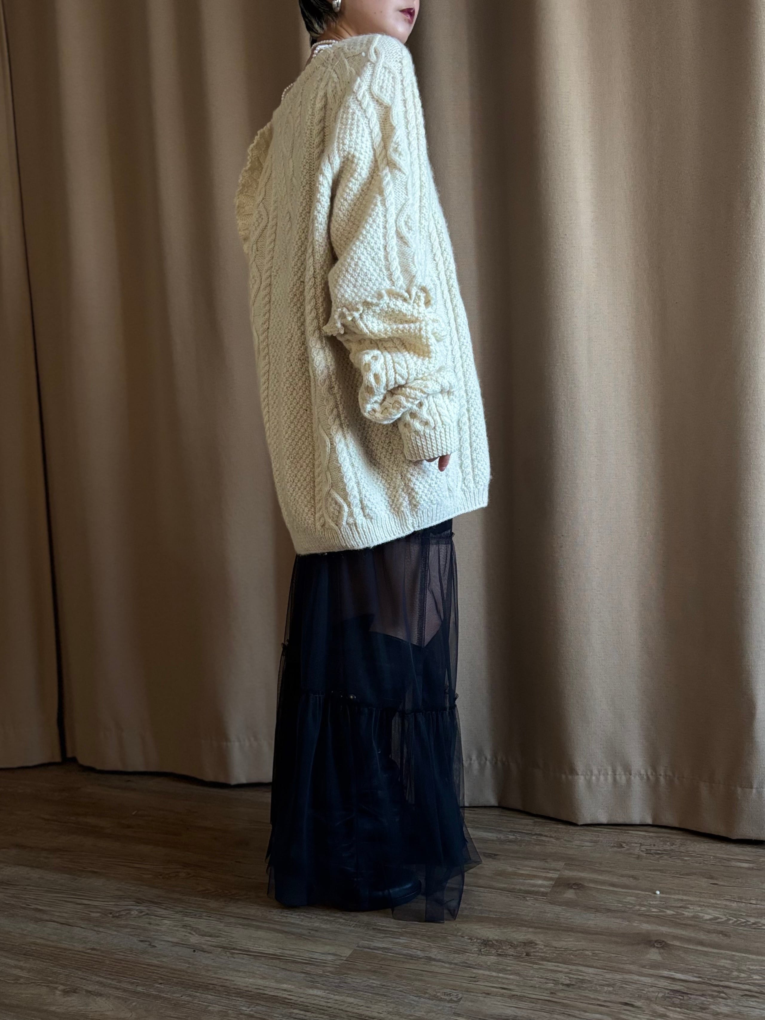 クラシカルなアラン編みニットを再構築し、フリルディテールを大胆に施したヴィンテージブローチ付きリメイクニット。