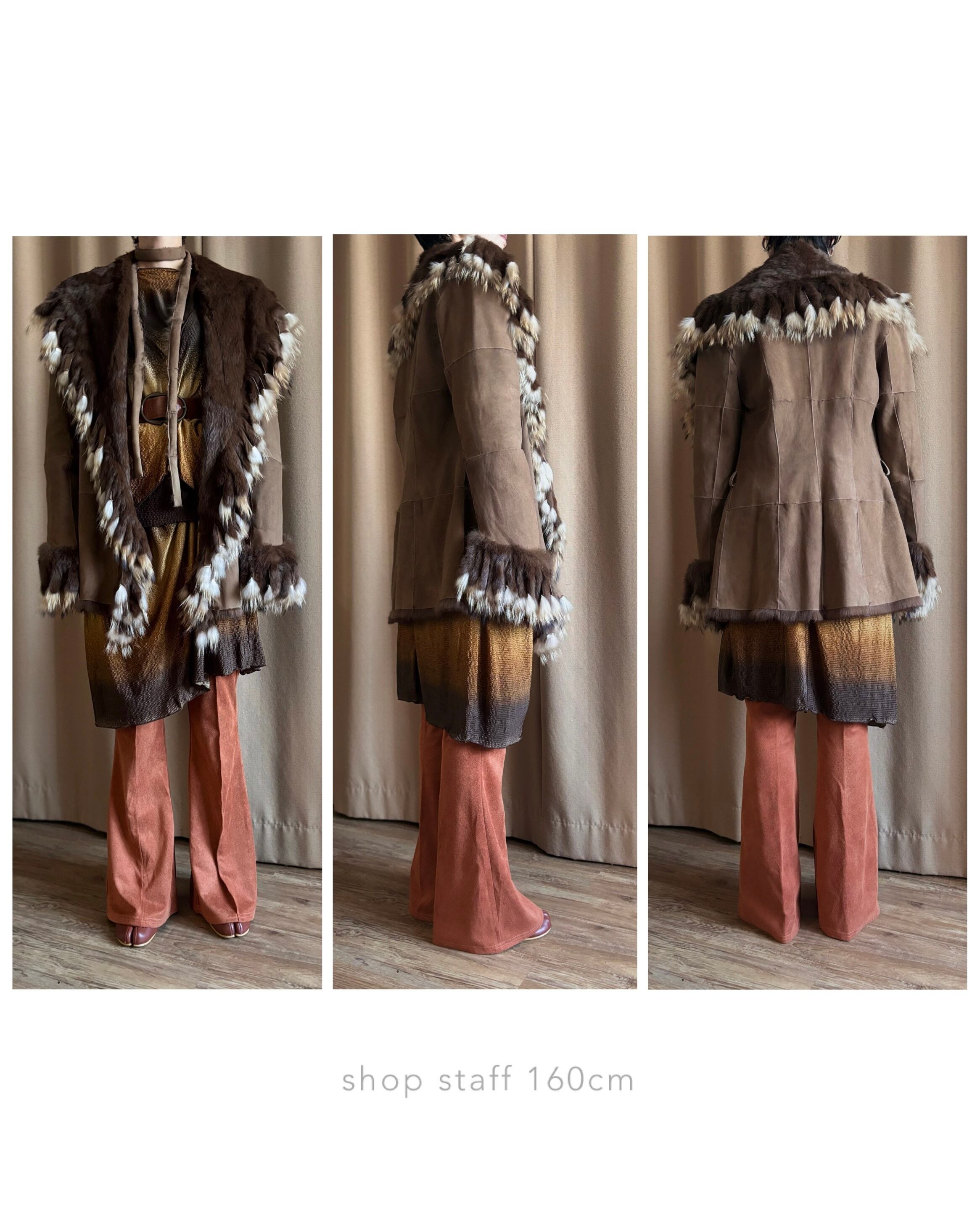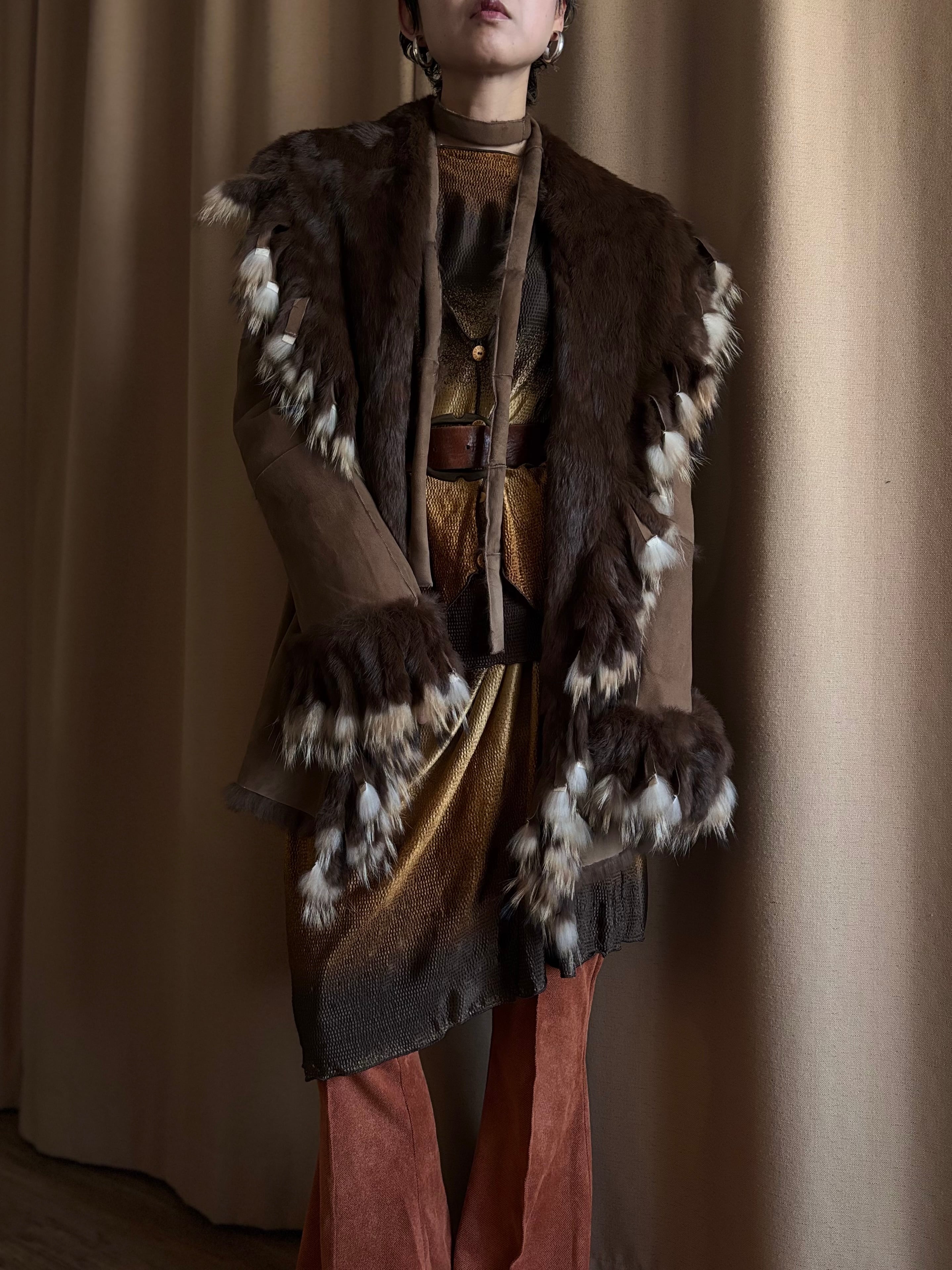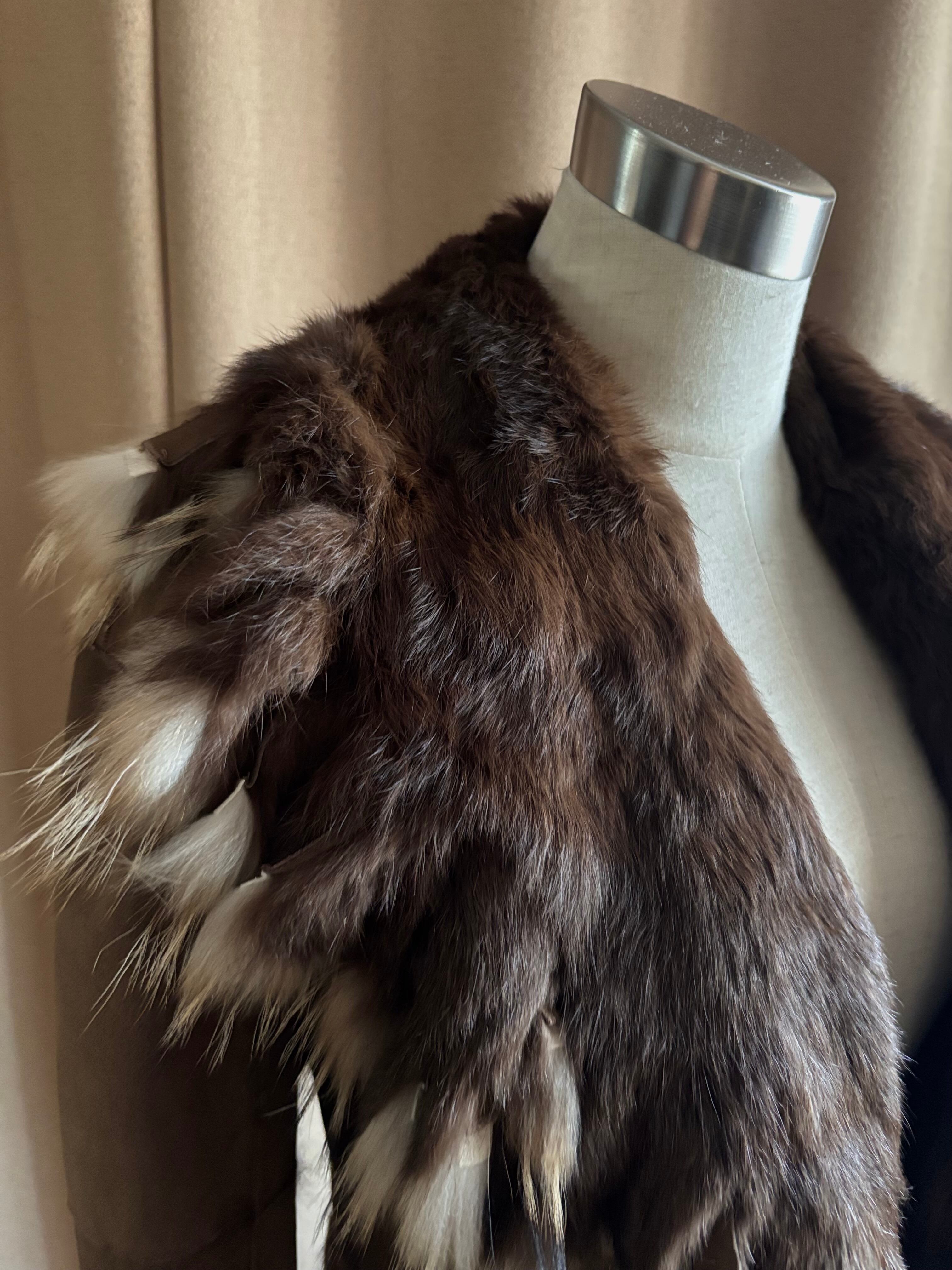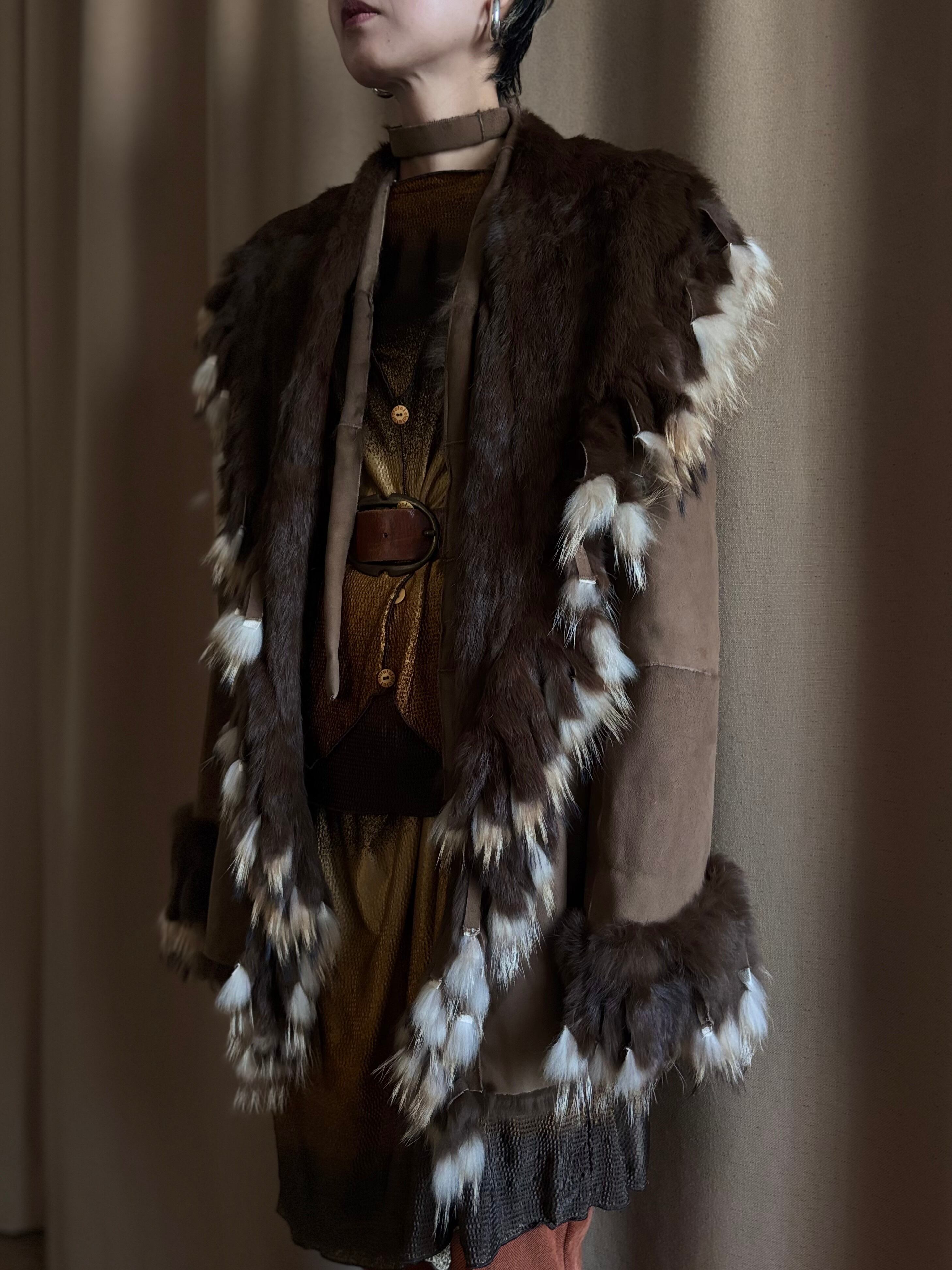 上質なラビットファーのなめらかな質感に、フォックスファーの豊かなボリュームを重ねた、エレガンスと迫力を併せ持つ一着。