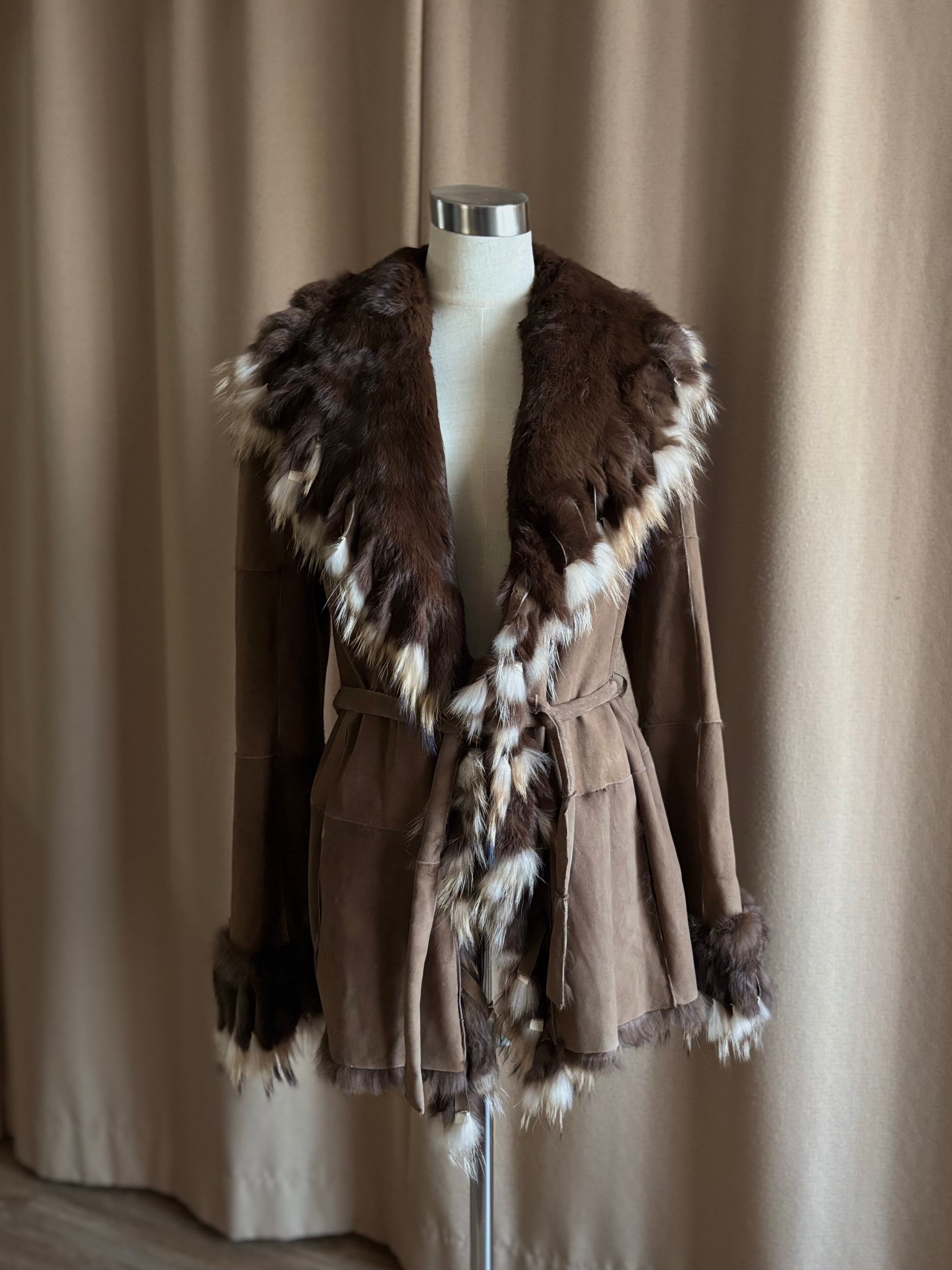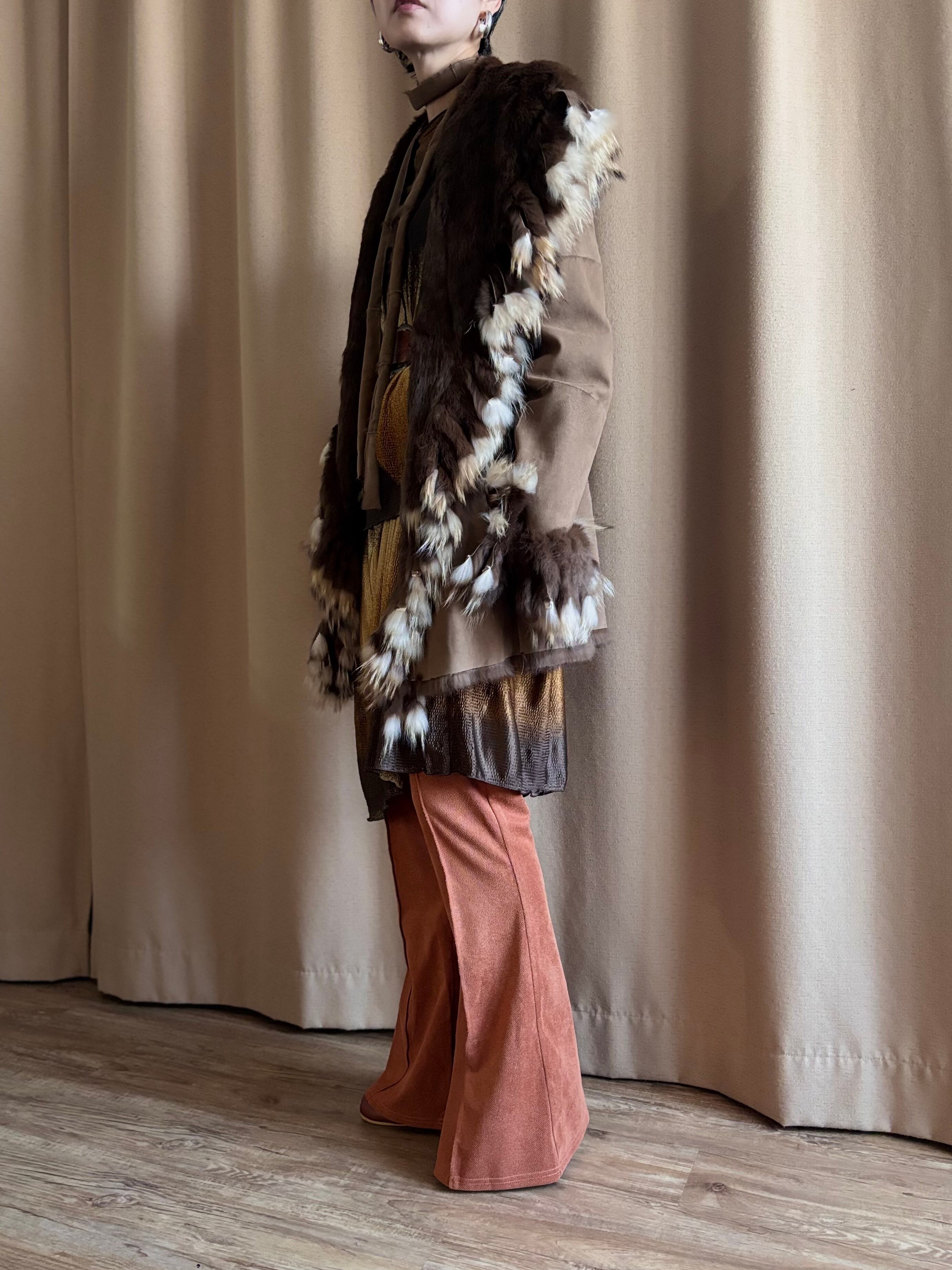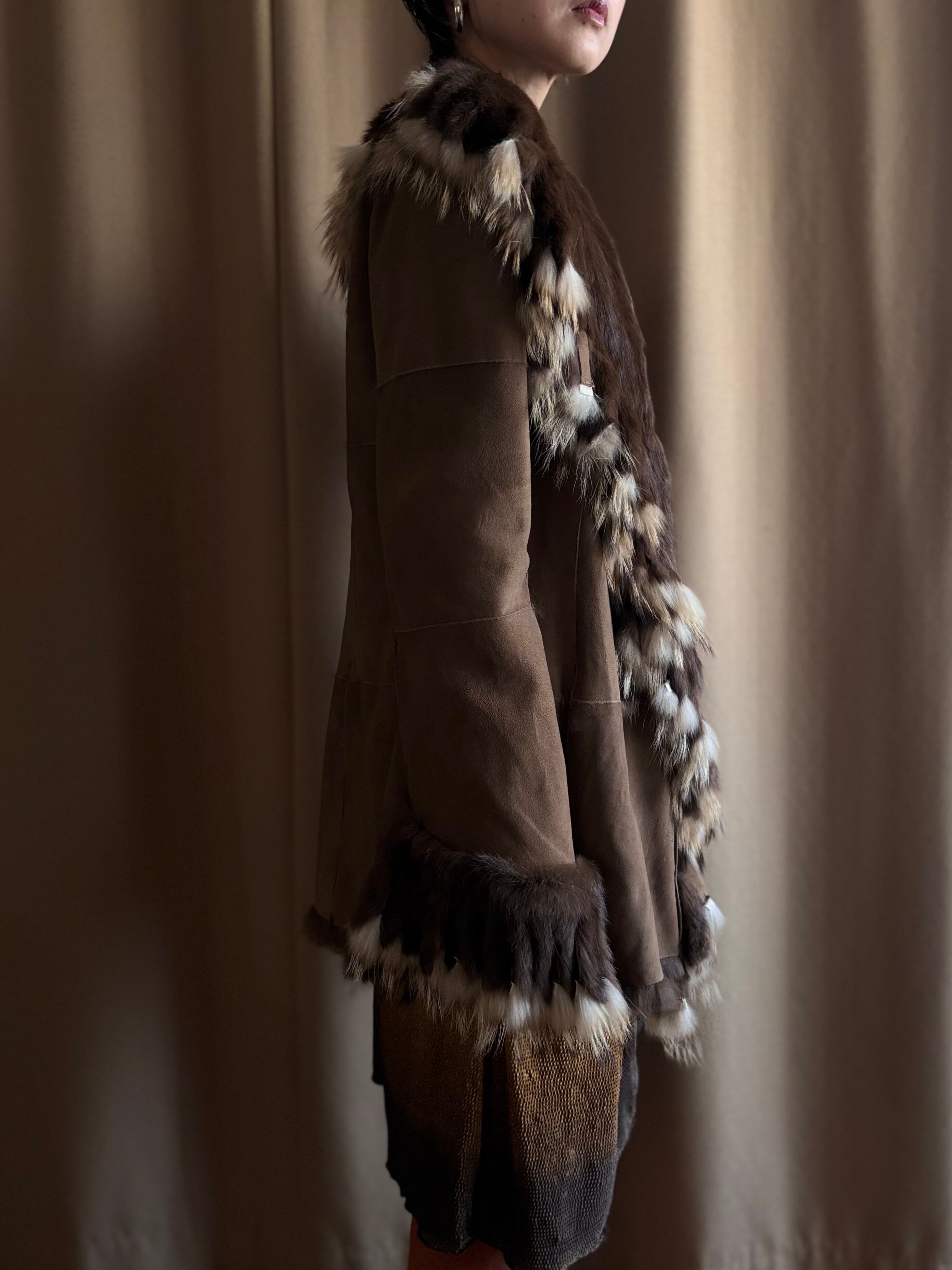 上質なラビットファーのなめらかな質感に、フォックスファーの豊かなボリュームを重ねた、エレガンスと迫力を併せ持つ一着。