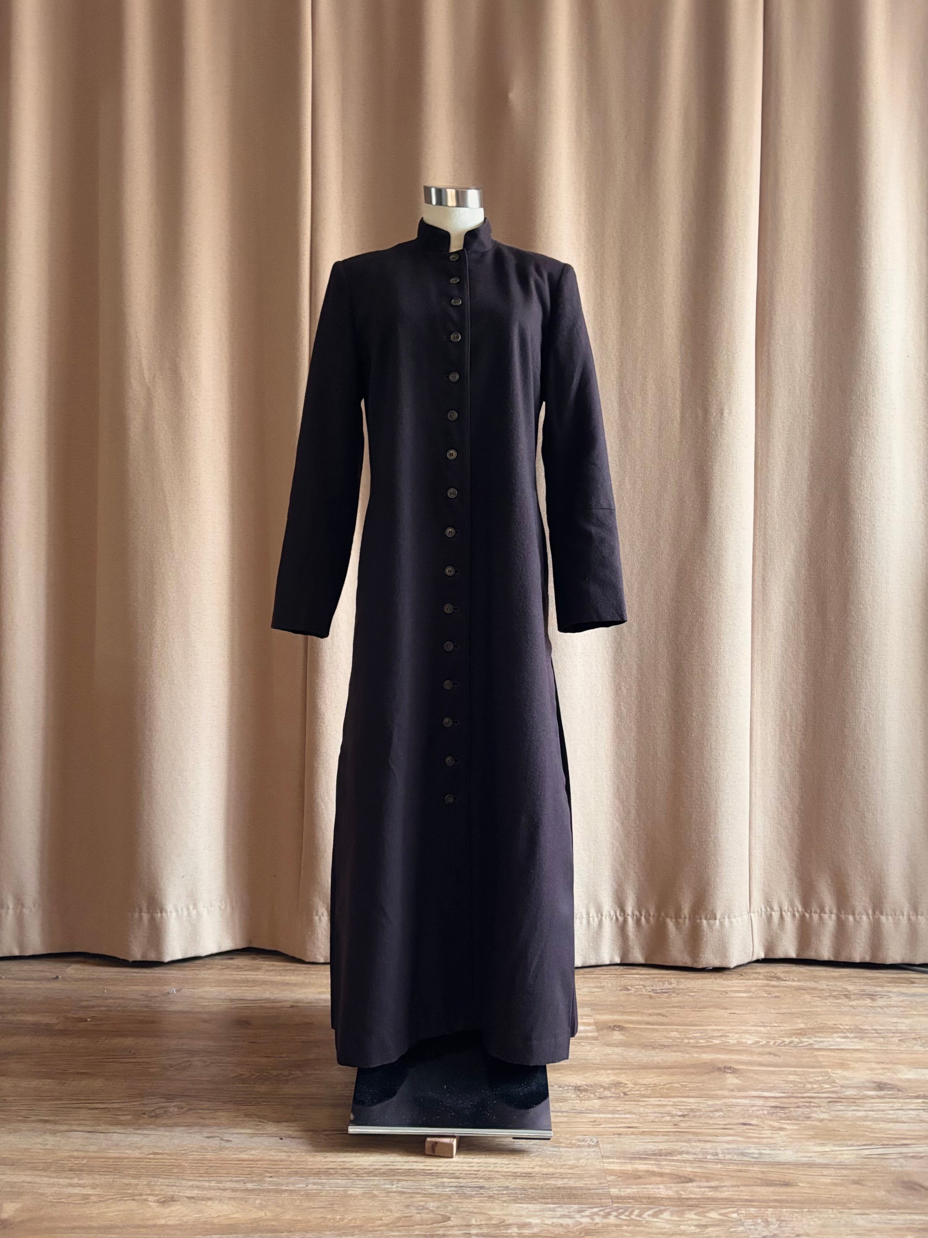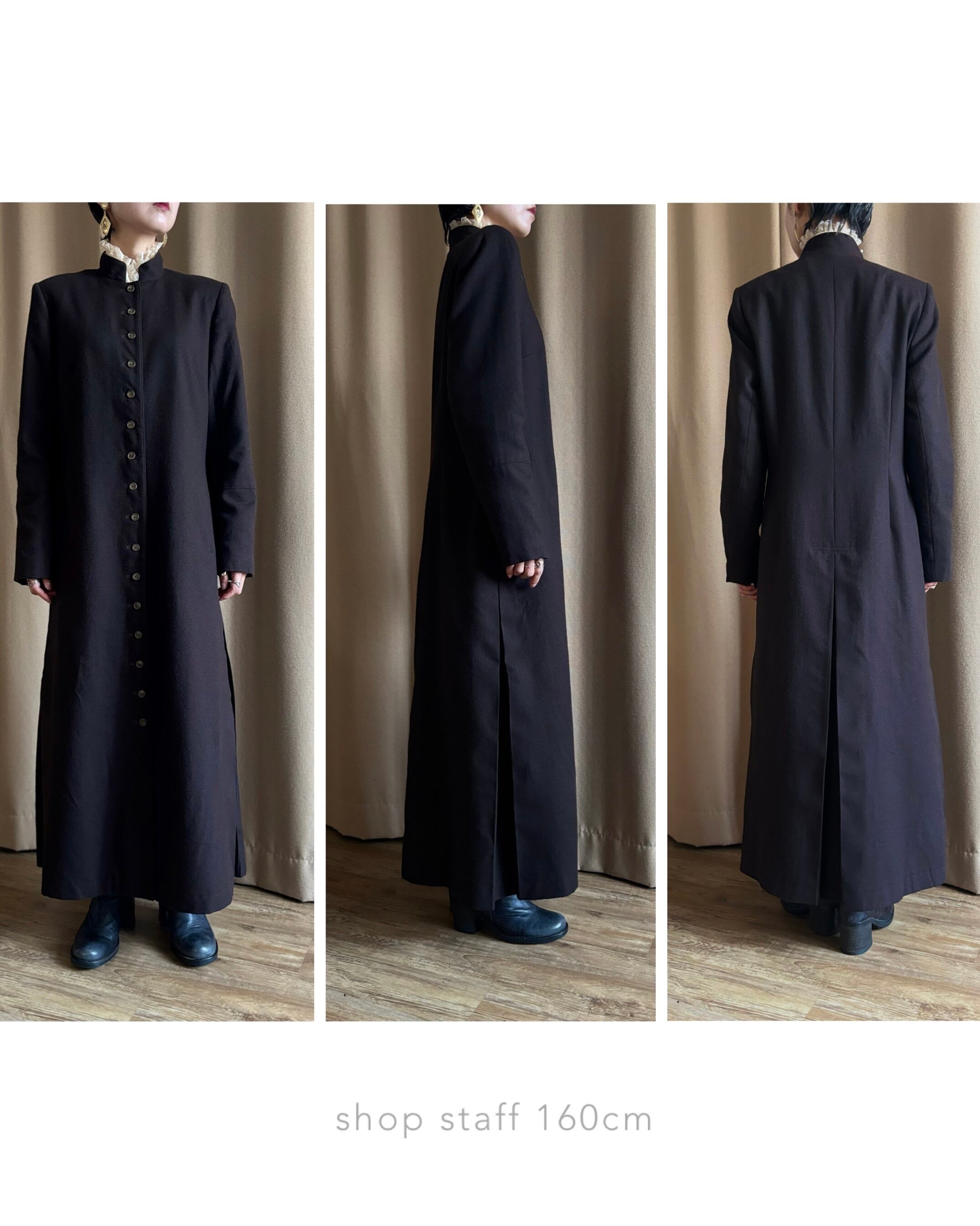 凛と立ち上がるスタンドカラーと、無駄を削ぎ落としたミニマルなフロントが静かな威厳を演出。