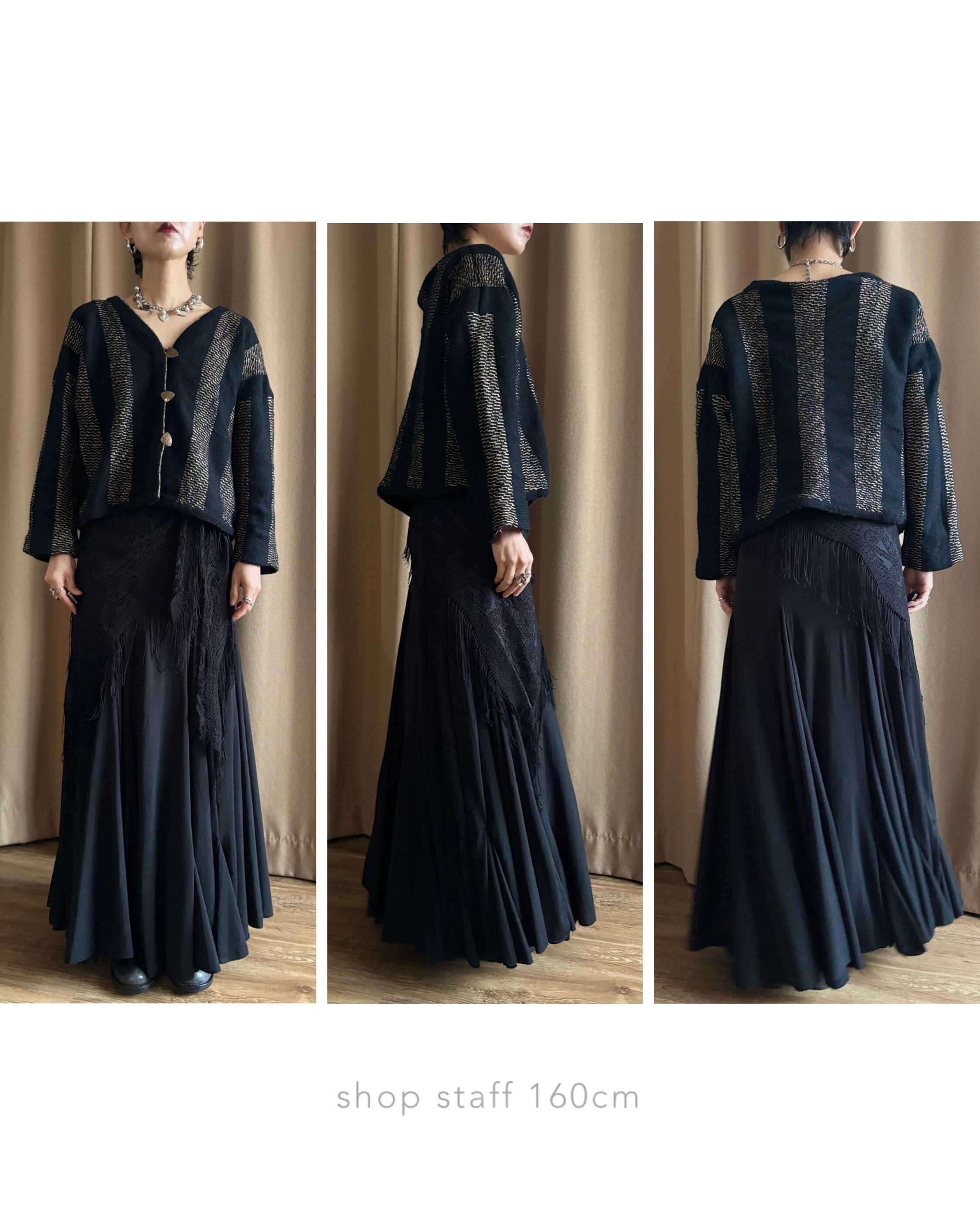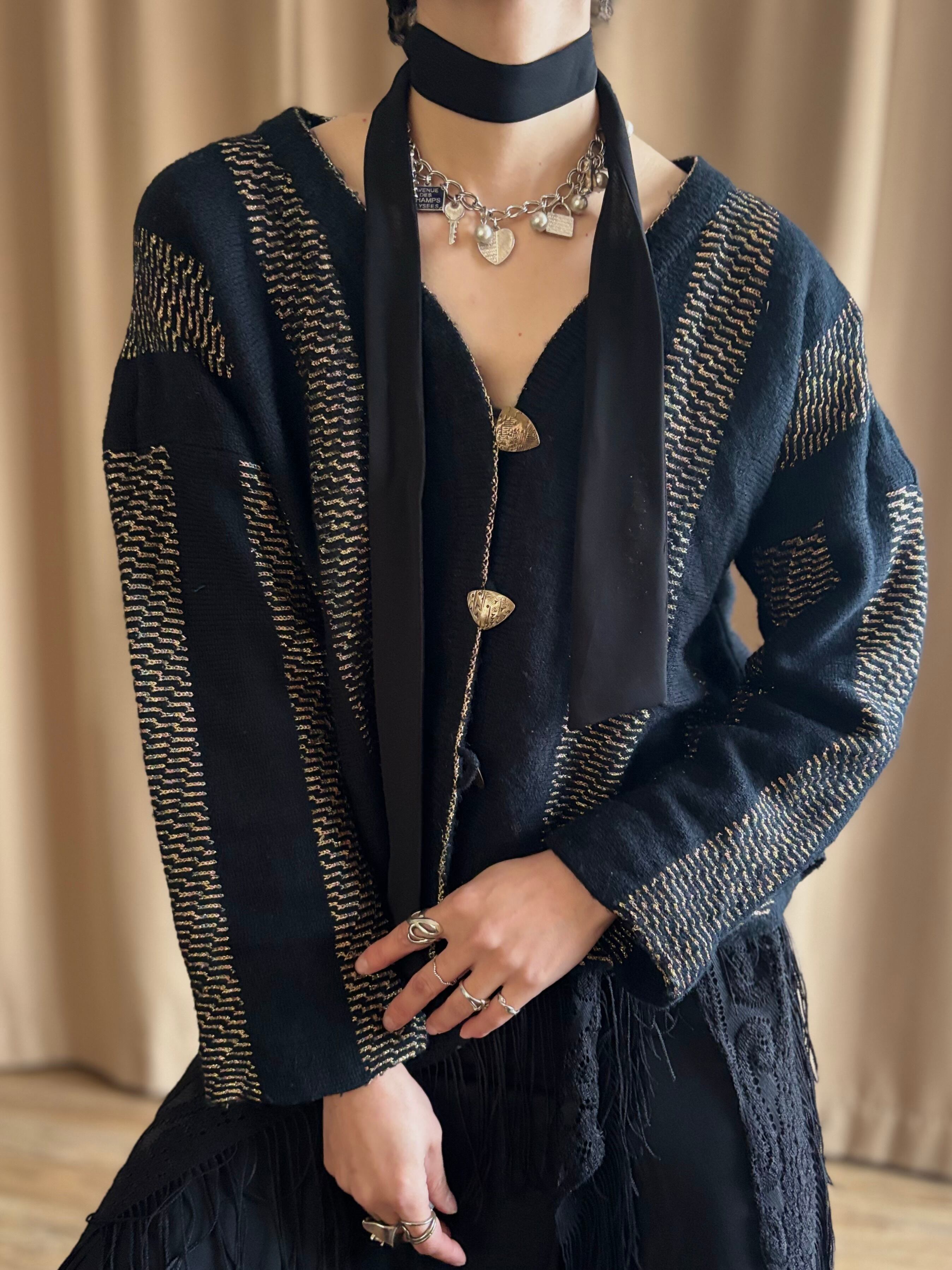 シックなブラックに、さりげなく煌めくラメ糸柄を織り込んだインポートニットカーディガン。