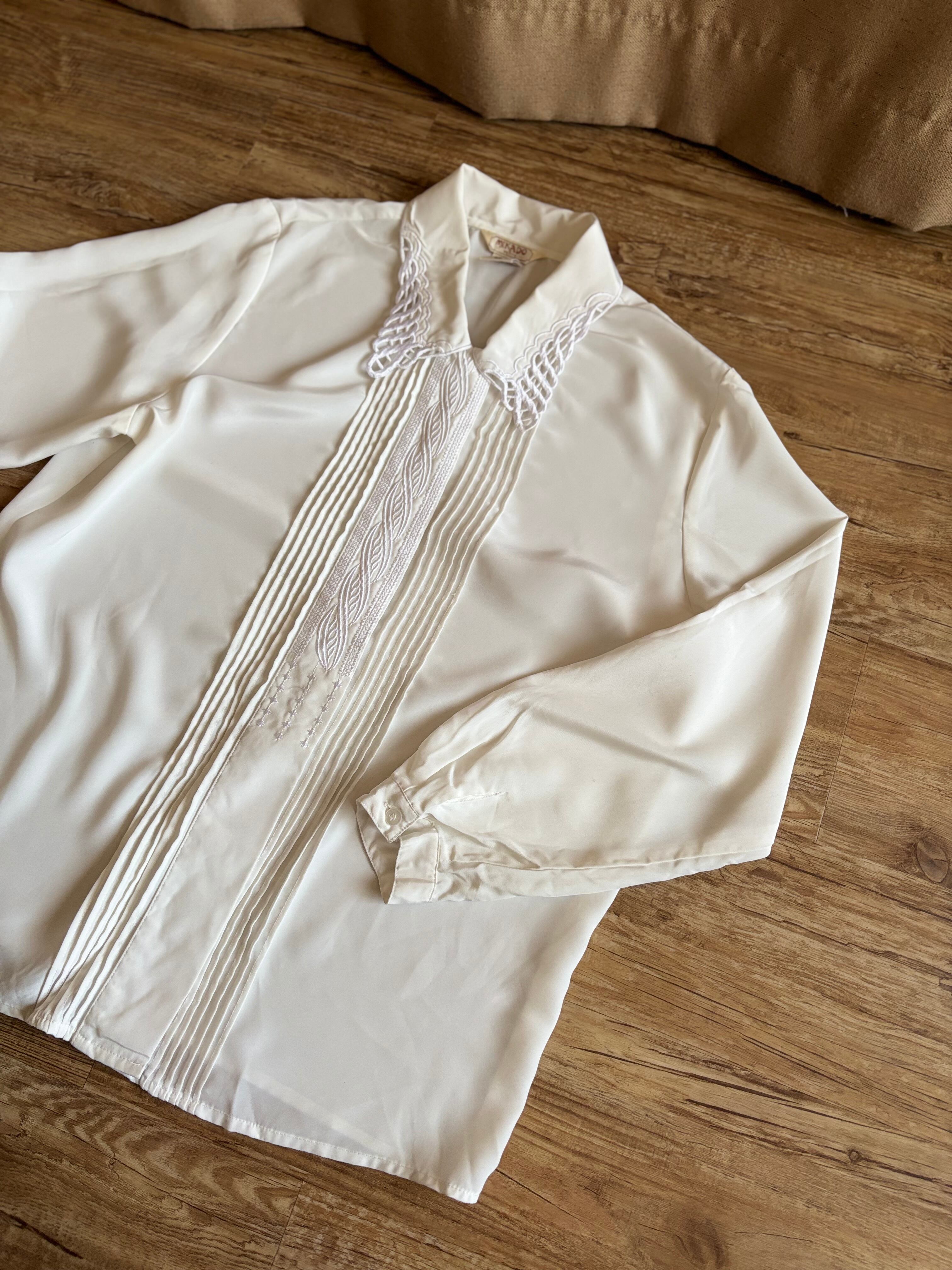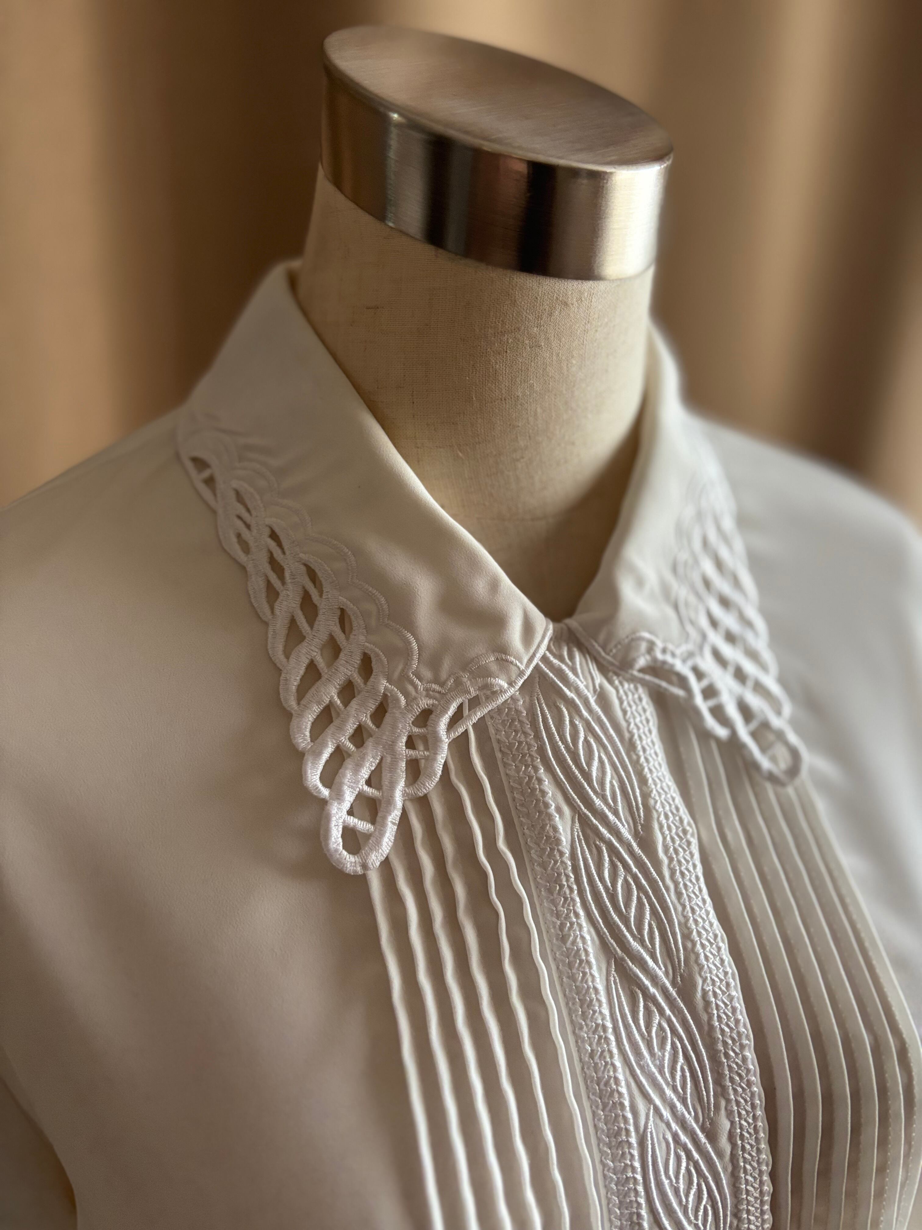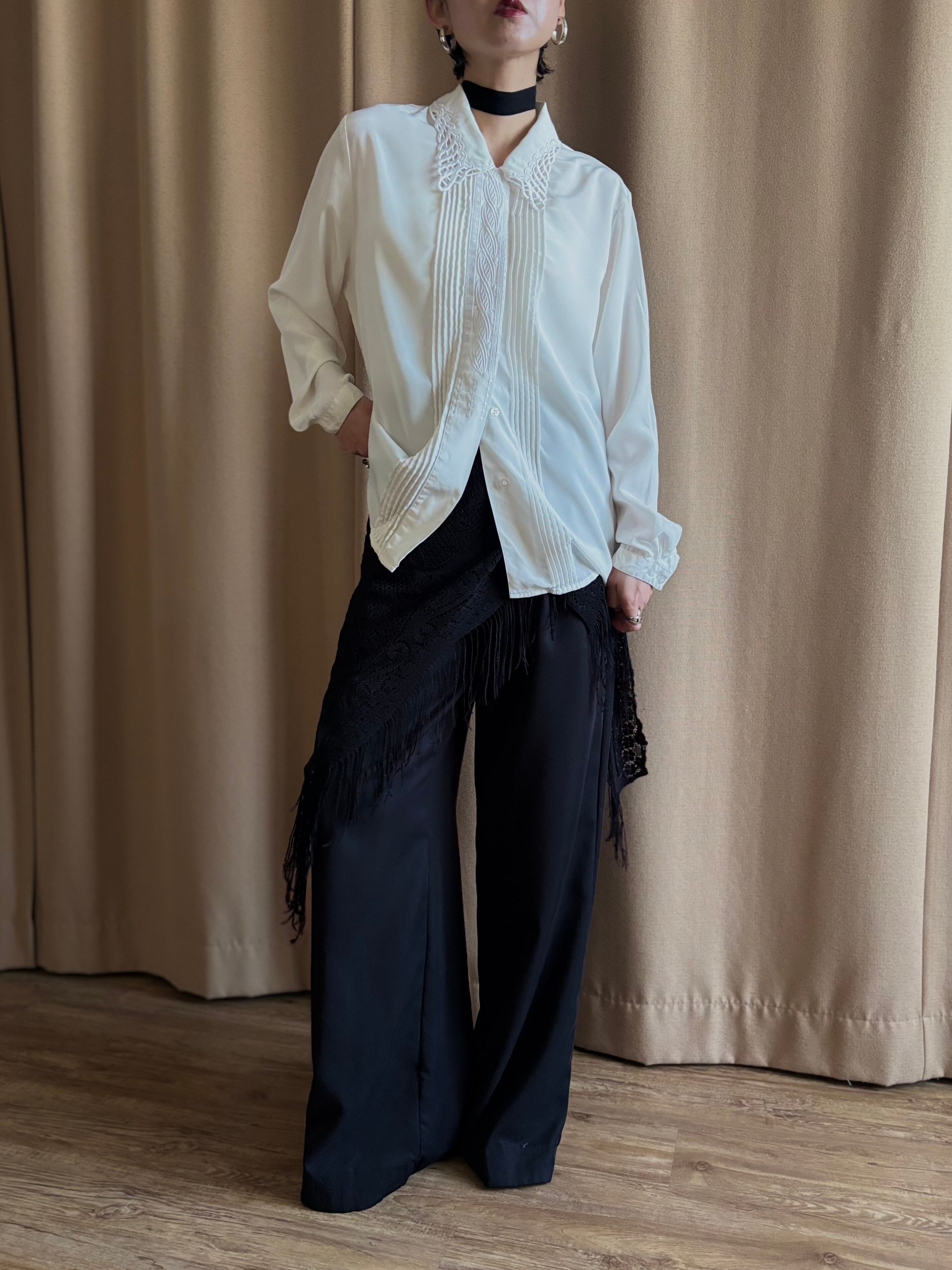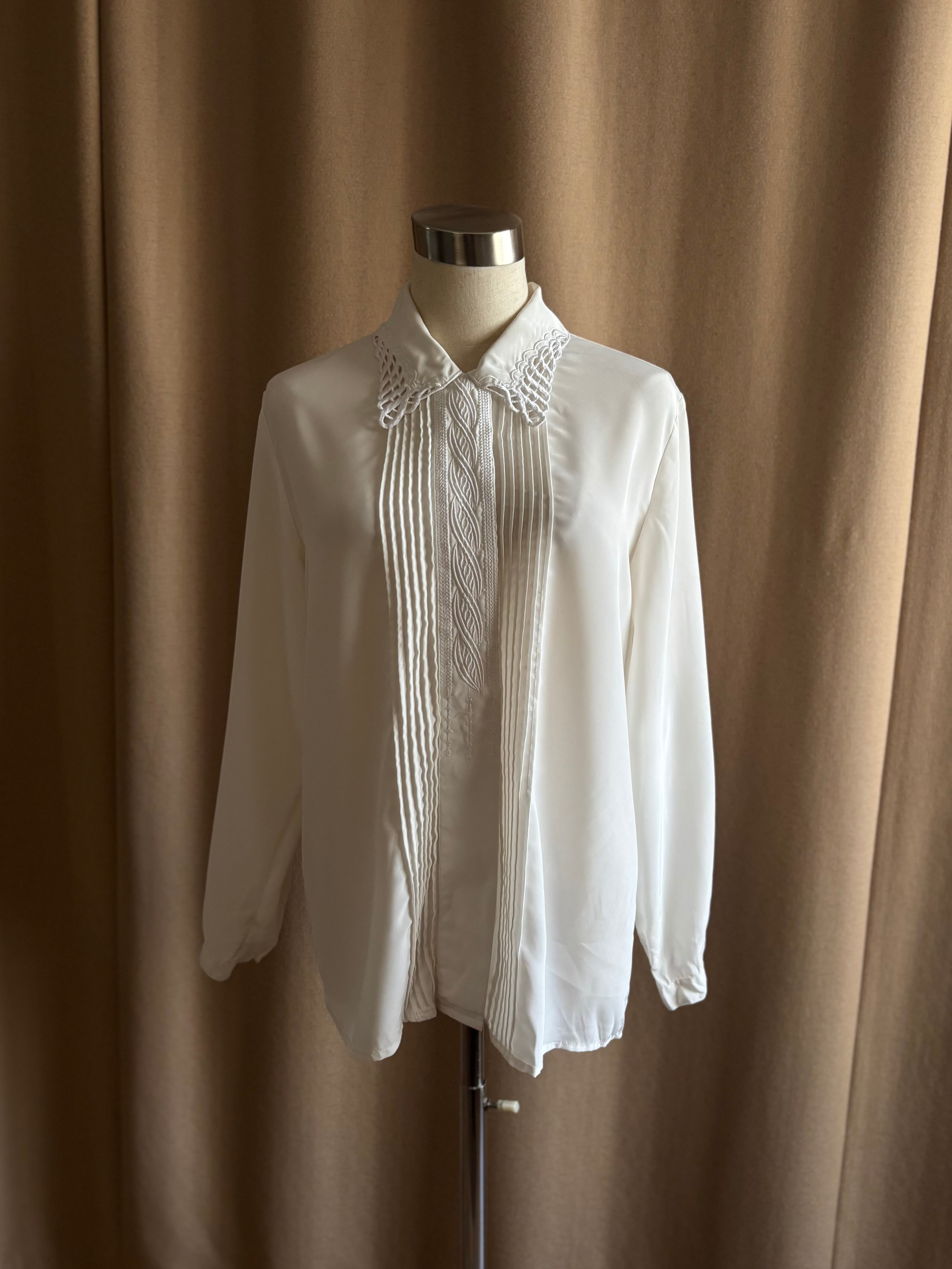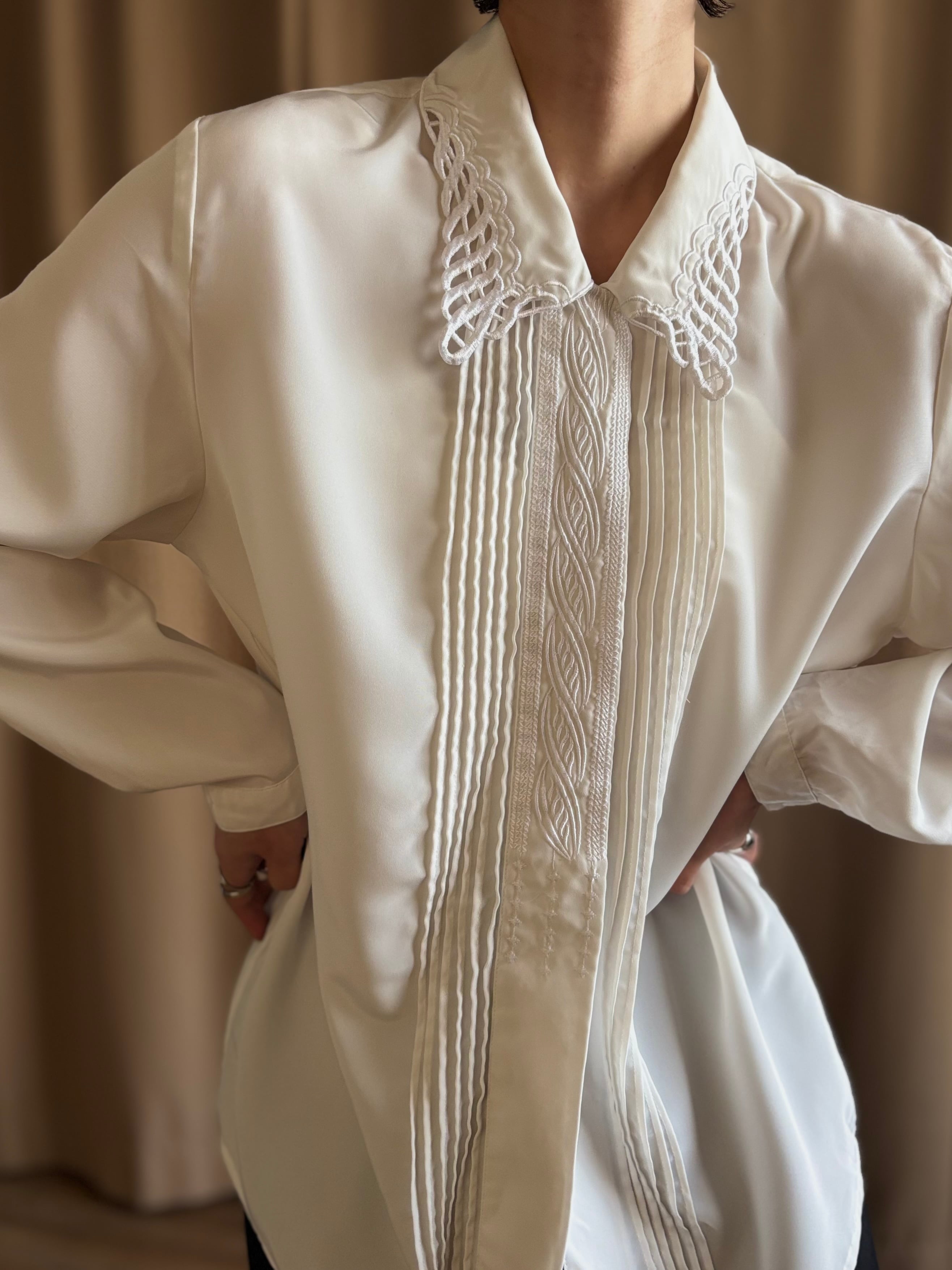 ミニマルなホワイトボディに、繊細なピンタックと立体的なレースディテールを施したインポートシャツ。