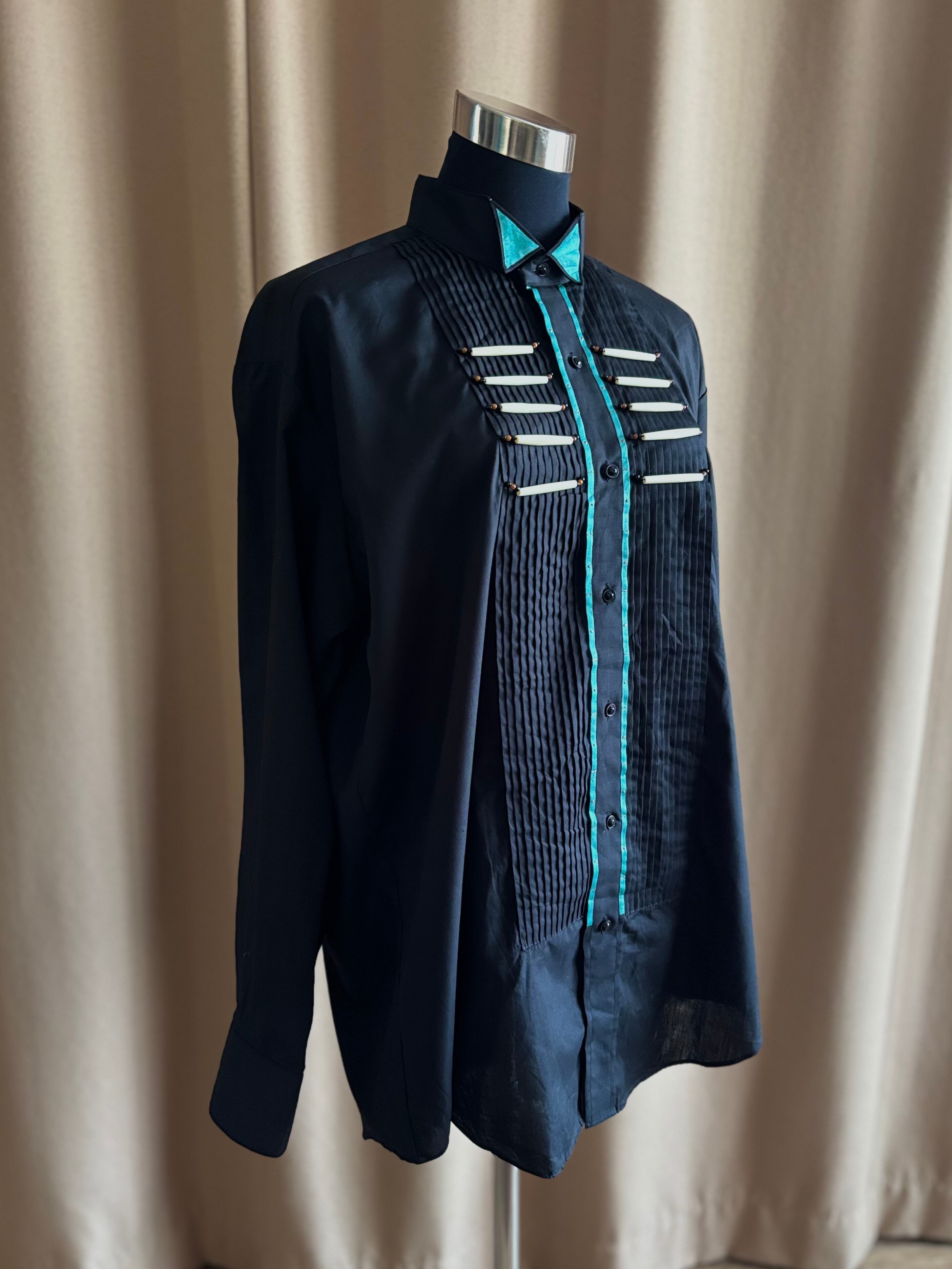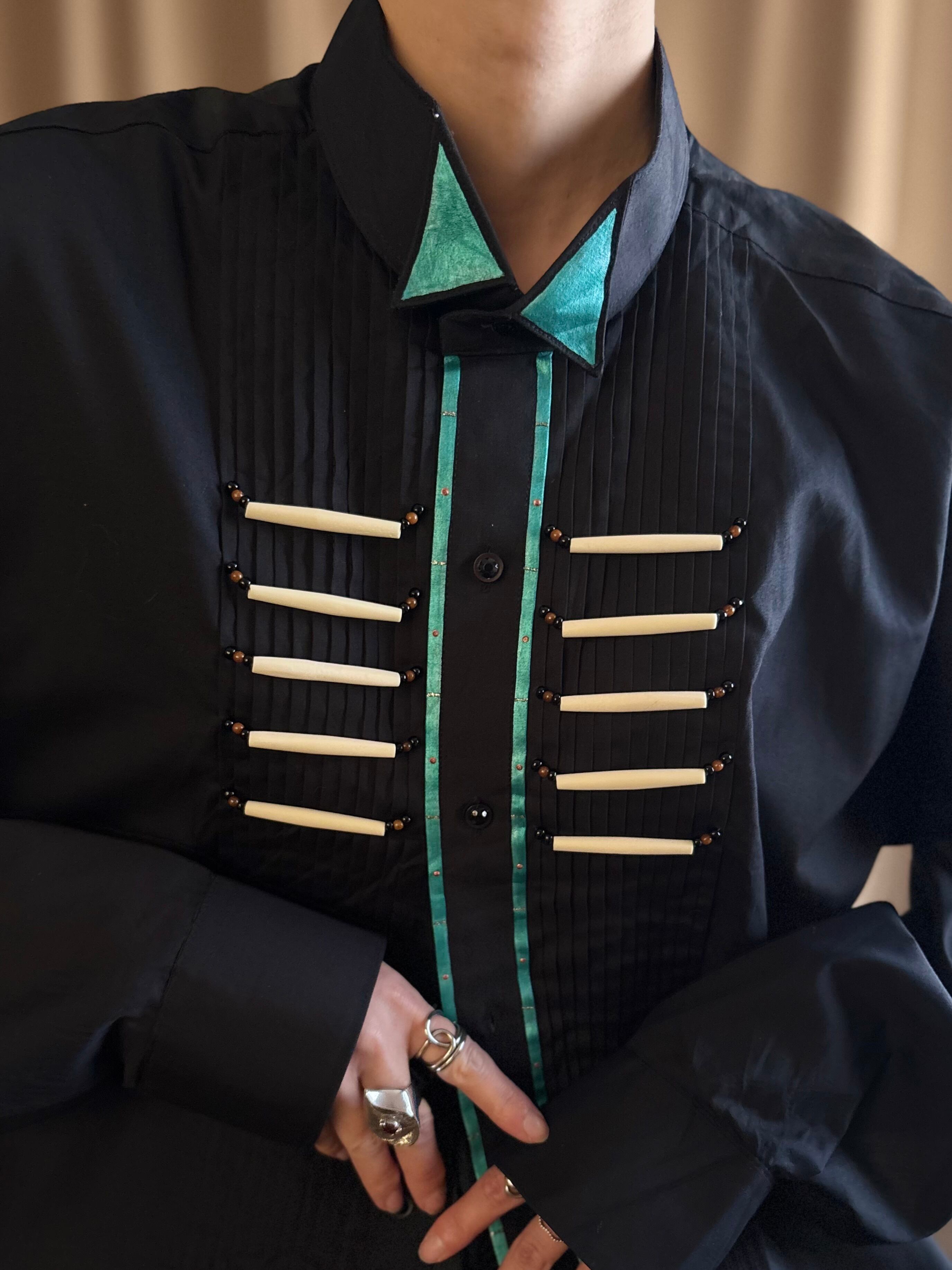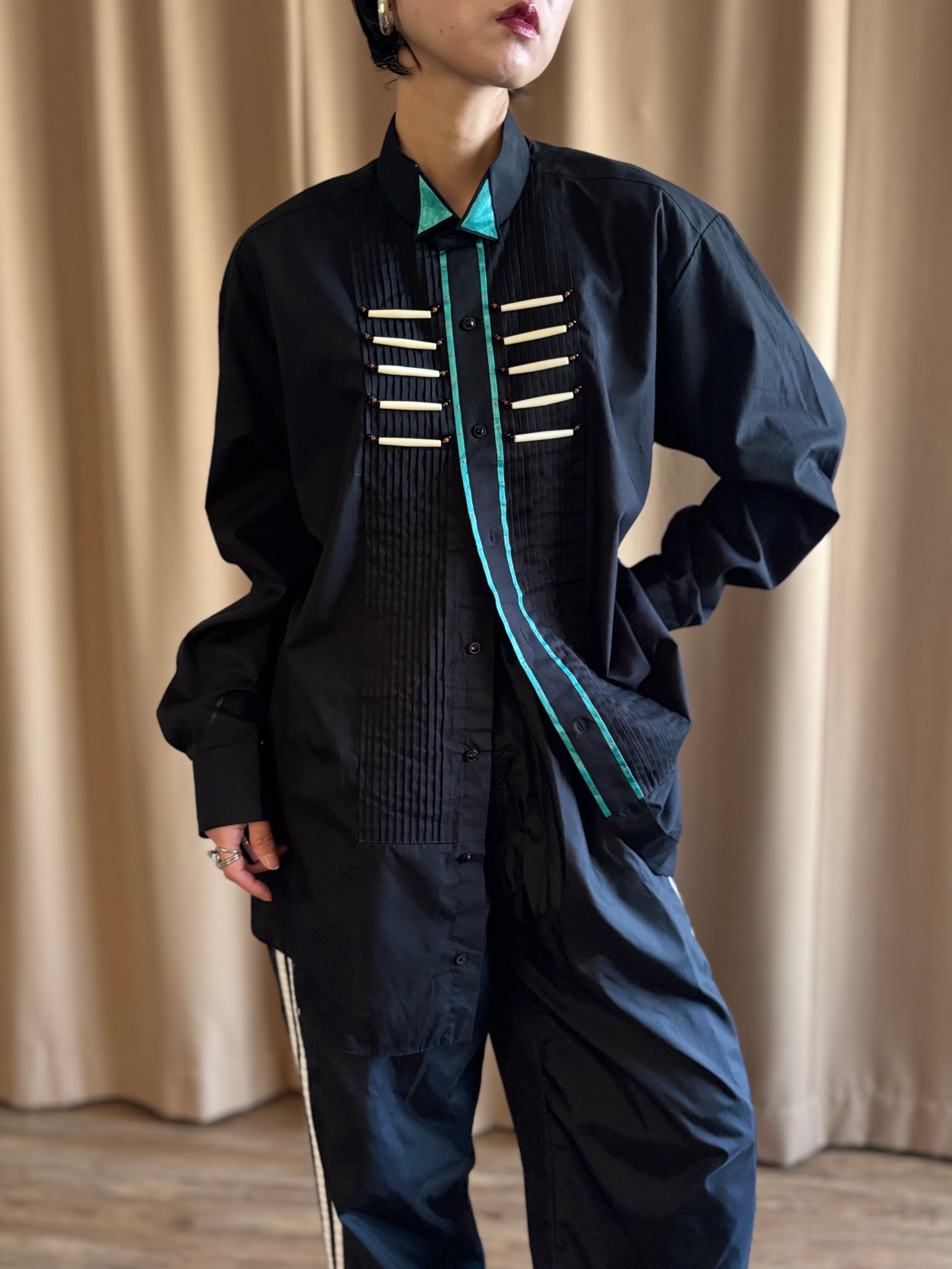 深みのあるブラックボディに、手作業で装飾された胸元のビーズ使いが斬新な逸品。