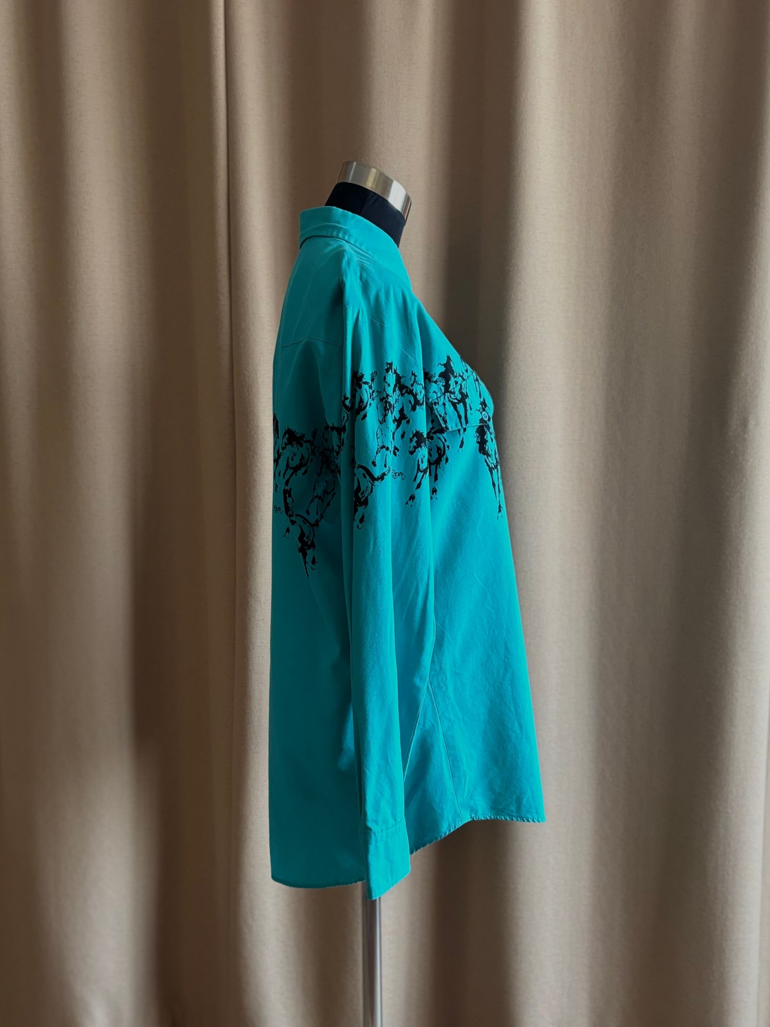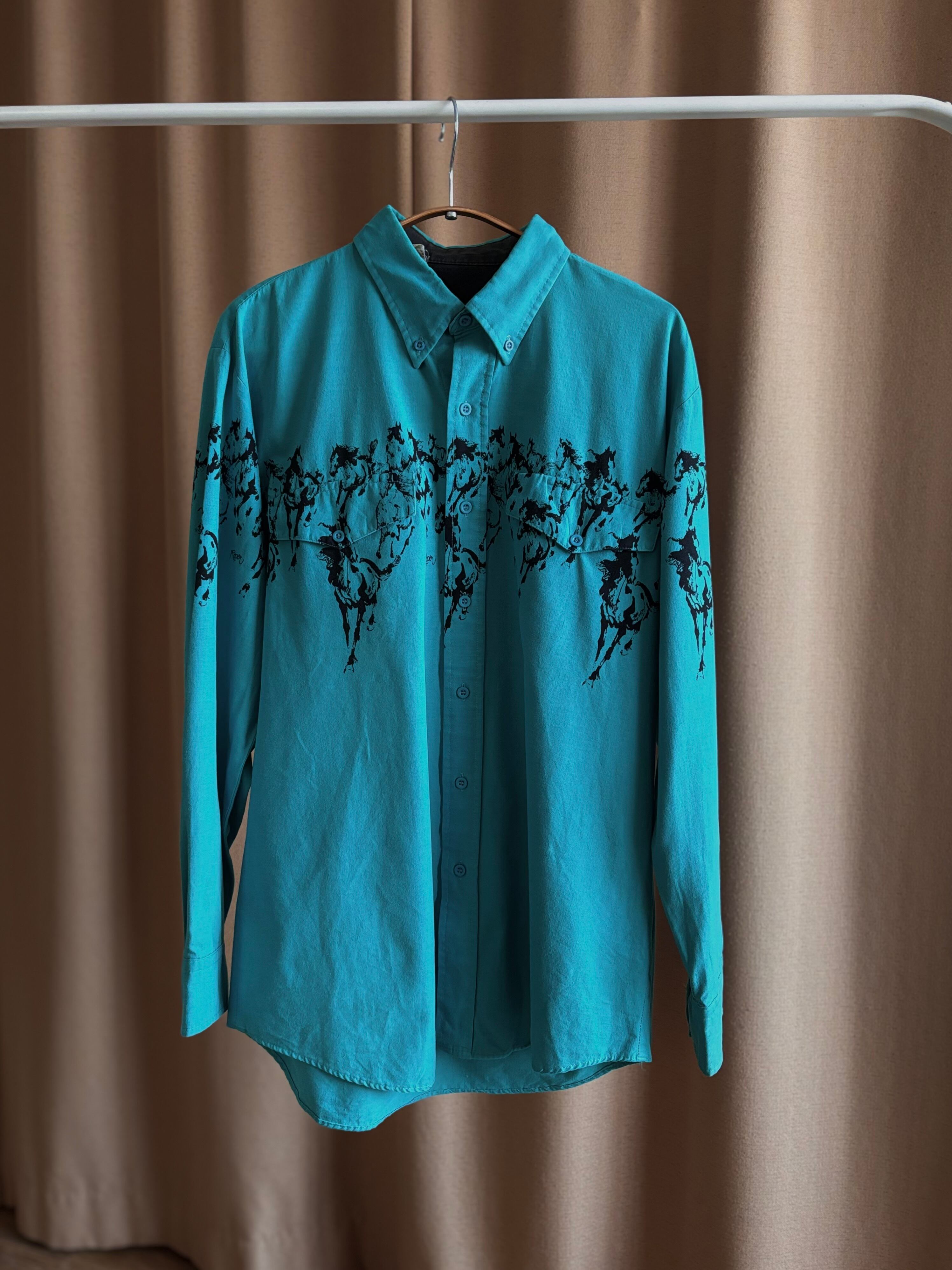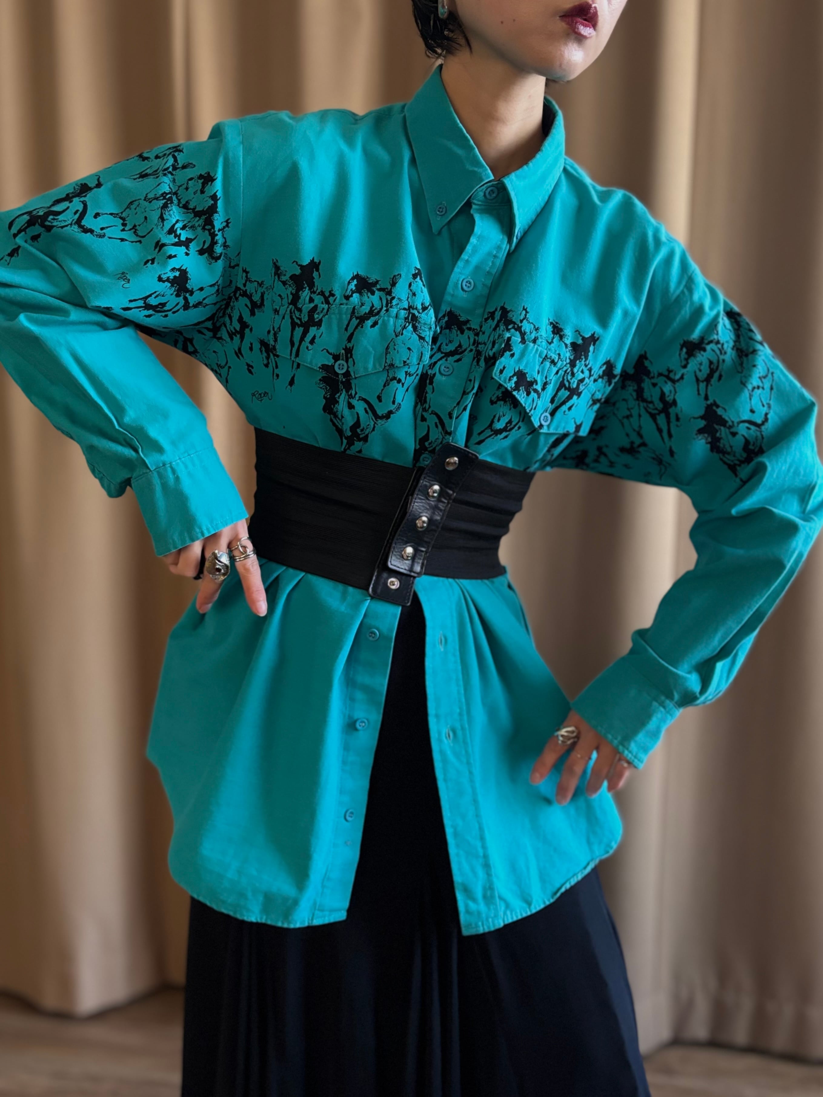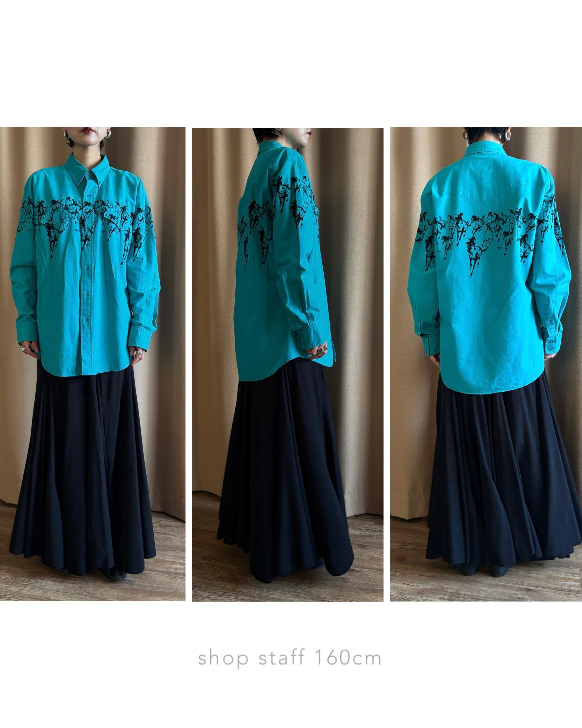 フロントからバックへと大胆に走るホースモチーフが印象的なヴィンテージシャツ。