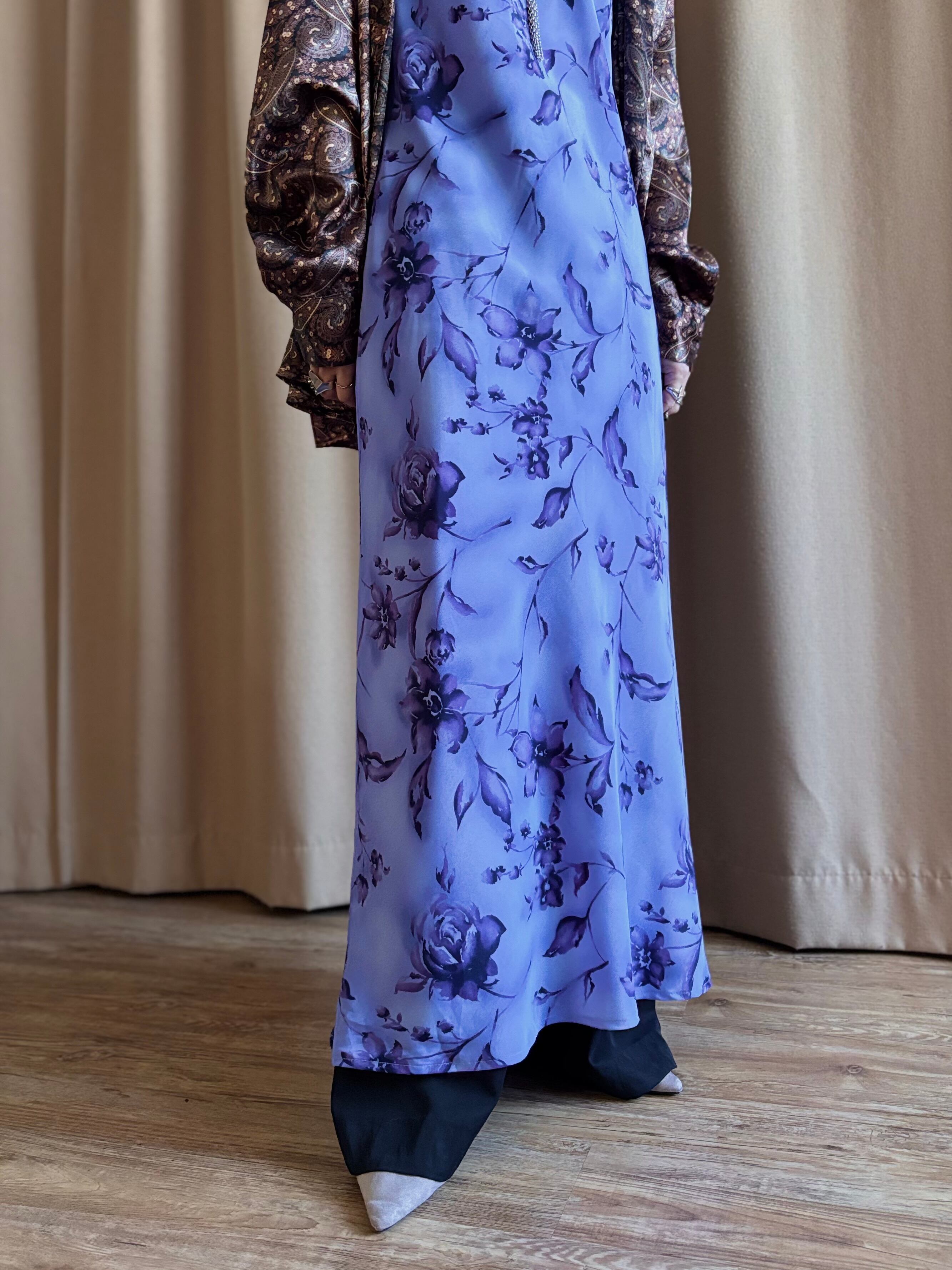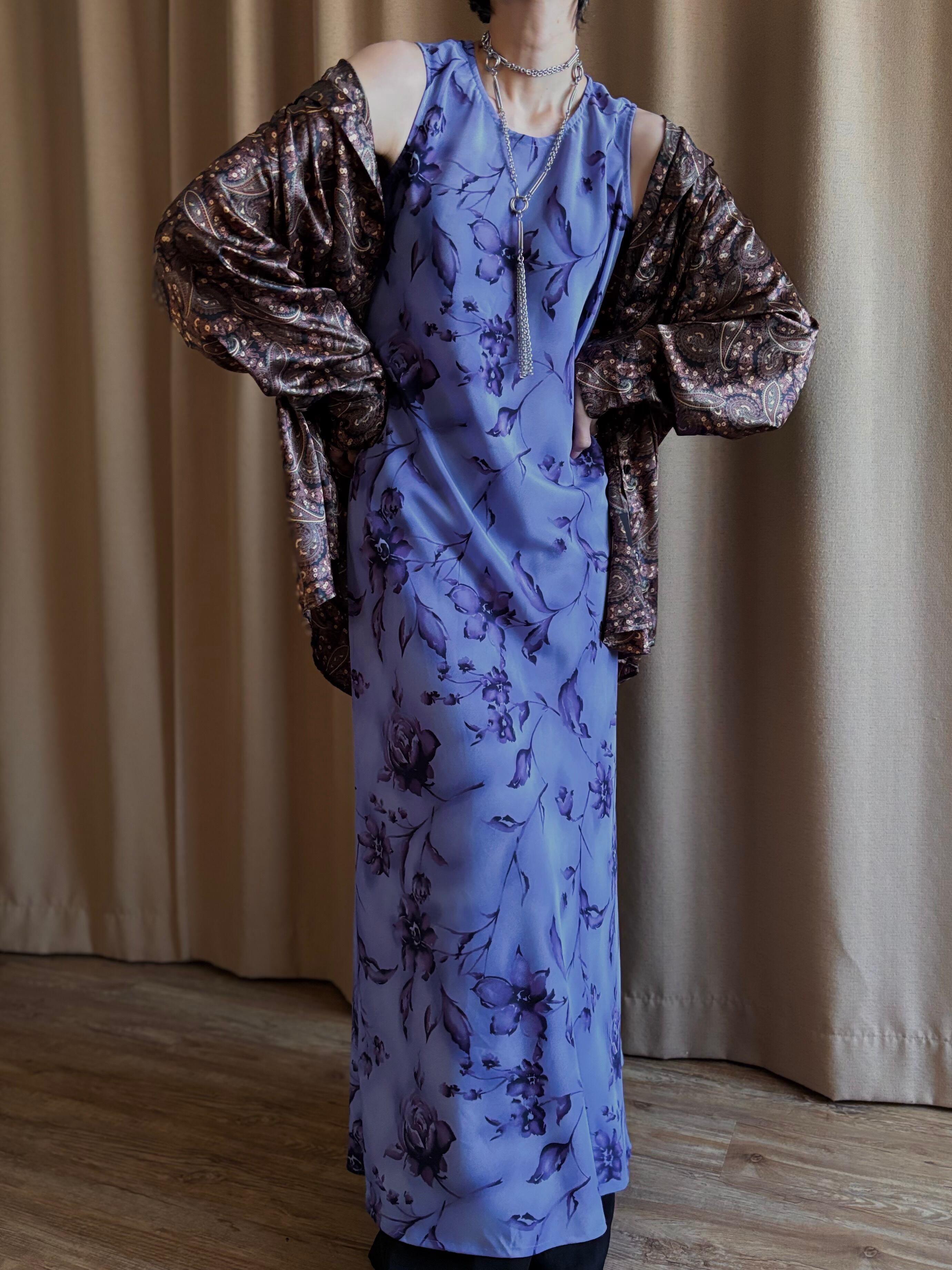 淡いパープルのトーンにシックな花柄が重なり、華やかさの中にも落ち着いた大人のムードを感じさせるアートな逸品。