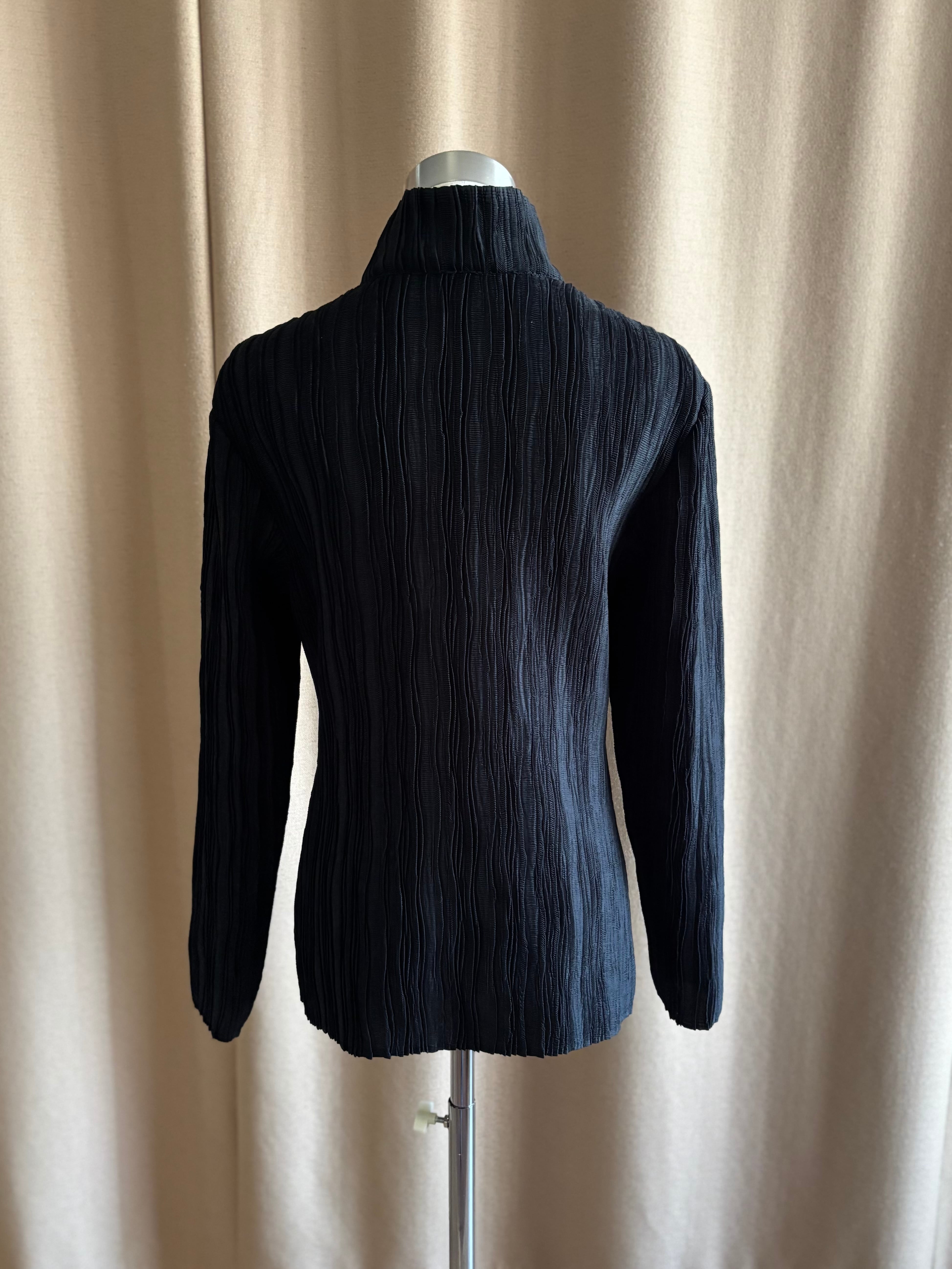 細かなプリーツのような生地が奥行きのある表情を生み、シンプルながらも存在感のある一着に。