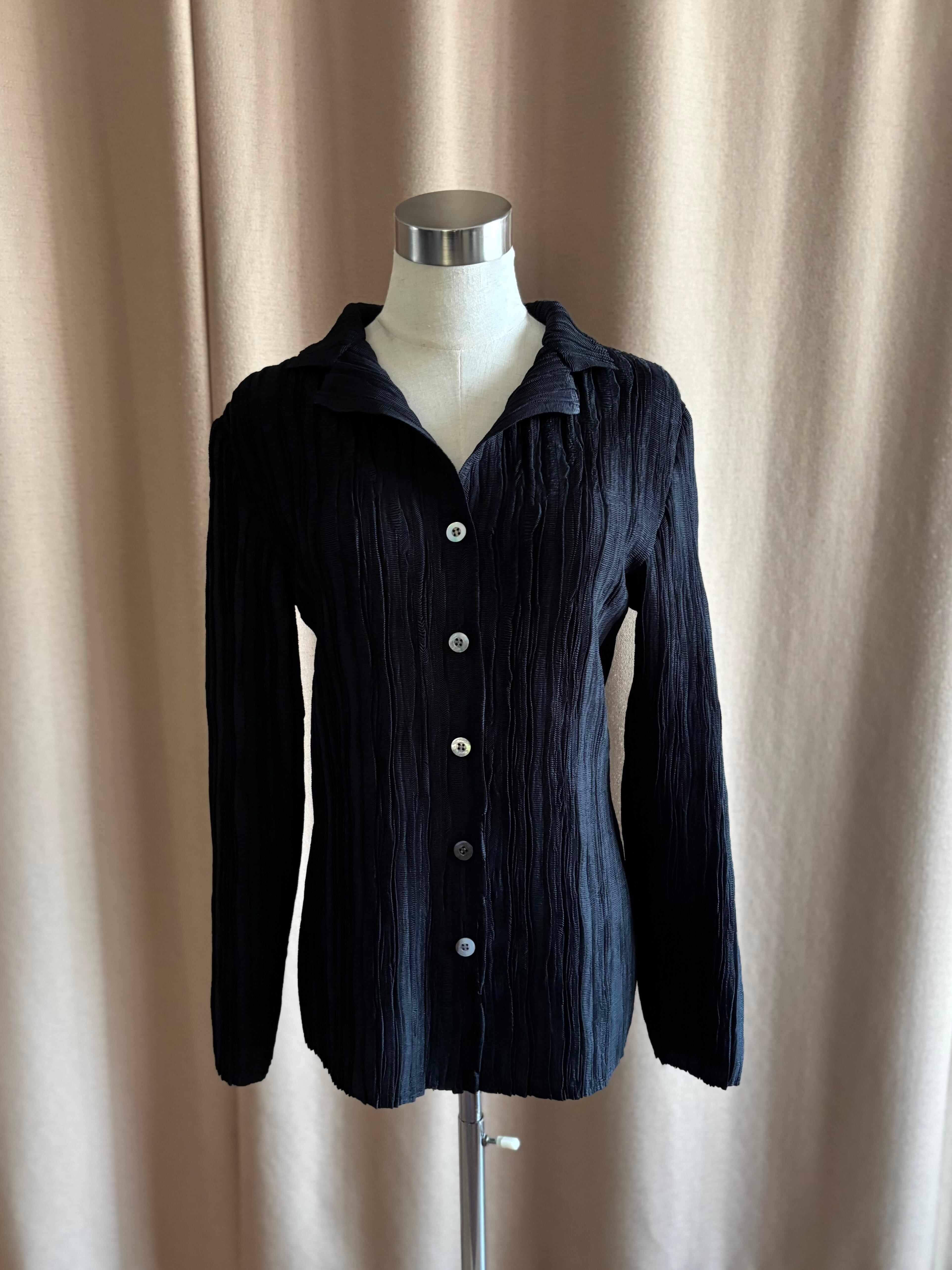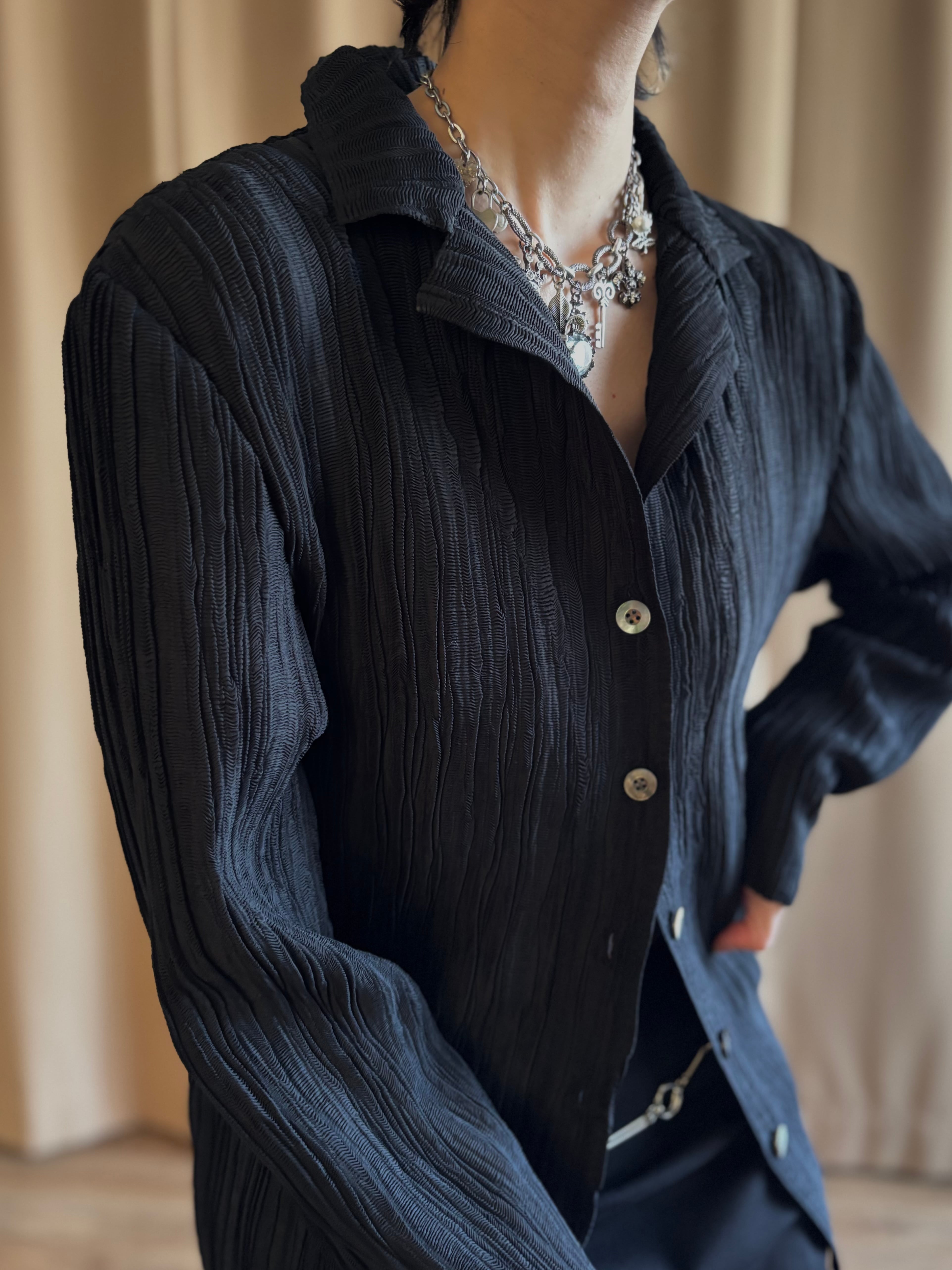 立体的なテクスチャーがモードさ引き立つブラックシャツ。