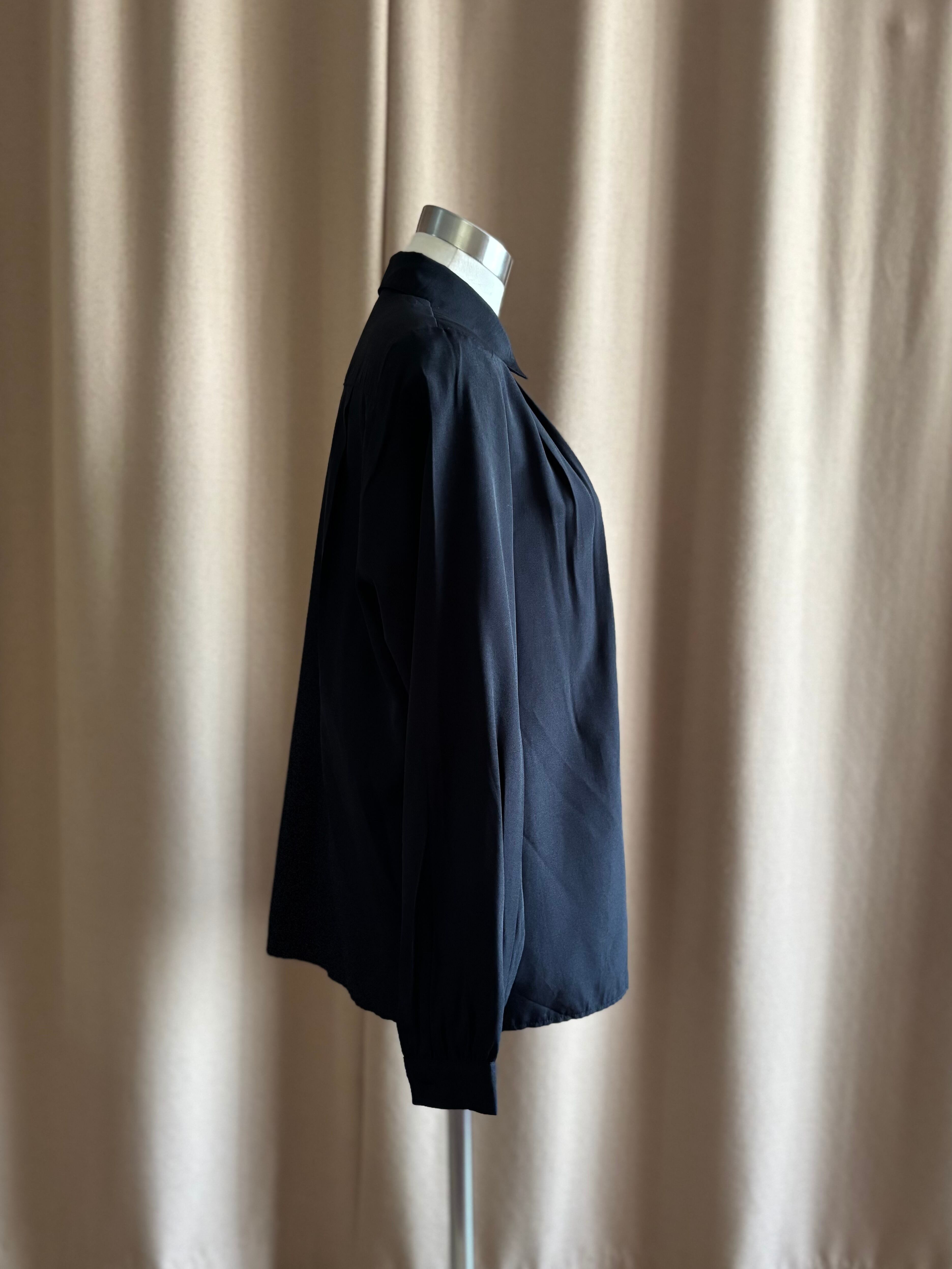 肩パッド入りのパワーショルダーと、フロントに施されたタックが立体的なシルエットを生み、モードな存在感を放ちます。