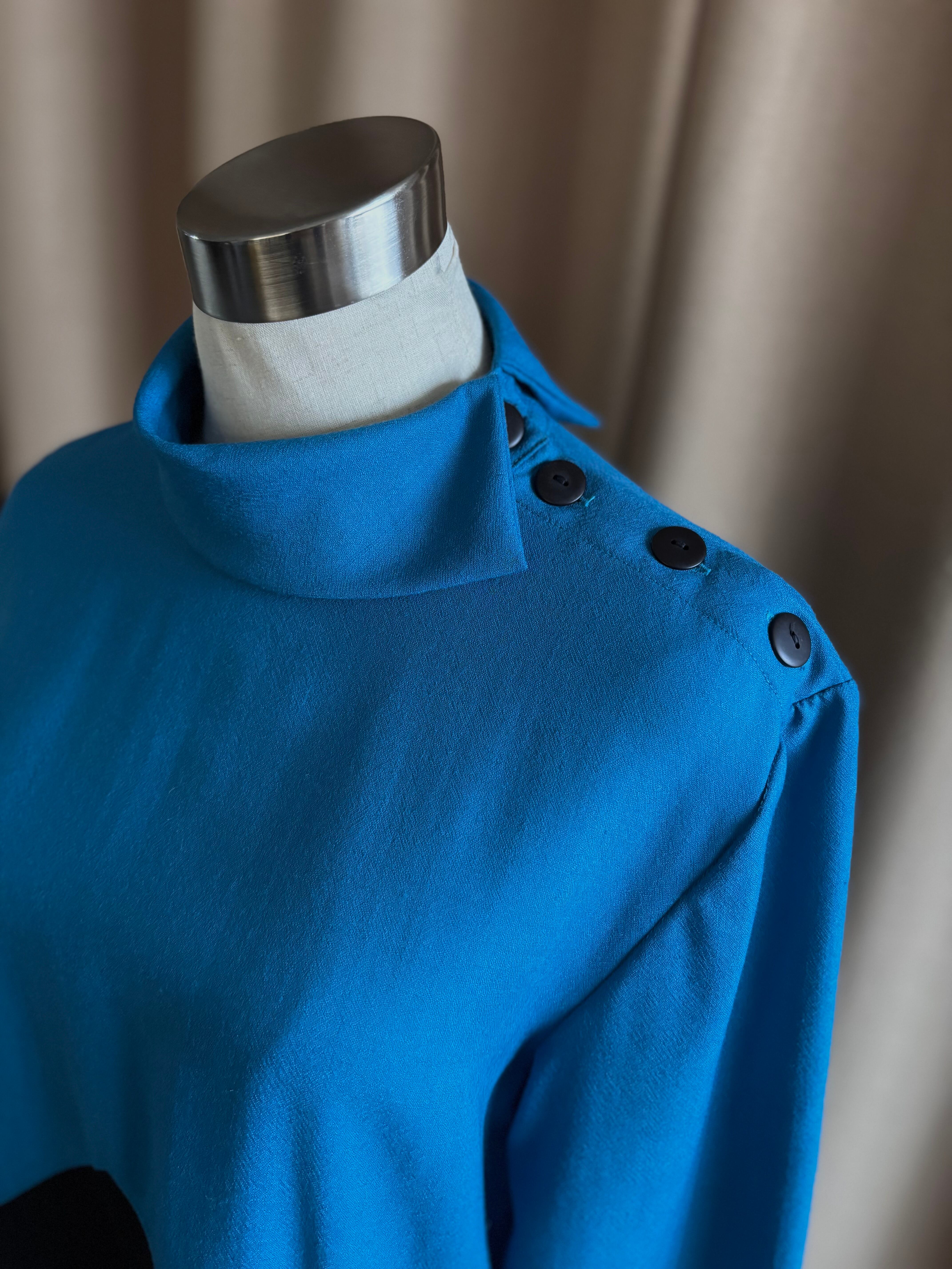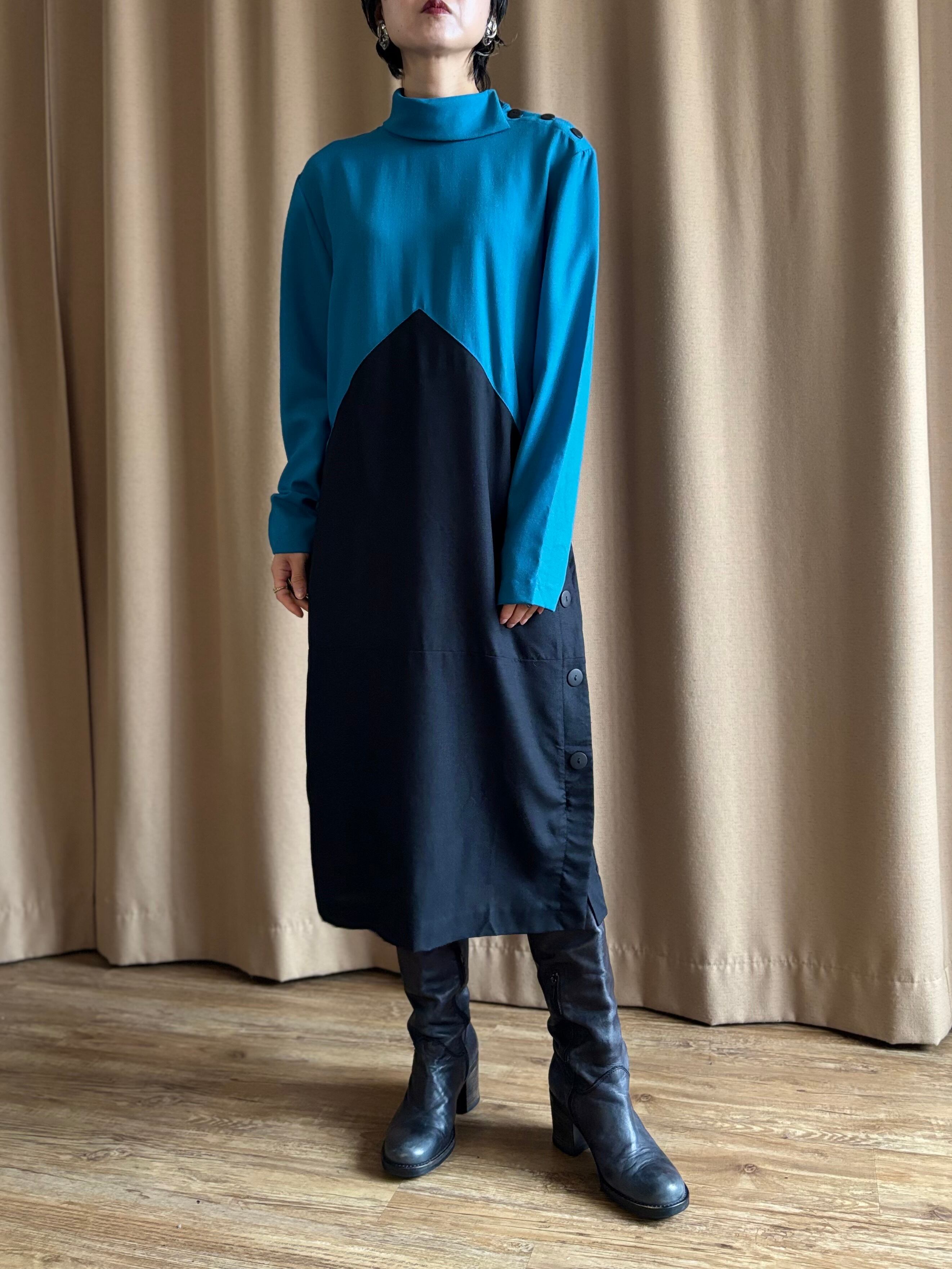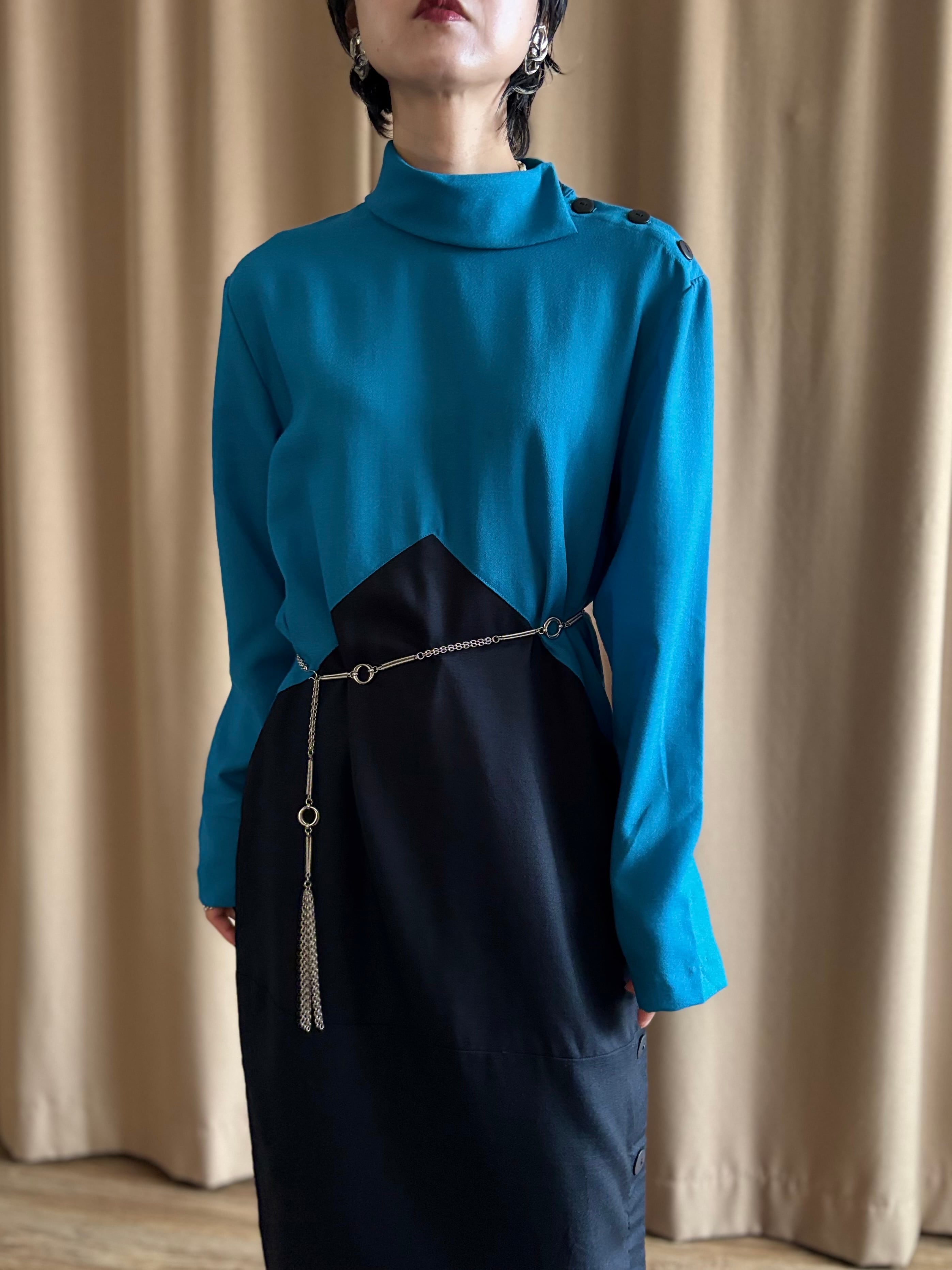 鮮やかなブルーとブラックの大胆なバイカラーに、ふんわりと柔らかなハイネックディテール。