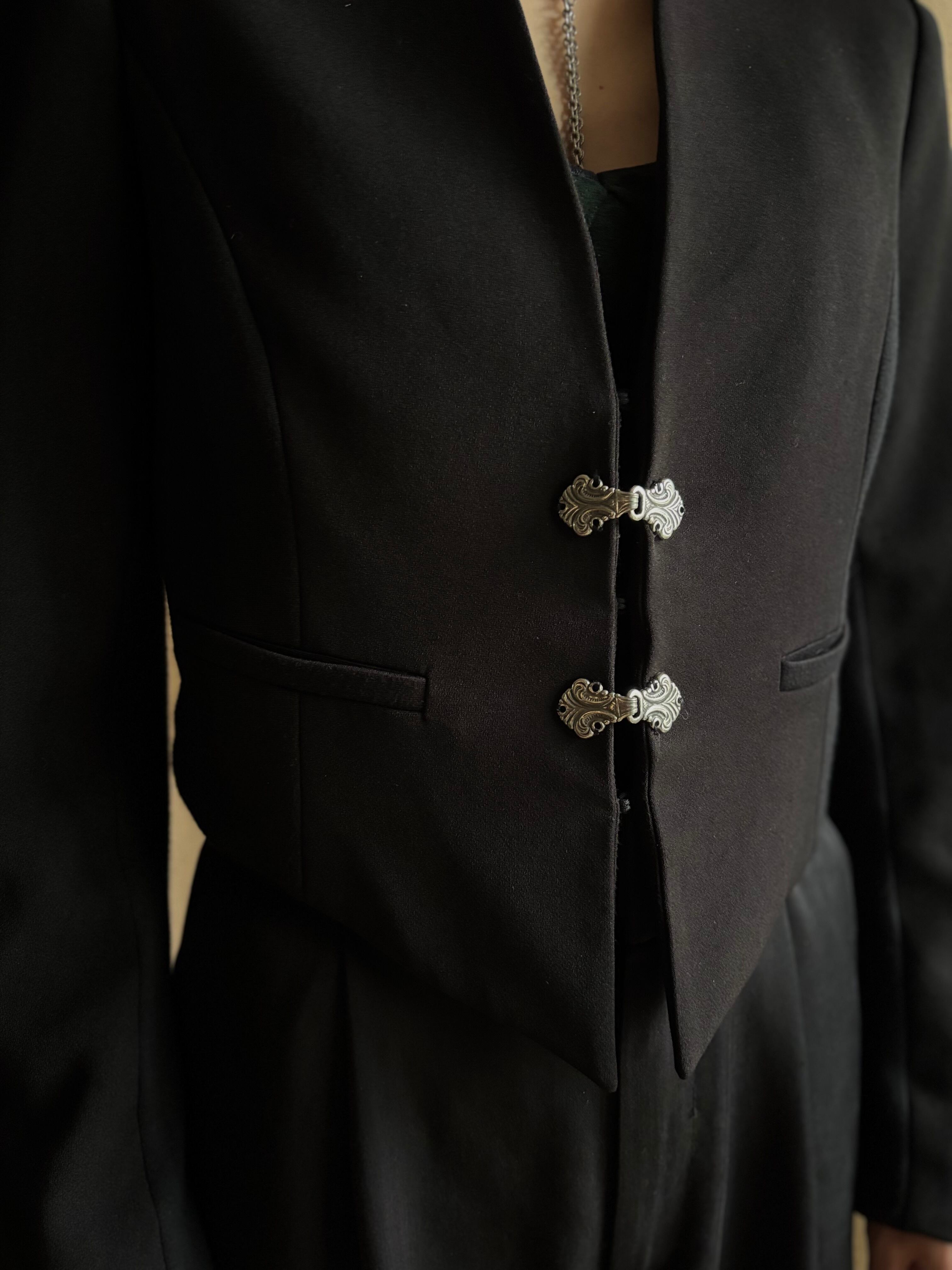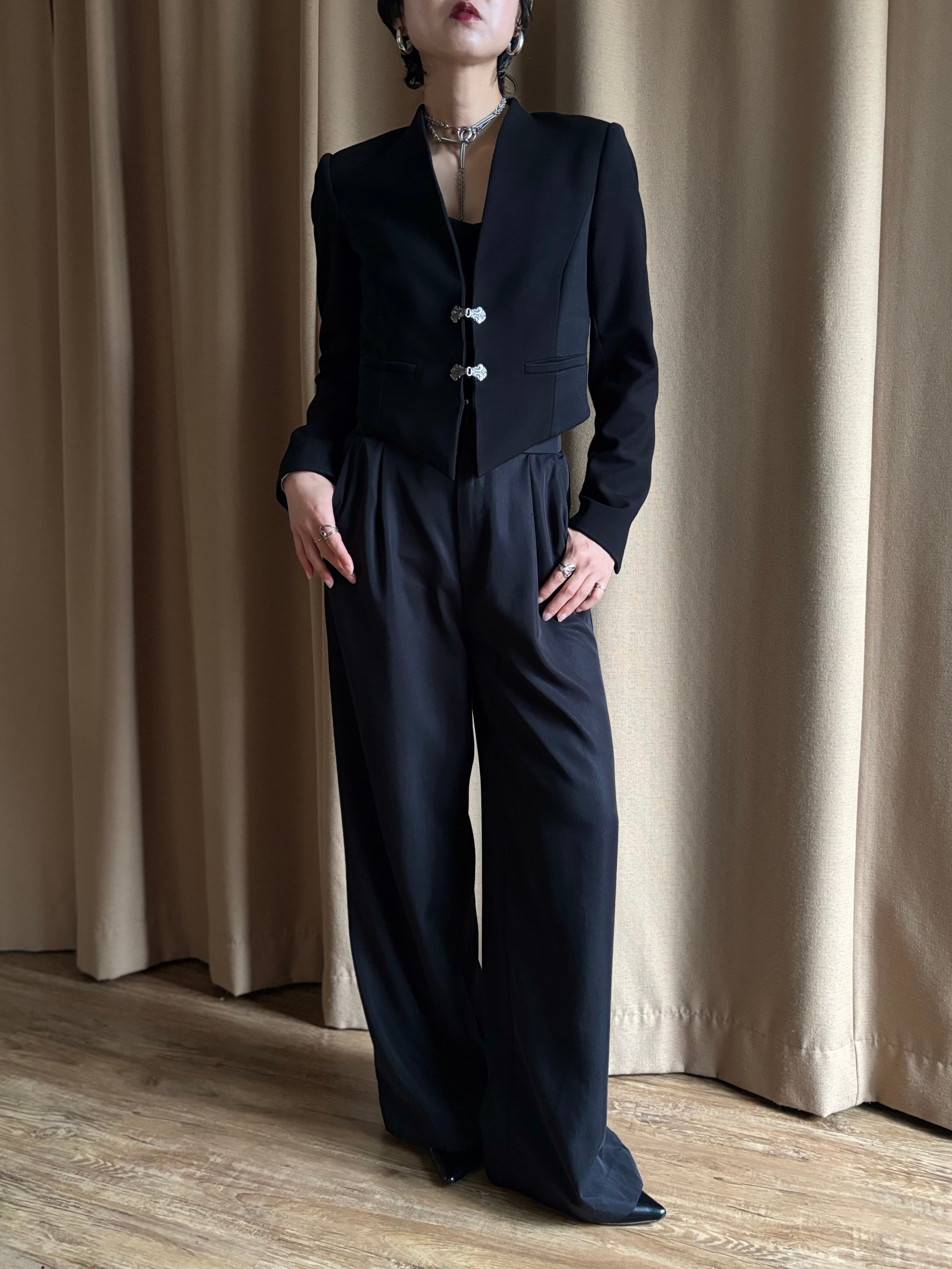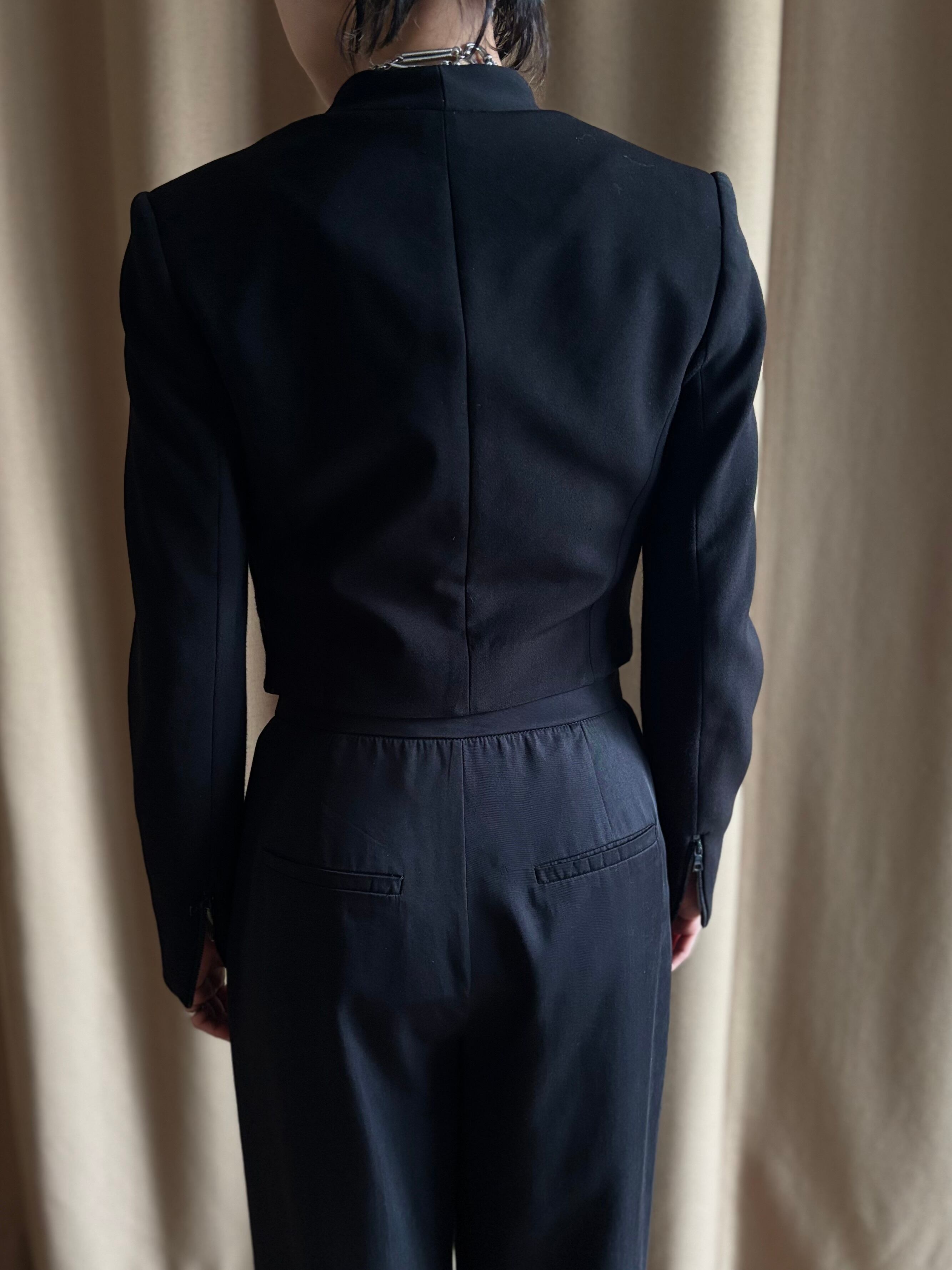 緊張感のあるショート丈、パワーショルダーの計算尽くされたモードなシルエットバランス。