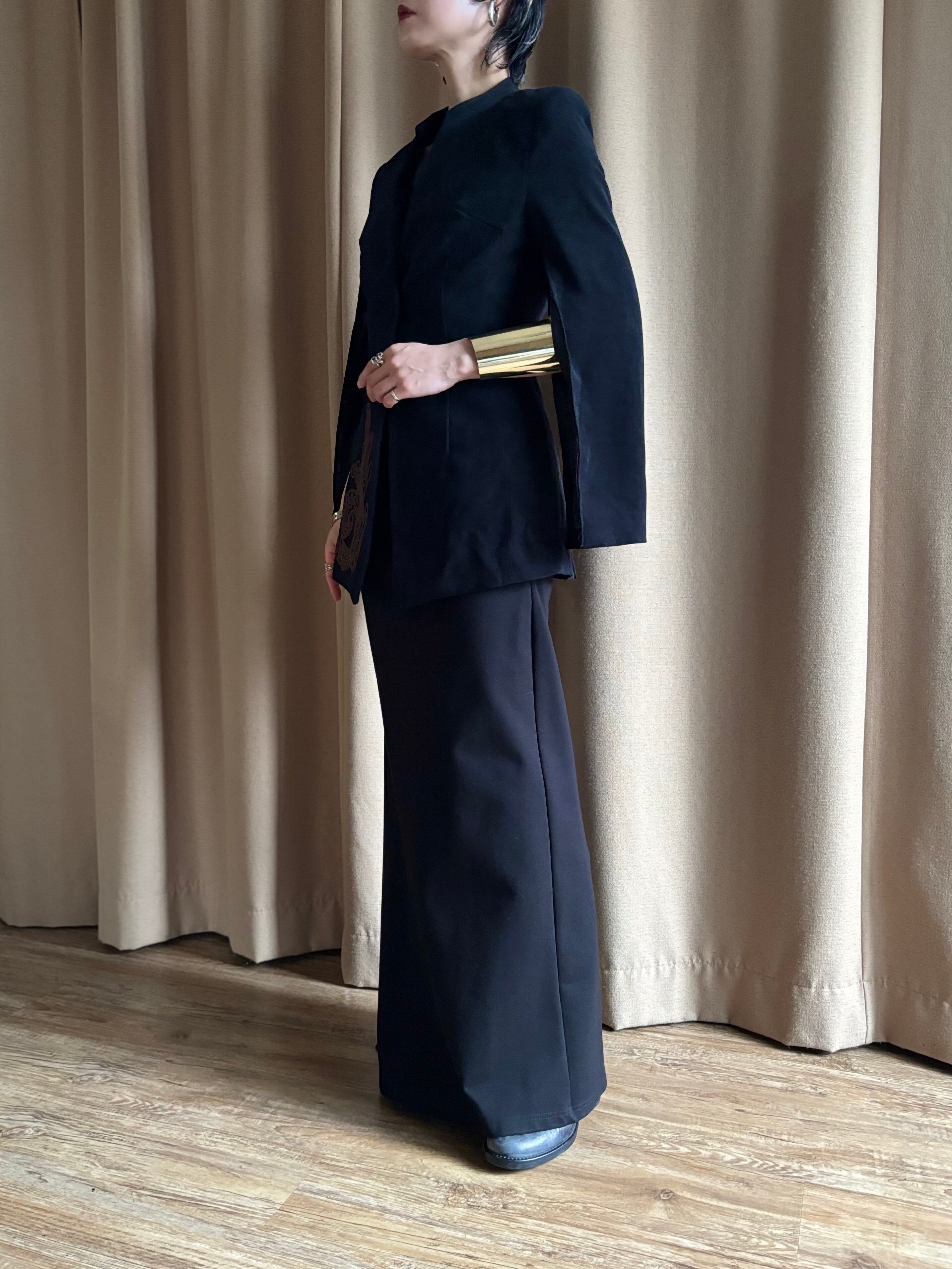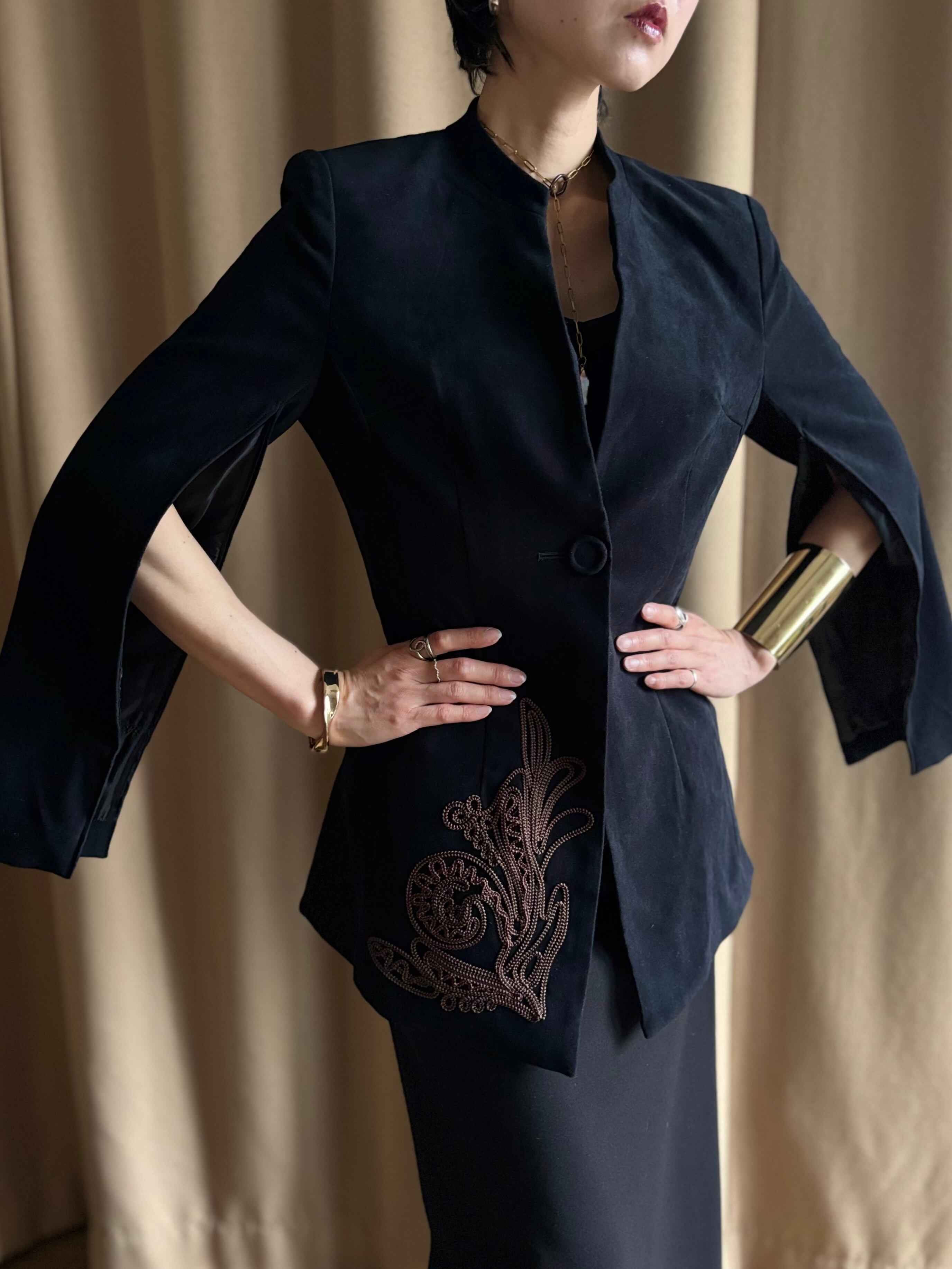 右裾には立体的なブレード刺繍柄をあしらい、静かな中に奥行きと存在感をプラス。