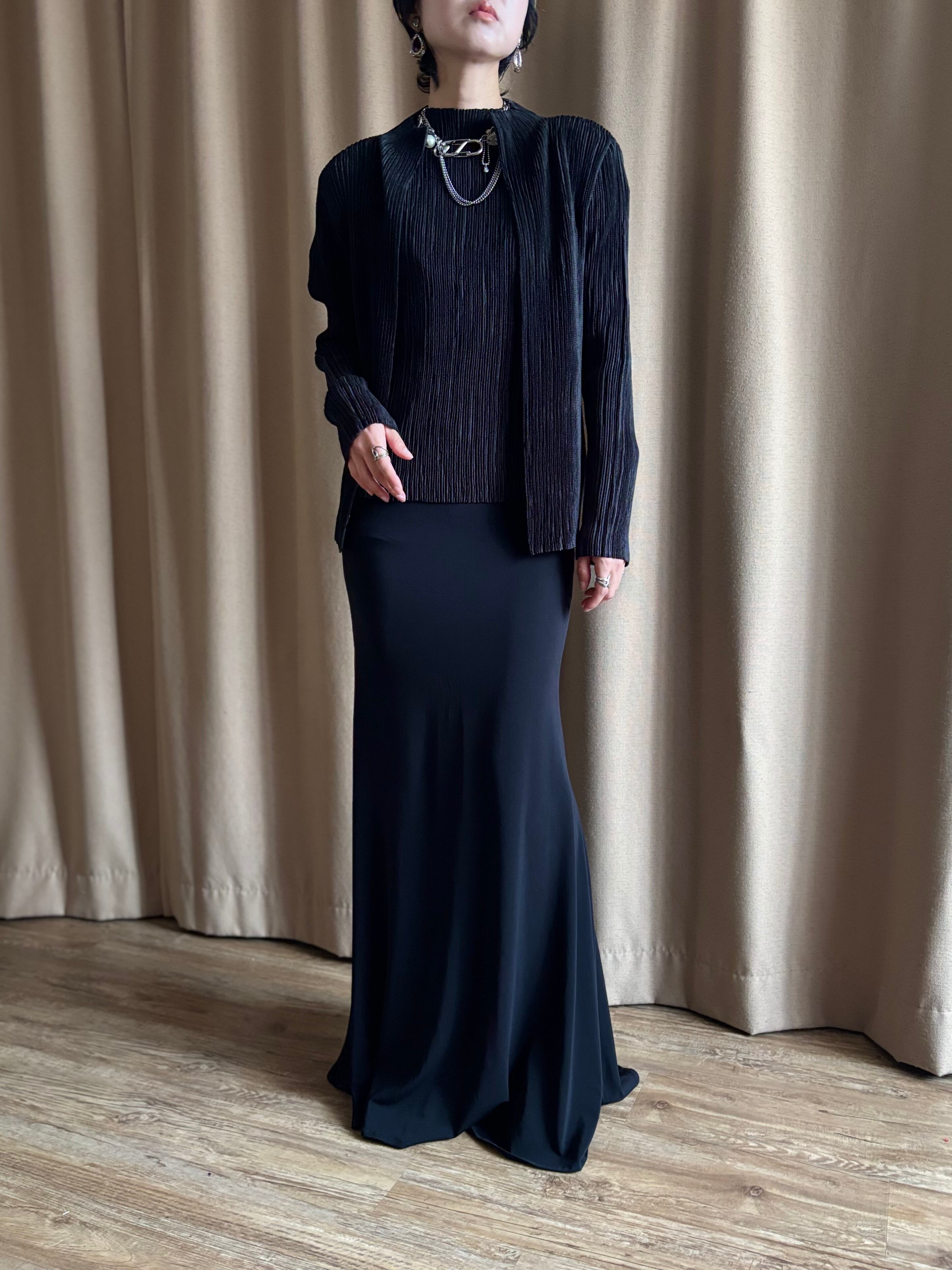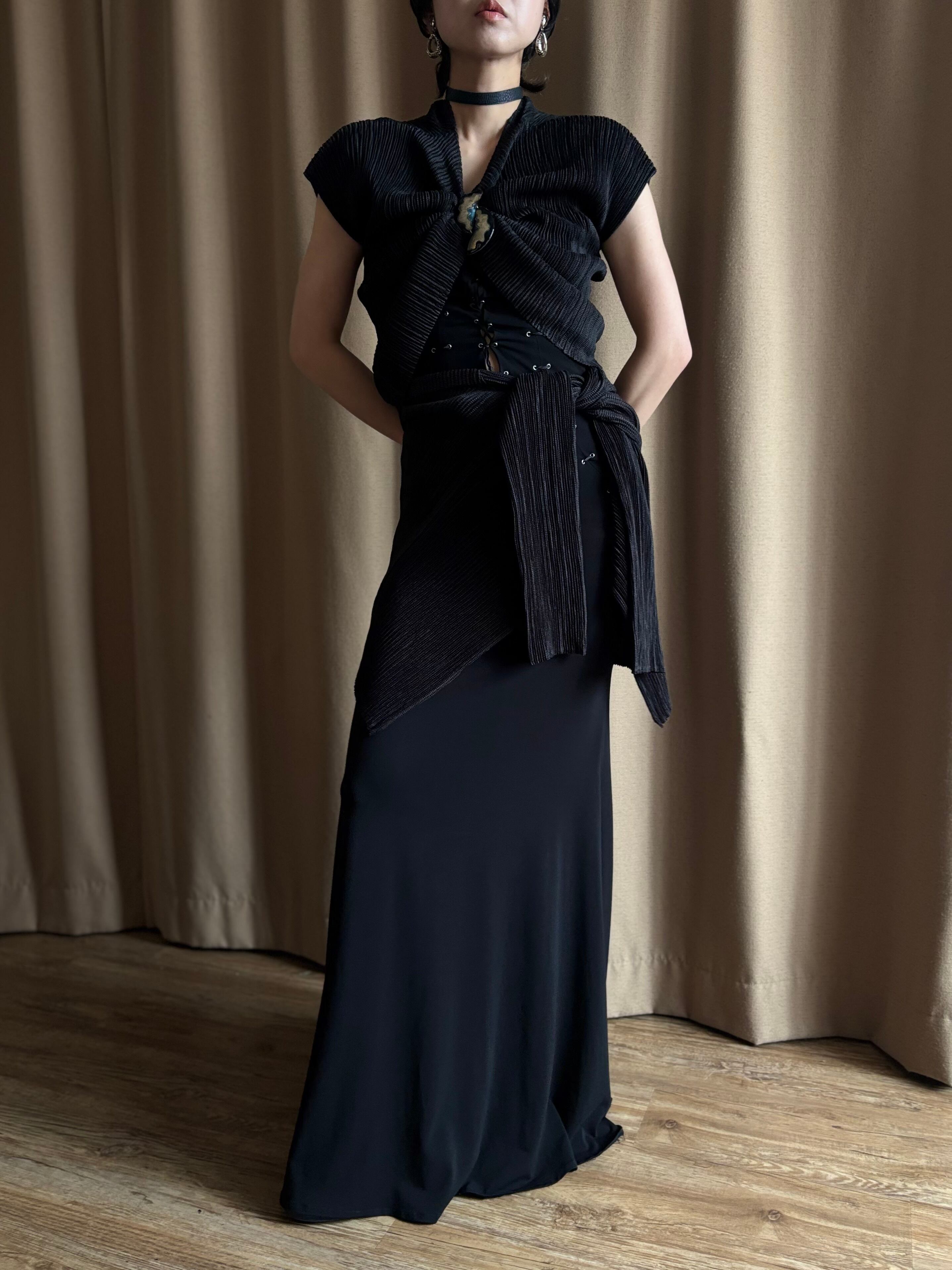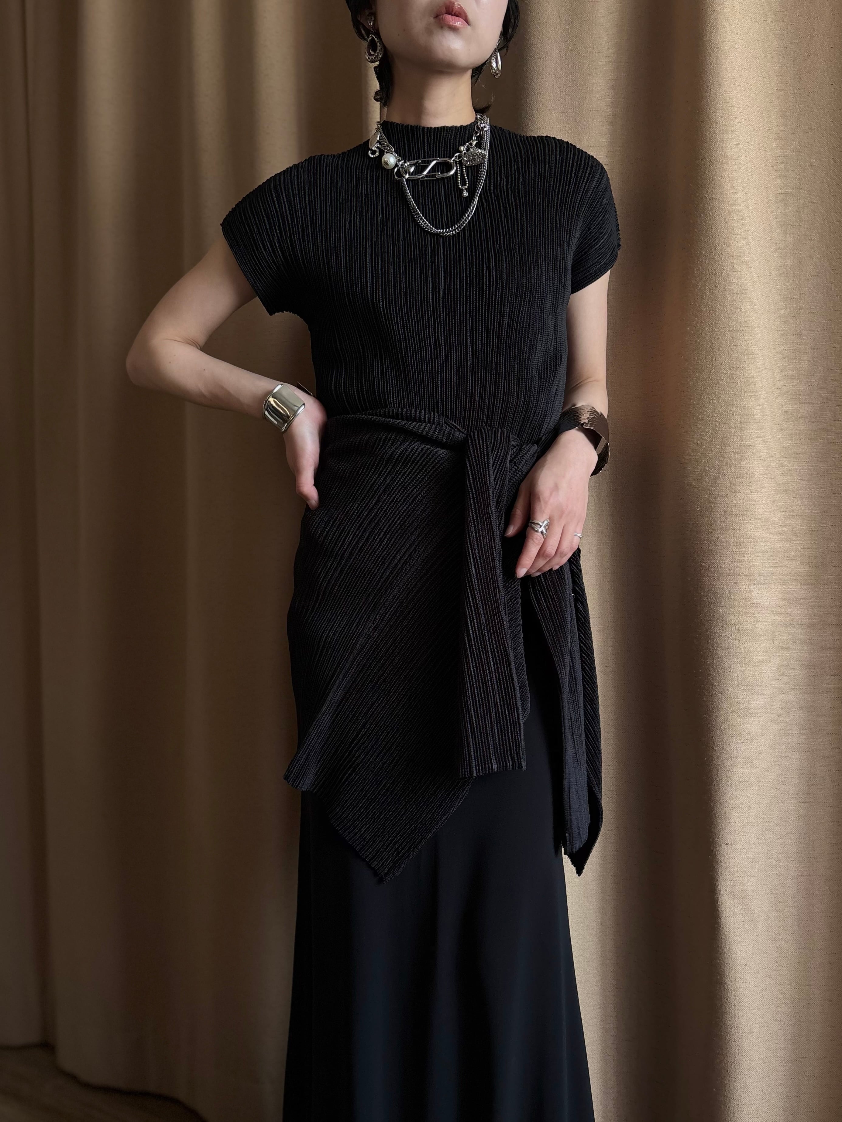 プリーツの伸縮性を活かした、構築的且つモードなディテールが目を惹く拘りの逸品。