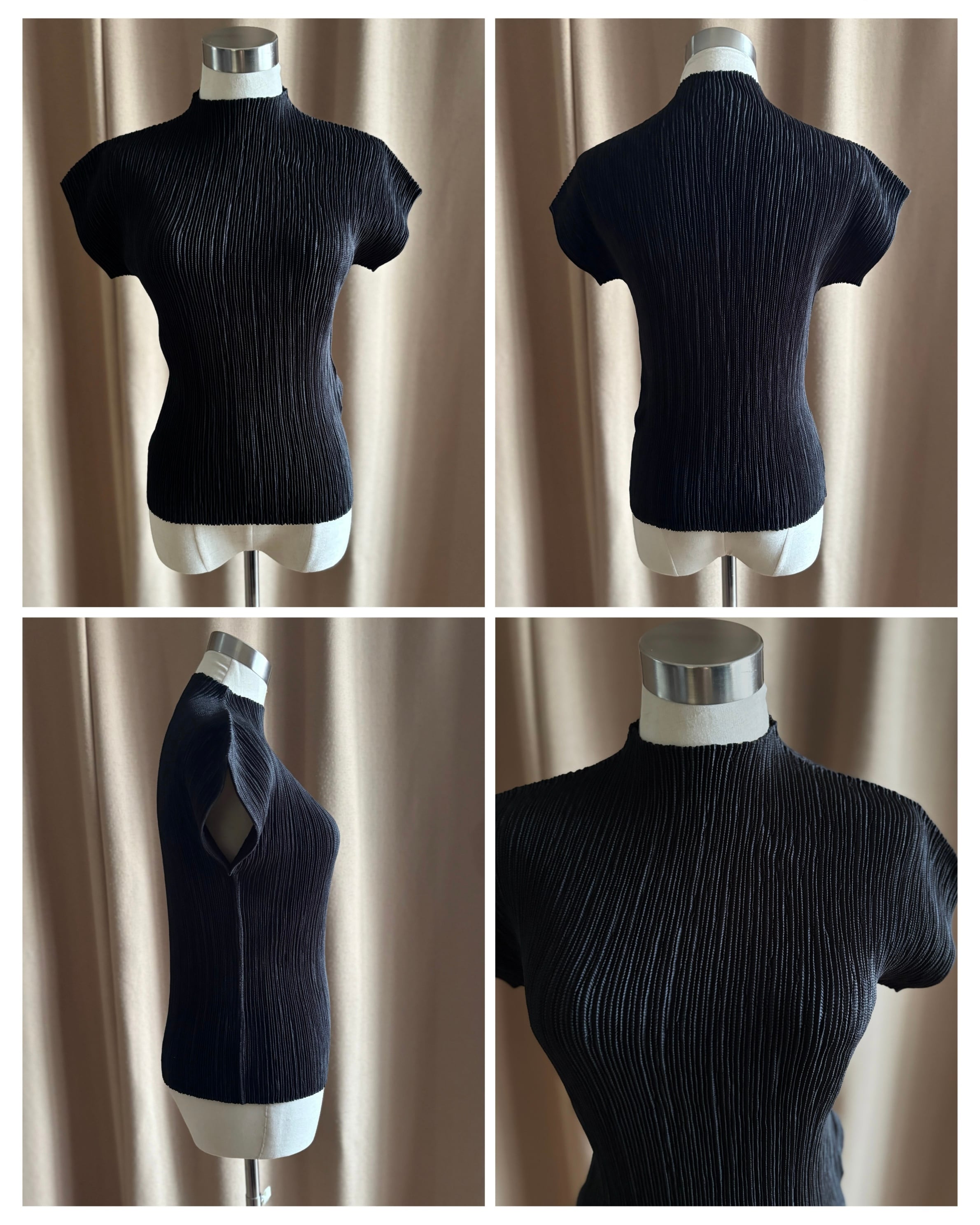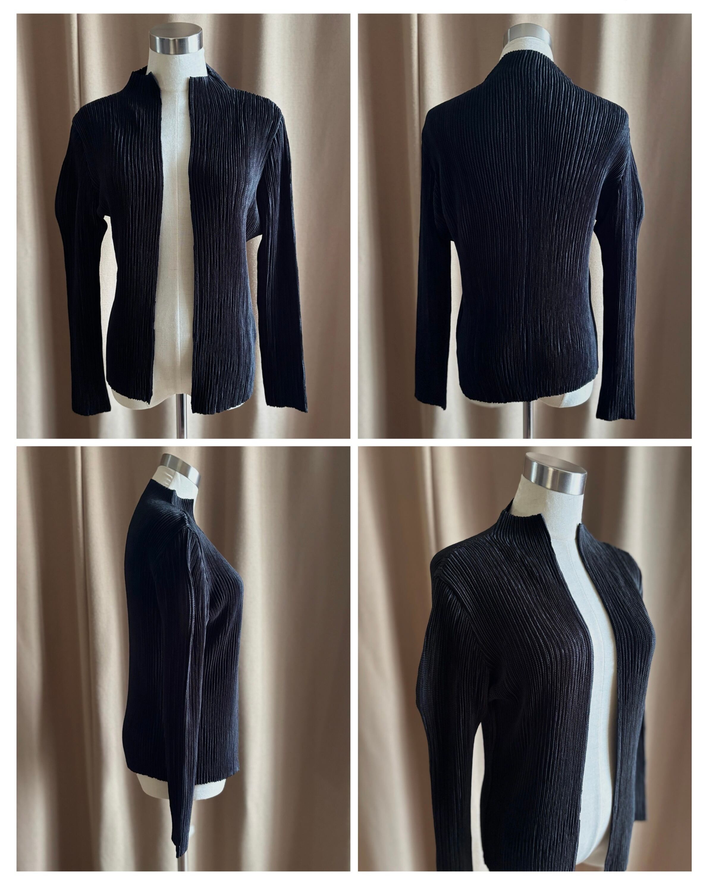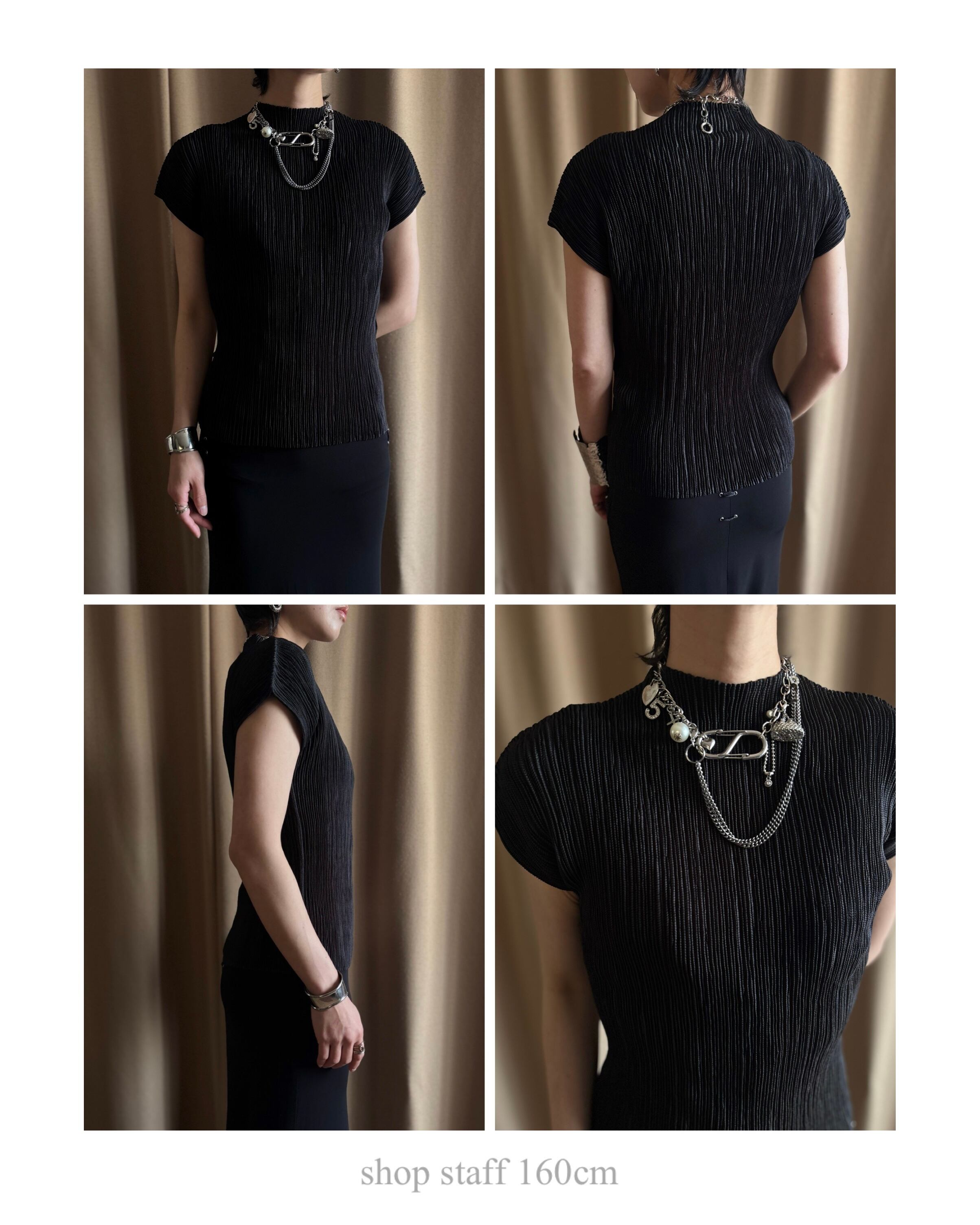 プリーツの伸縮性を活かした、構築的且つモードなディテールが目を惹く拘りの逸品。