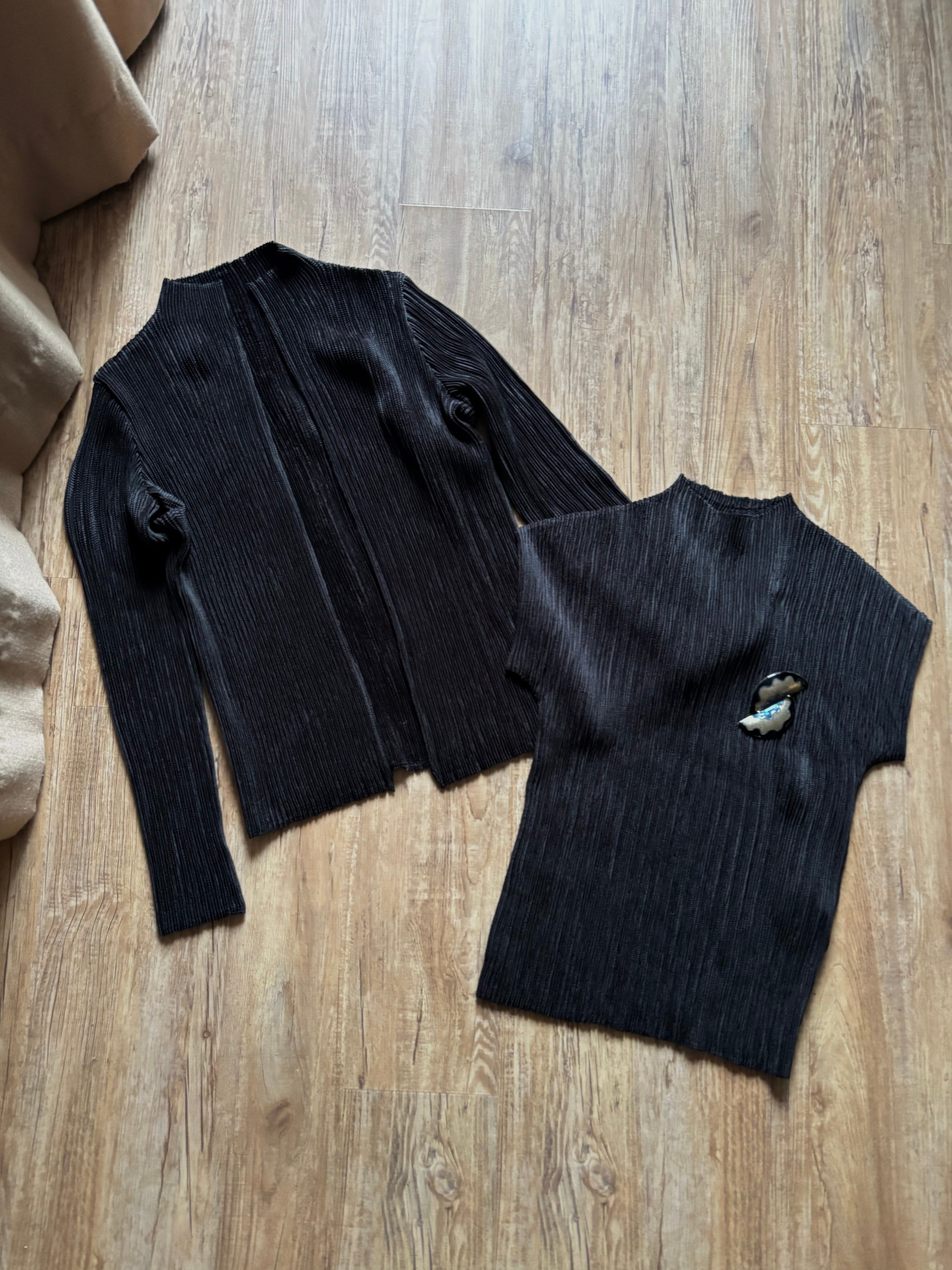 ヴィンテージブローチがセットになった、ブラックプリーツアンサンブル。