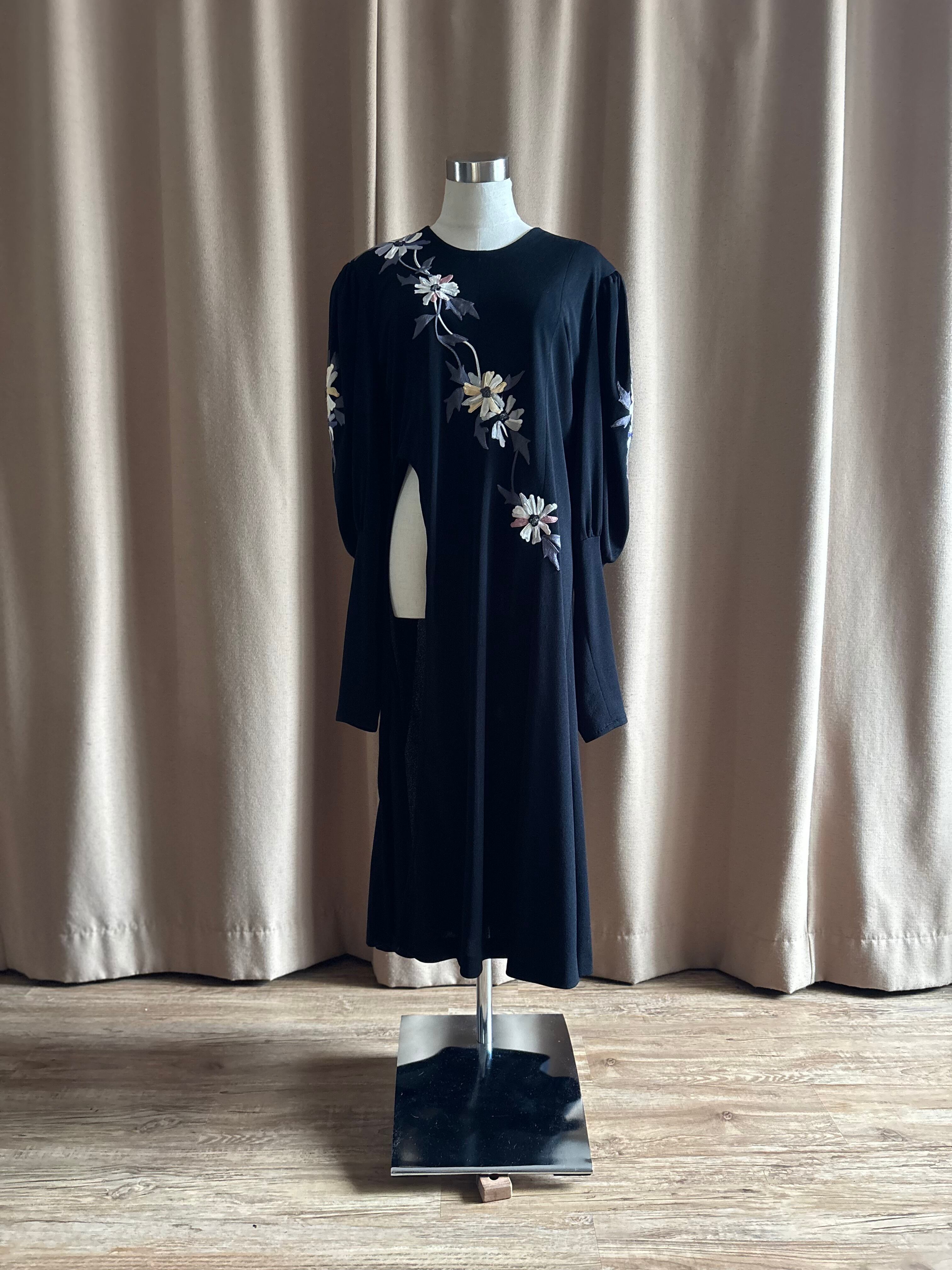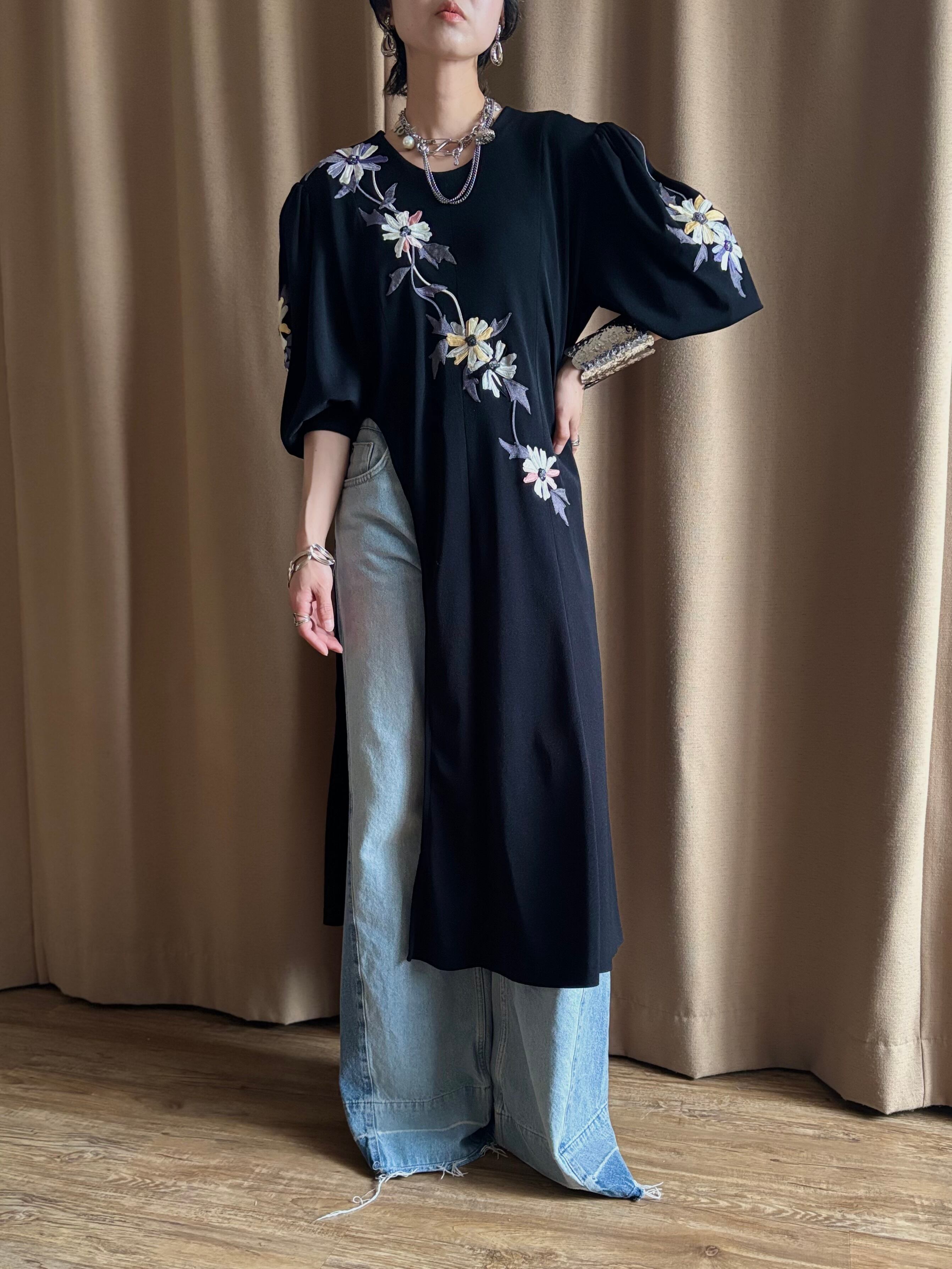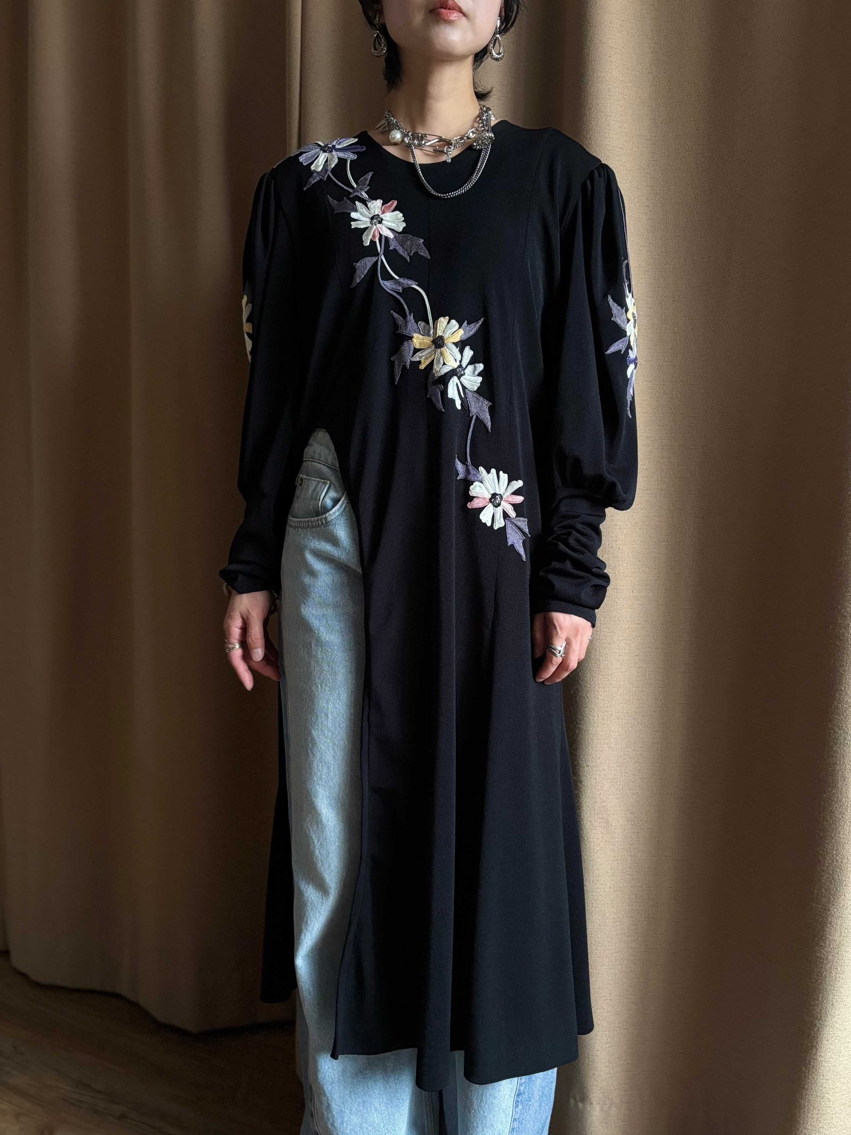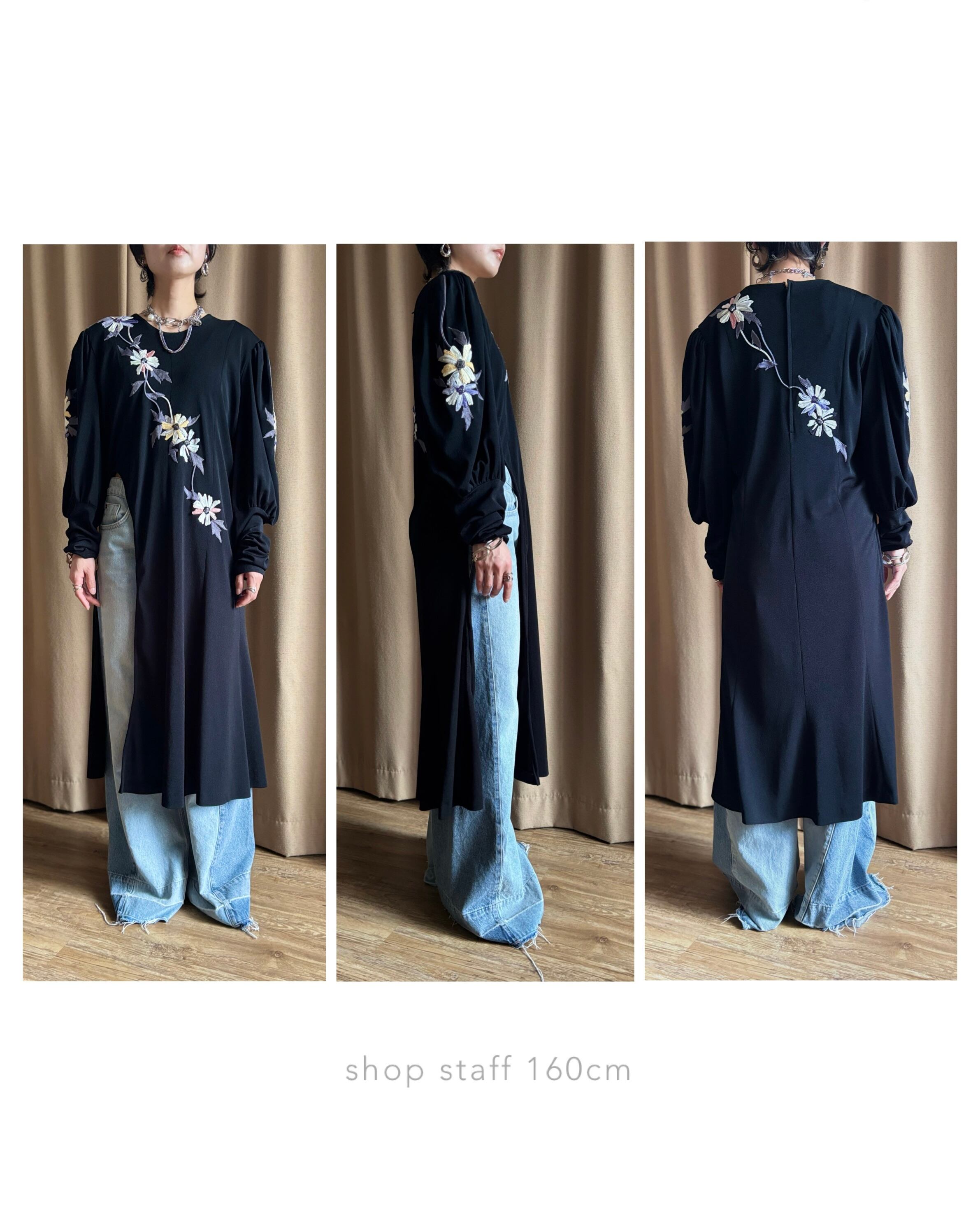 前後・袖にあしらわれた花柄刺繍が華やぎ溢れるブラックワンピース。