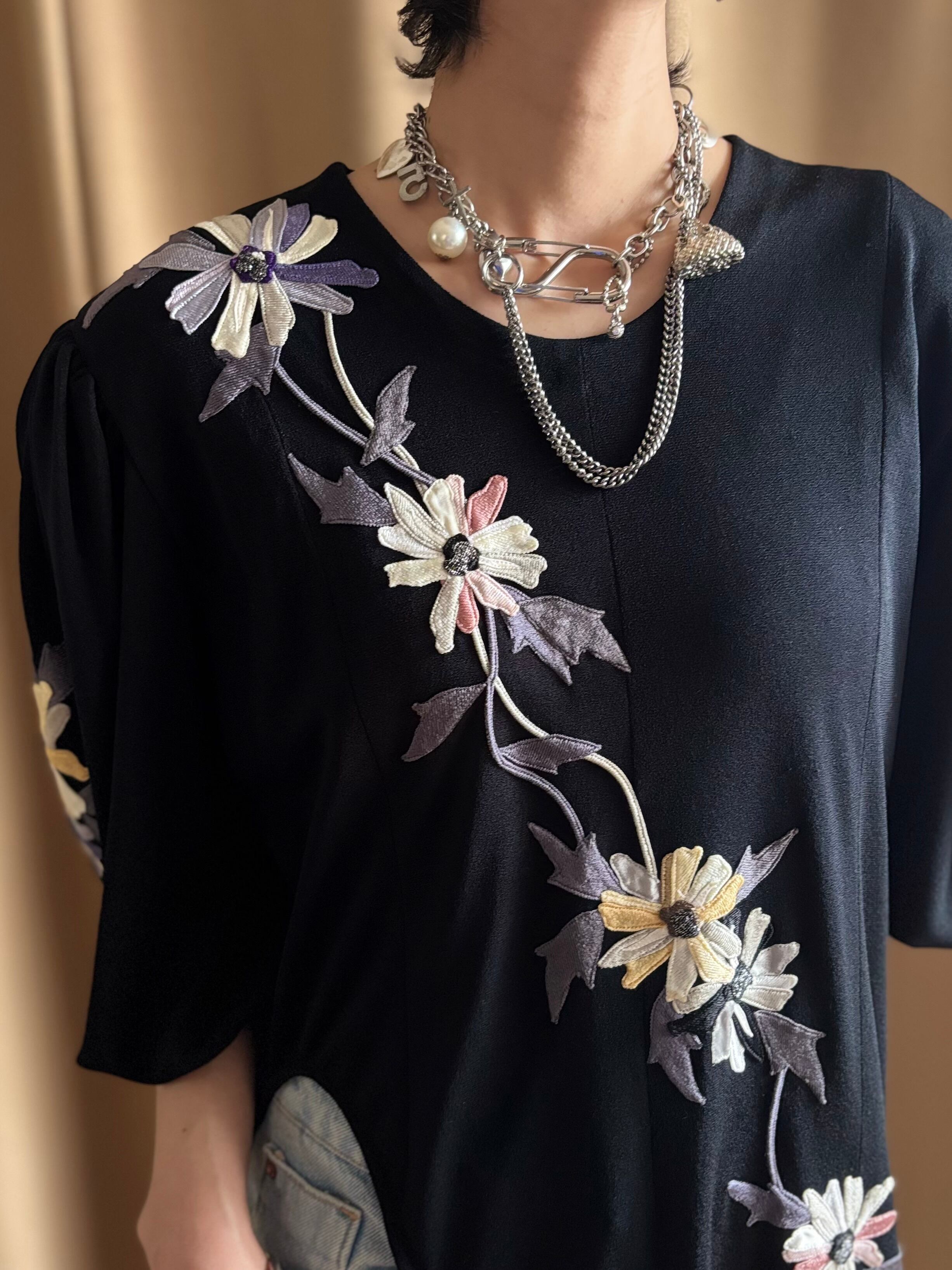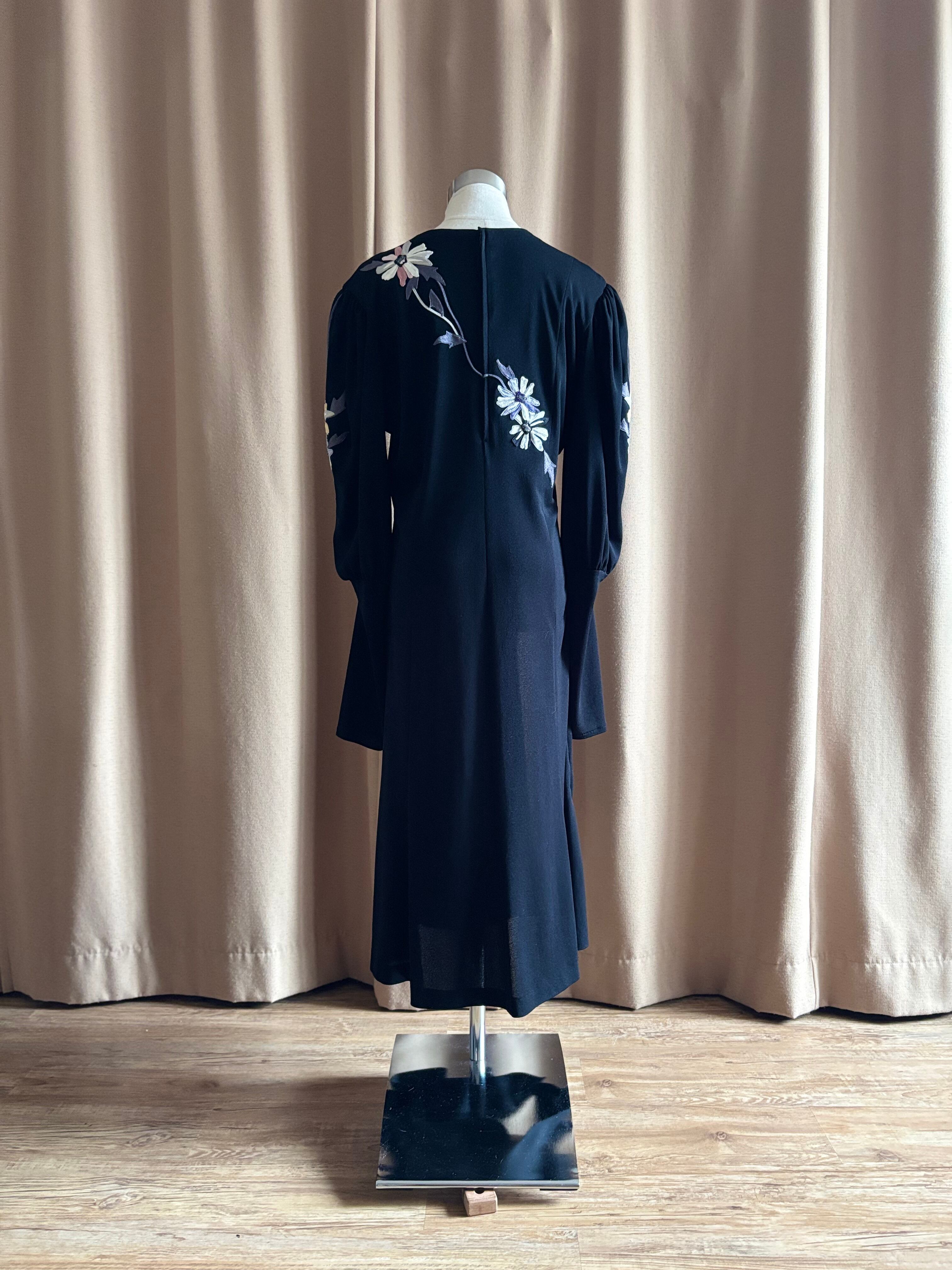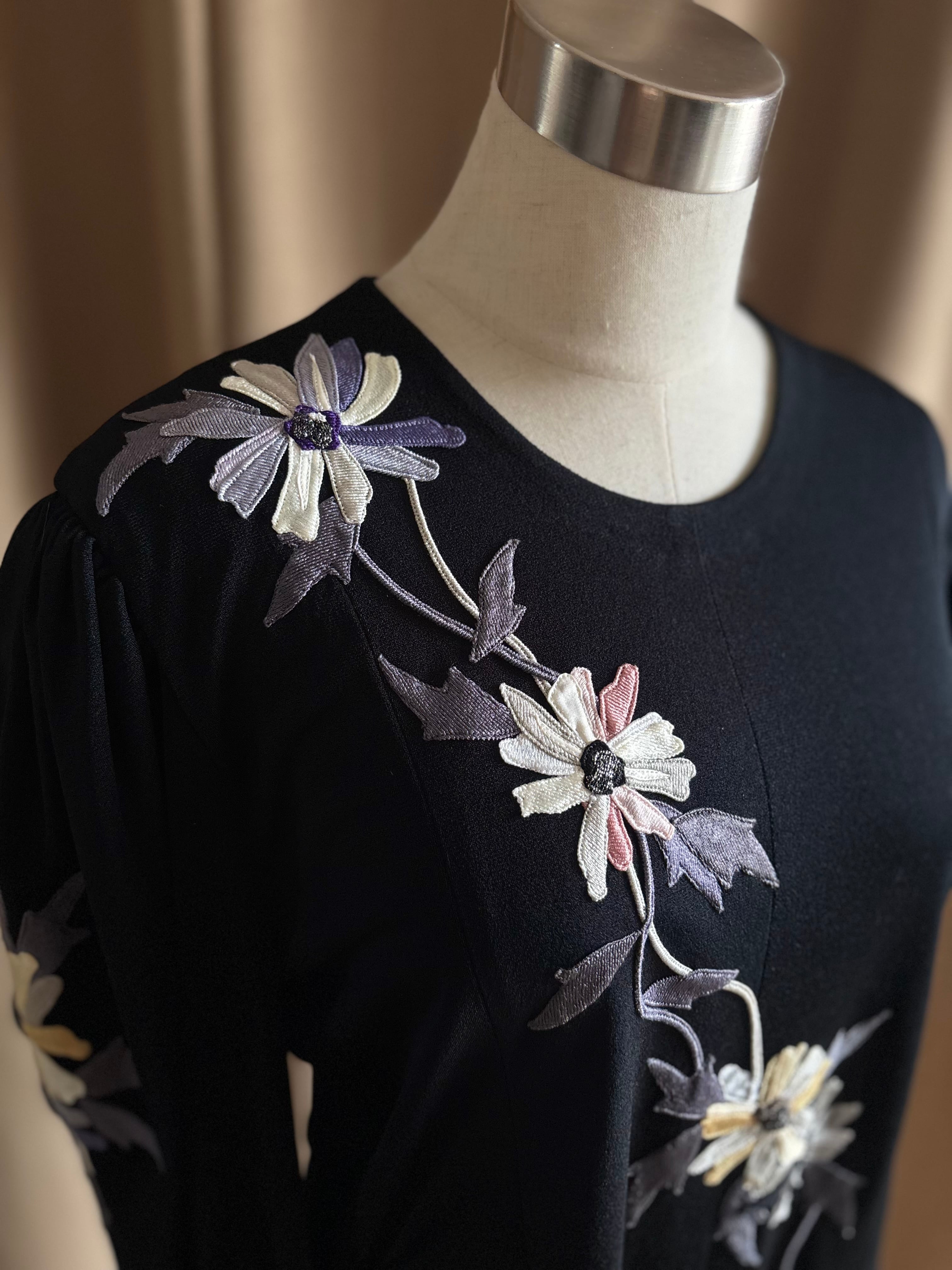 前後・袖にあしらわれた花柄刺繍が華やぎ溢れるブラックワンピース。