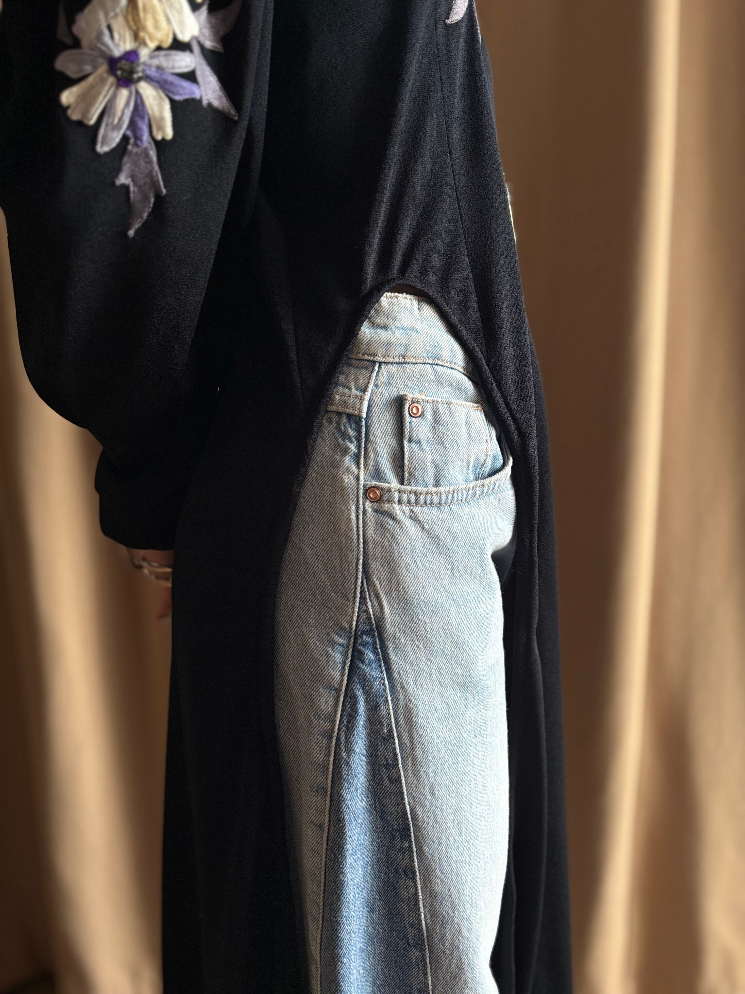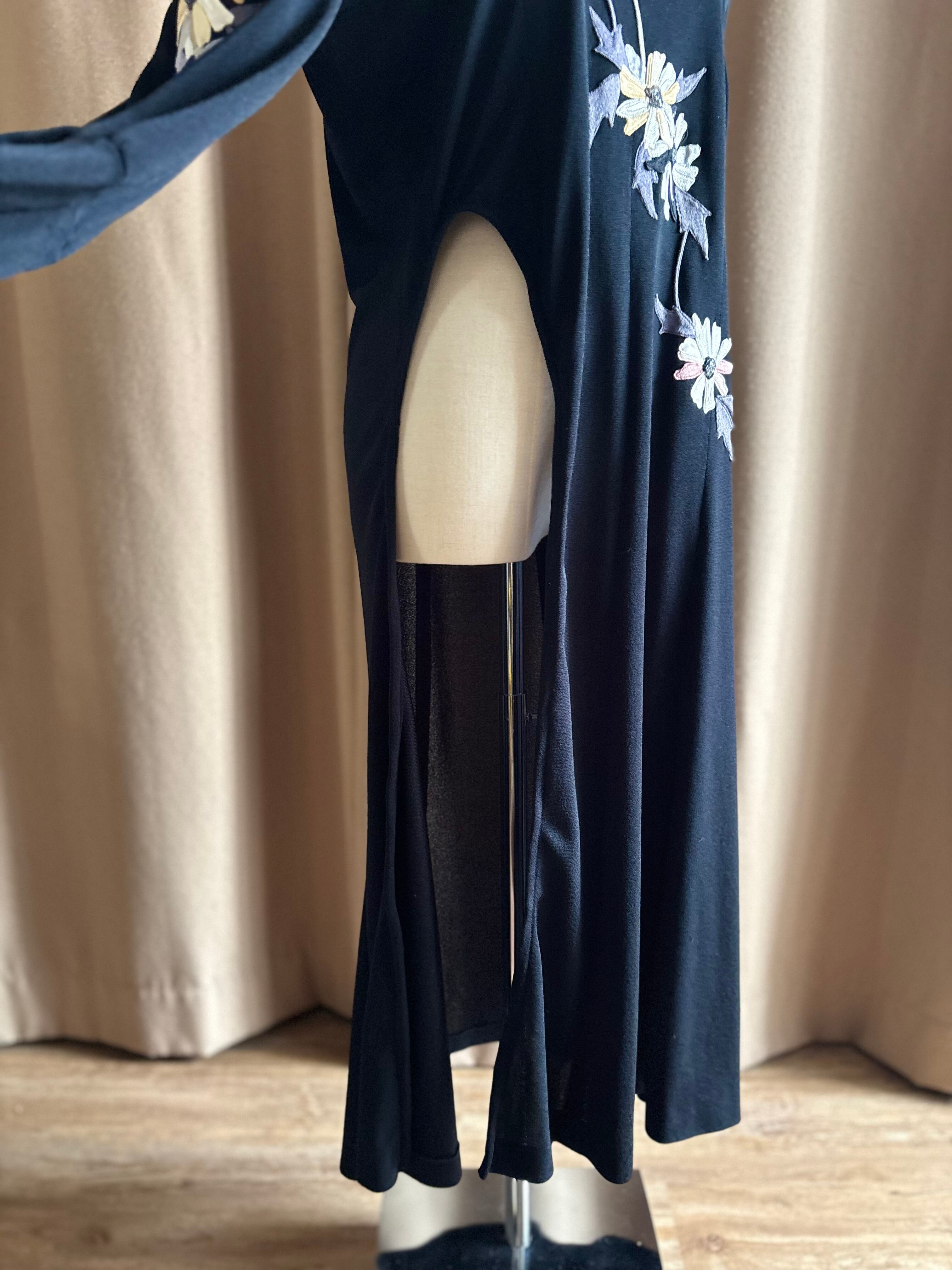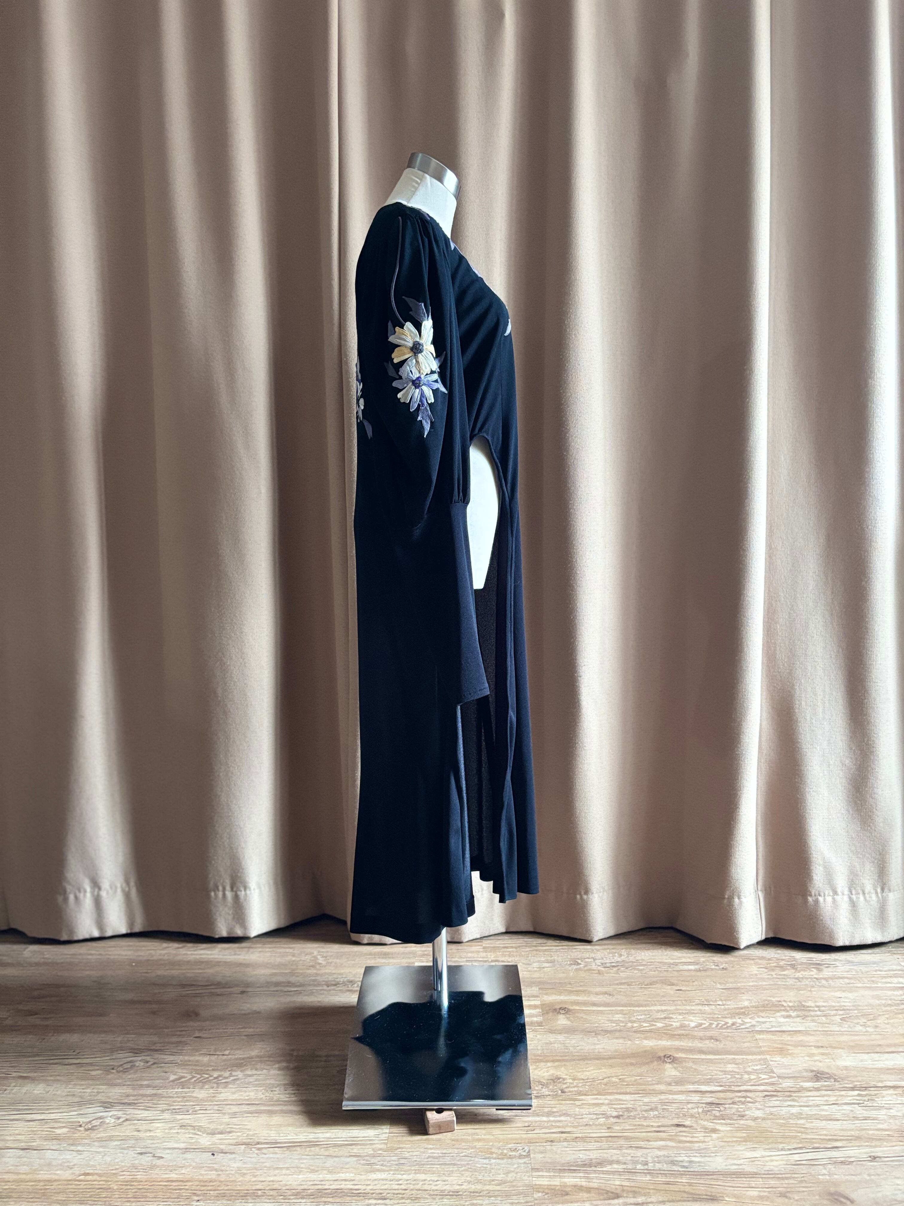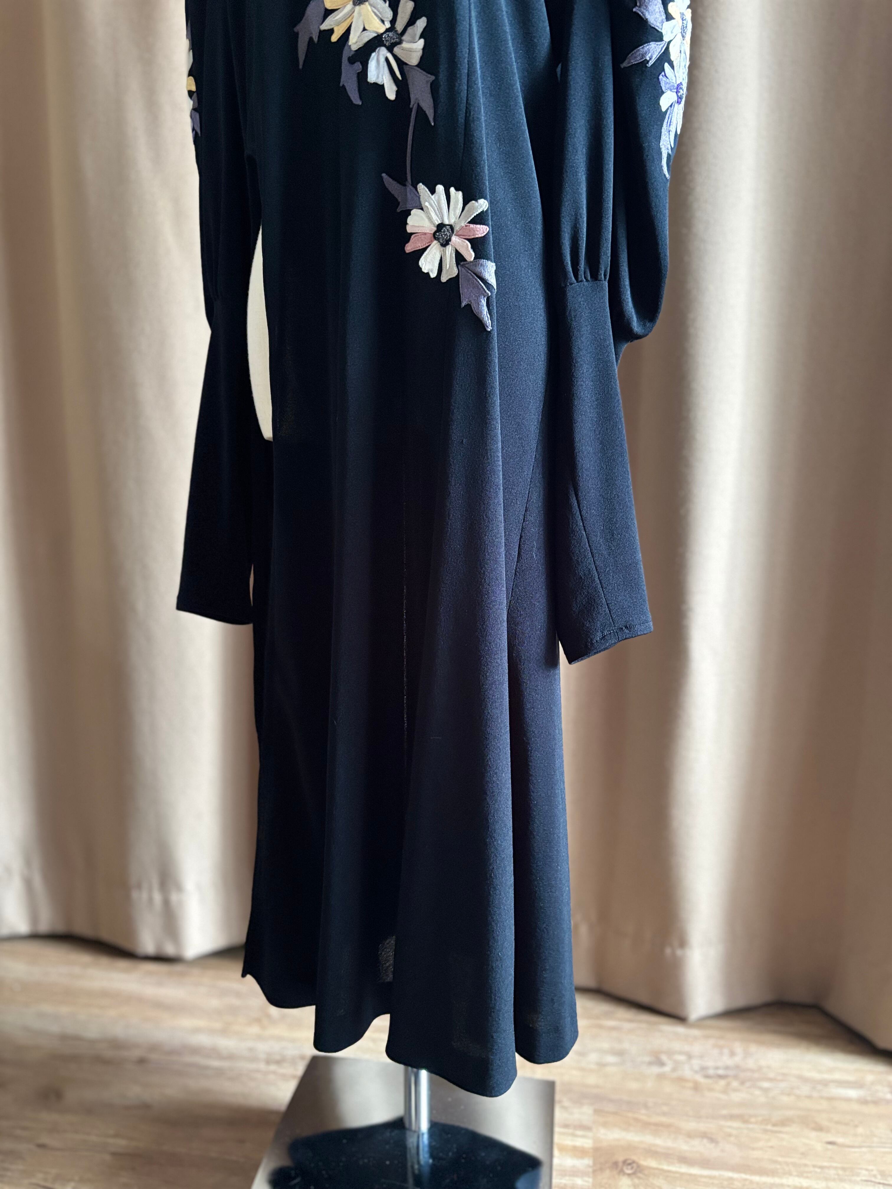 前後・袖にあしらわれた花柄刺繍が華やぎ溢れるブラックワンピース。