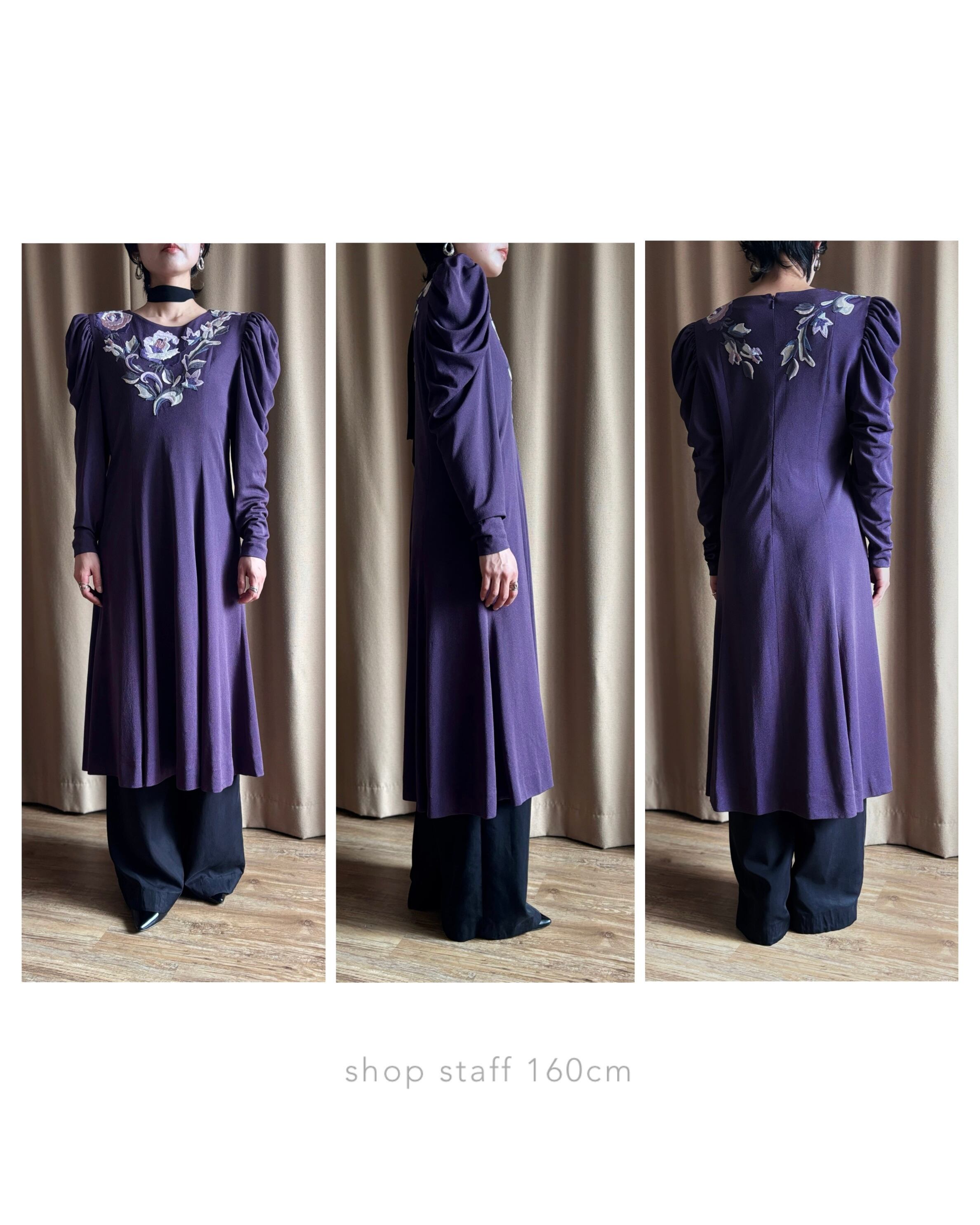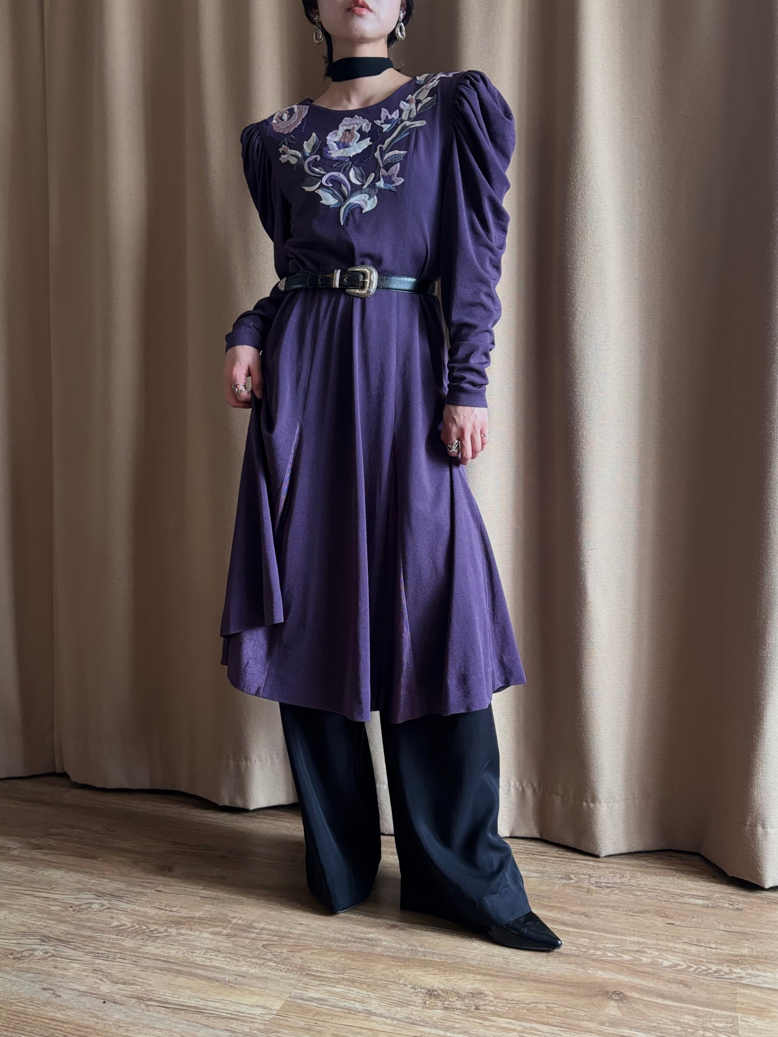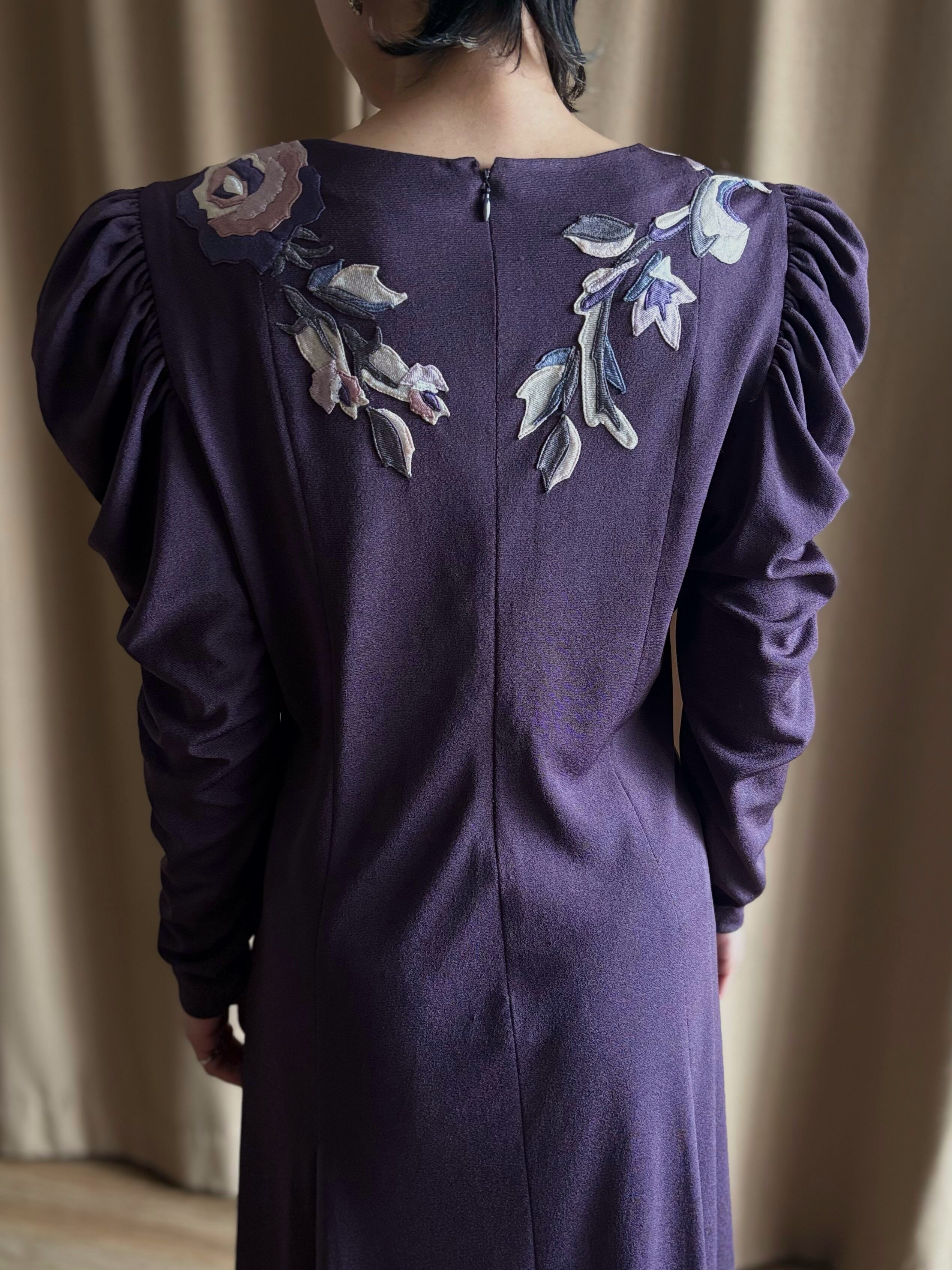 上品な深みのあるパープルに、前後へ贅沢に施された花柄刺繍が美しい日本製ワンピース。