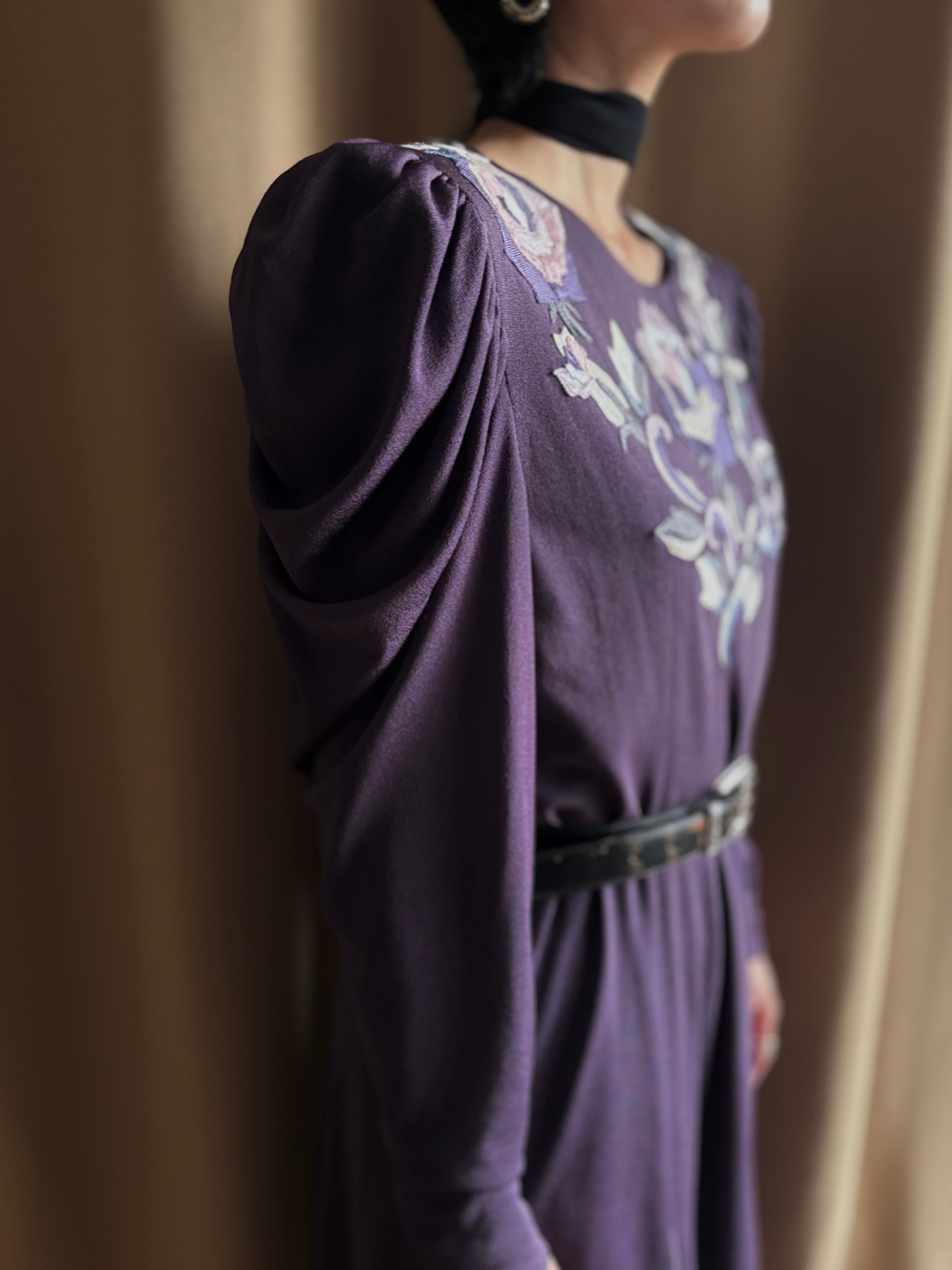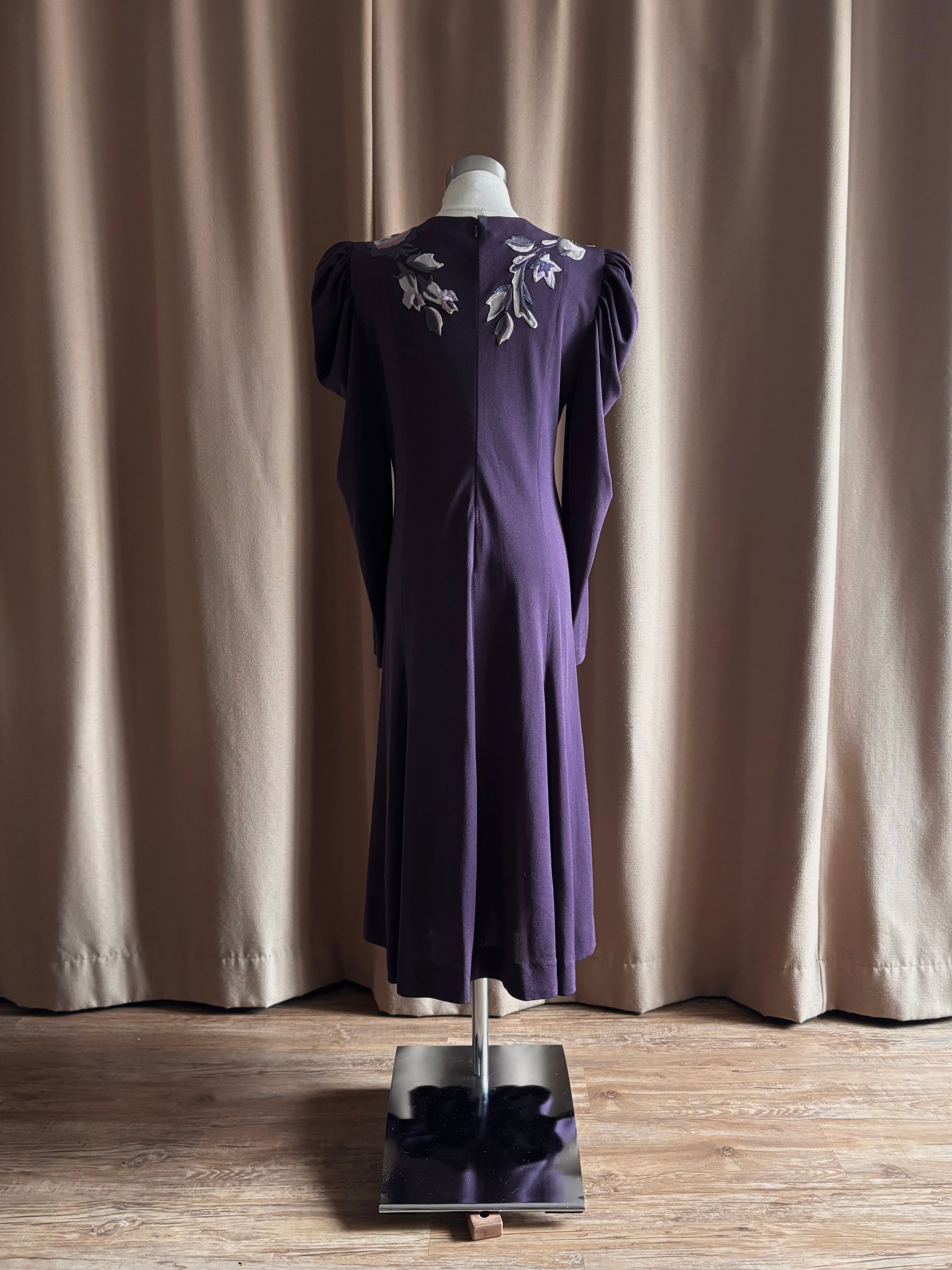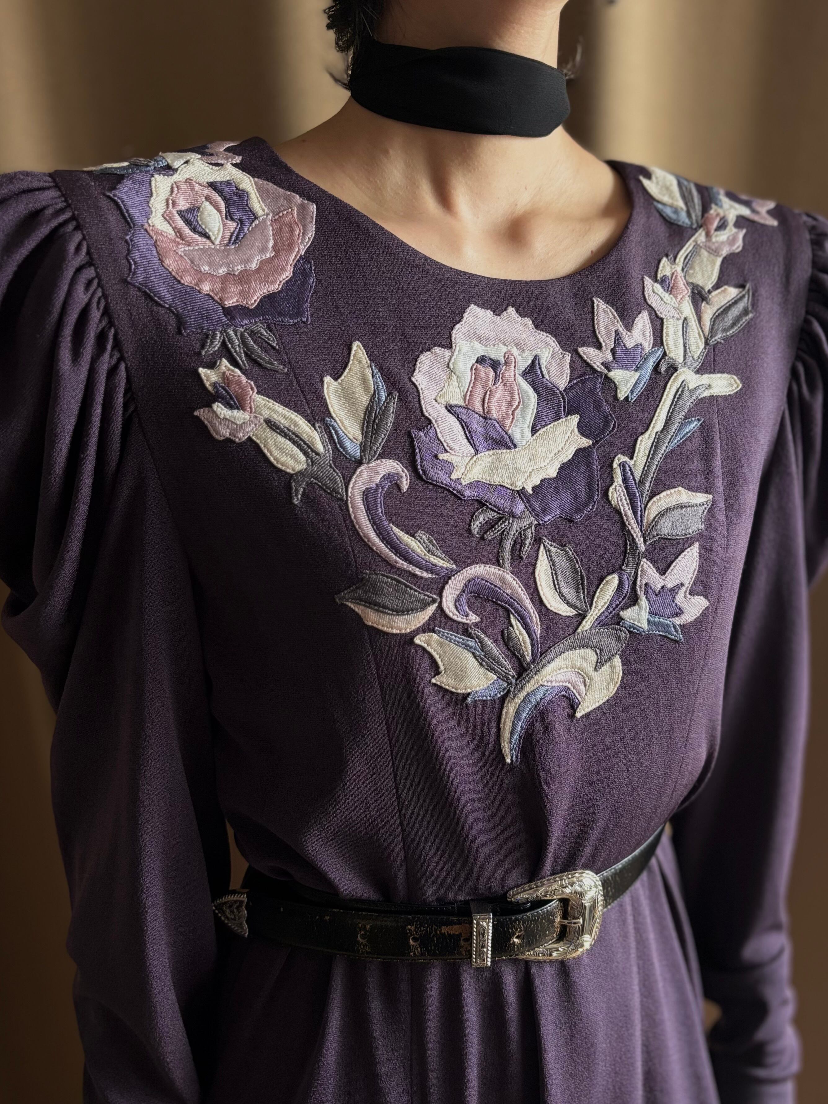 上品な深みのあるパープルに、前後へ贅沢に施された花柄刺繍が美しい日本製ワンピース。