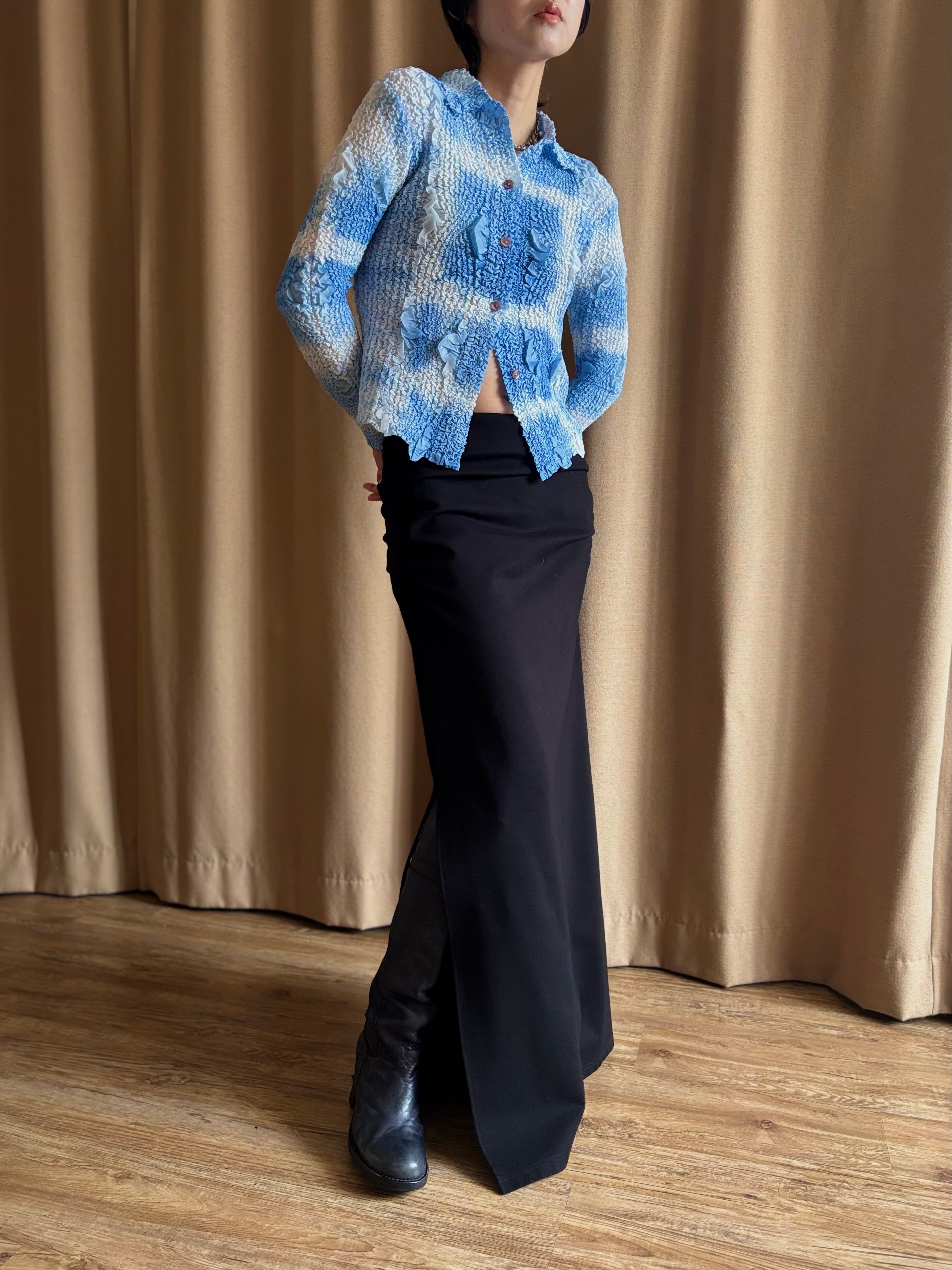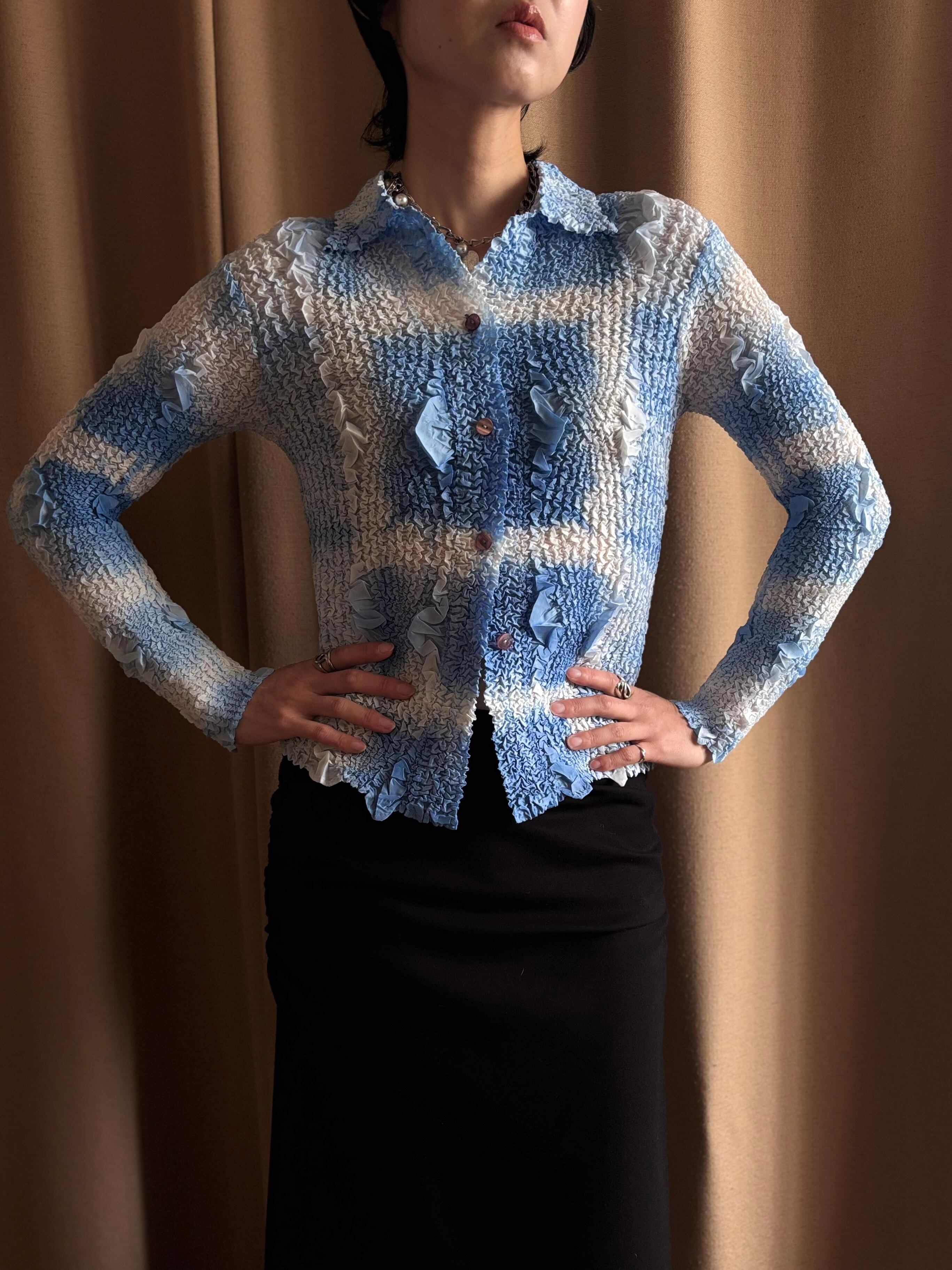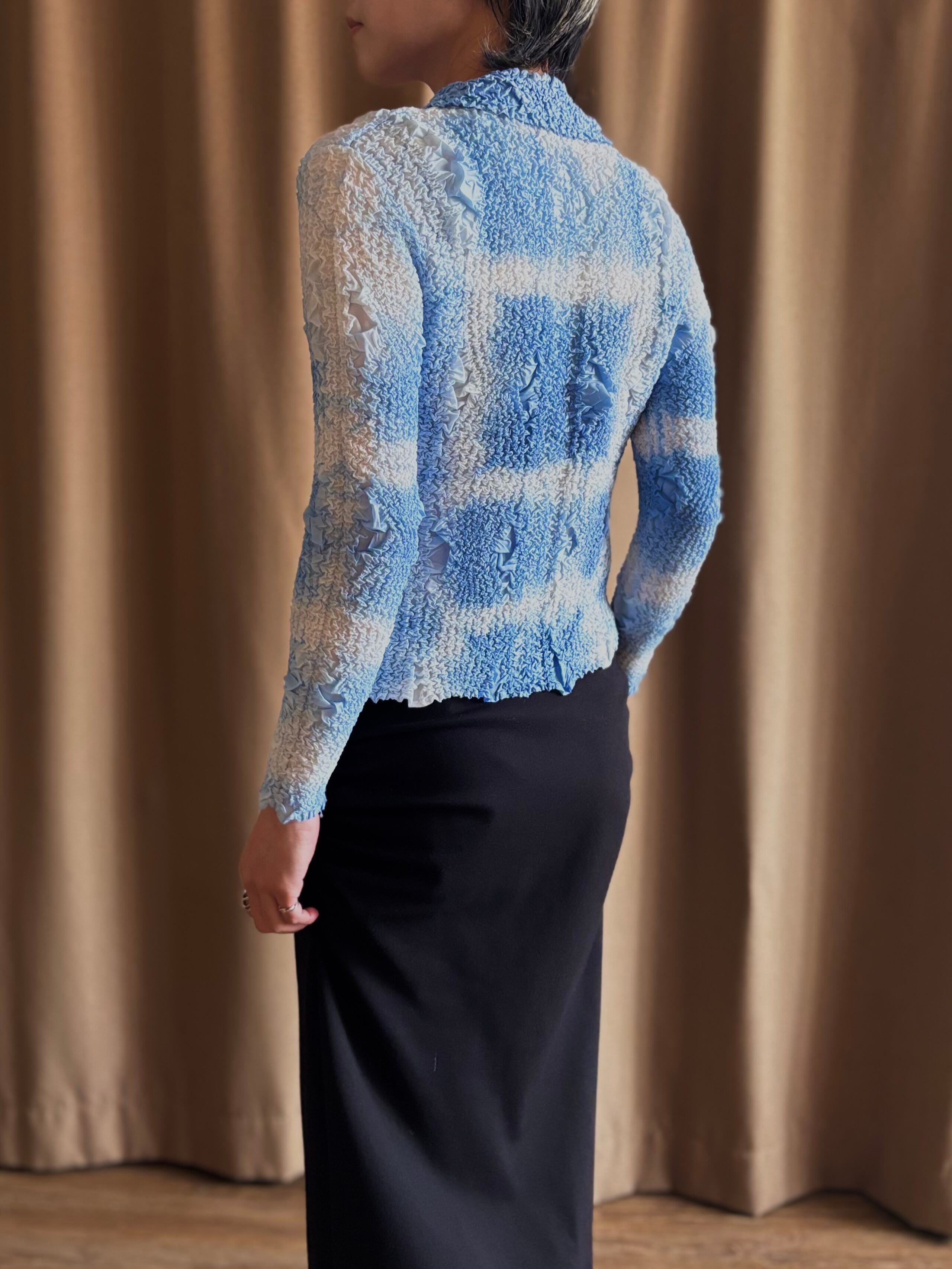 ライトブルーのアートなグラデーションに、構築的なファブリックが唯一無二。
