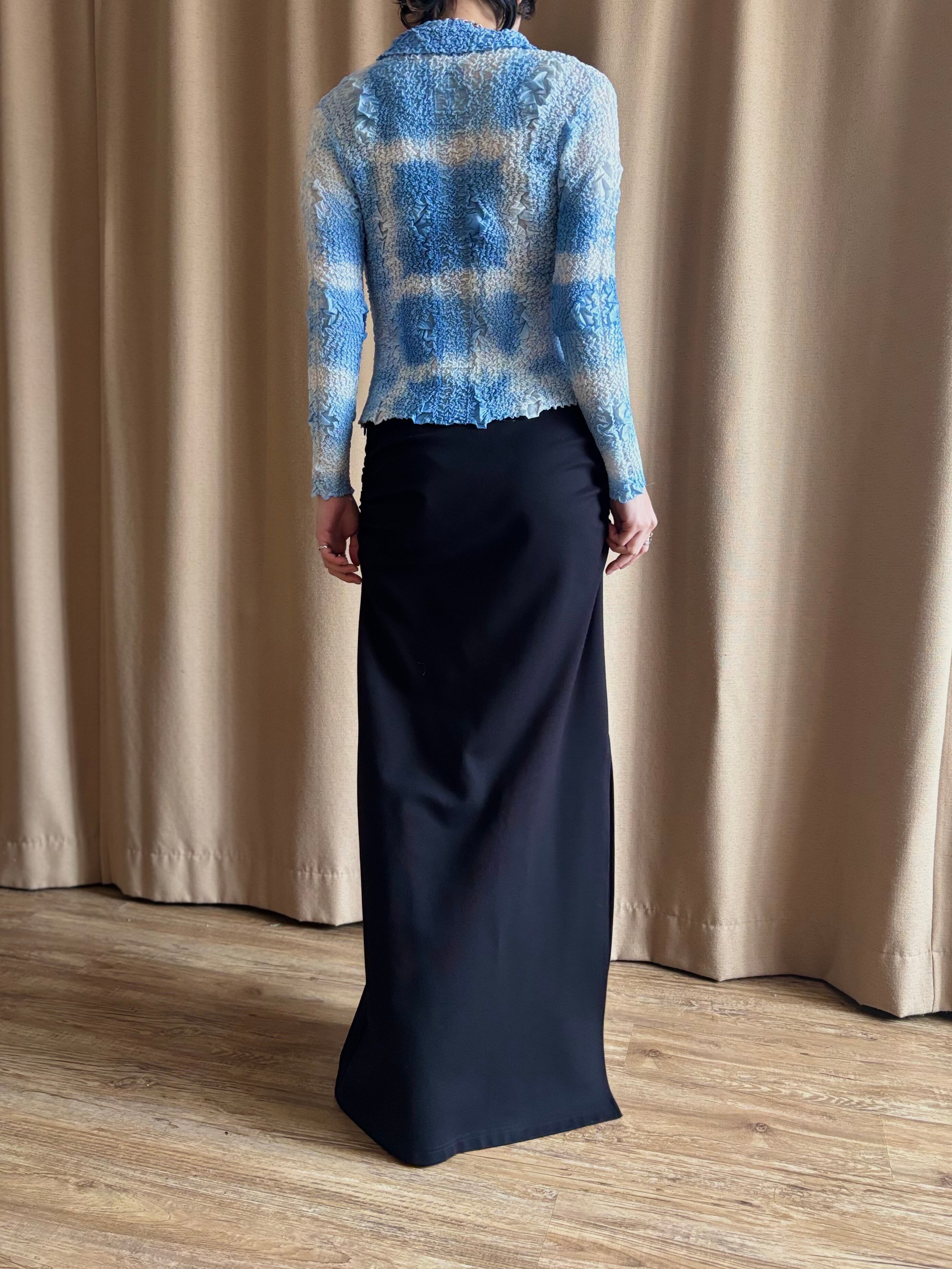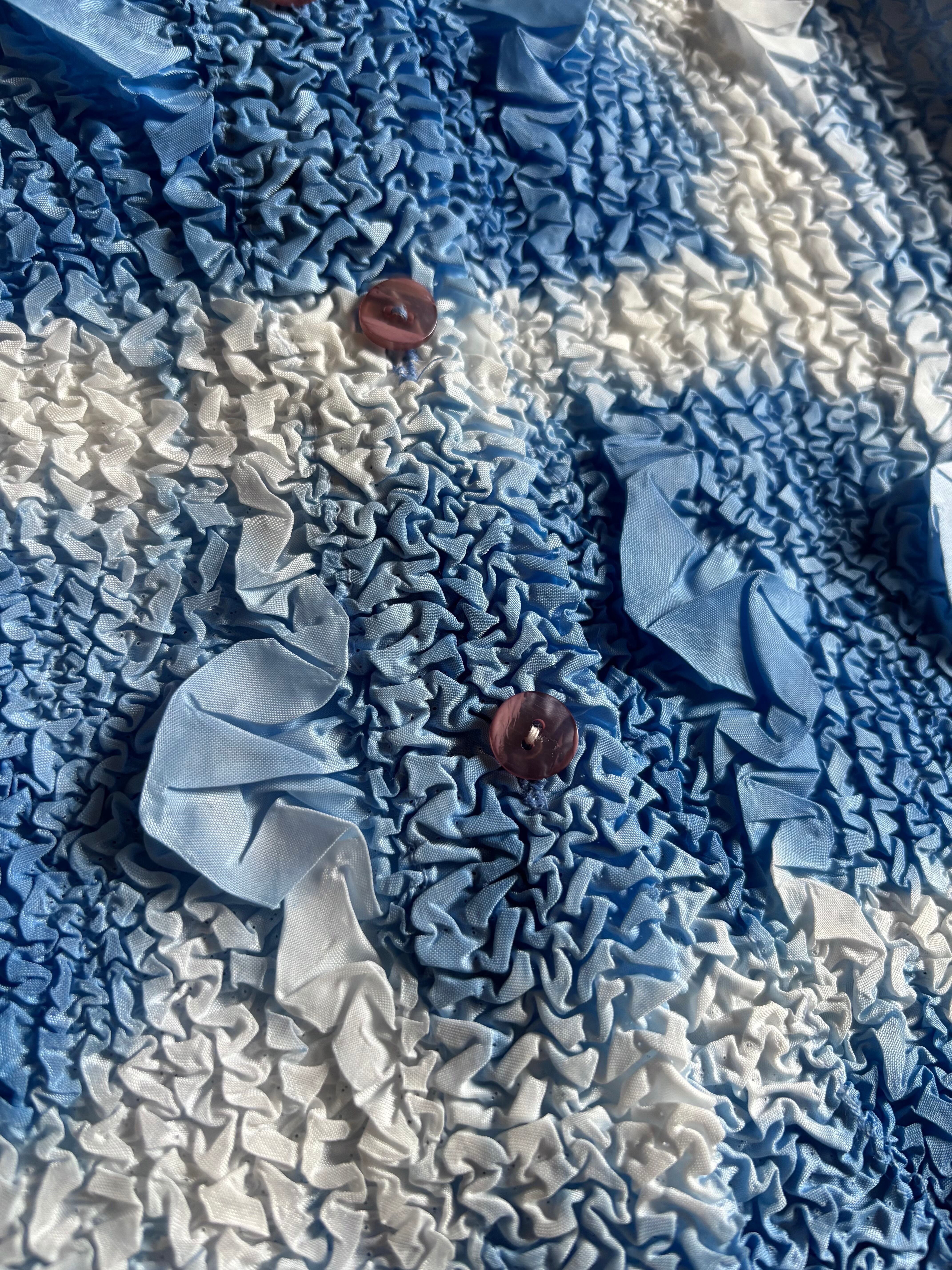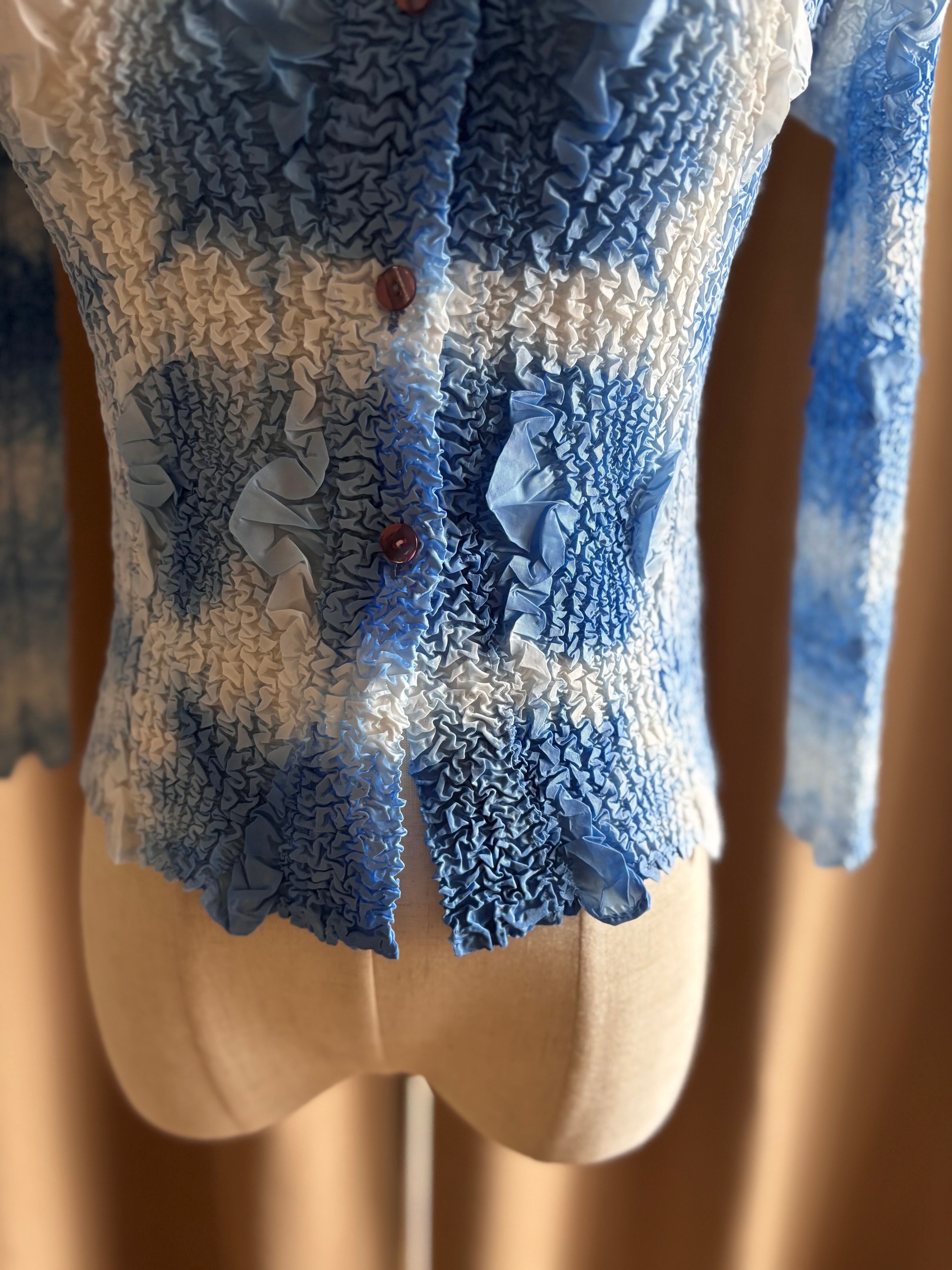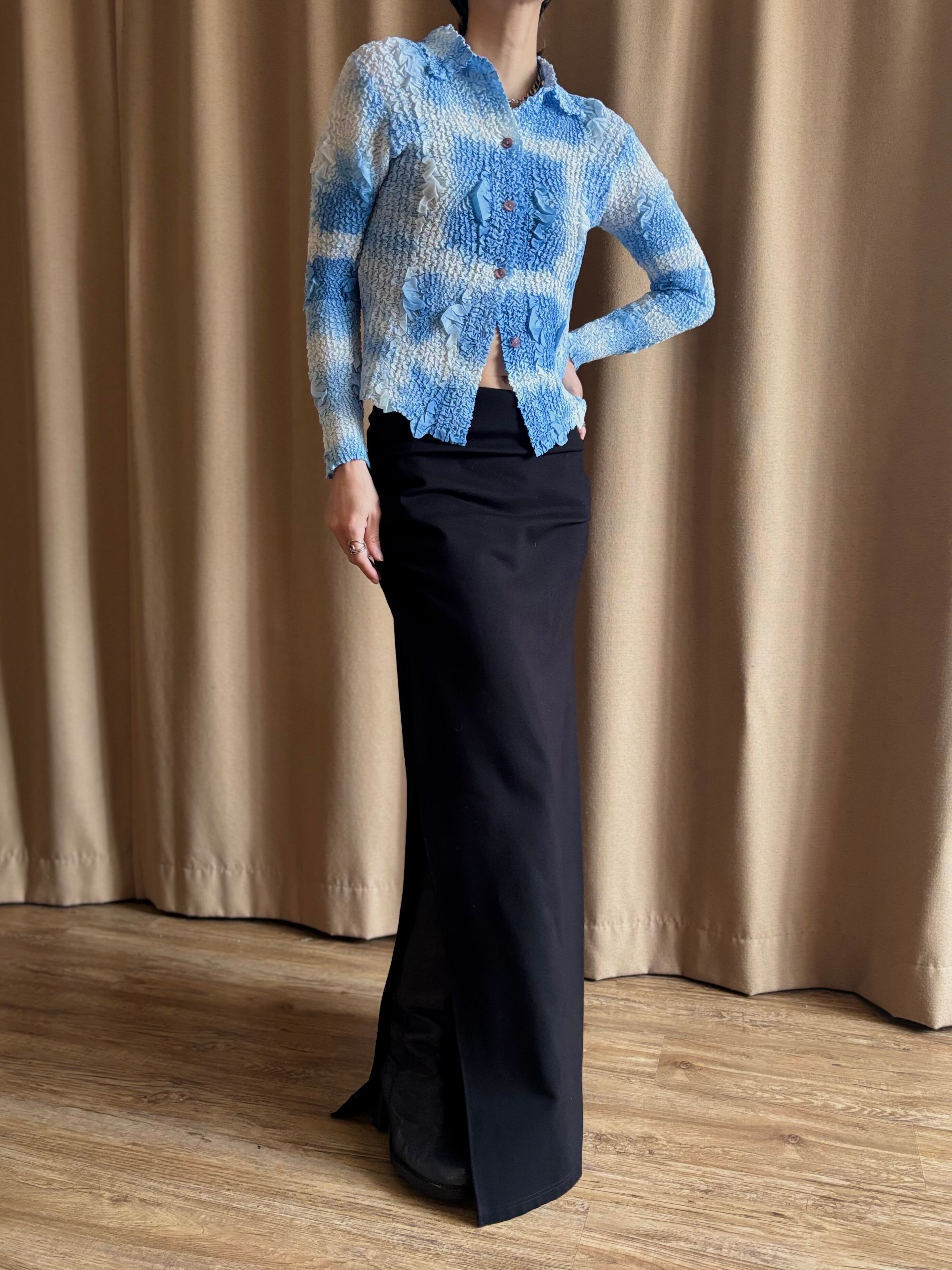 ライトブルーのアートなグラデーションに、構築的なファブリックが唯一無二。