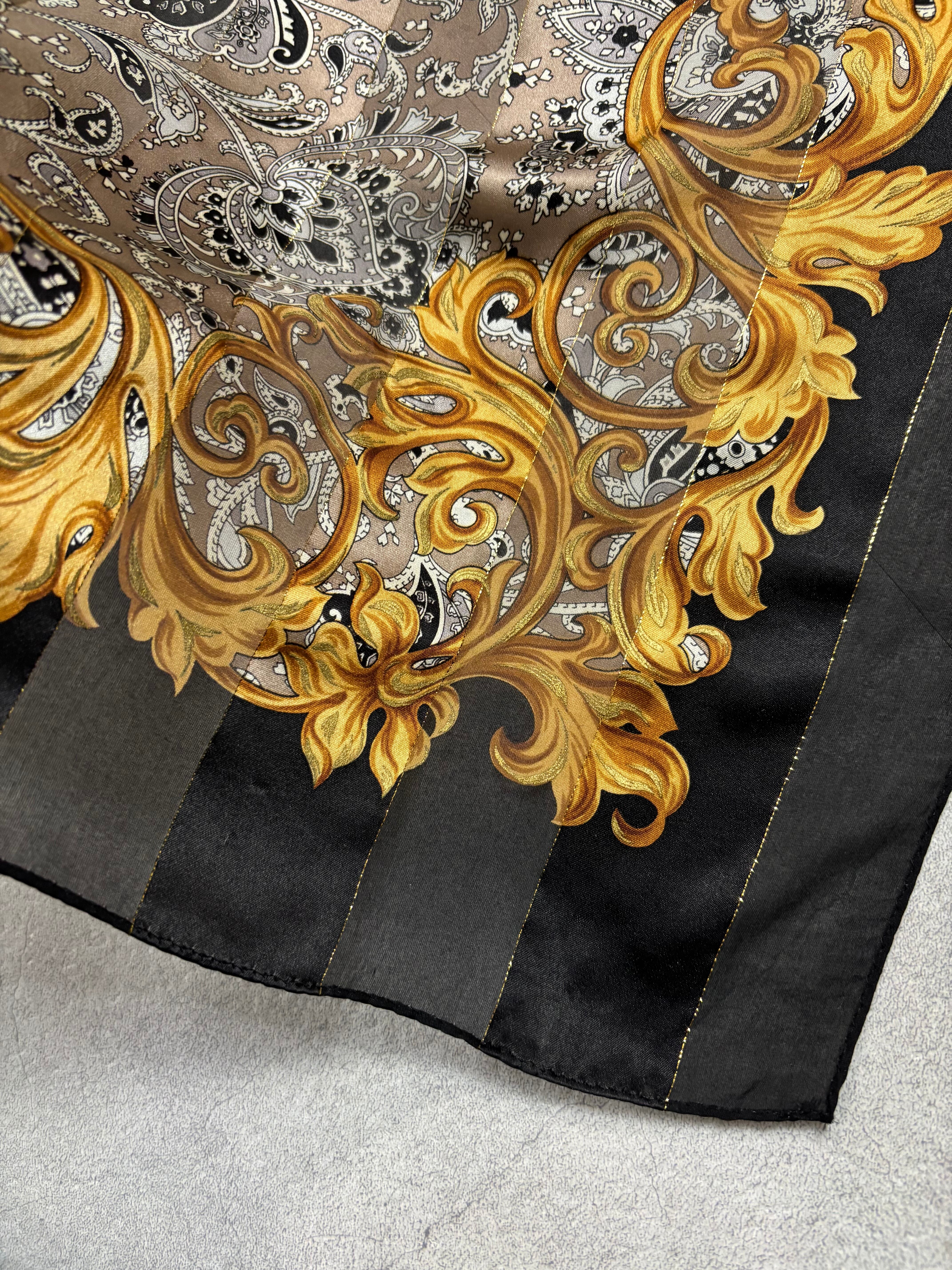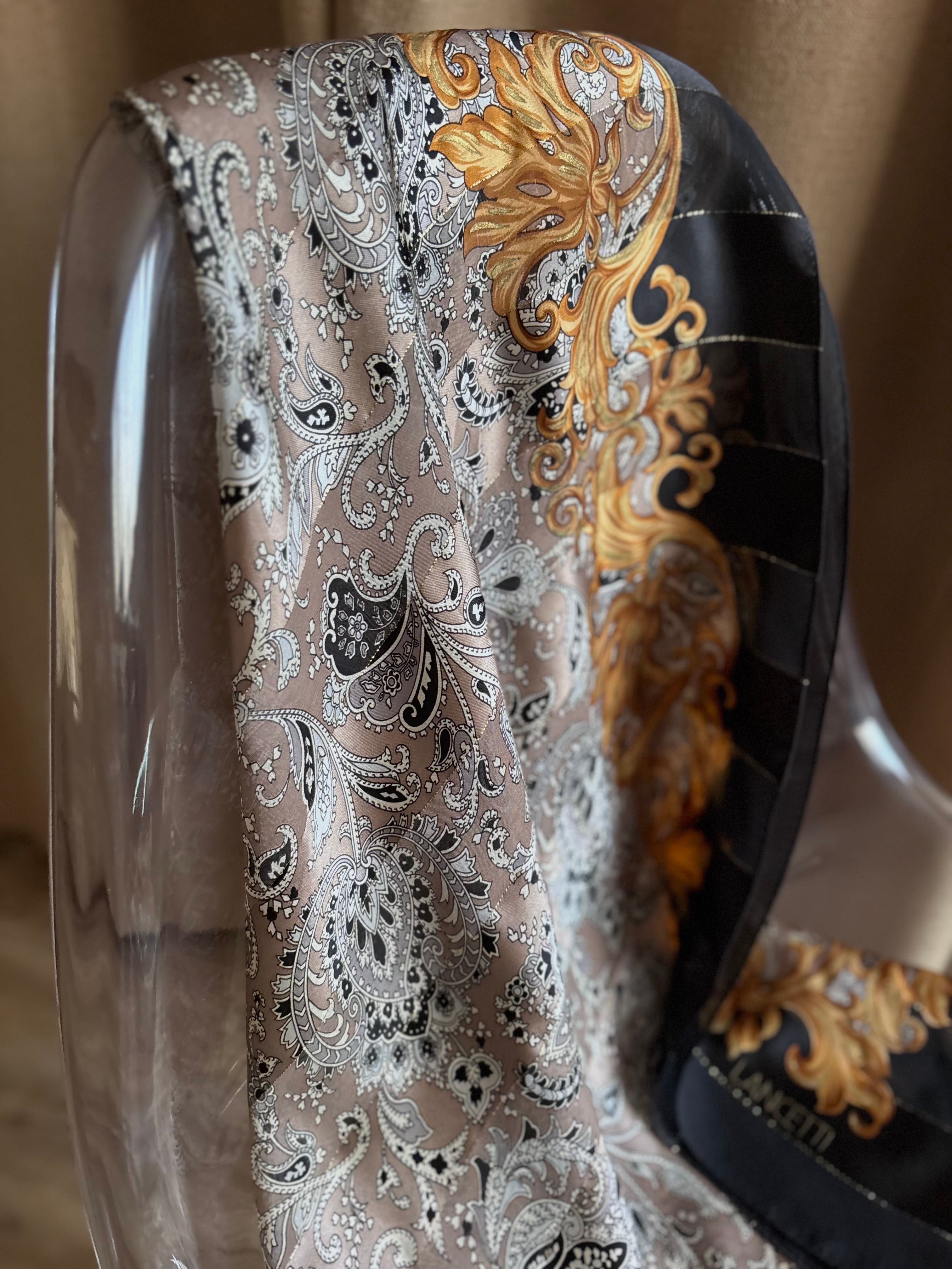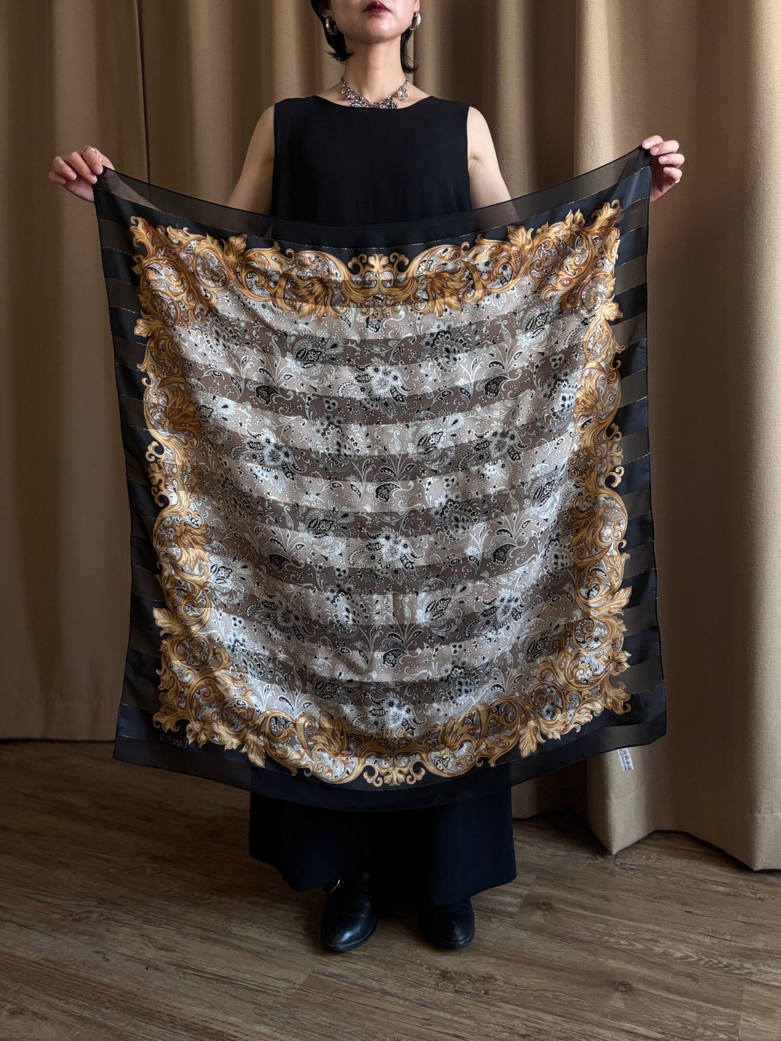 中央に緻密なペイズリー柄、周囲を華やかなボタニカル柄(植物模様)で縁取ったエレガンスなスカーフ。