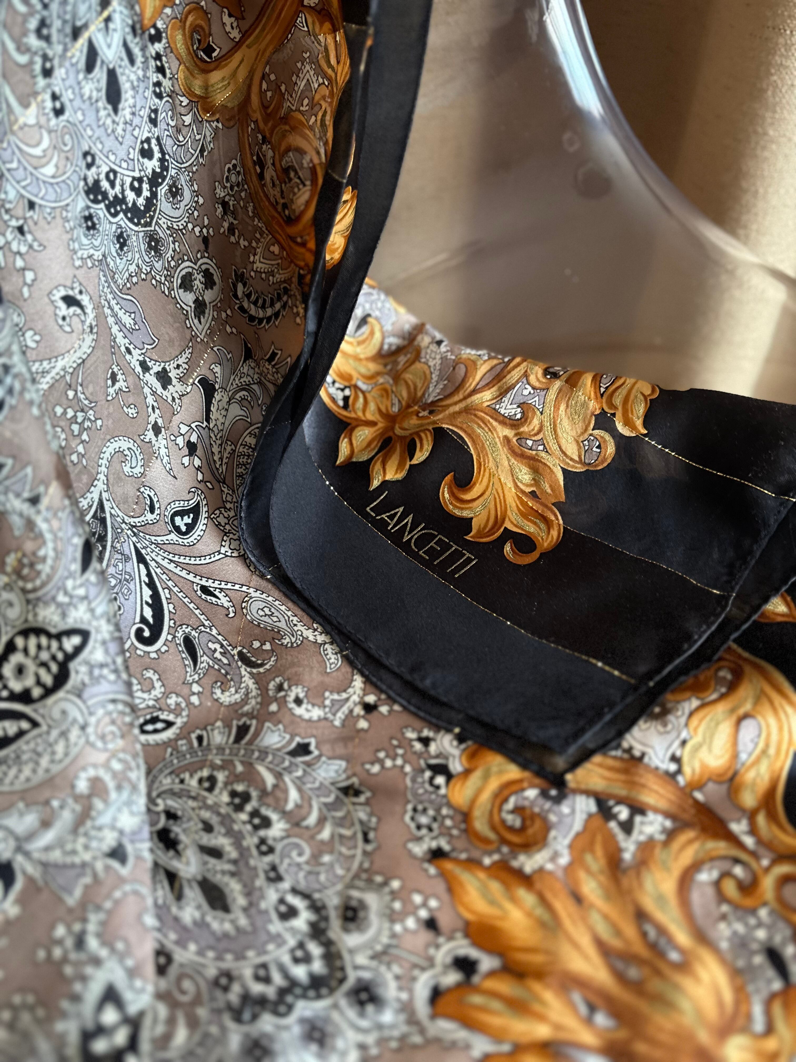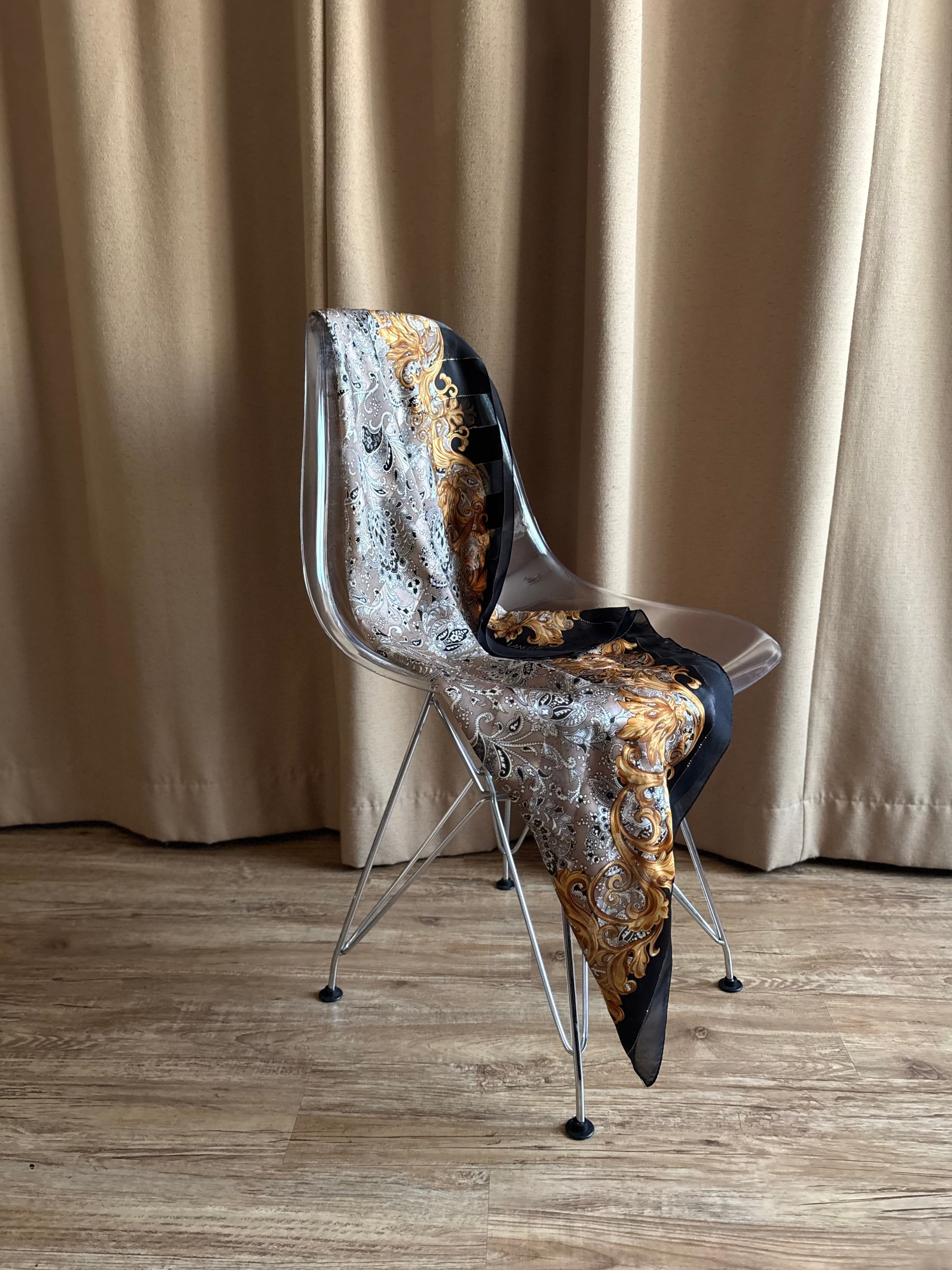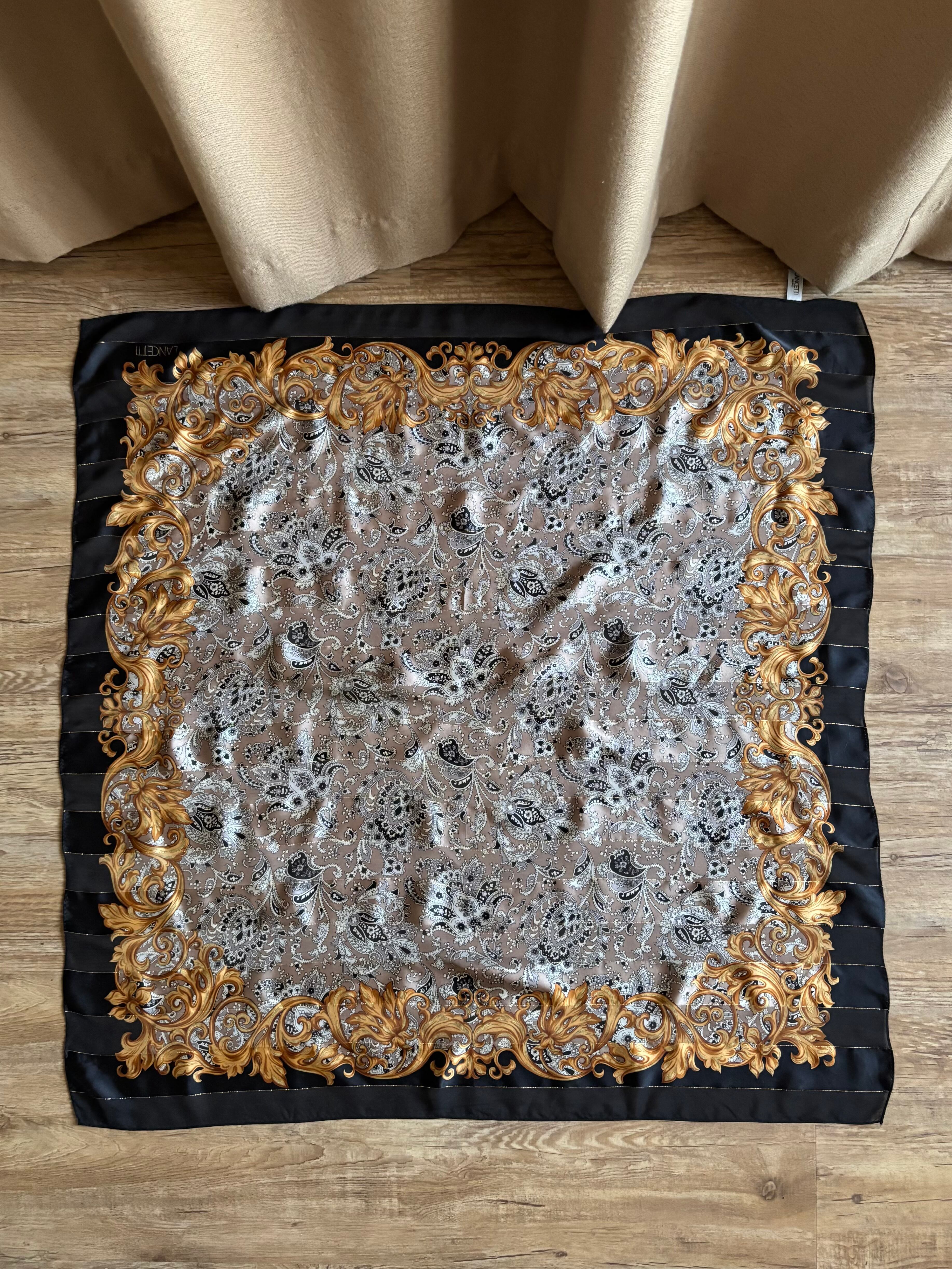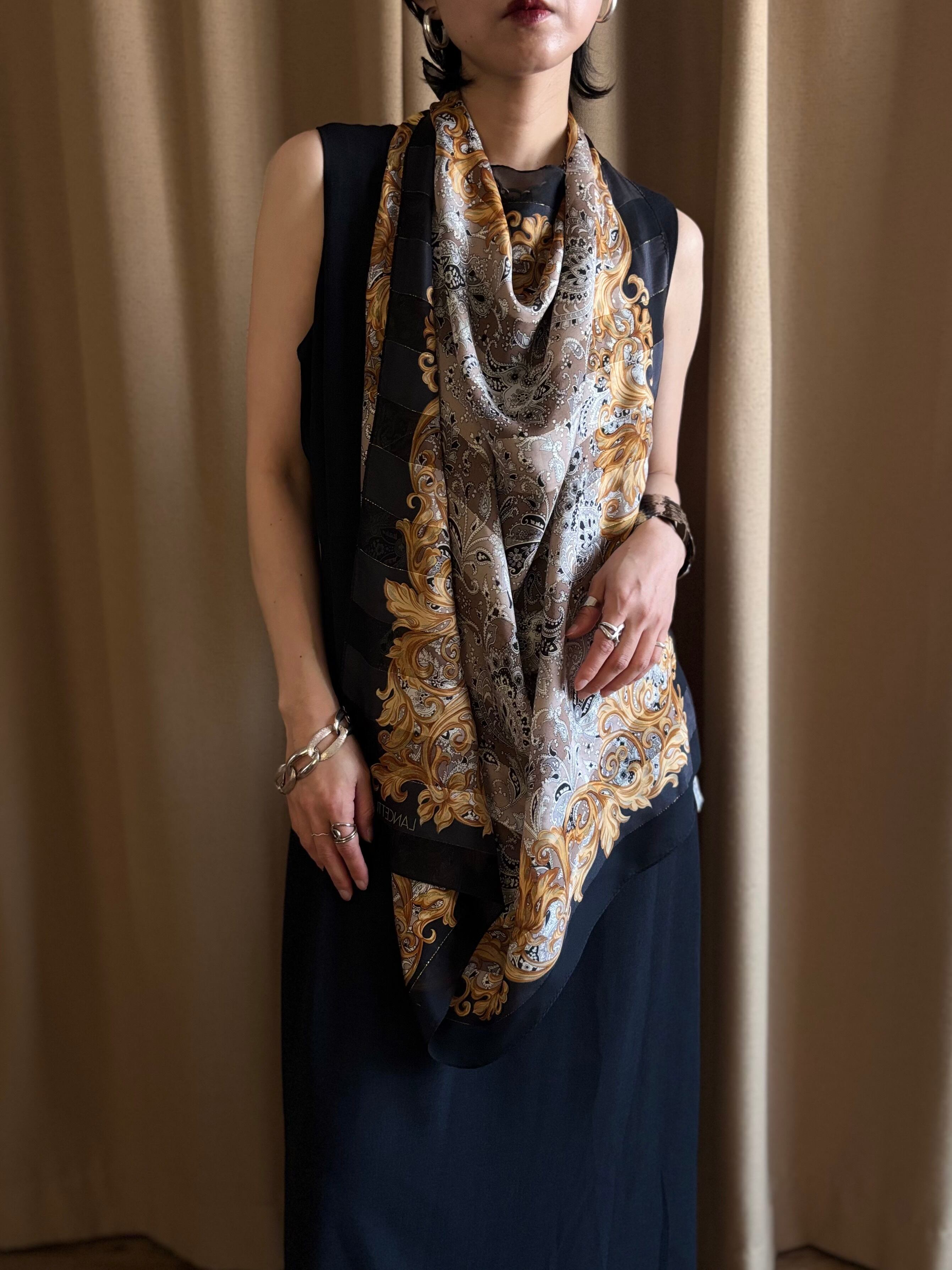 中央に緻密なペイズリー柄、周囲を華やかなボタニカル柄(植物模様)で縁取ったエレガンスなスカーフ。