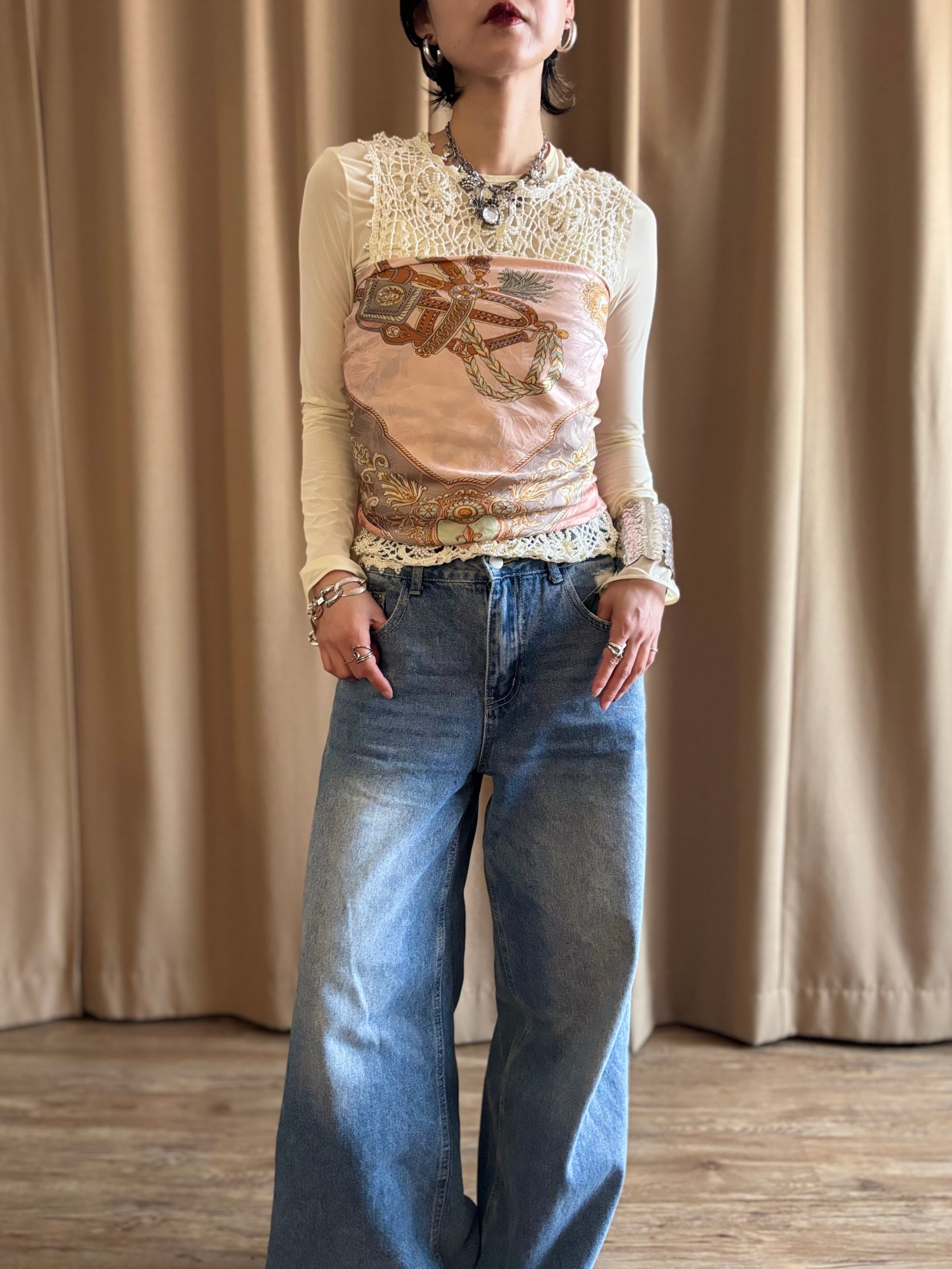 着画でコーディネートしているクロシェトップスも販売商品です。
