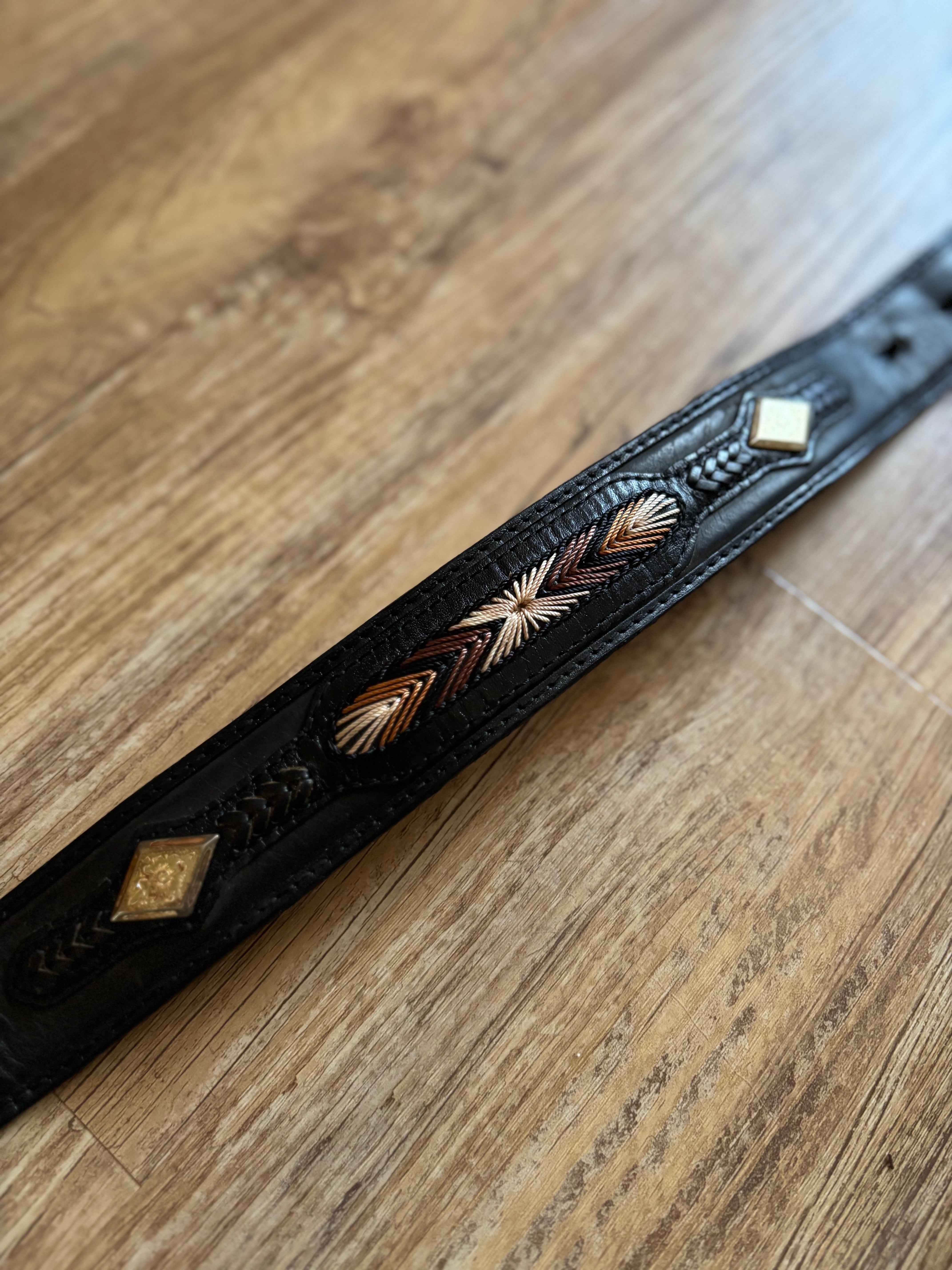 精妙なメタルバックルを主役に、ネイティブな刺繍とメタル装飾がモードさ引き立つ逸品。
