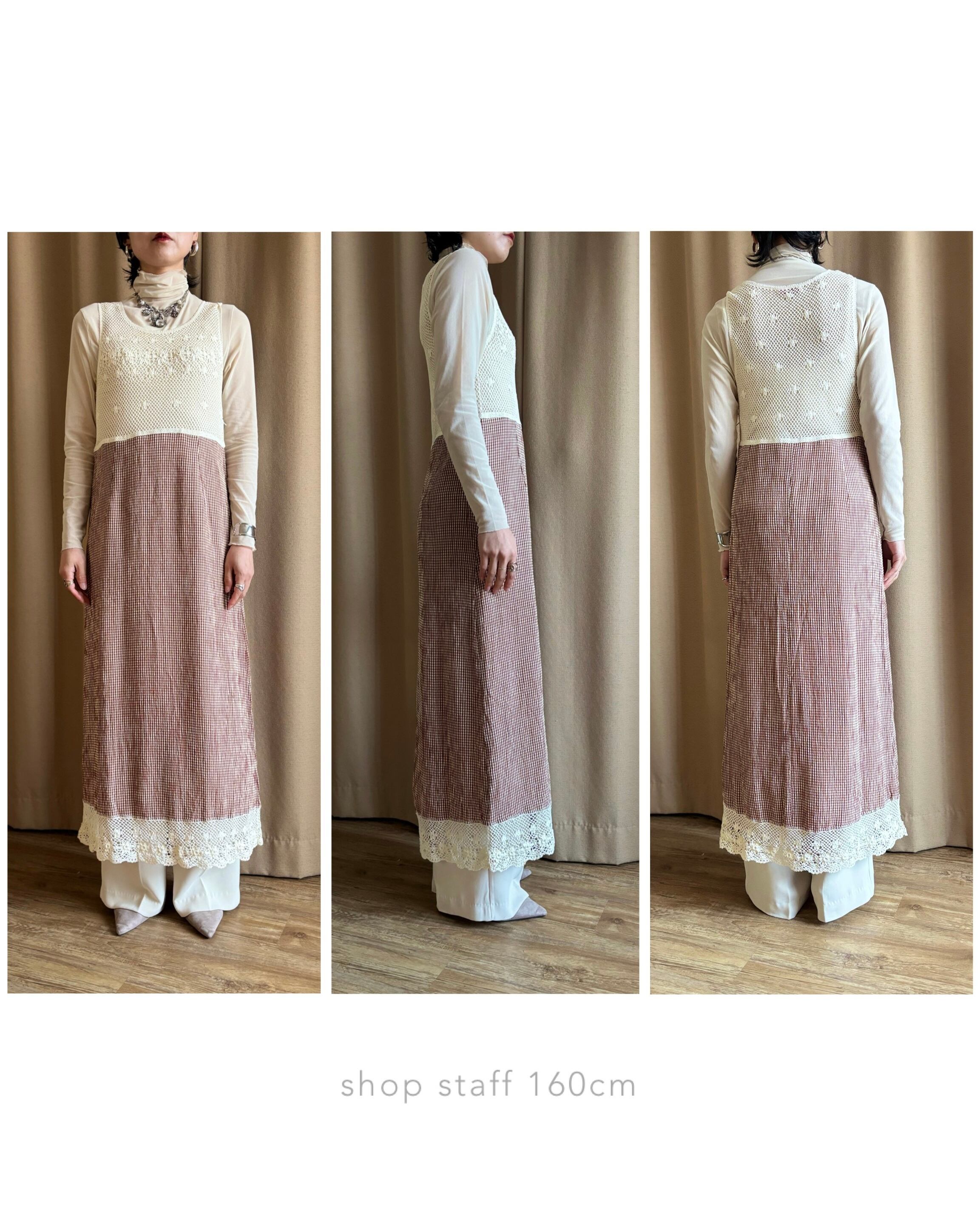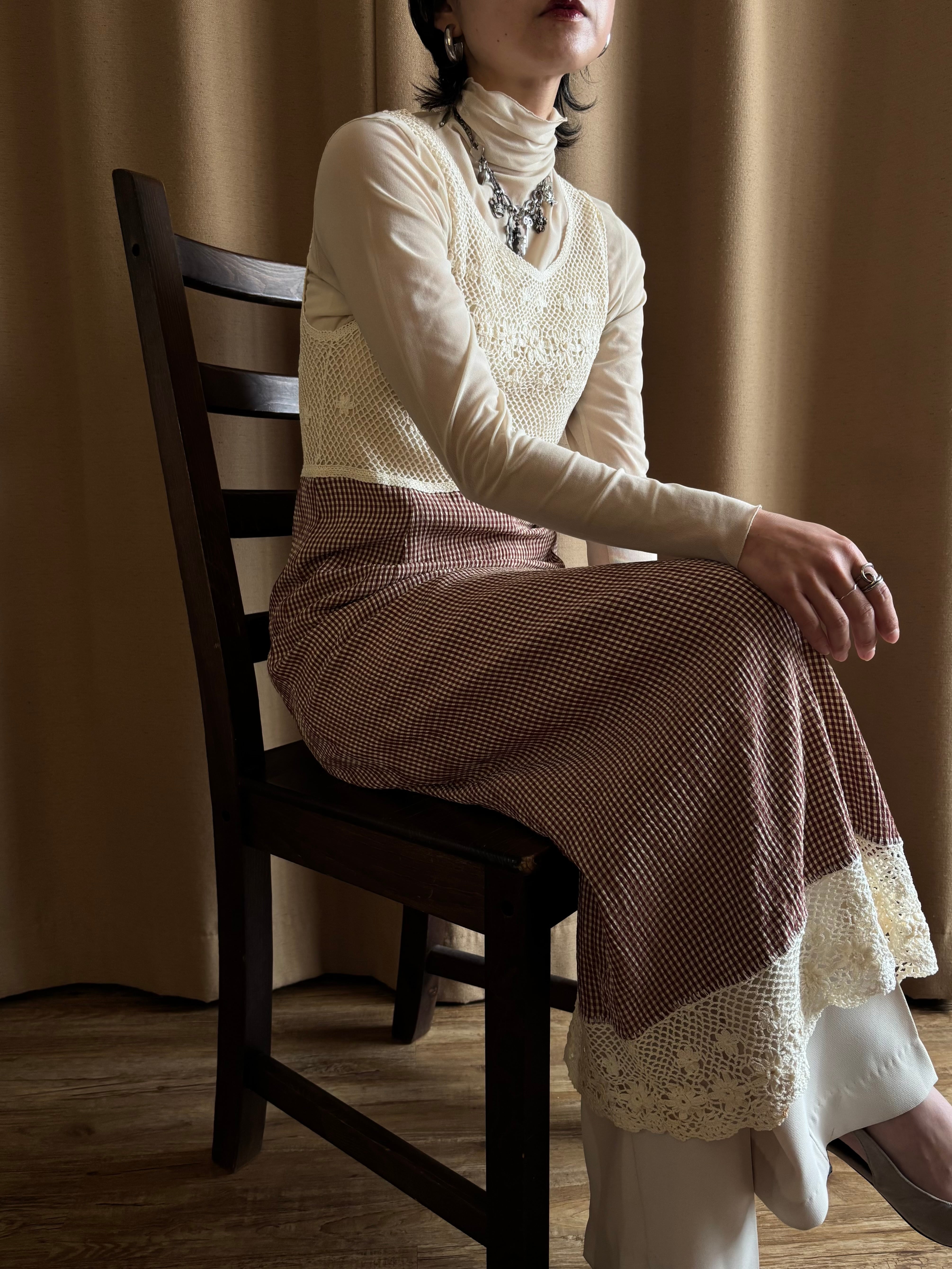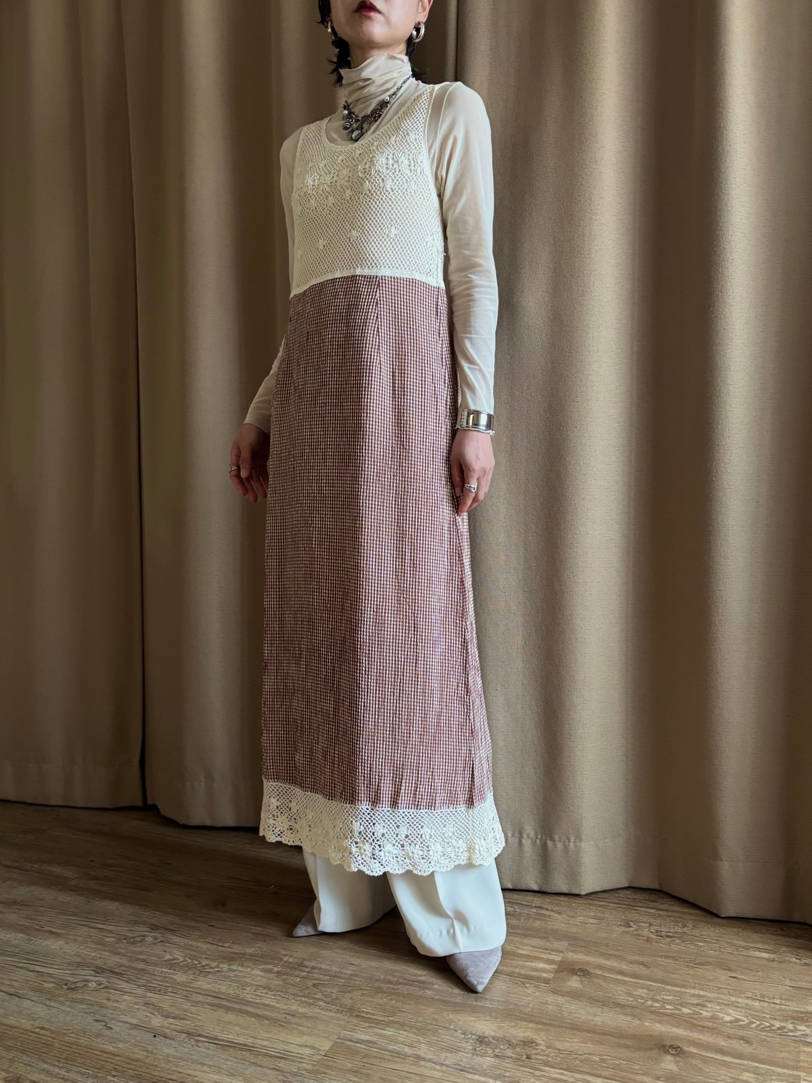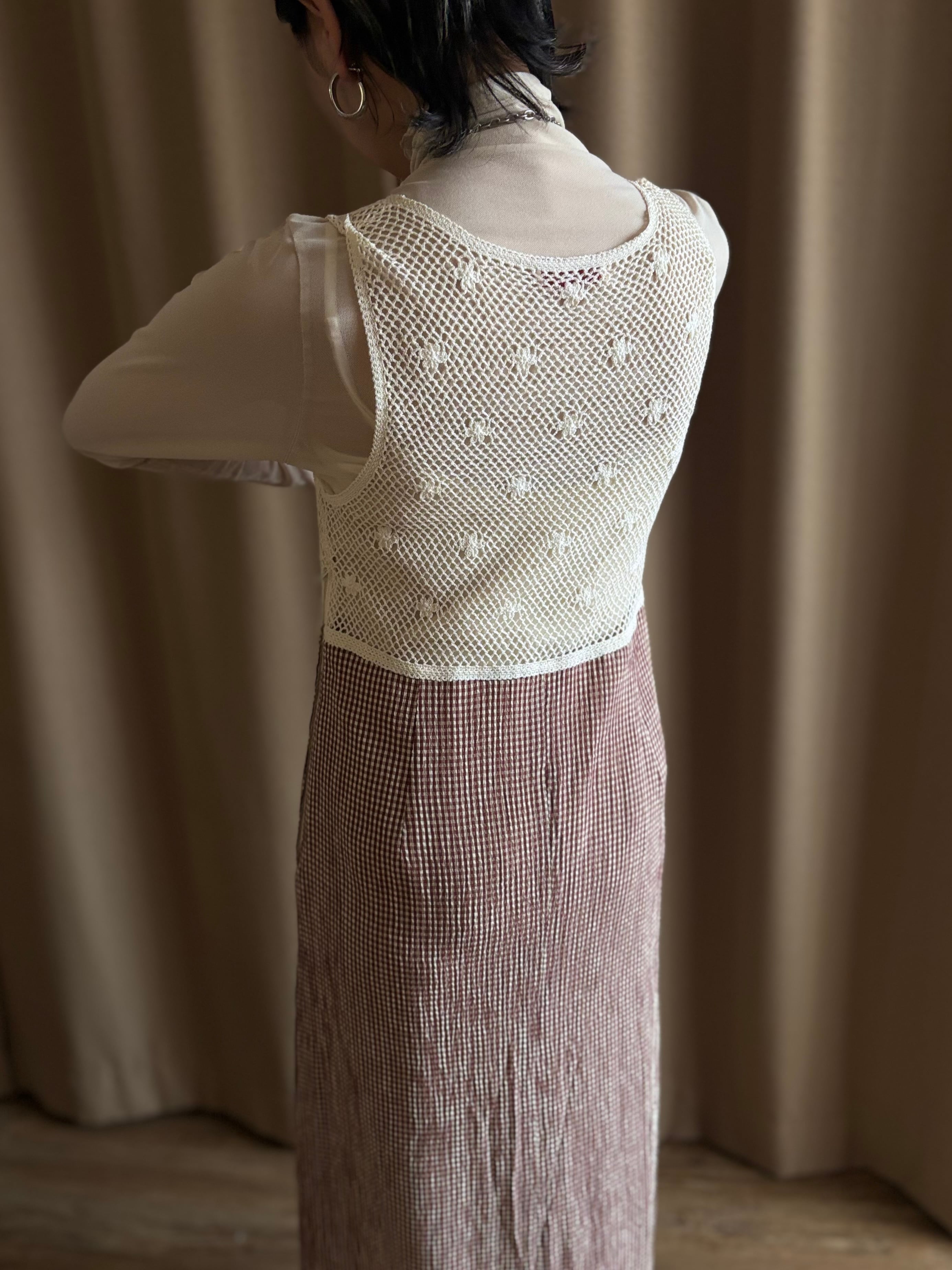 ワンピースはクロシェ編みとギンガムチェックをドッキングした、表情豊かなデザイン。