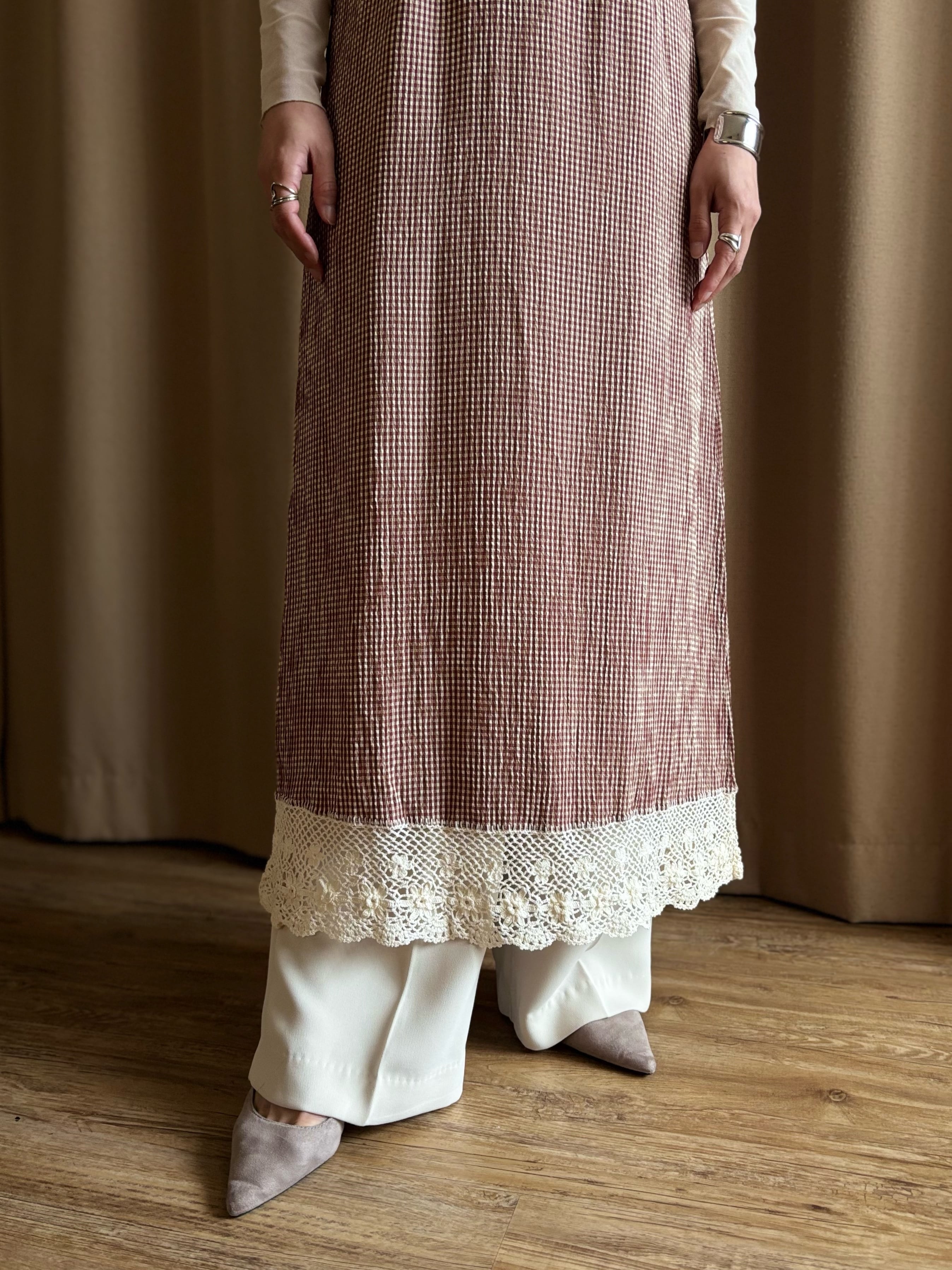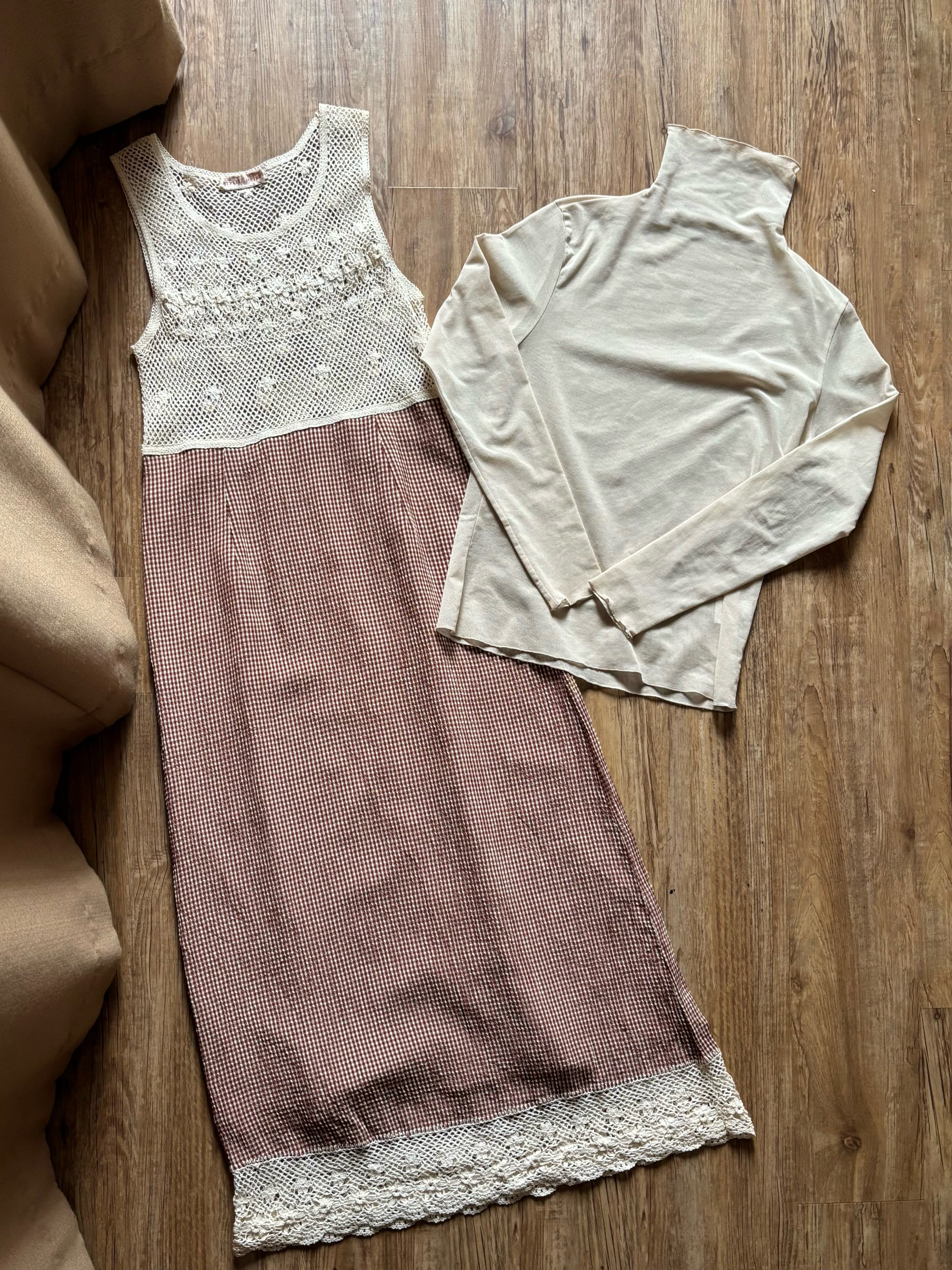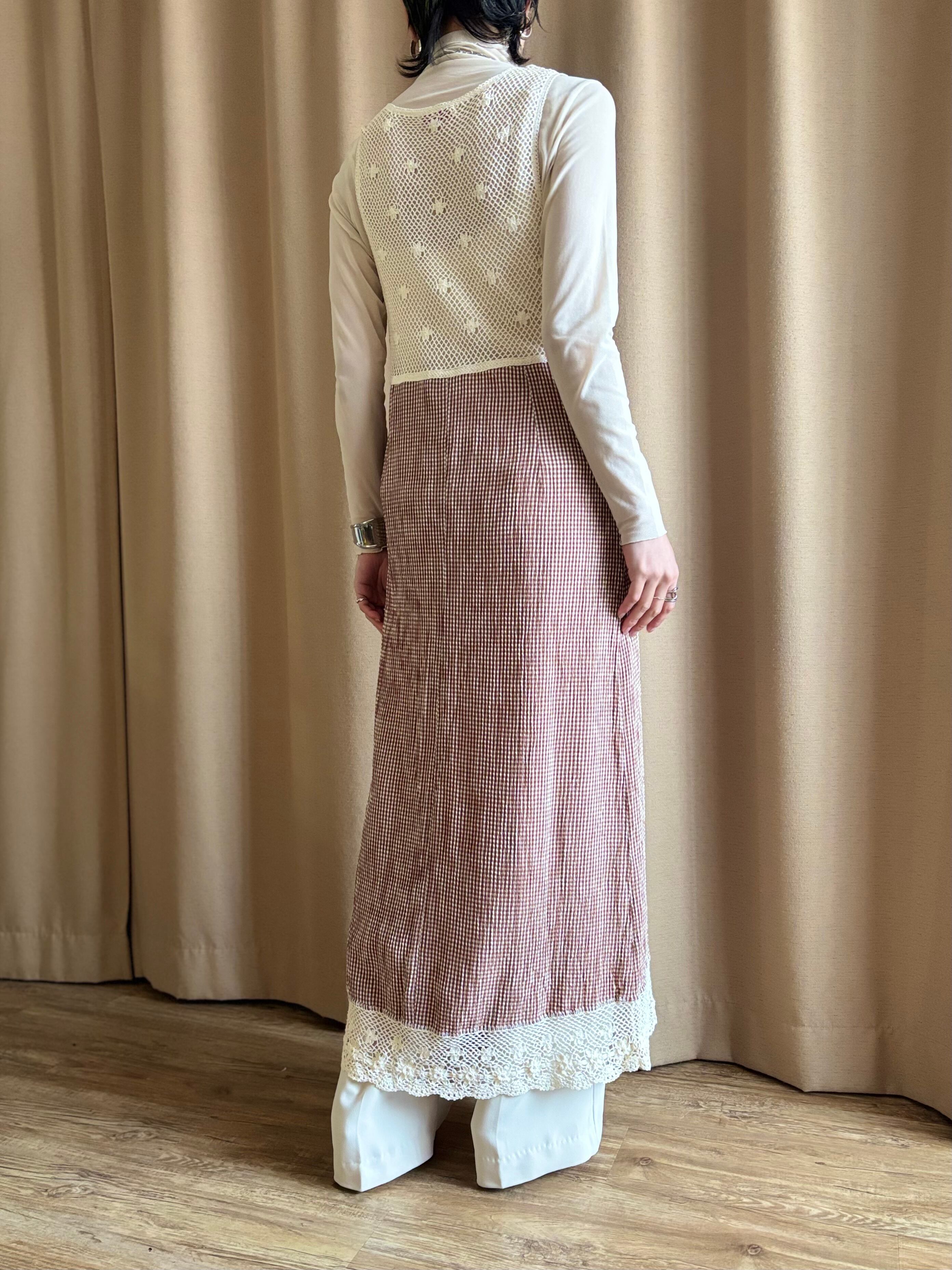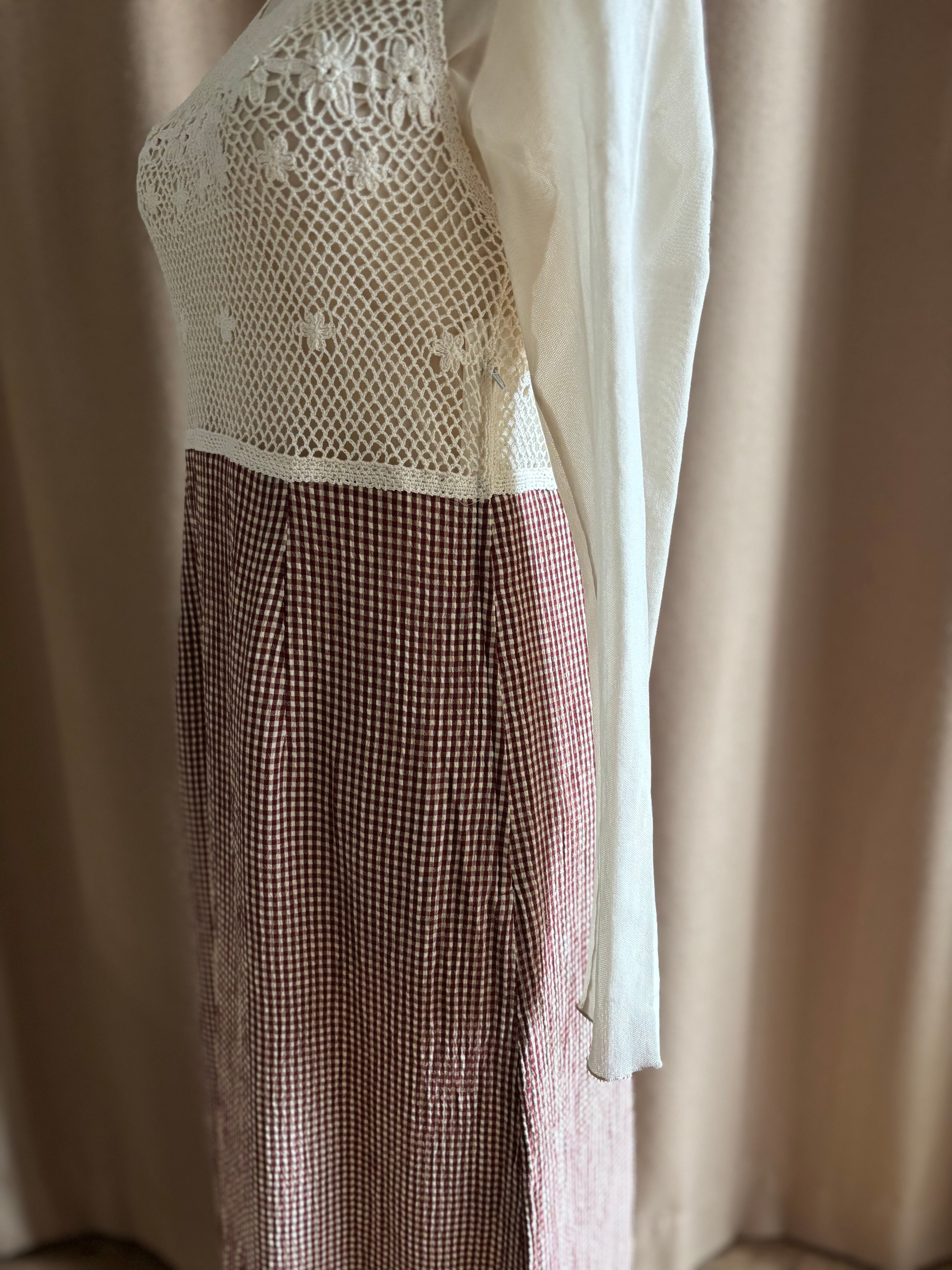 ワンピースはクロシェ編みとギンガムチェックをドッキングした、表情豊かなデザイン。